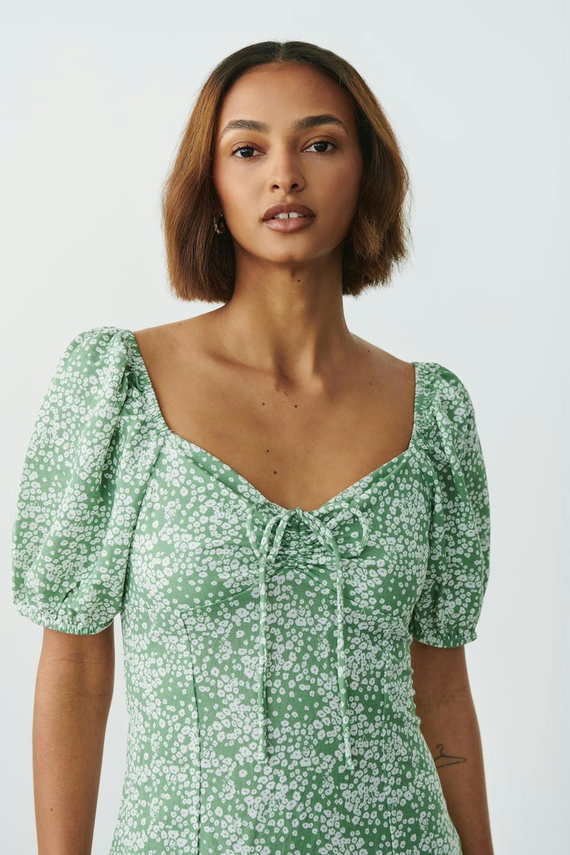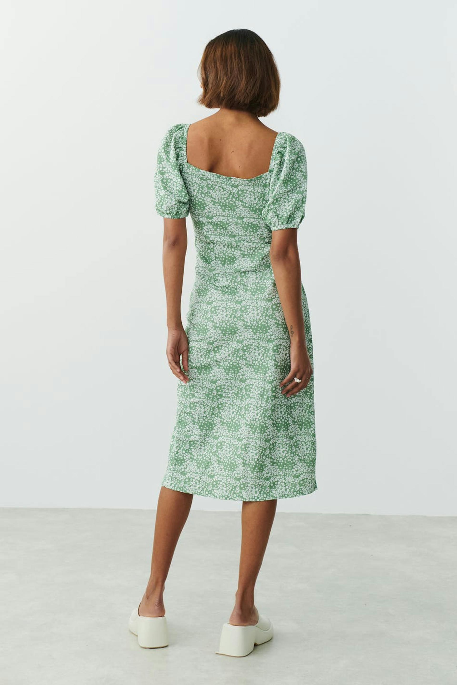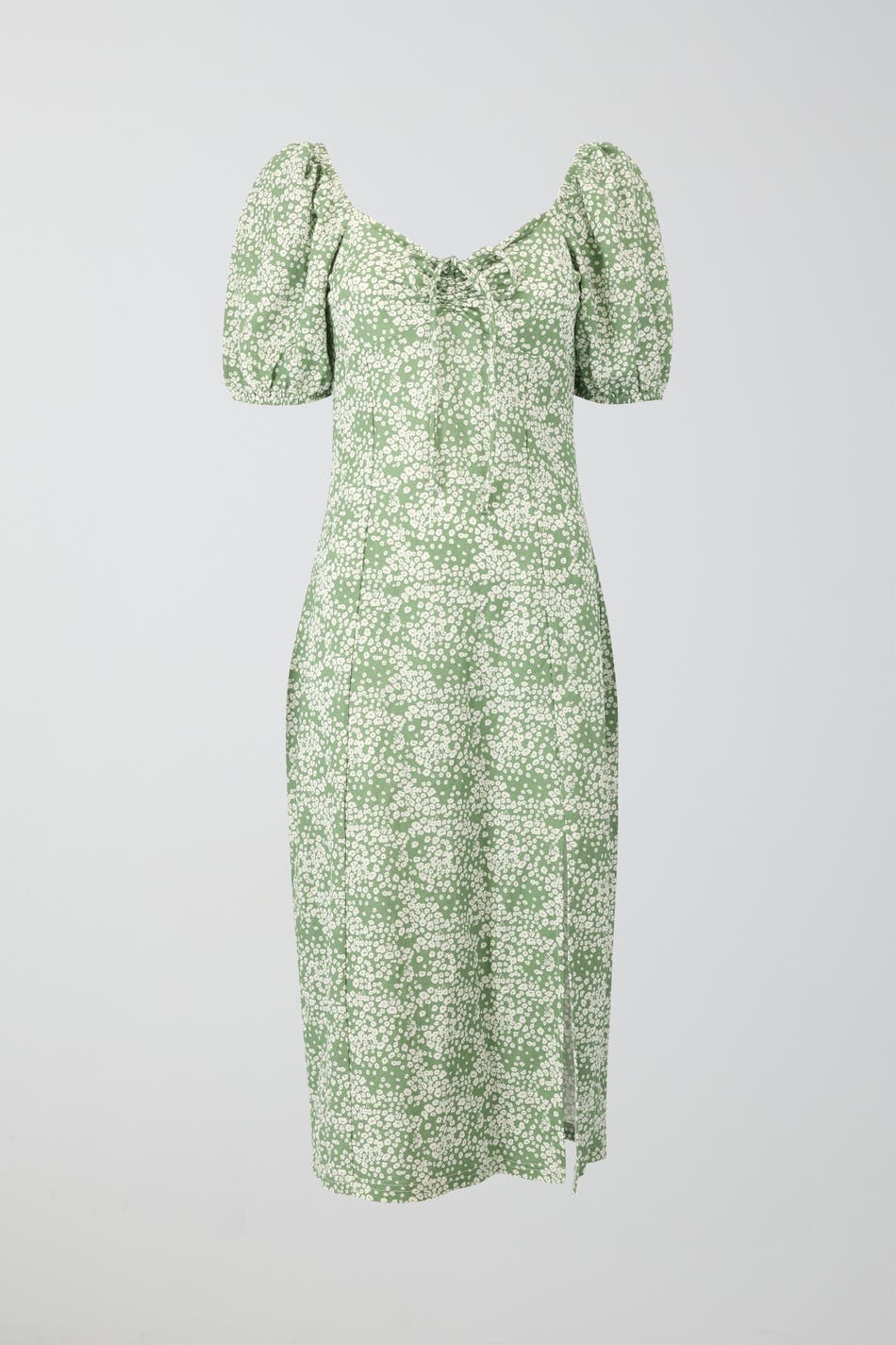 Floral midi dress with short puff sleeves. The dress is green and has normal fit. It has high slit at the front and square neckline with knot detail.