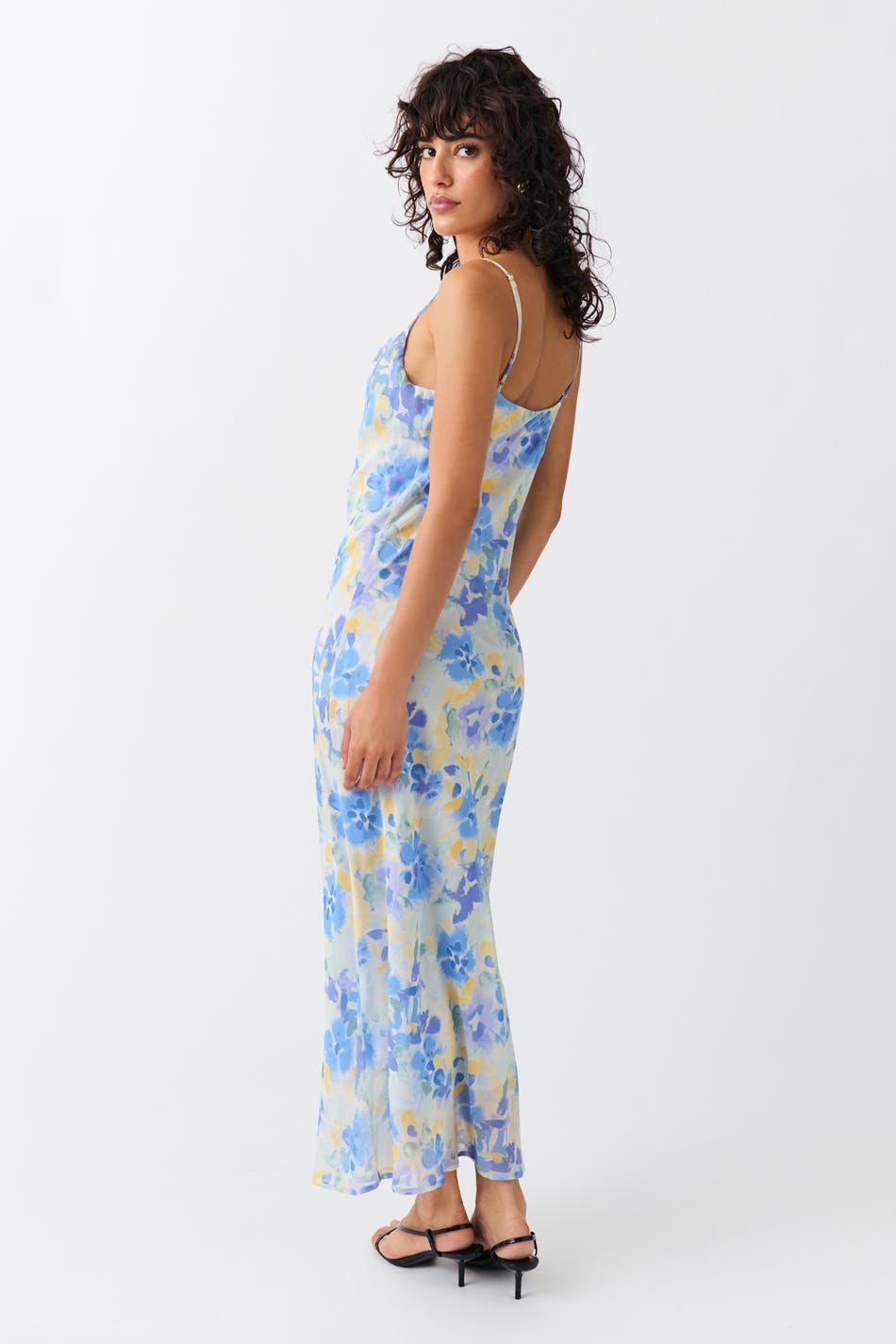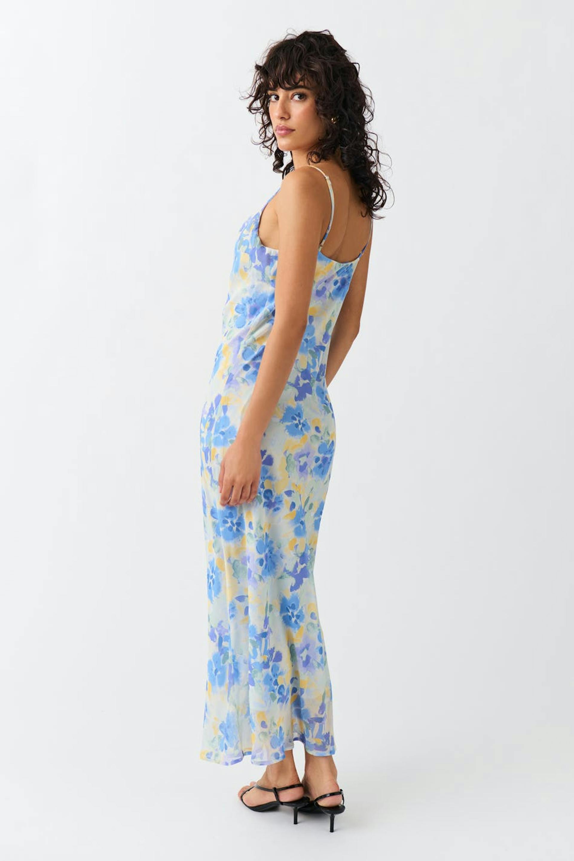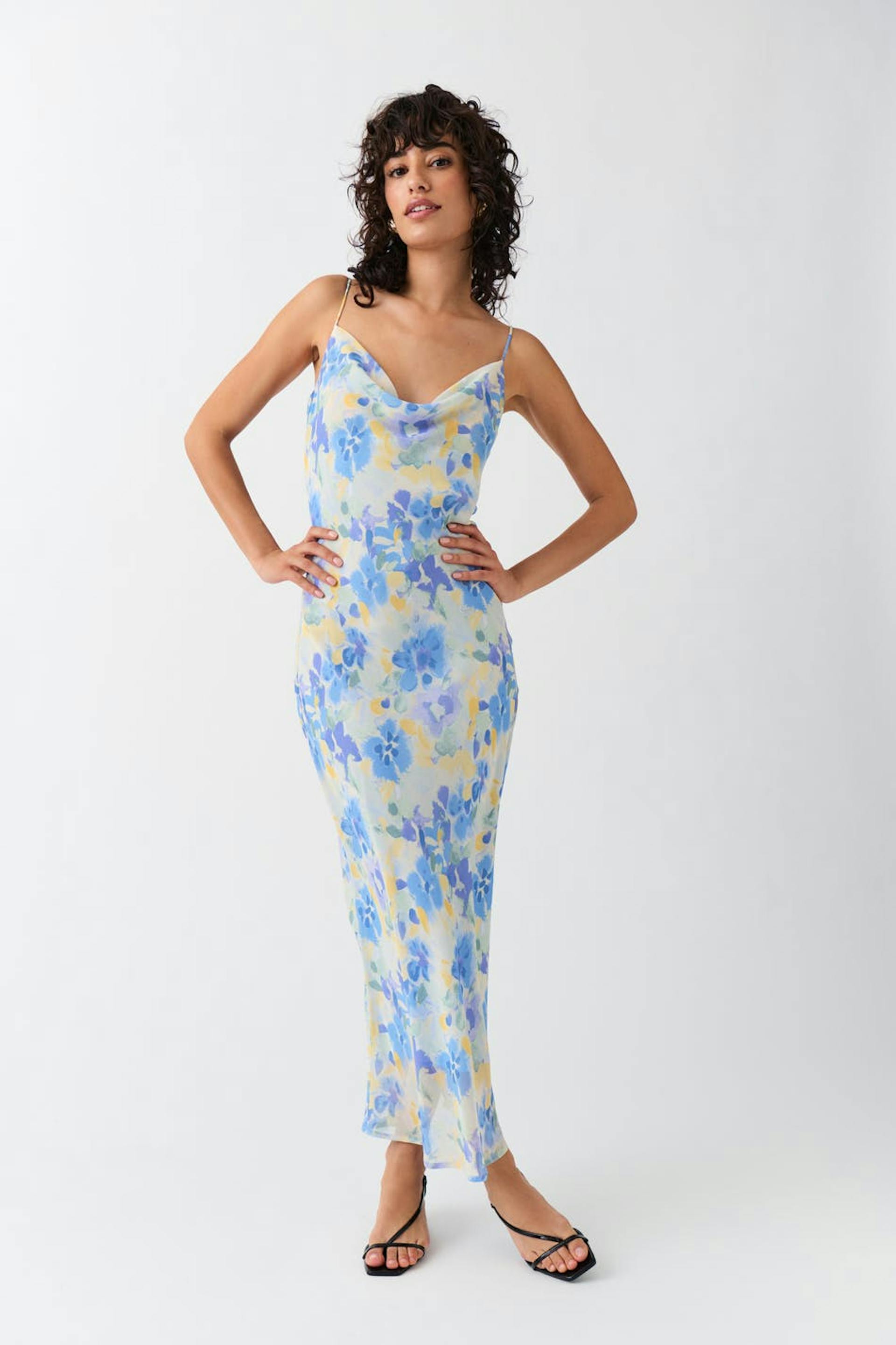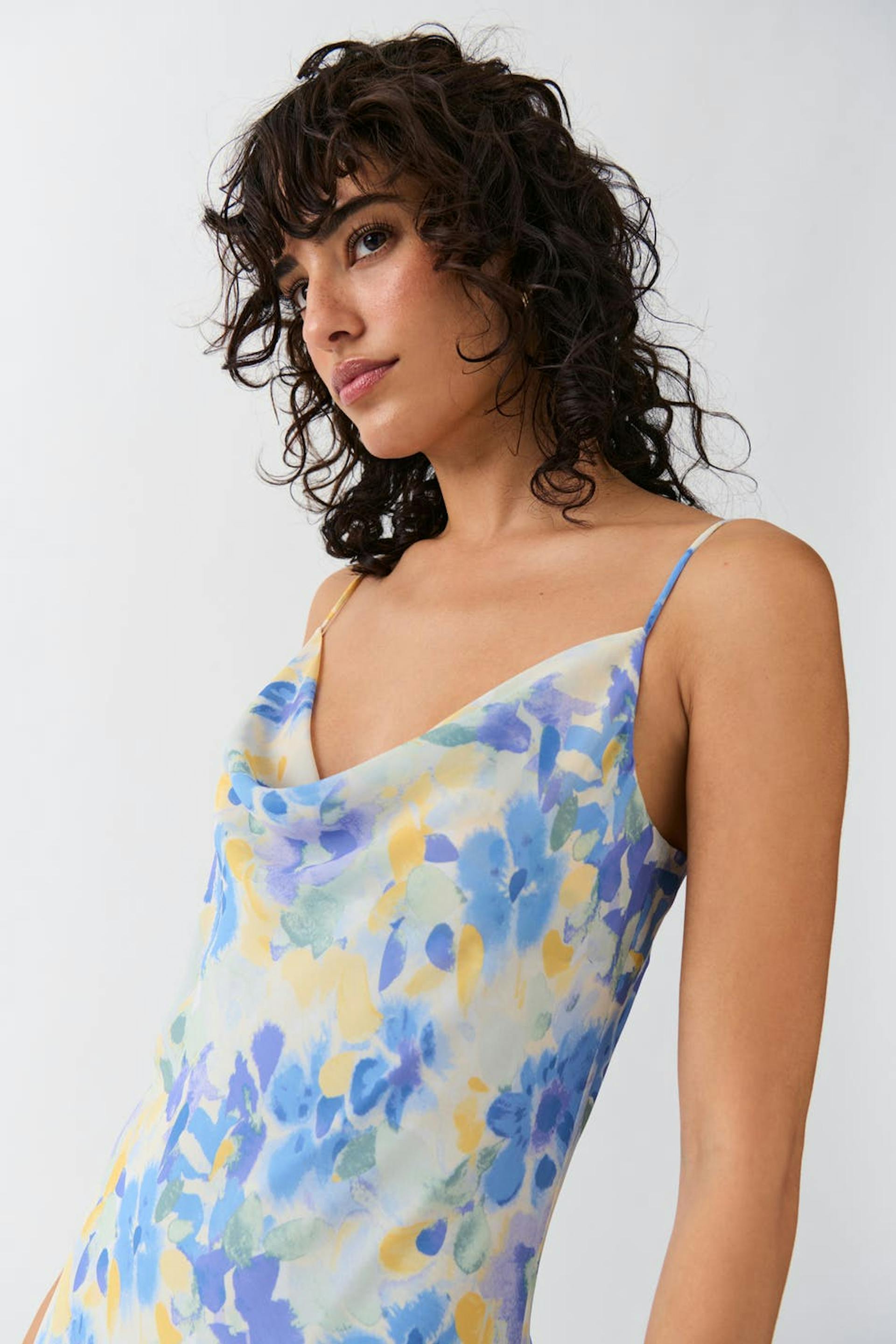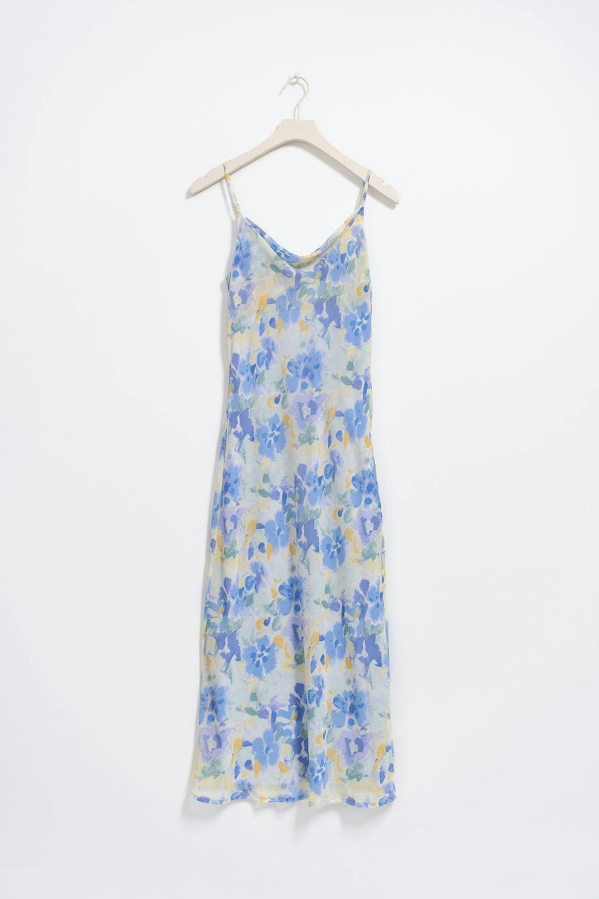 Floral slip dress with cowl neck. The slip dress is blue, yellow and sleeveless. It has slim, adjustable shoulder straps and midi length.