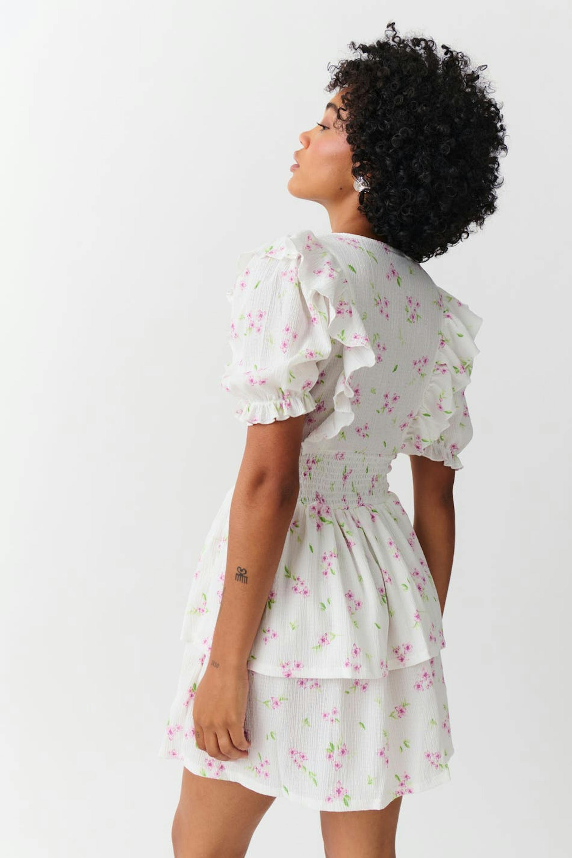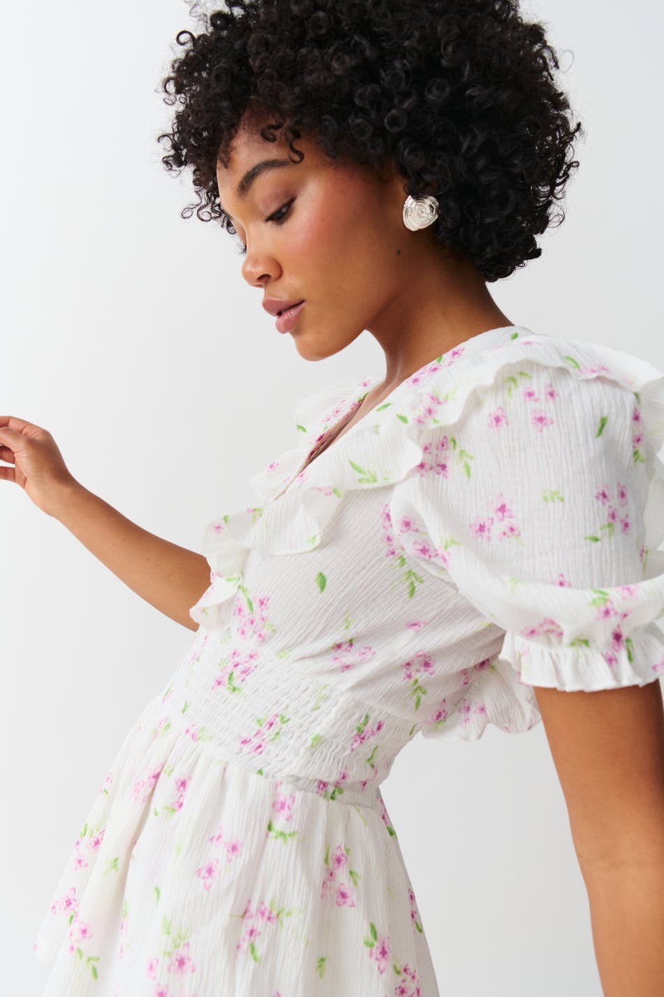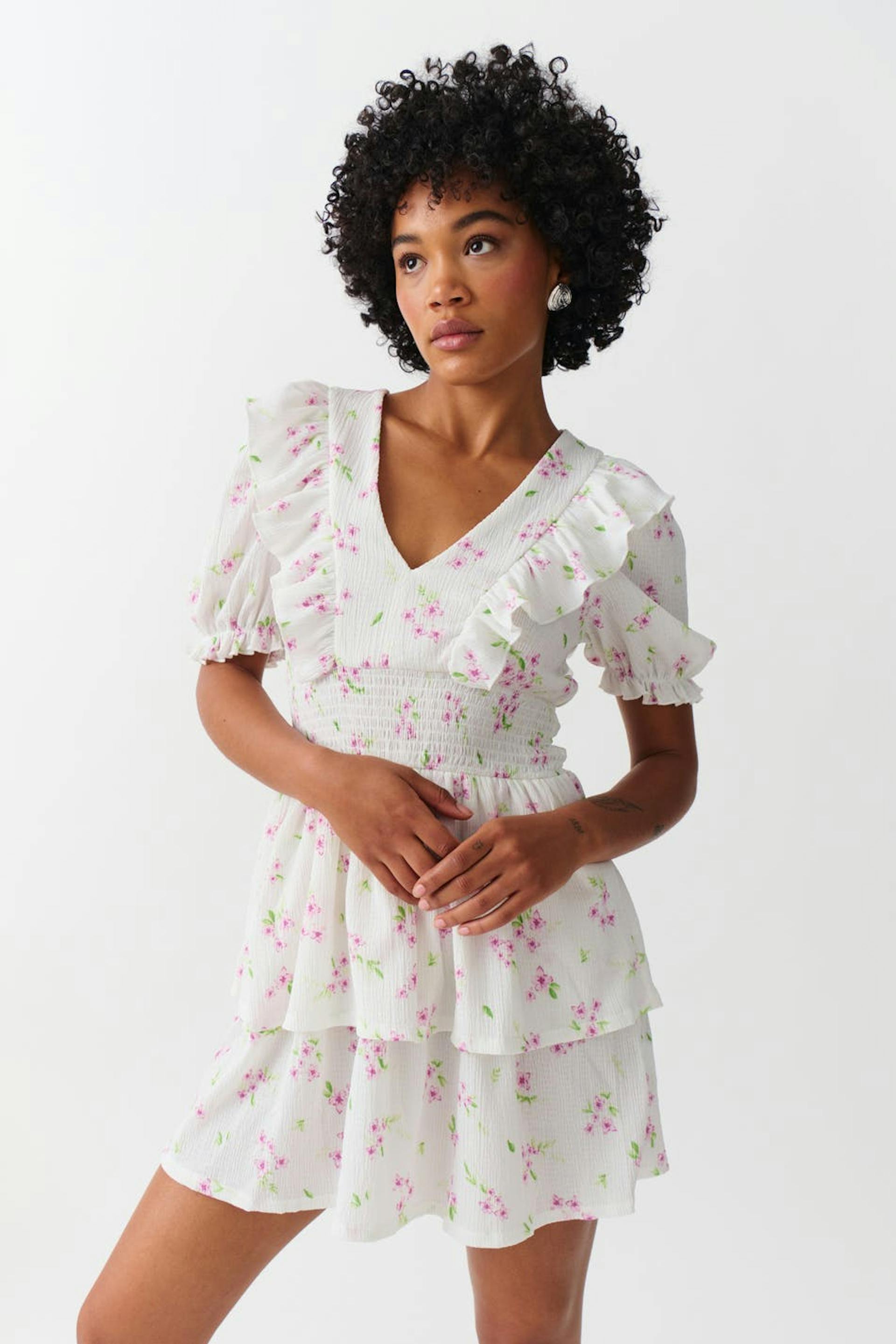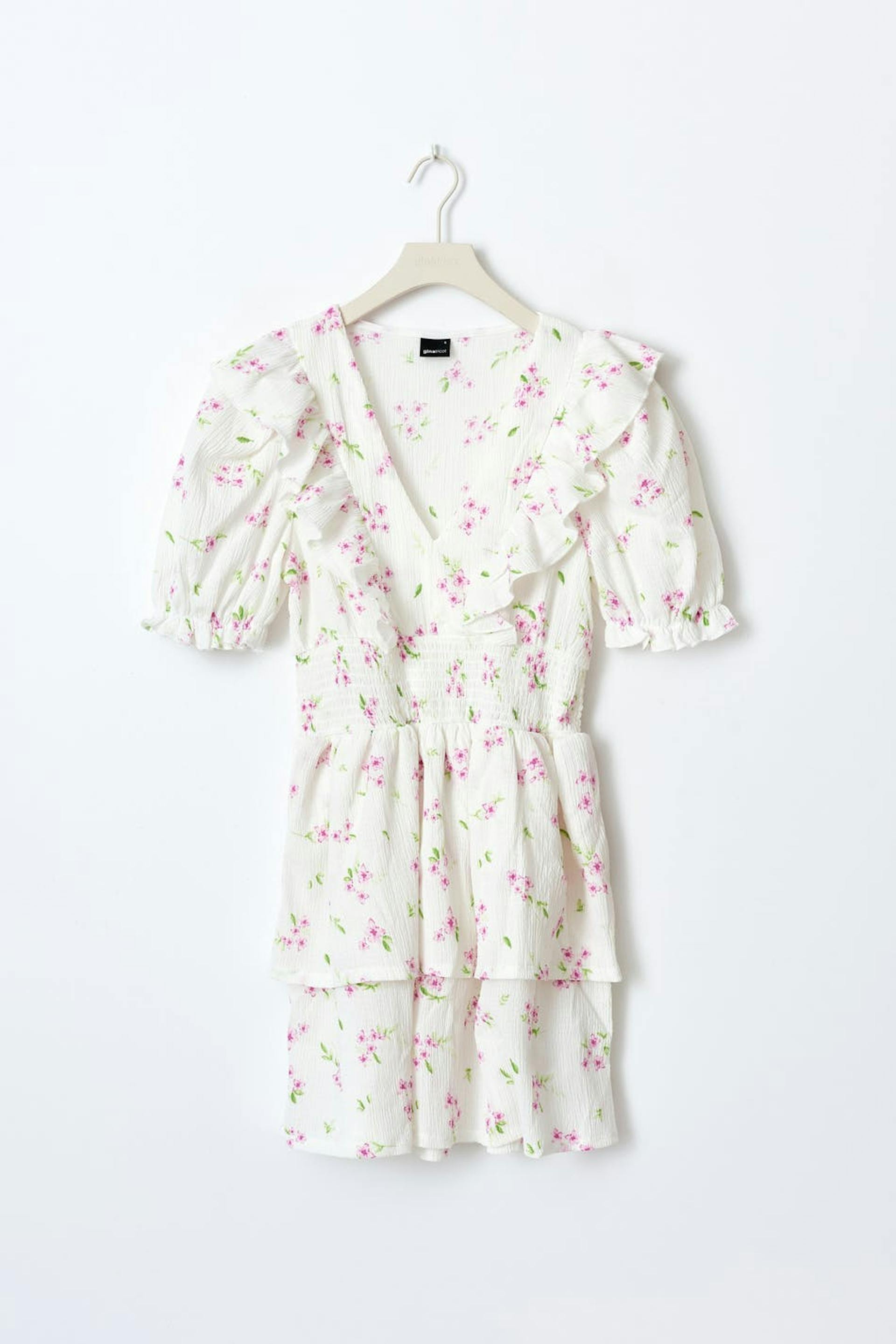 Floral dress with smocking at the waist. The dress is white, short and pleated. It has regular fit, short puff sleeve, frill details, deep V-neck and frill skirt.