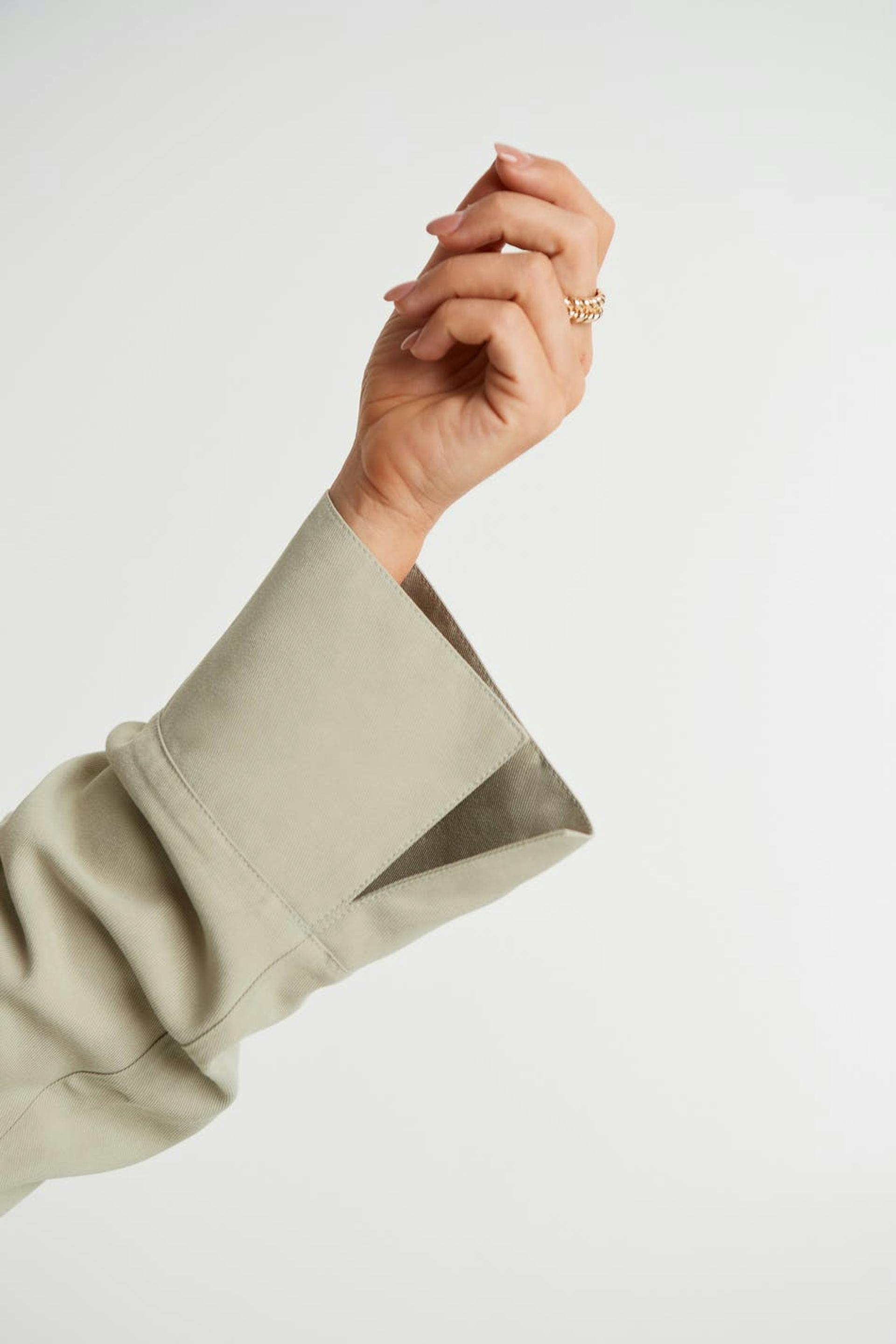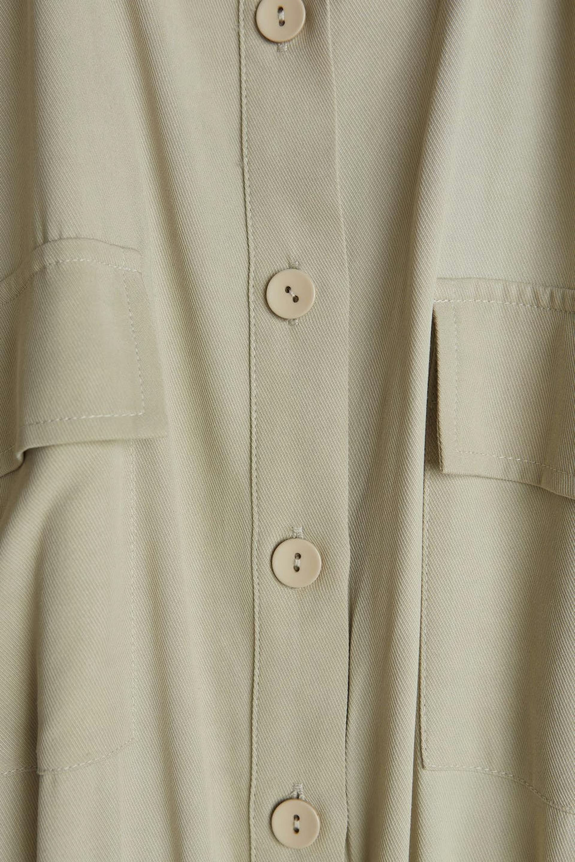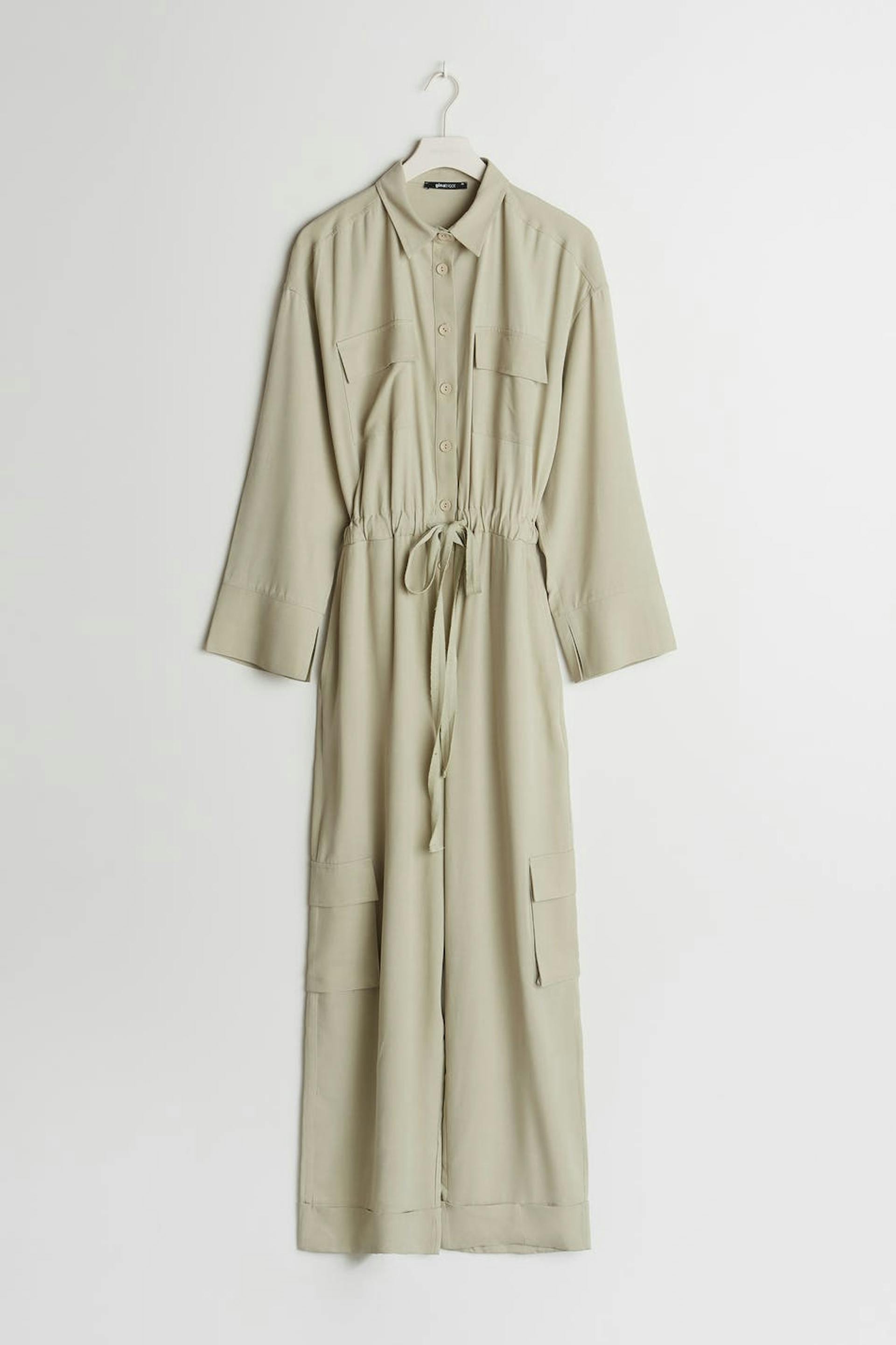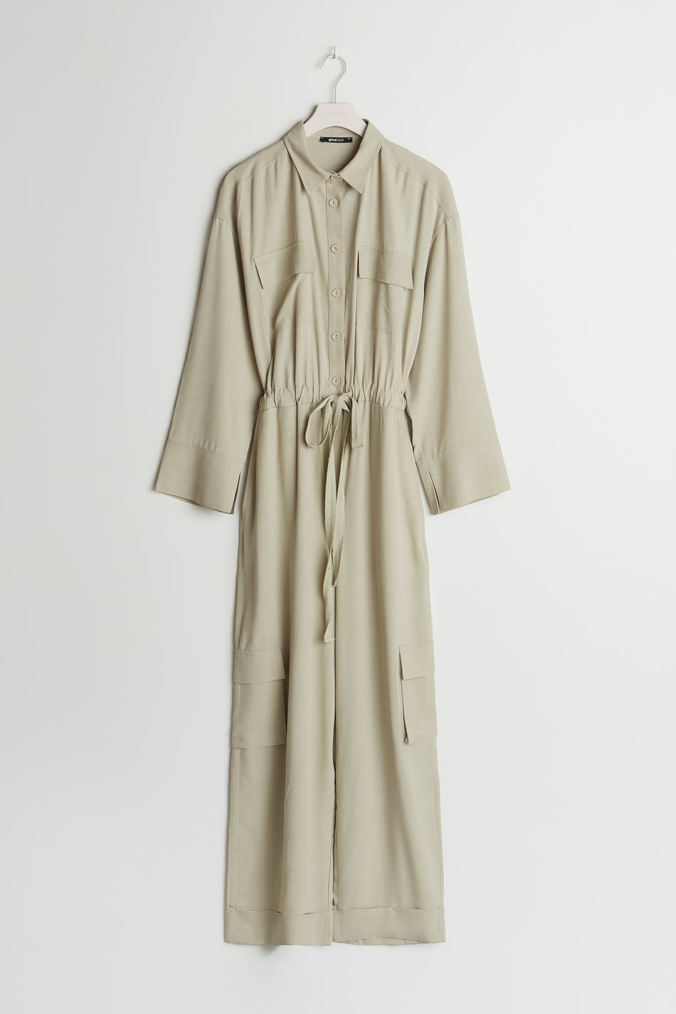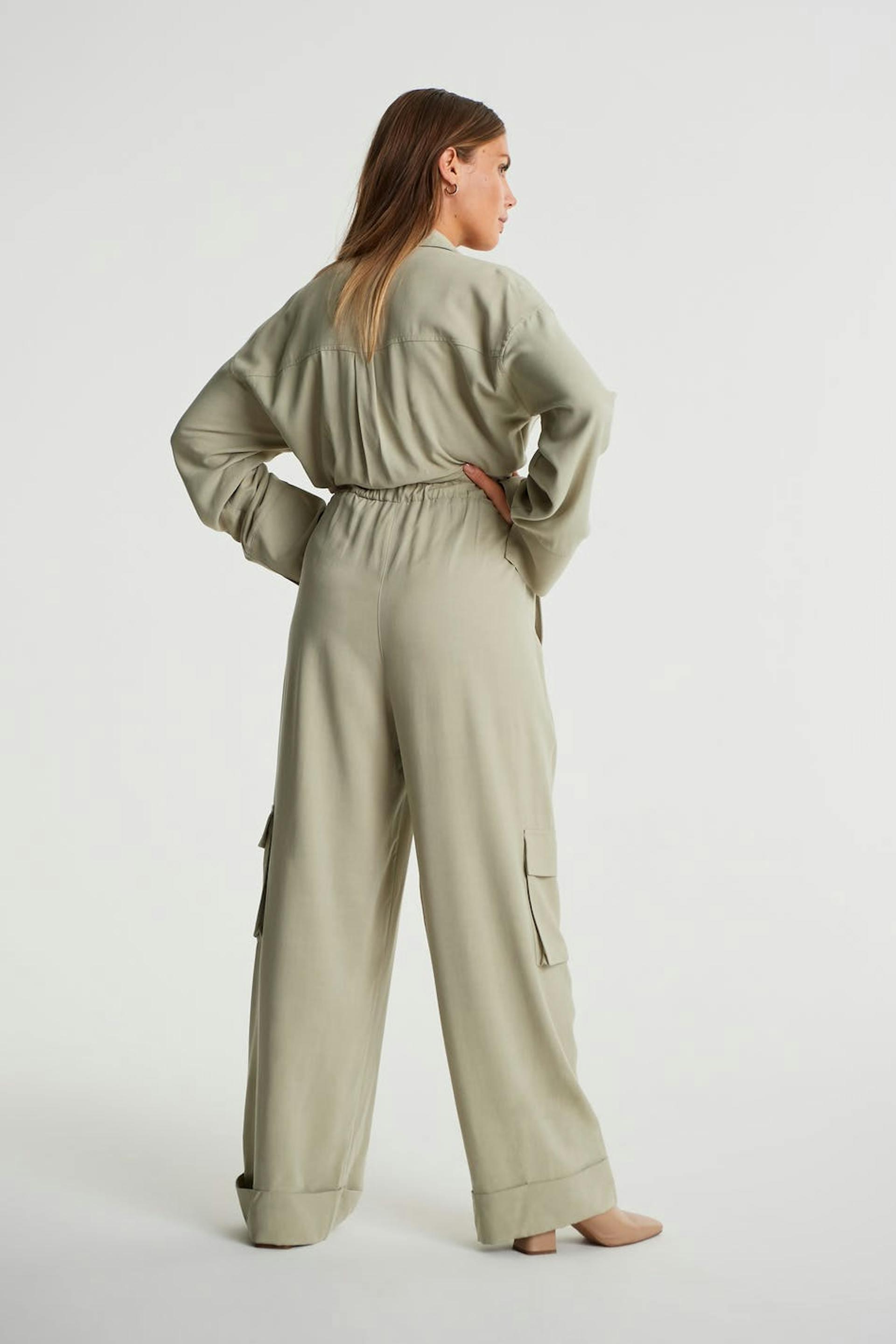 Maja X Gina tricot. Long-sleeved jumpsuit with long, wide legs. The jumpsuit is green and has a self-tie at the waist. It has cargo pockets and buttons at the front.
