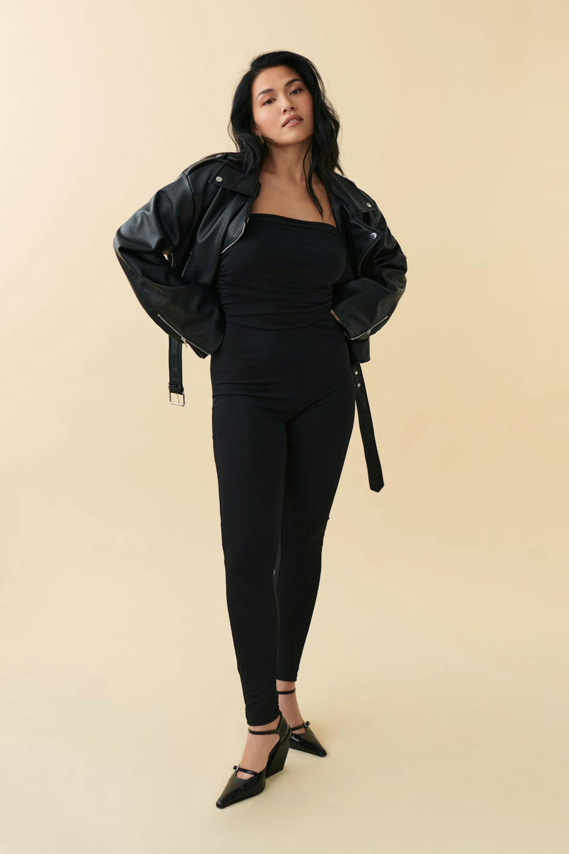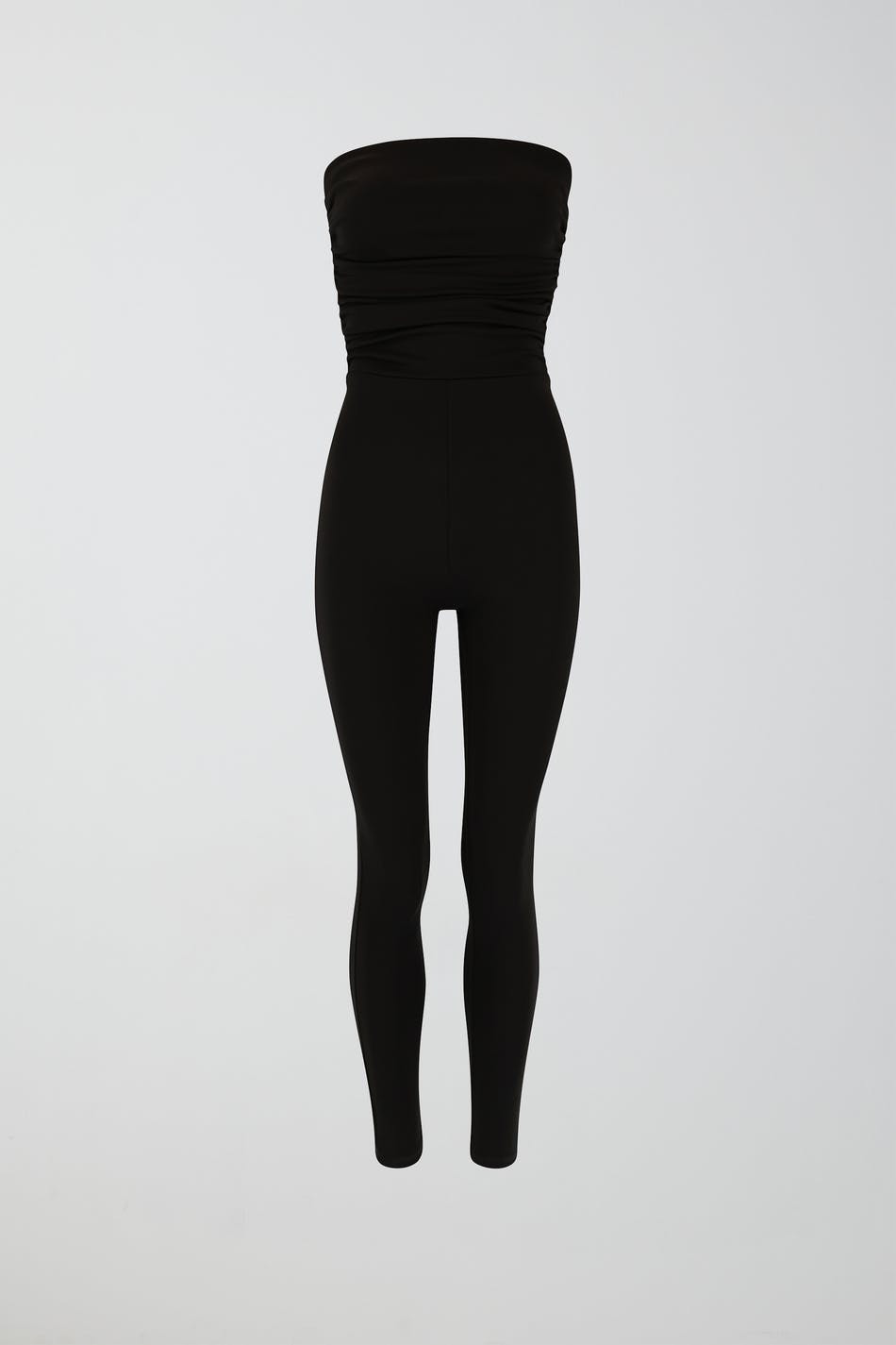 Sleeveless jumpsuit with figure-hugging fit. The jumpsuit is black and has a stretchy quality in jersey.