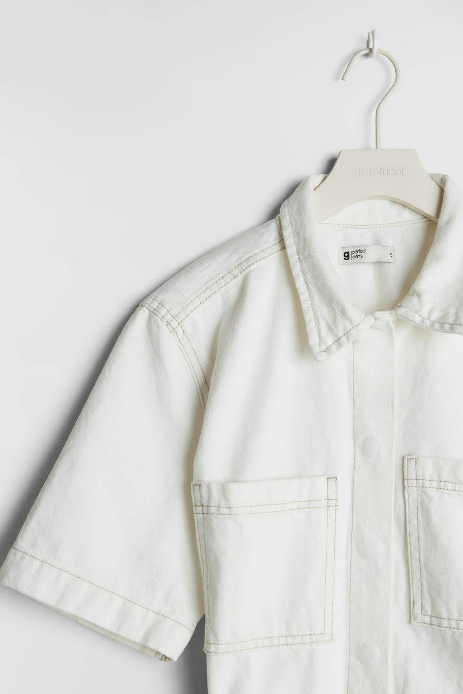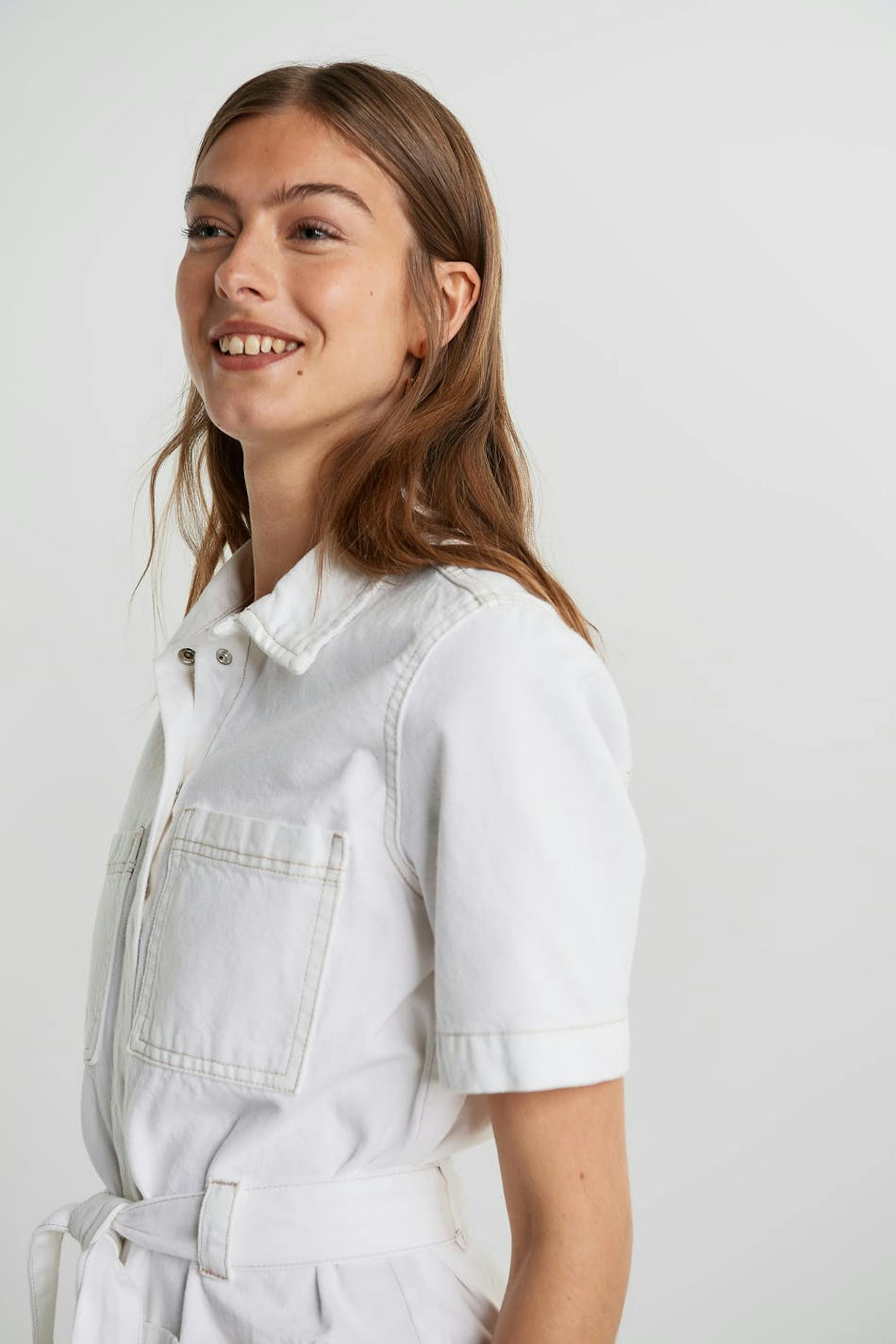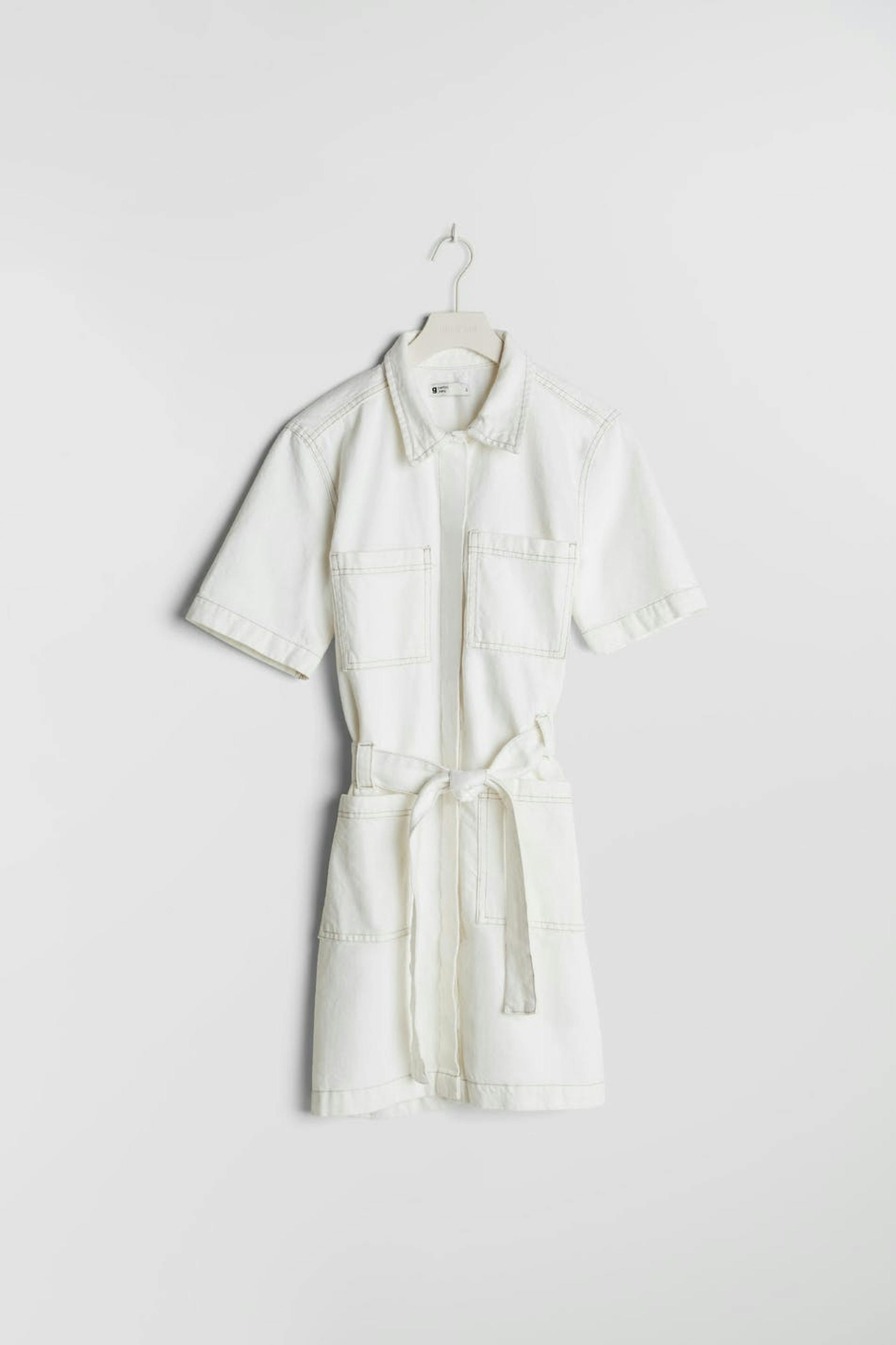 Utility shirt dress with a regular fit. The dress is white and has a tie strap at the waist. It is made of denim.