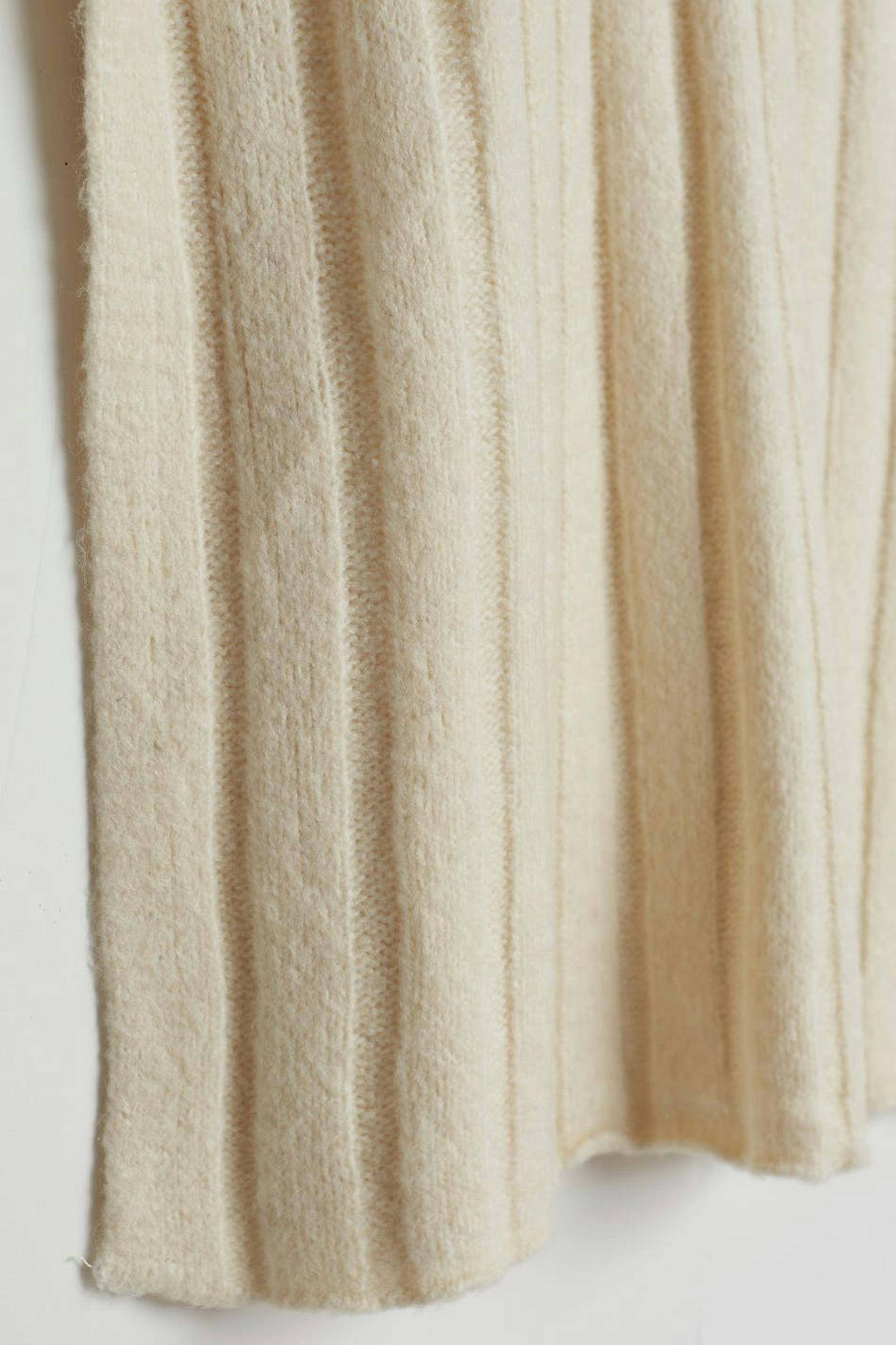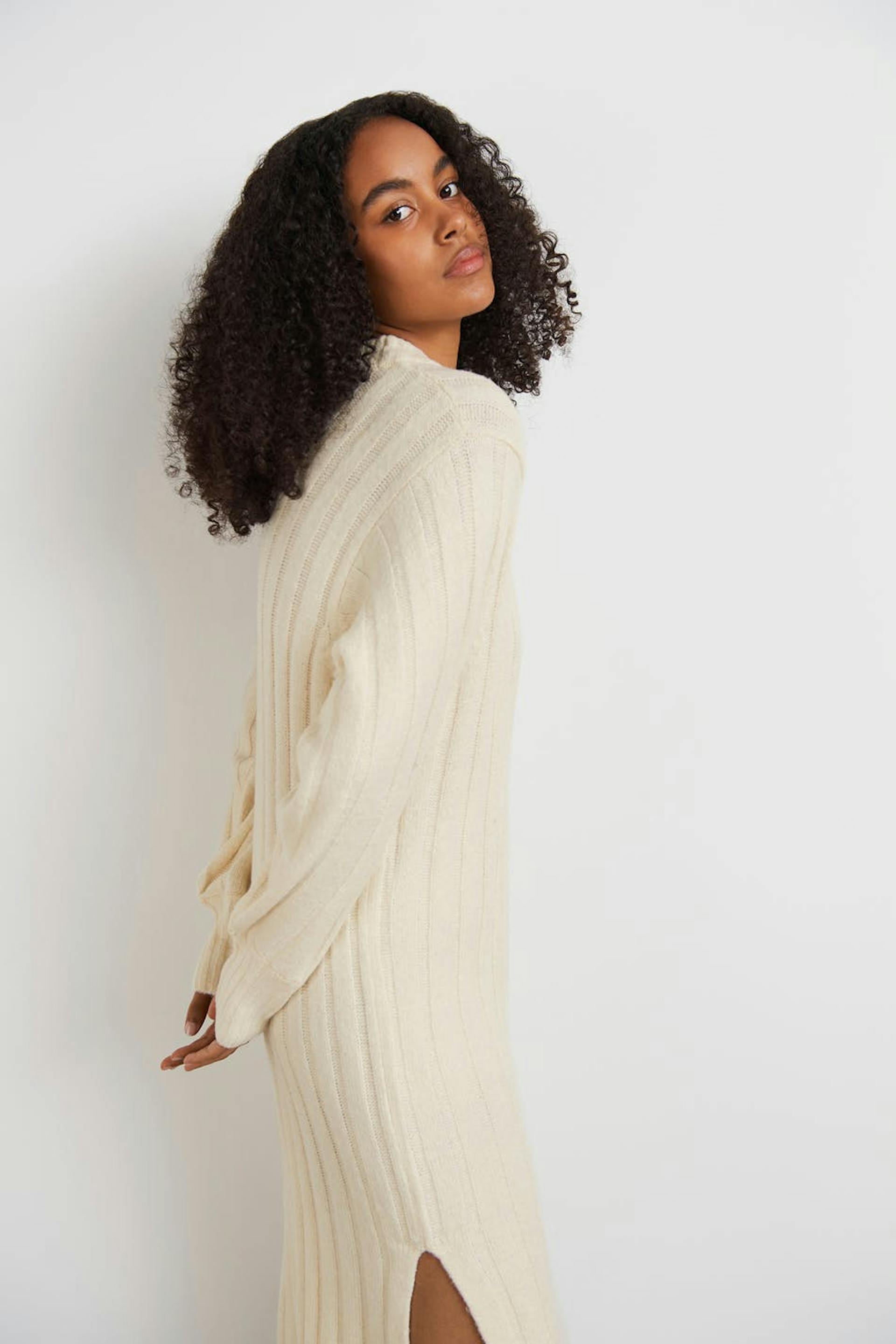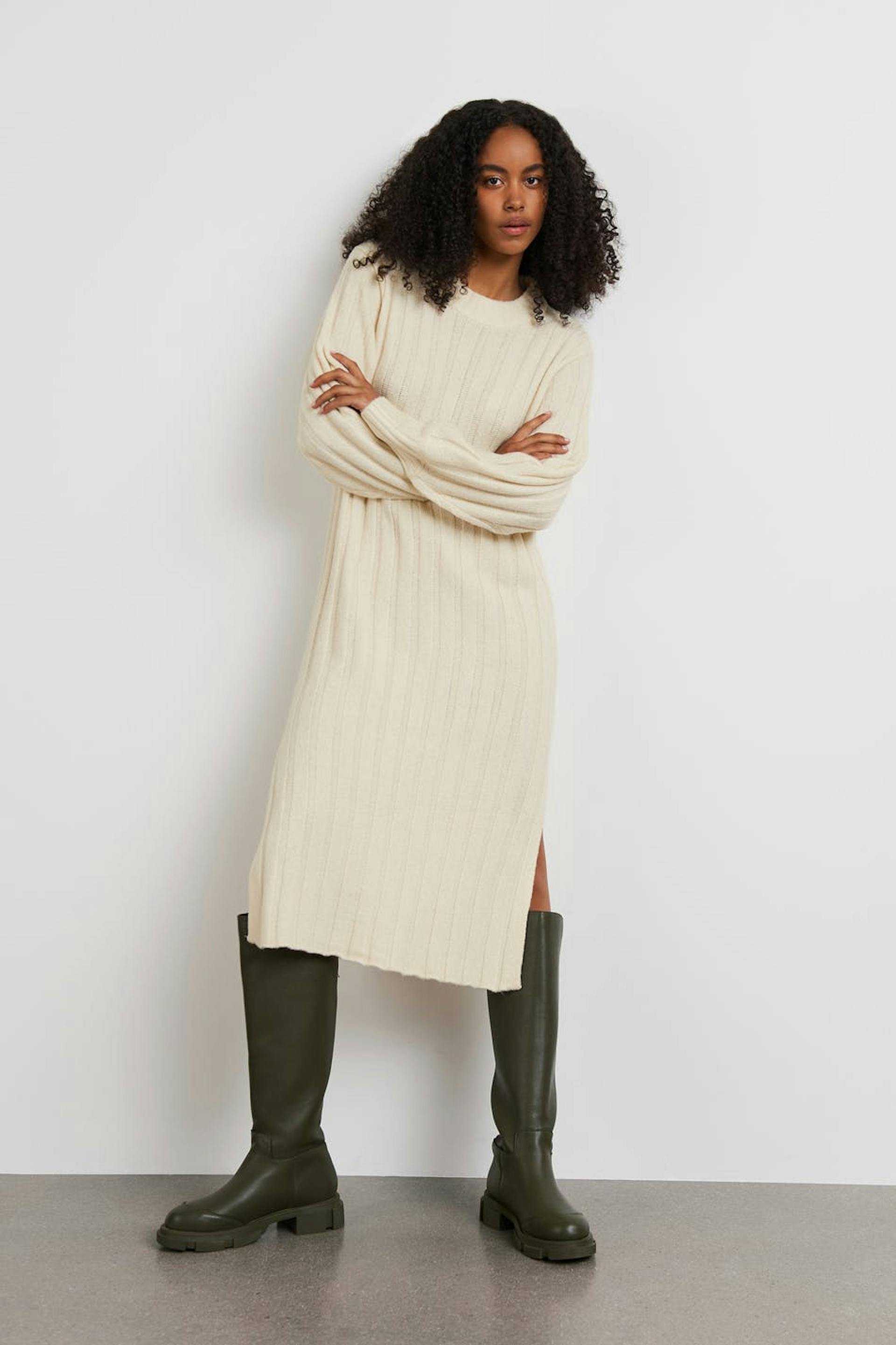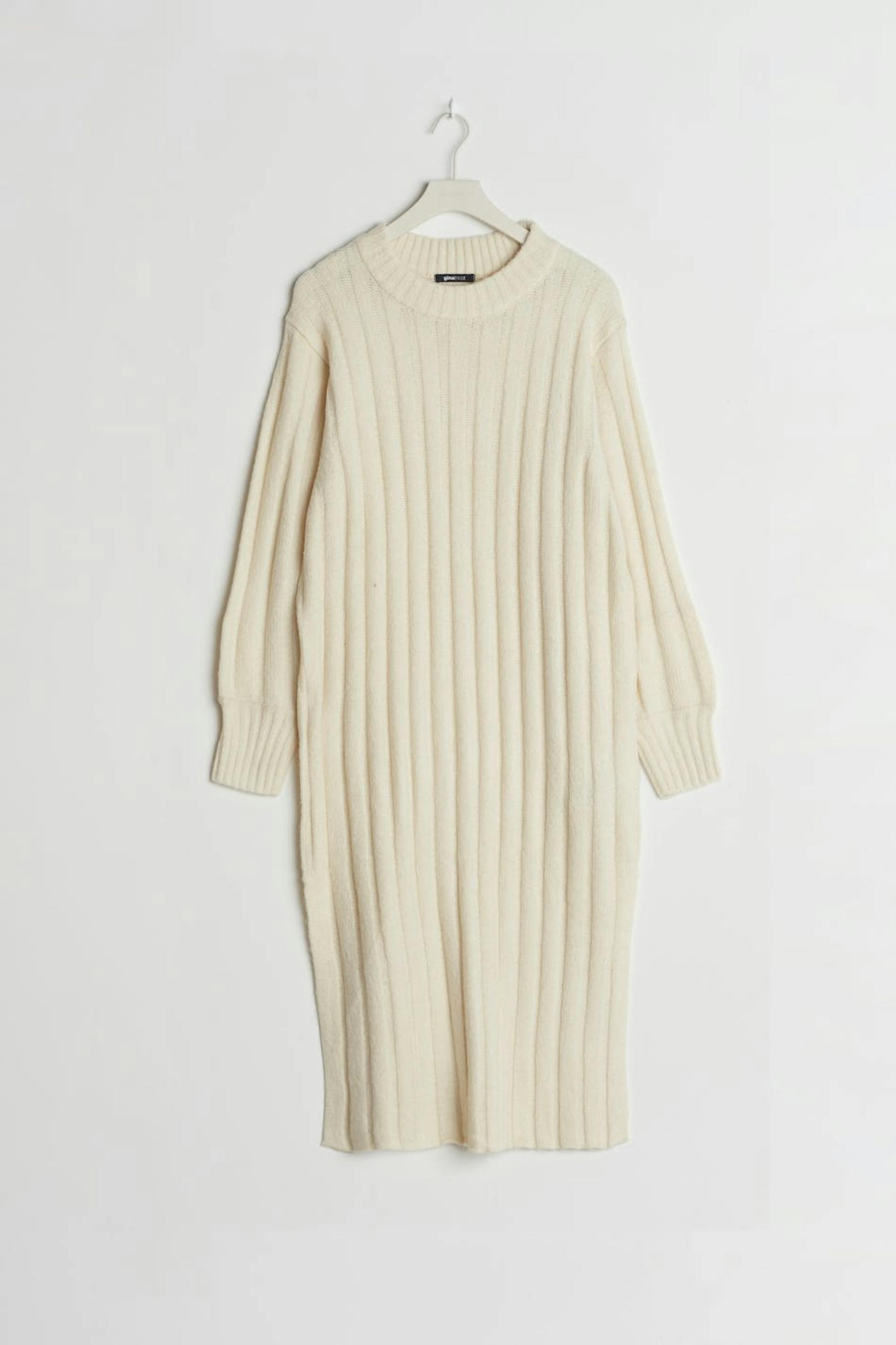 Knitted dress with a loose fit. The dress is beige and has midi length. It has a crew neckline, slit on the sides and a ribbed cuff on the sleeve ends and on the neckline.