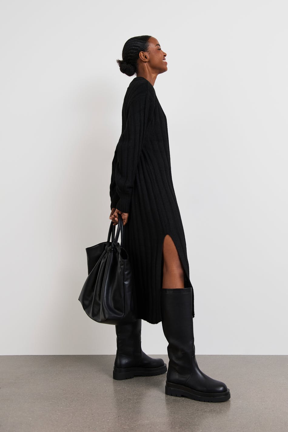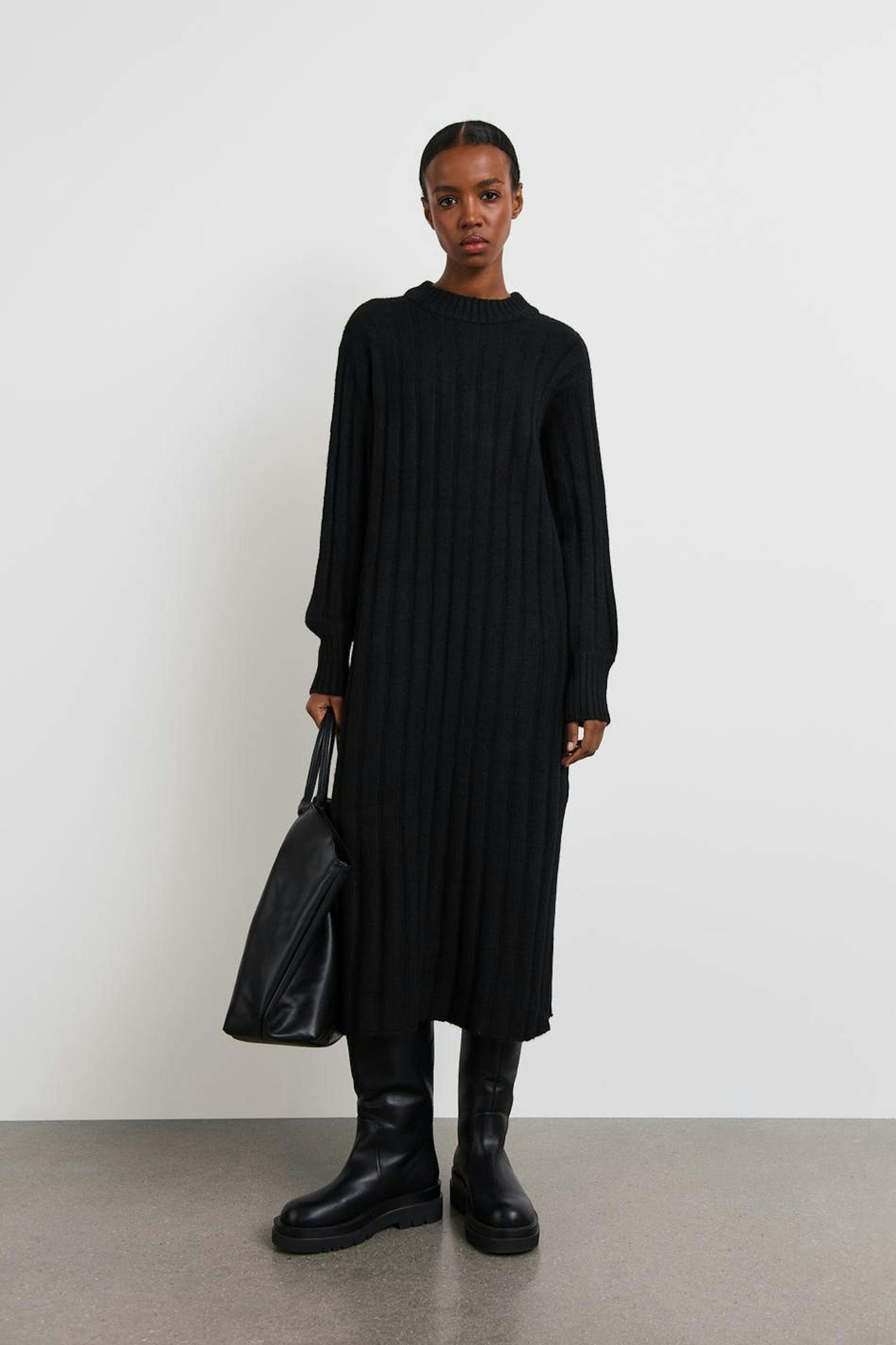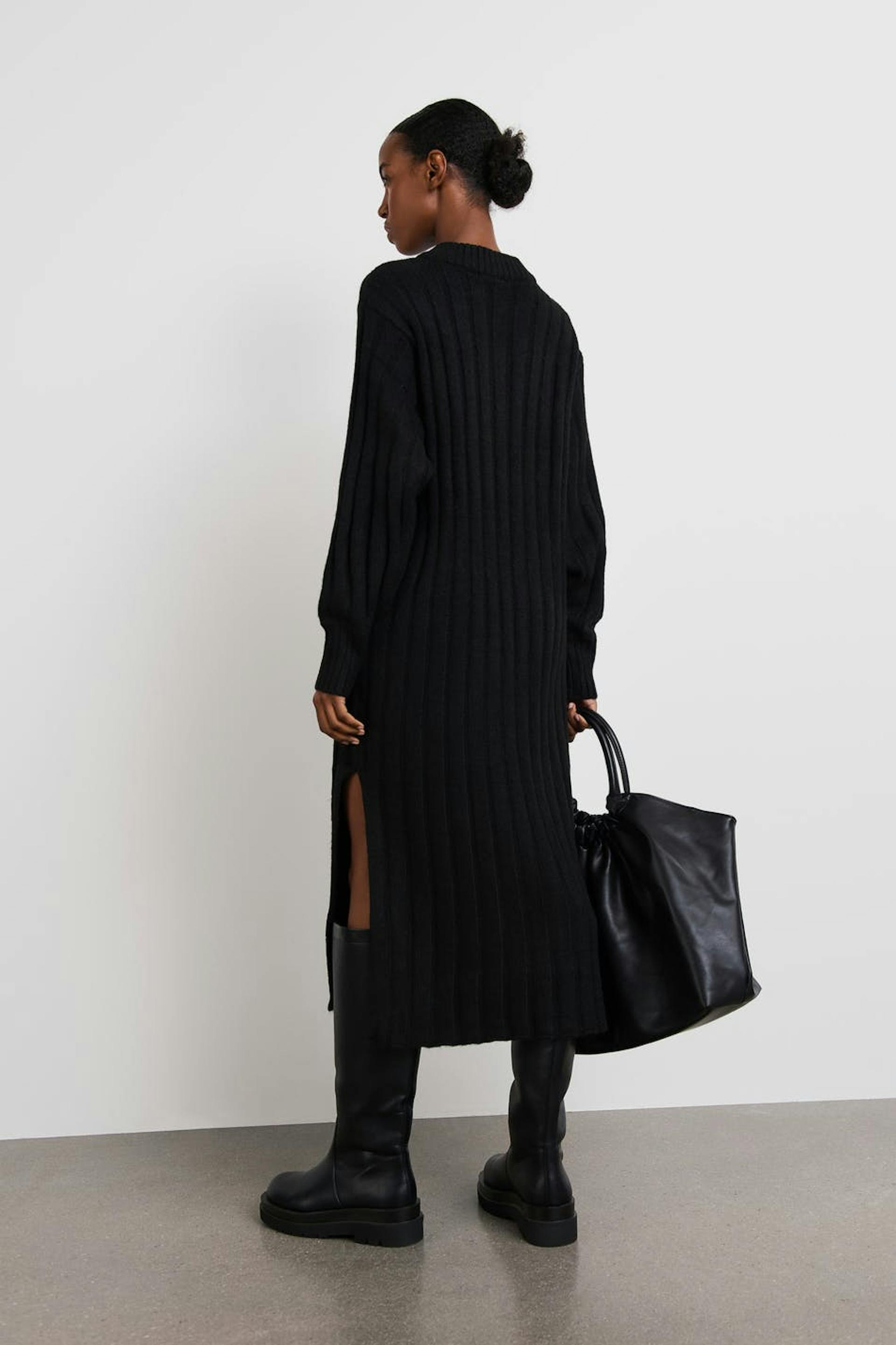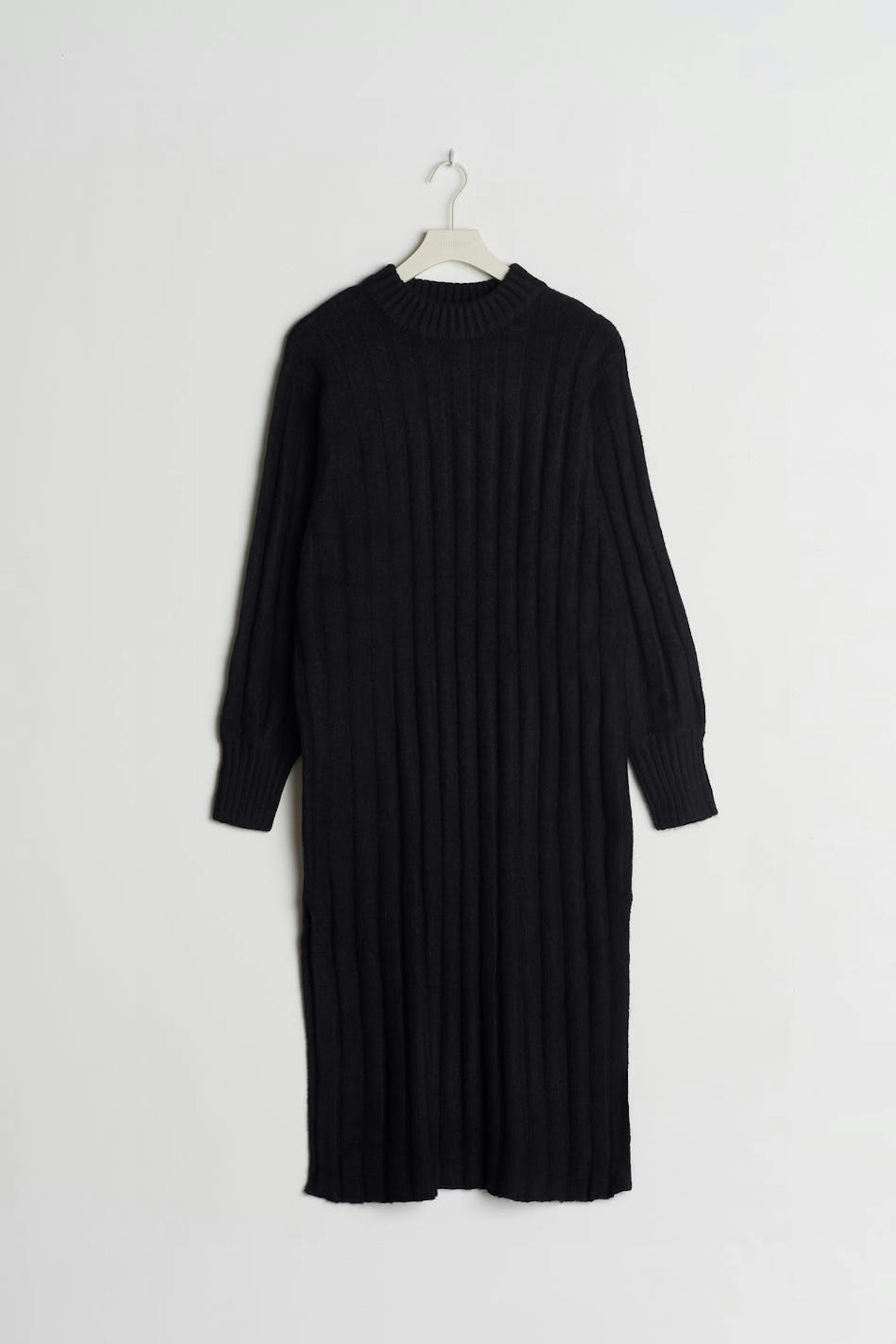 Knitted dress with a loose fit. The dress is black and has midi length. It has a crew neckline, slit on the sides and a ribbed cuff on the sleeve ends and on the neckline.
