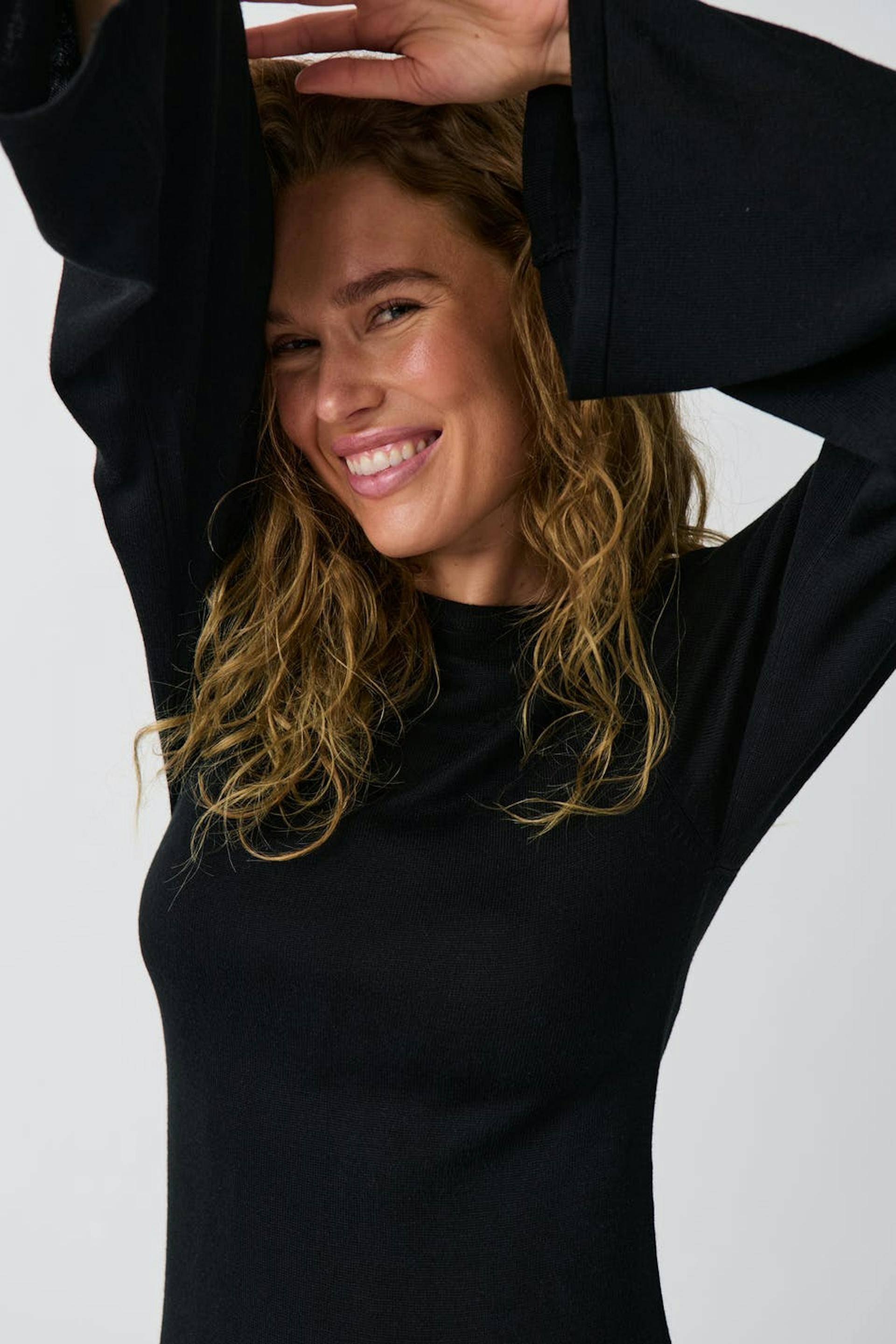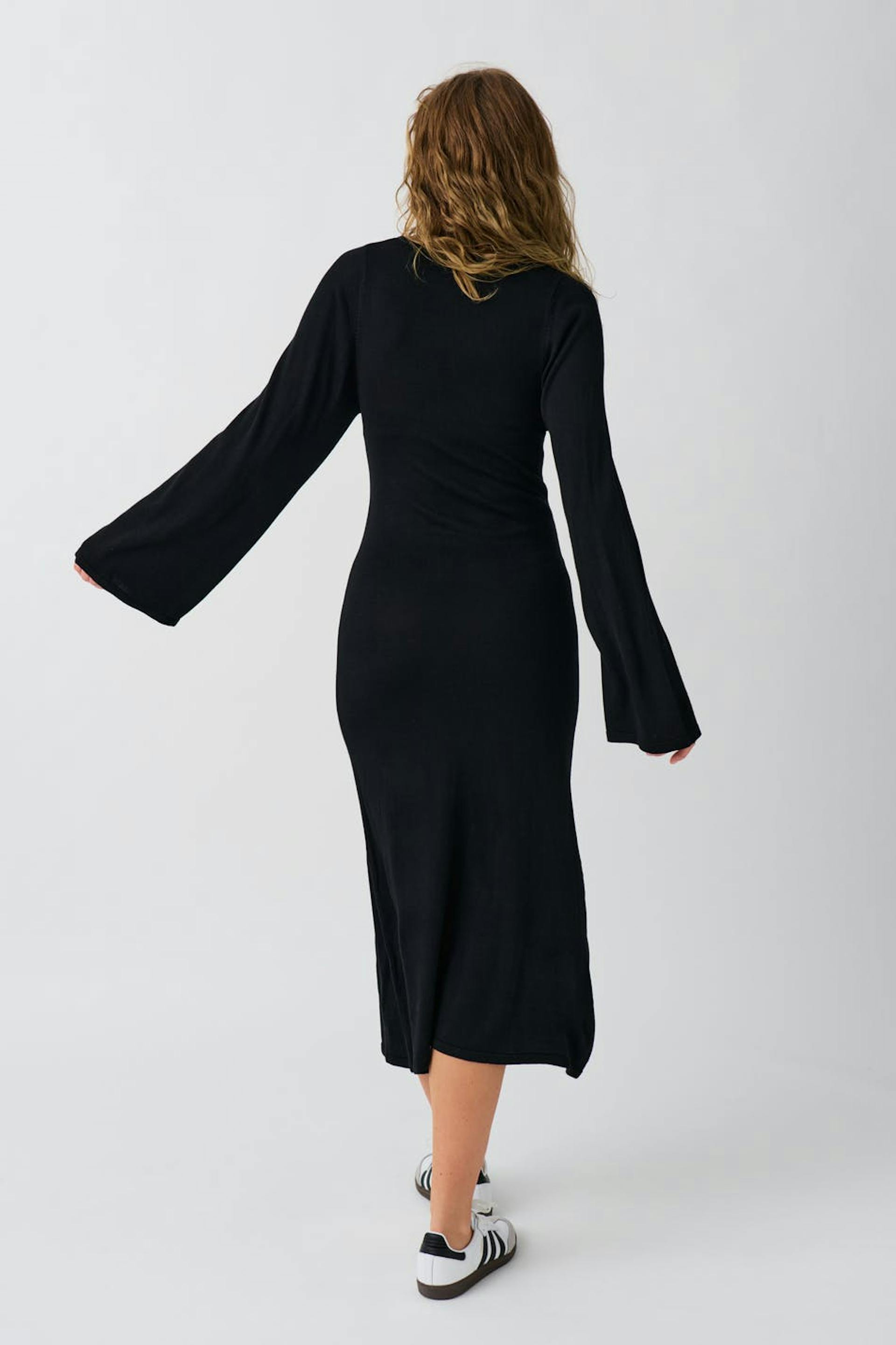 Knitted dress with long sleeve. The dress is black and has round neckline. It has midi length.