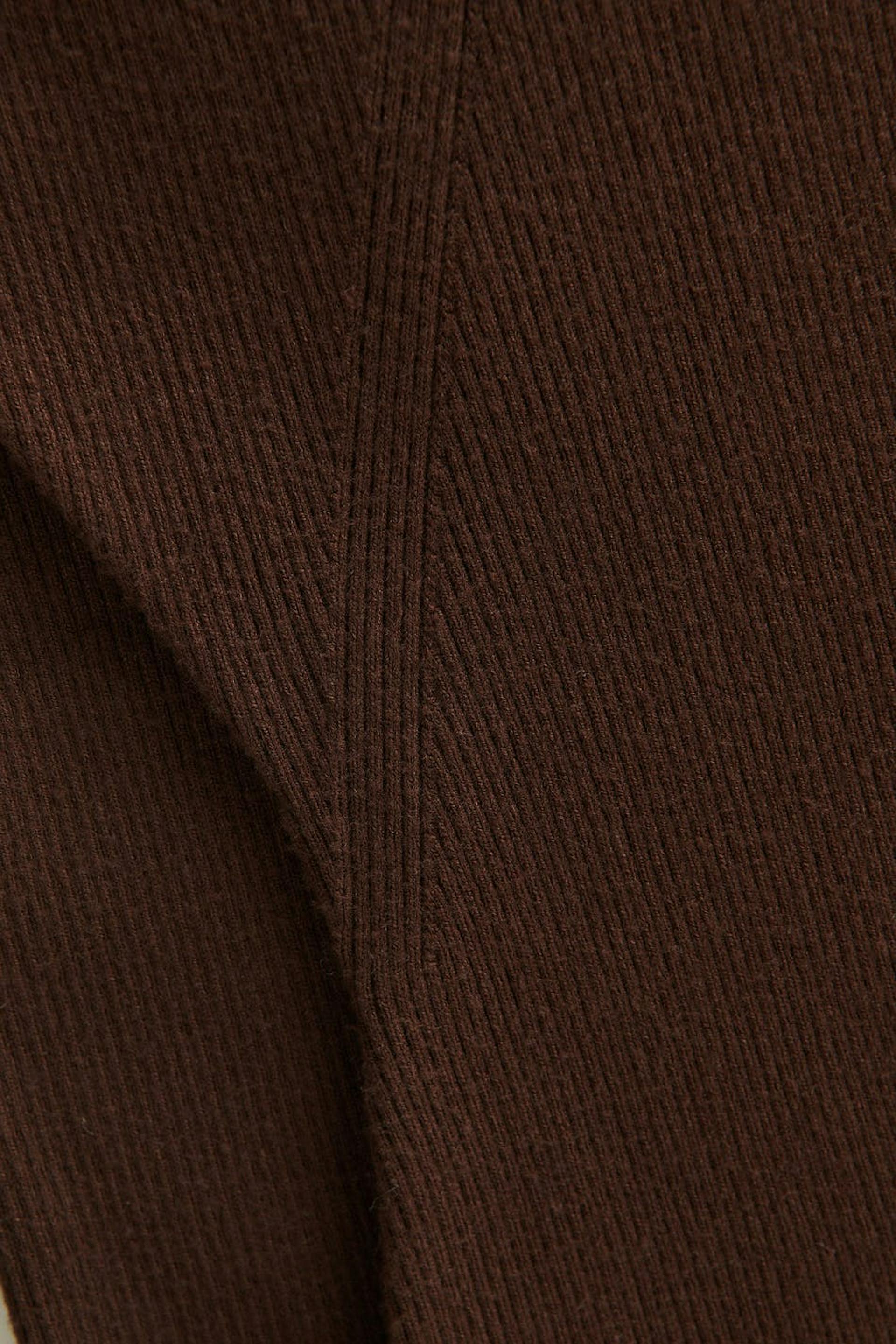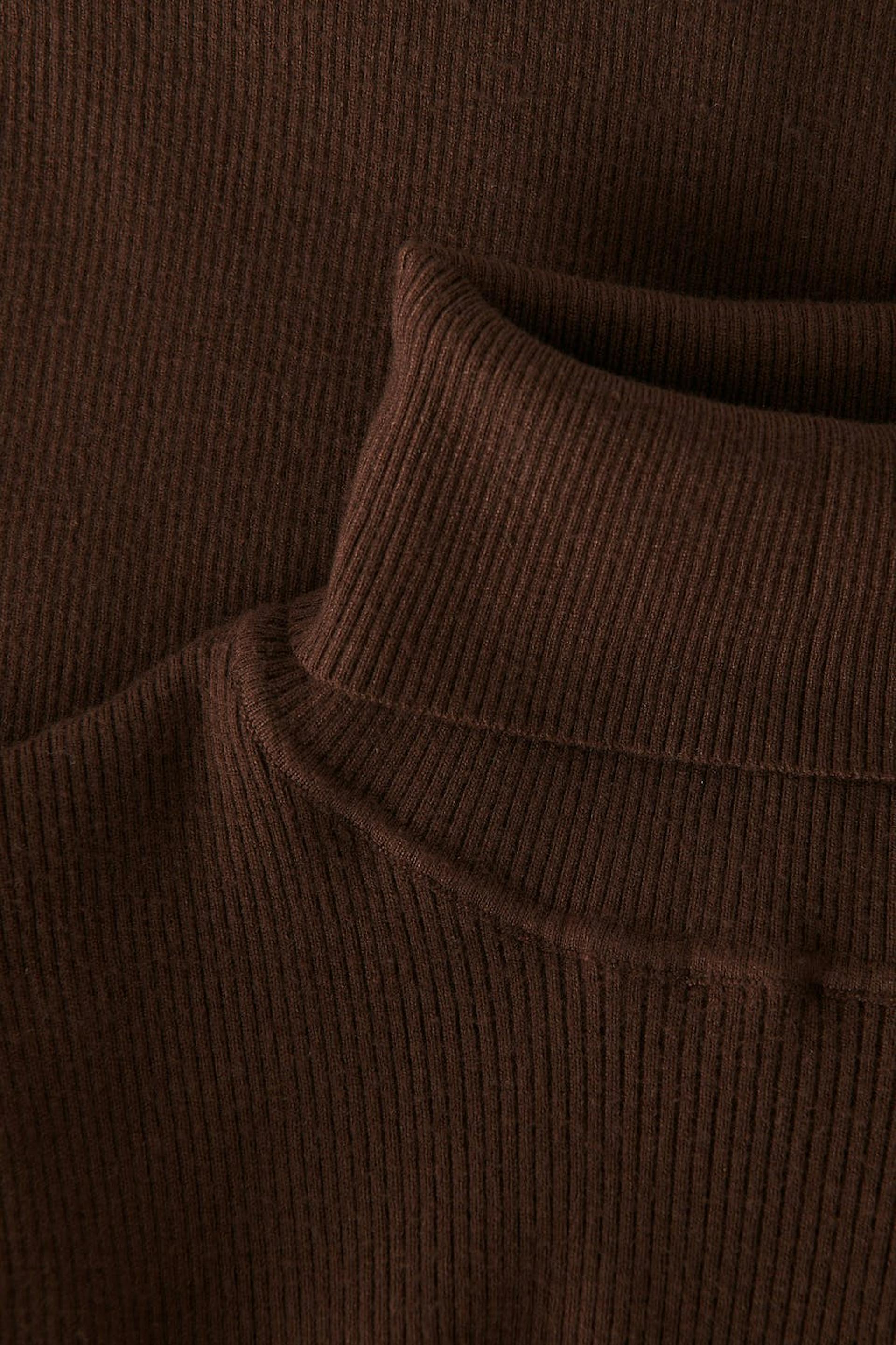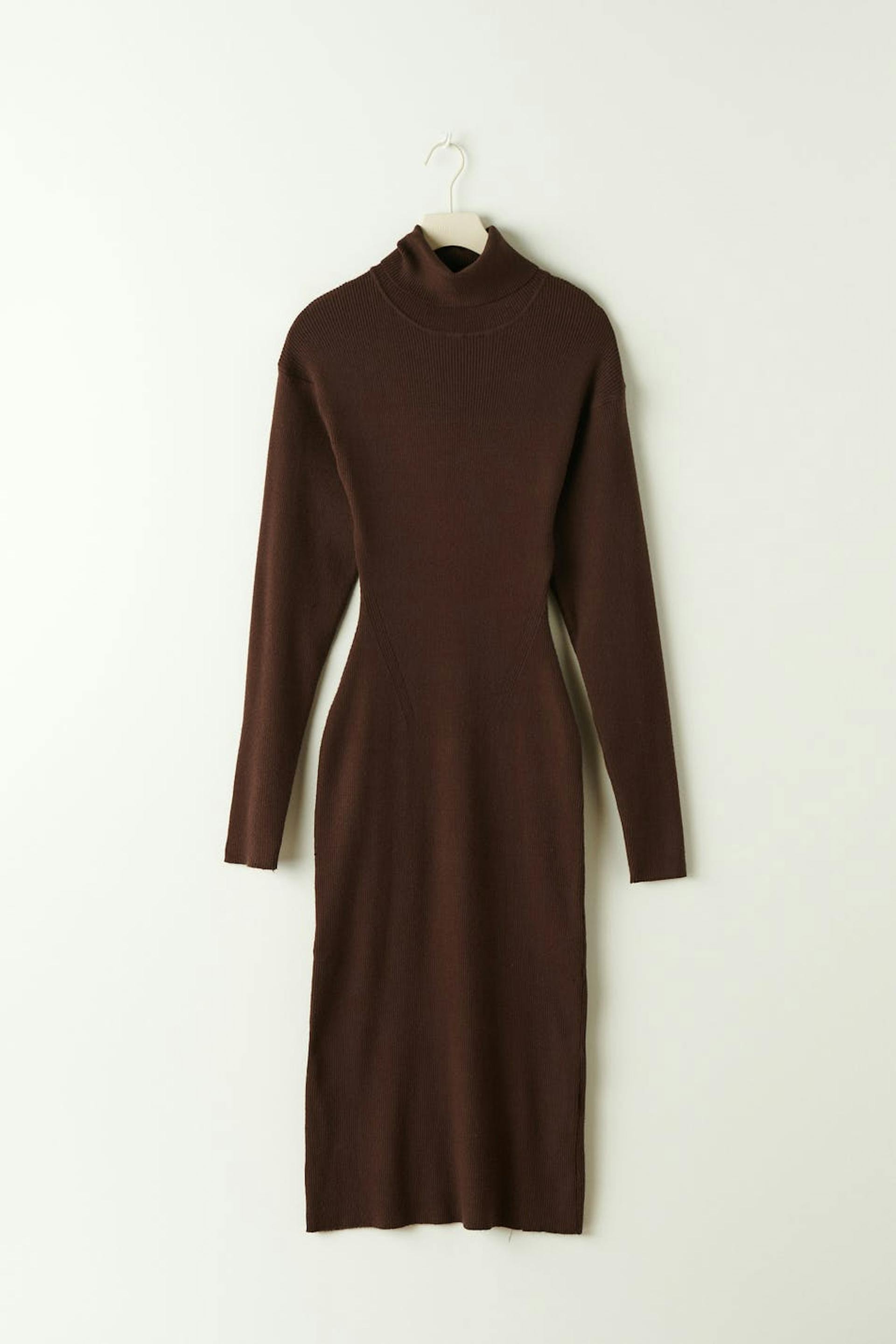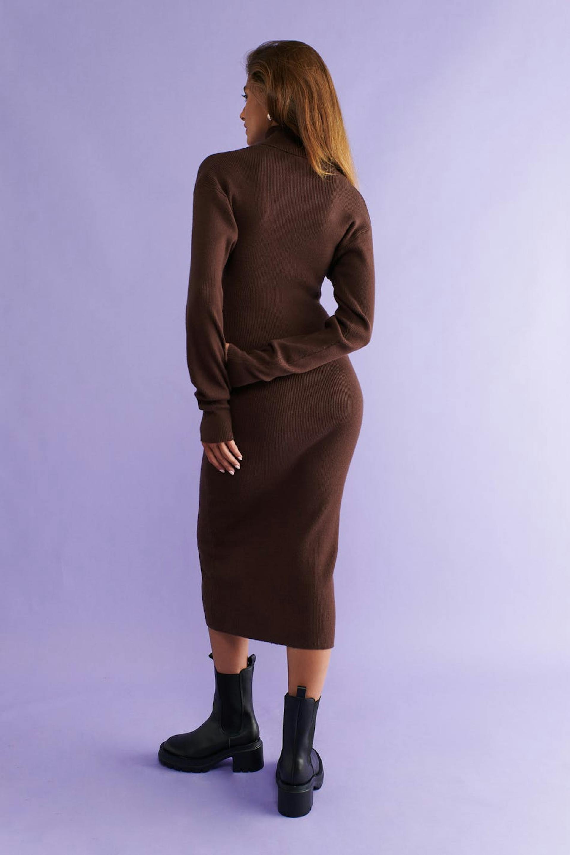 Knitted dress with turtleneck. The dress is brown, long-sleeved and ribbed. It has shoulder pads, fitted fit and midi length.