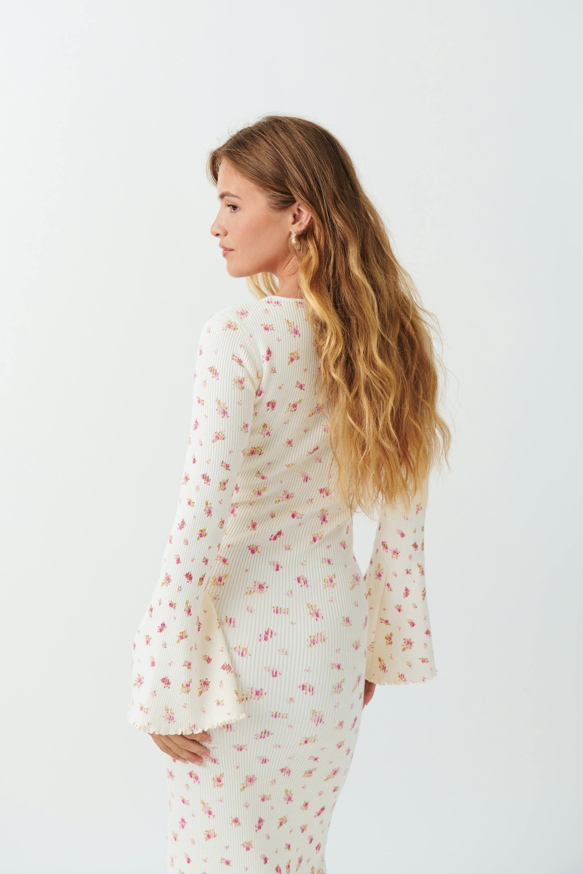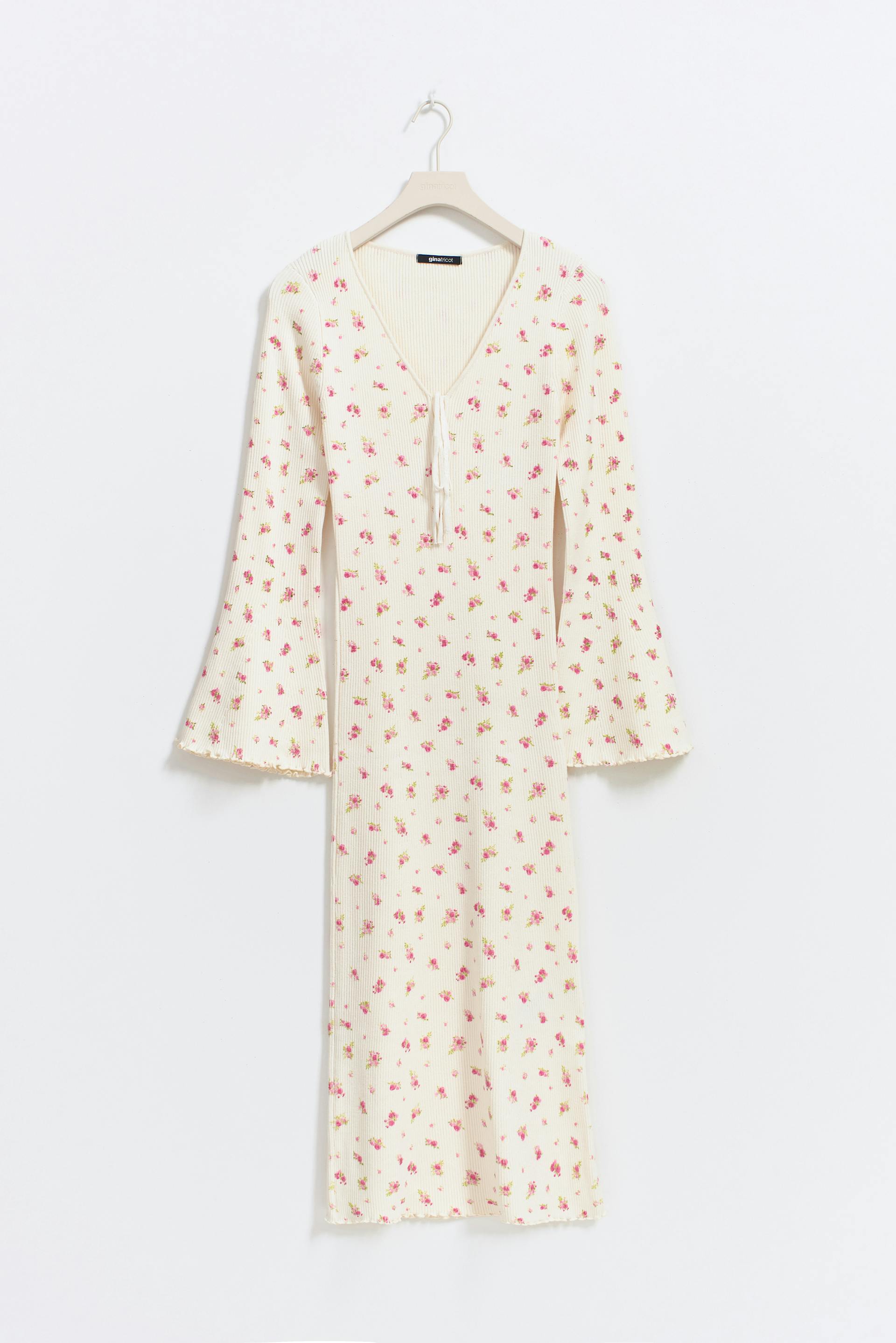 Floral dress with self-tie at the front. The dress is white, long-sleeved and ribbed. It has figure-hugging fit, v-neck, lantern sleeve, midi length and overlocked hem.