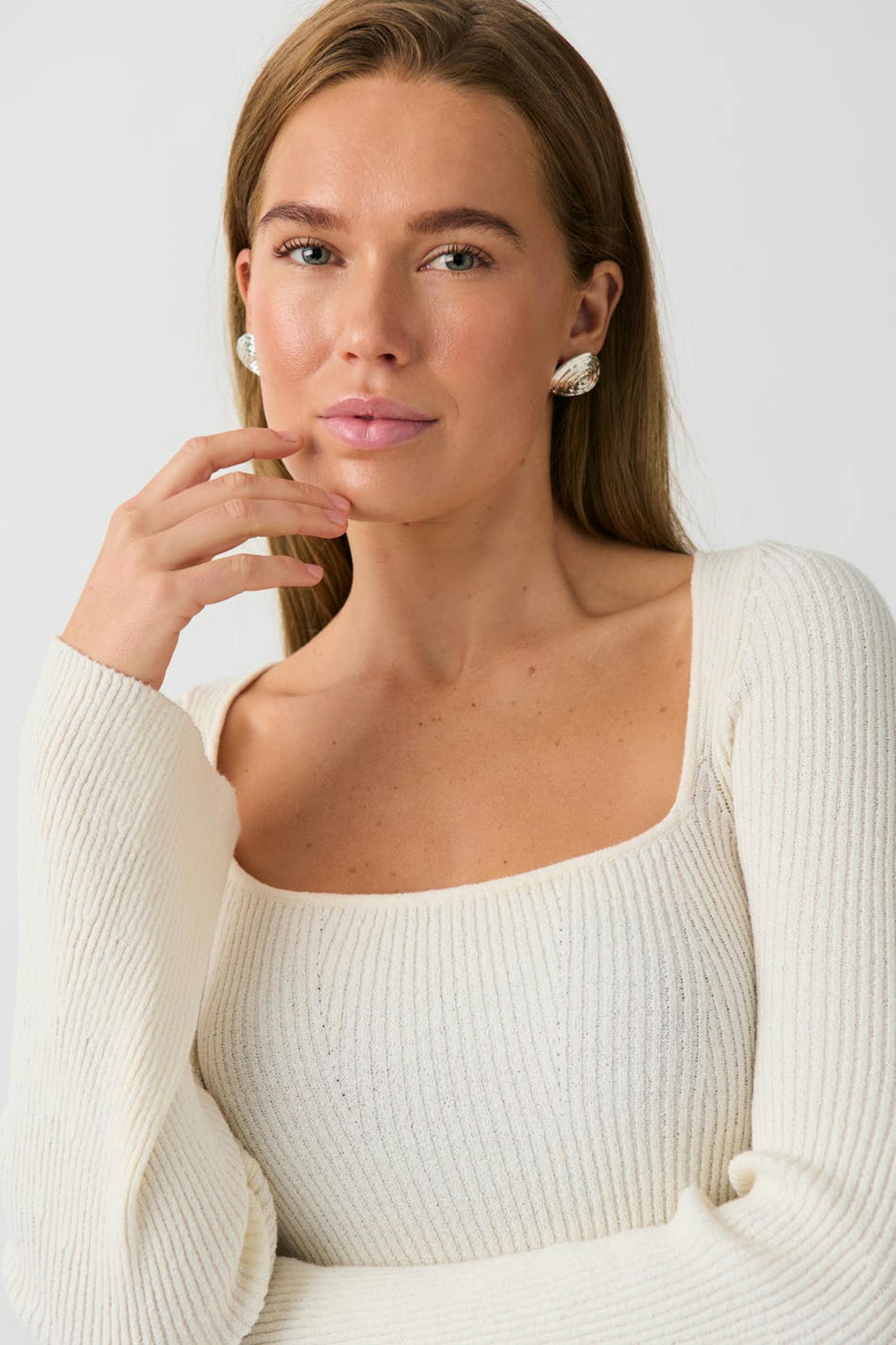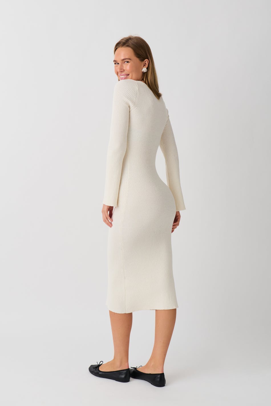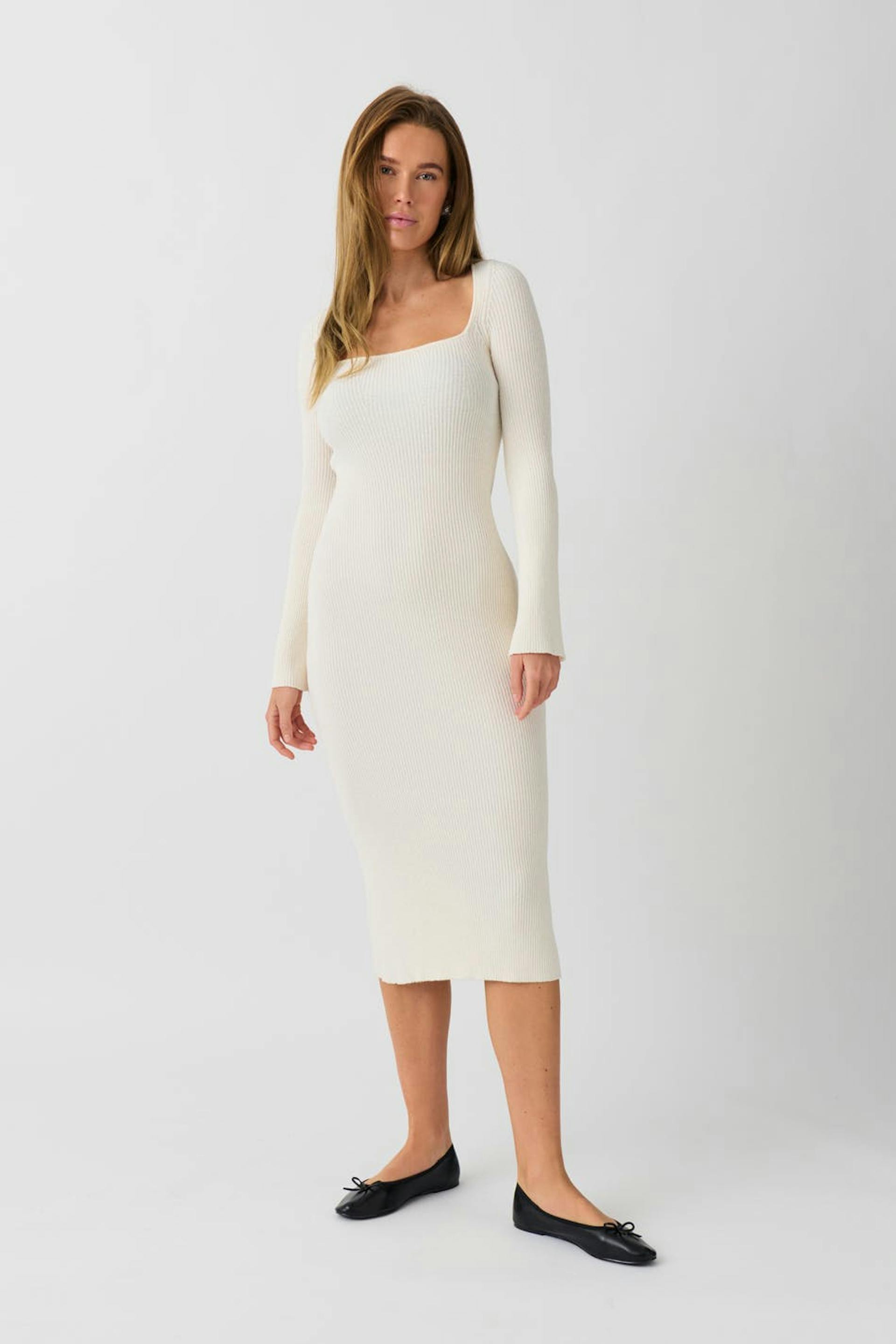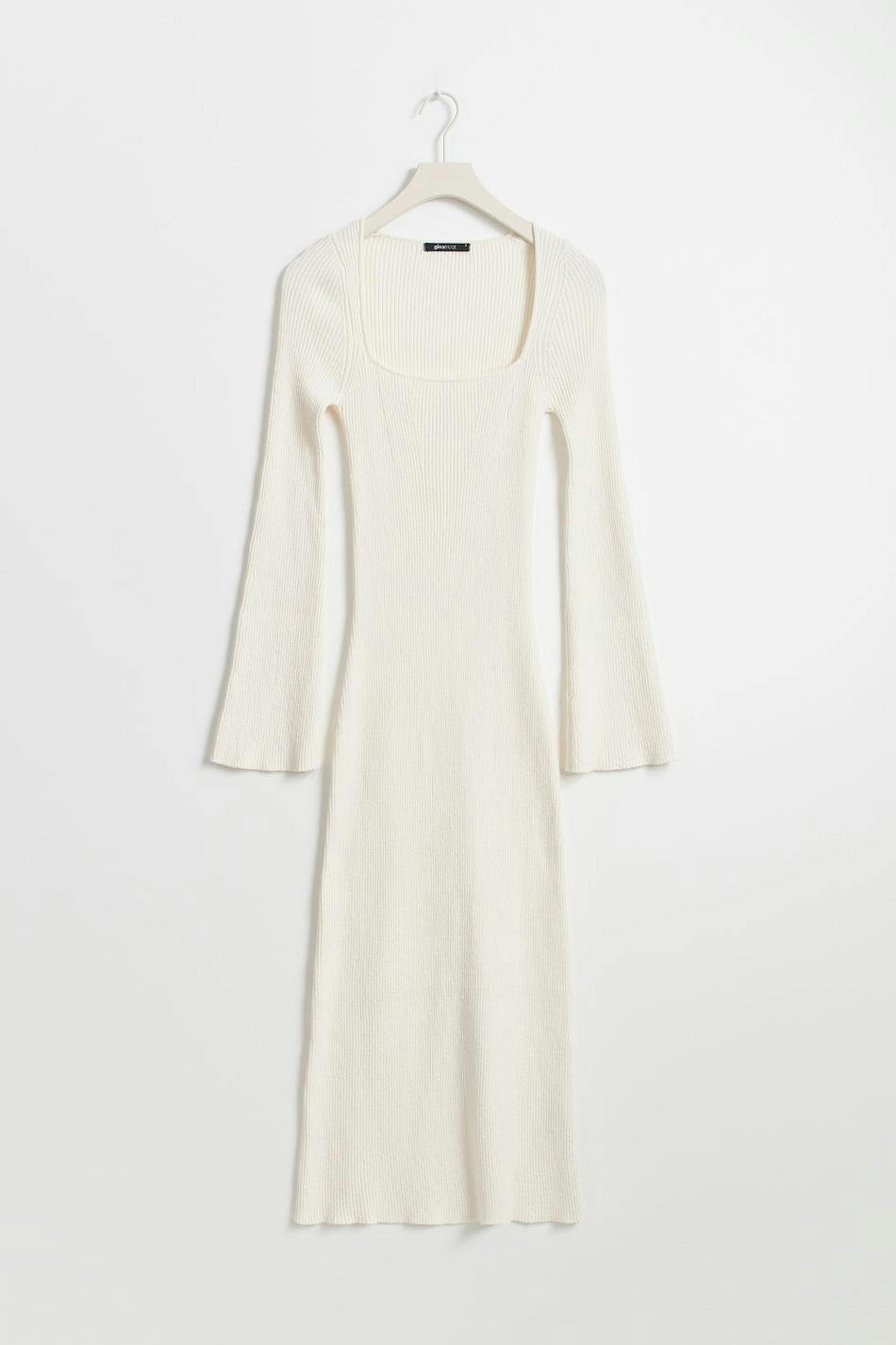 Knitted dress with square neckline. The dress is white and has long trumpet sleeve. It has figure-hugging fit, midi length and fully-fashioned section at chest.