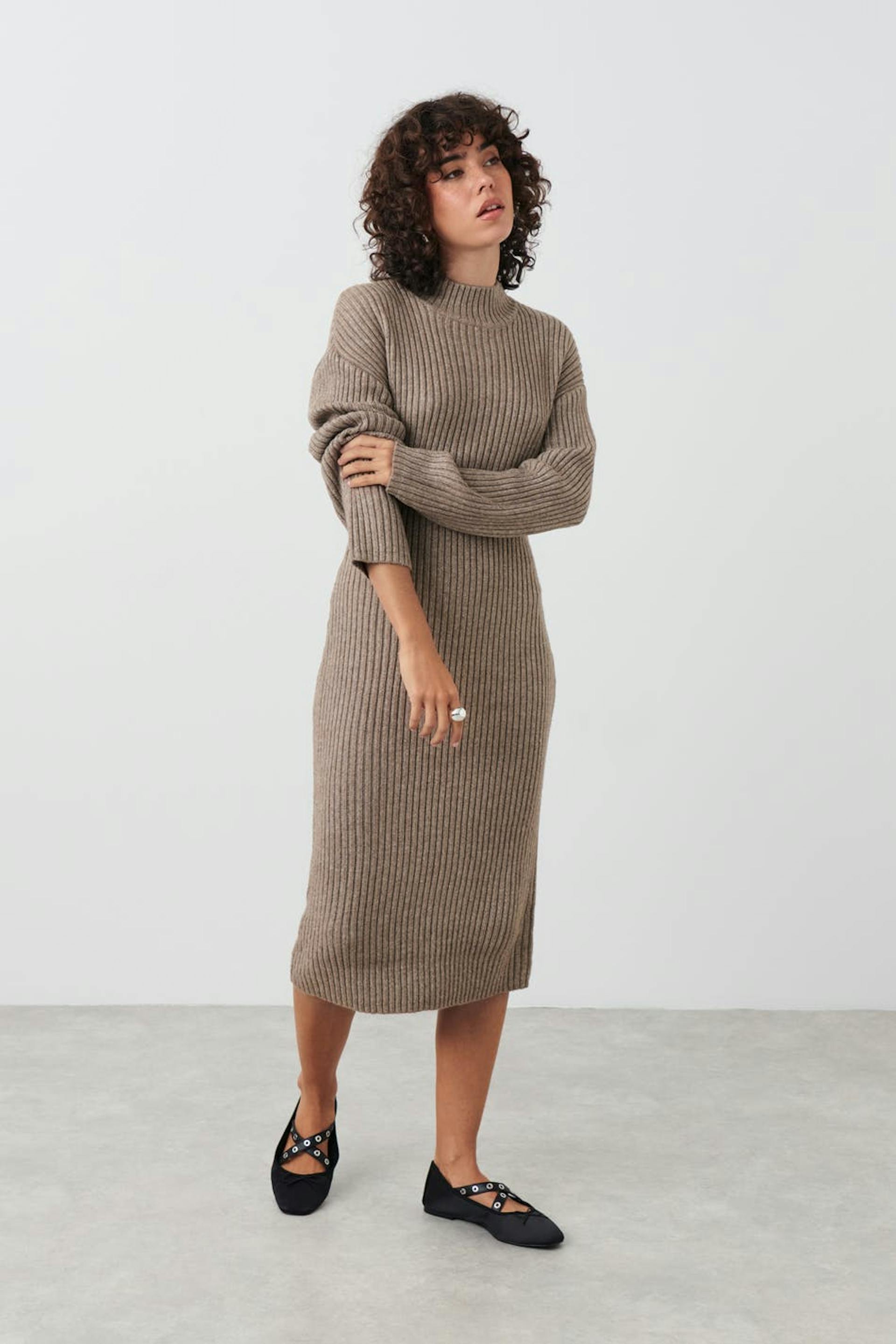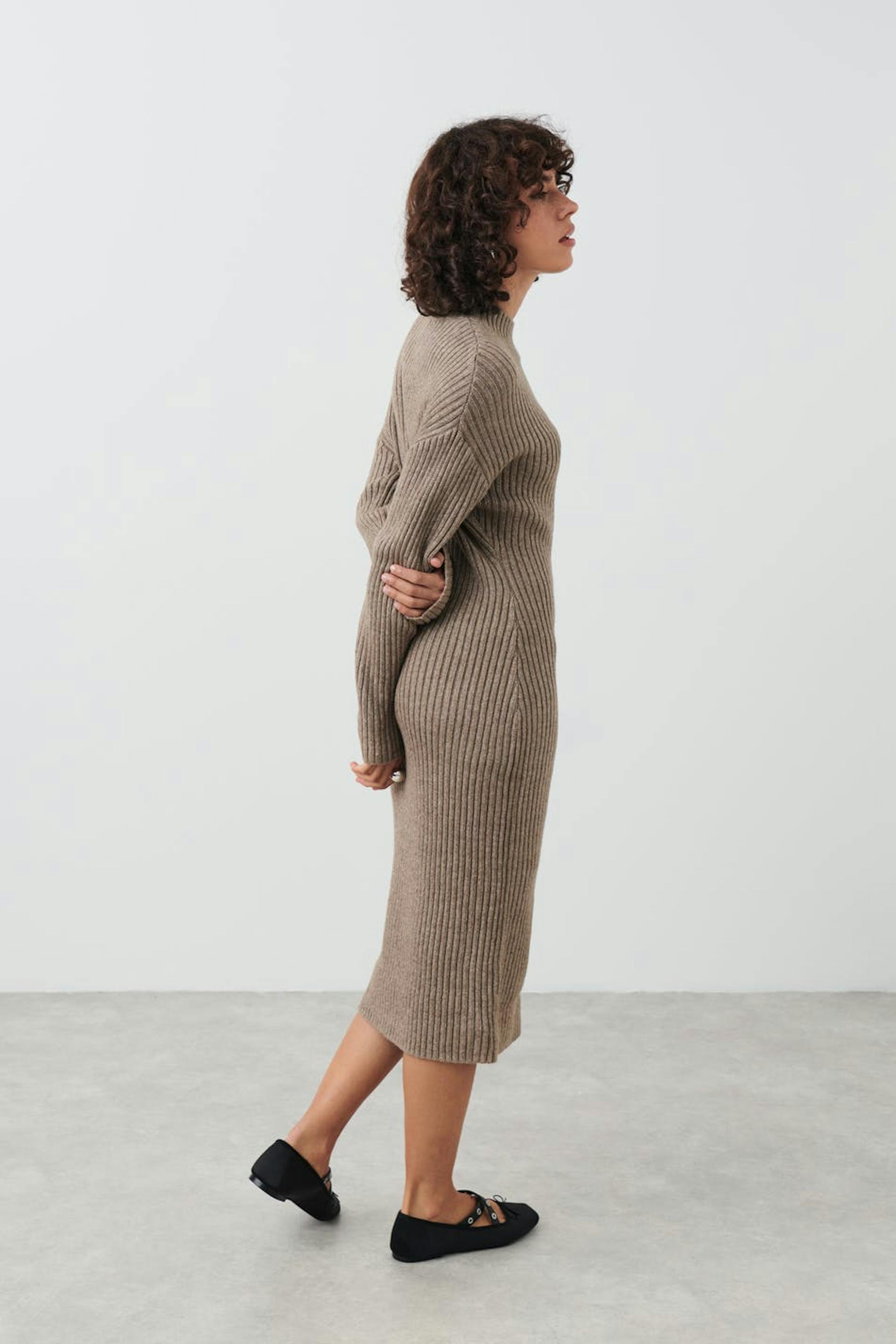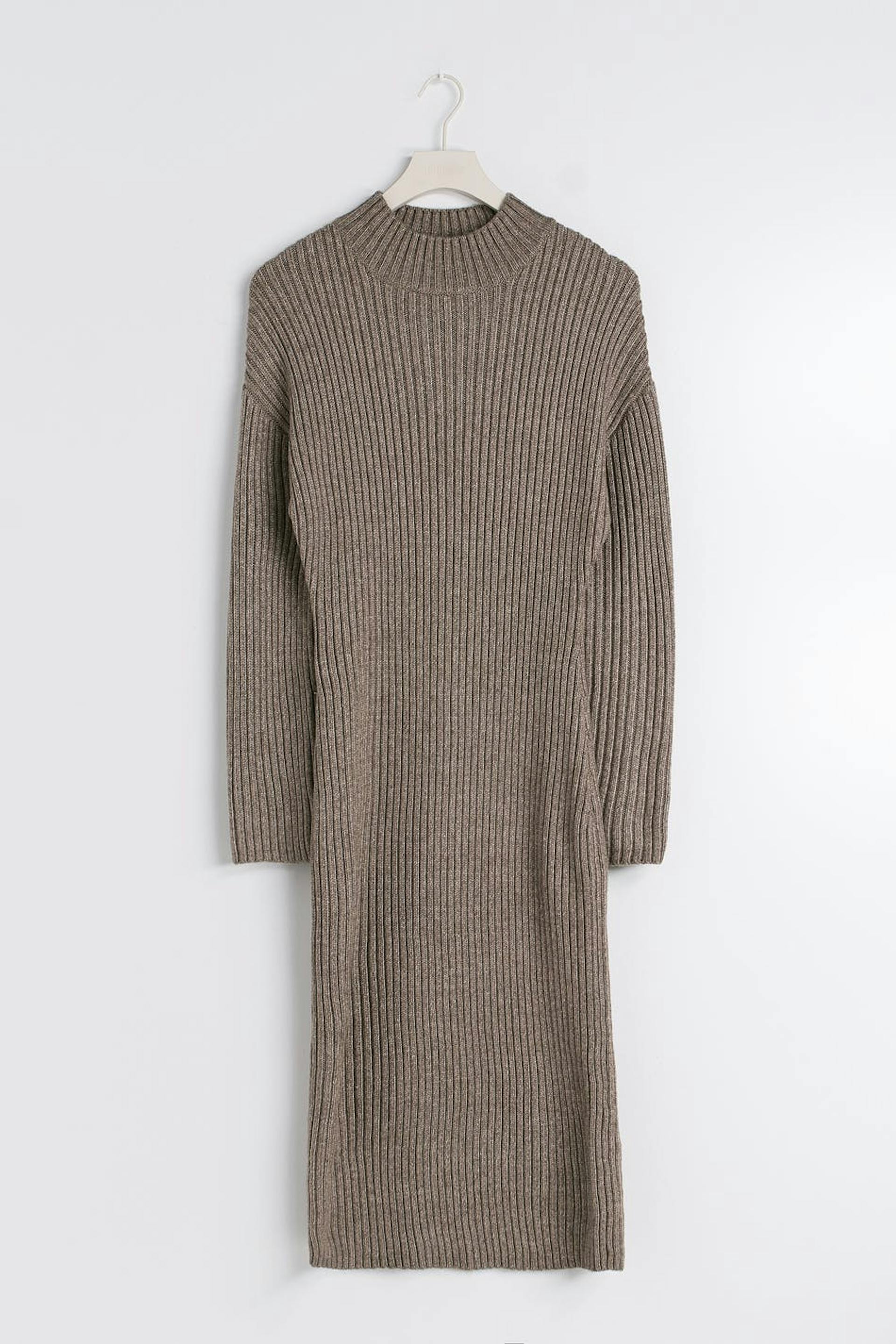 Knitted midi dress with turtleneck. The dress is brown and has ribbed quality. It has long sleeve with dropped shoulder.