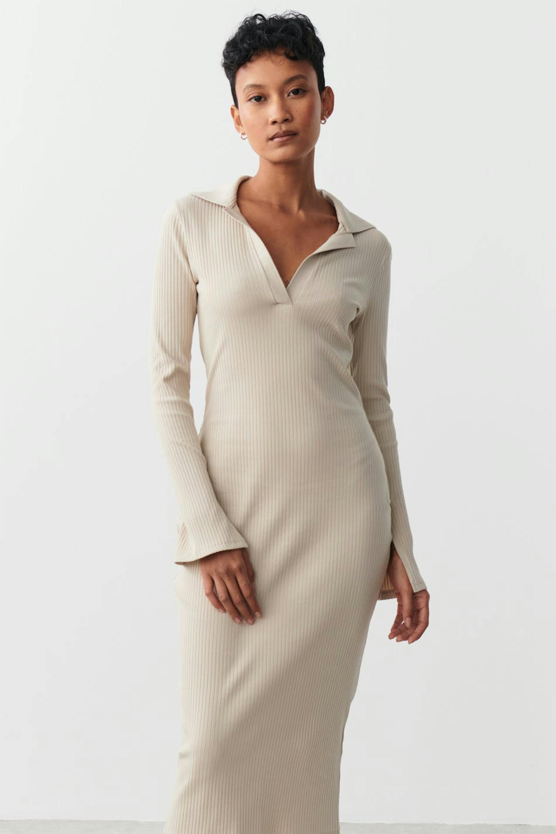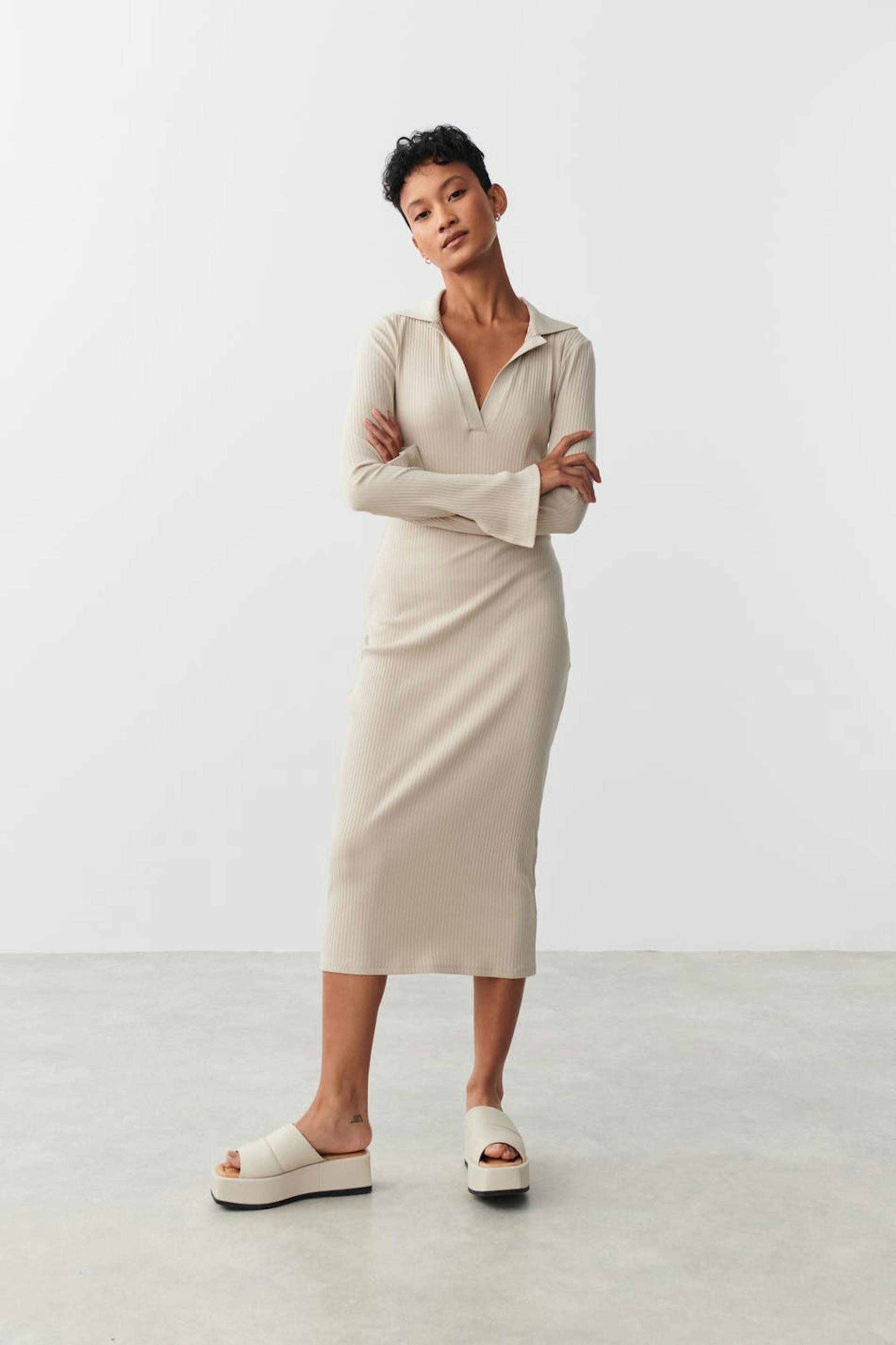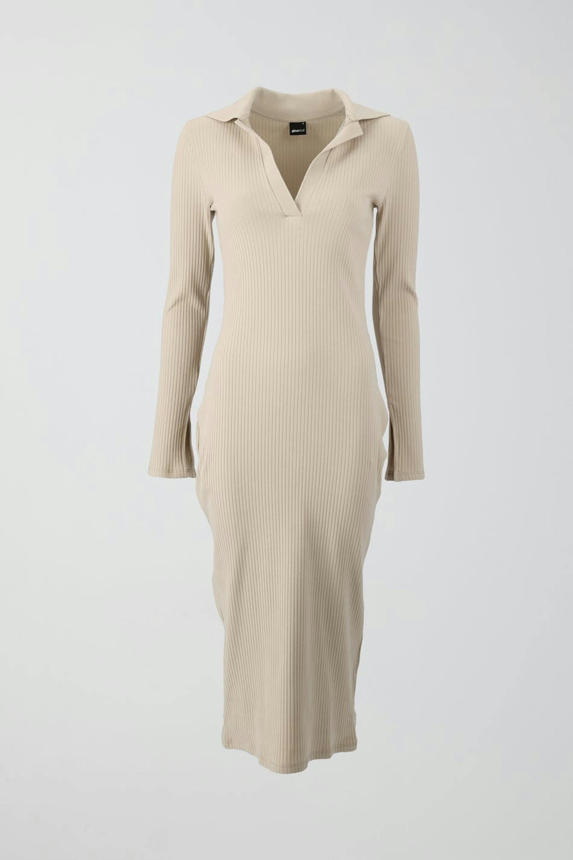 Ribbed dress in jersey with figure-hugging fit. The dress is beige and has collar with wrapover V-neck. It has midi length and long sleeve with slit.