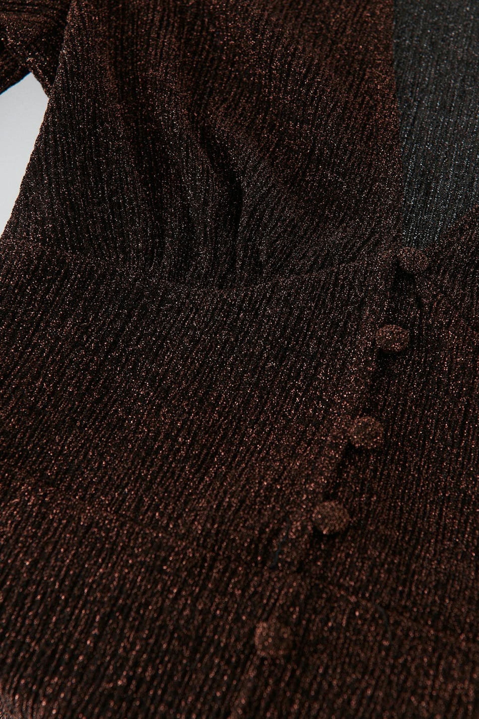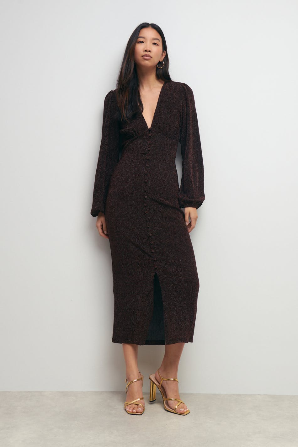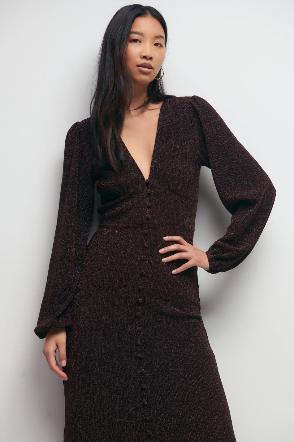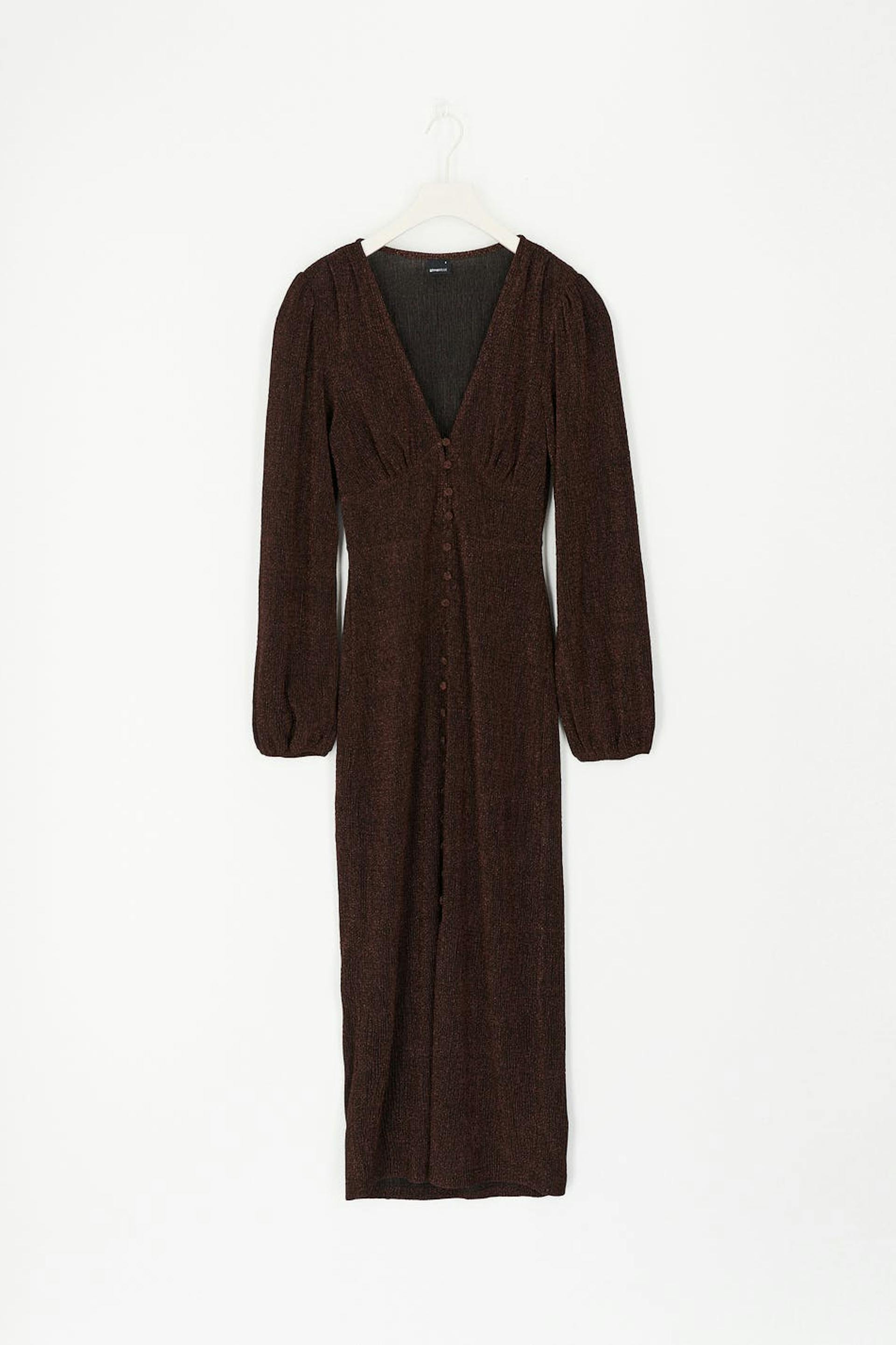 Long-sleeved glitter dress with buttons along the front. The dress is brown and has a stretchy quality. It has v-neck, elasticized cuffs and midi length.