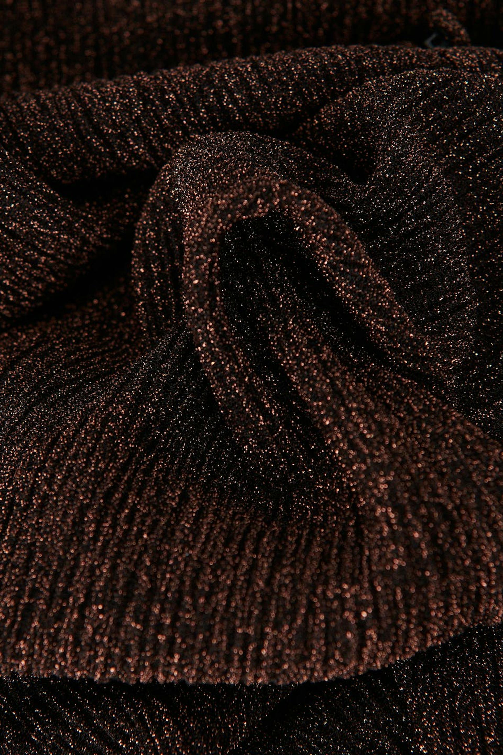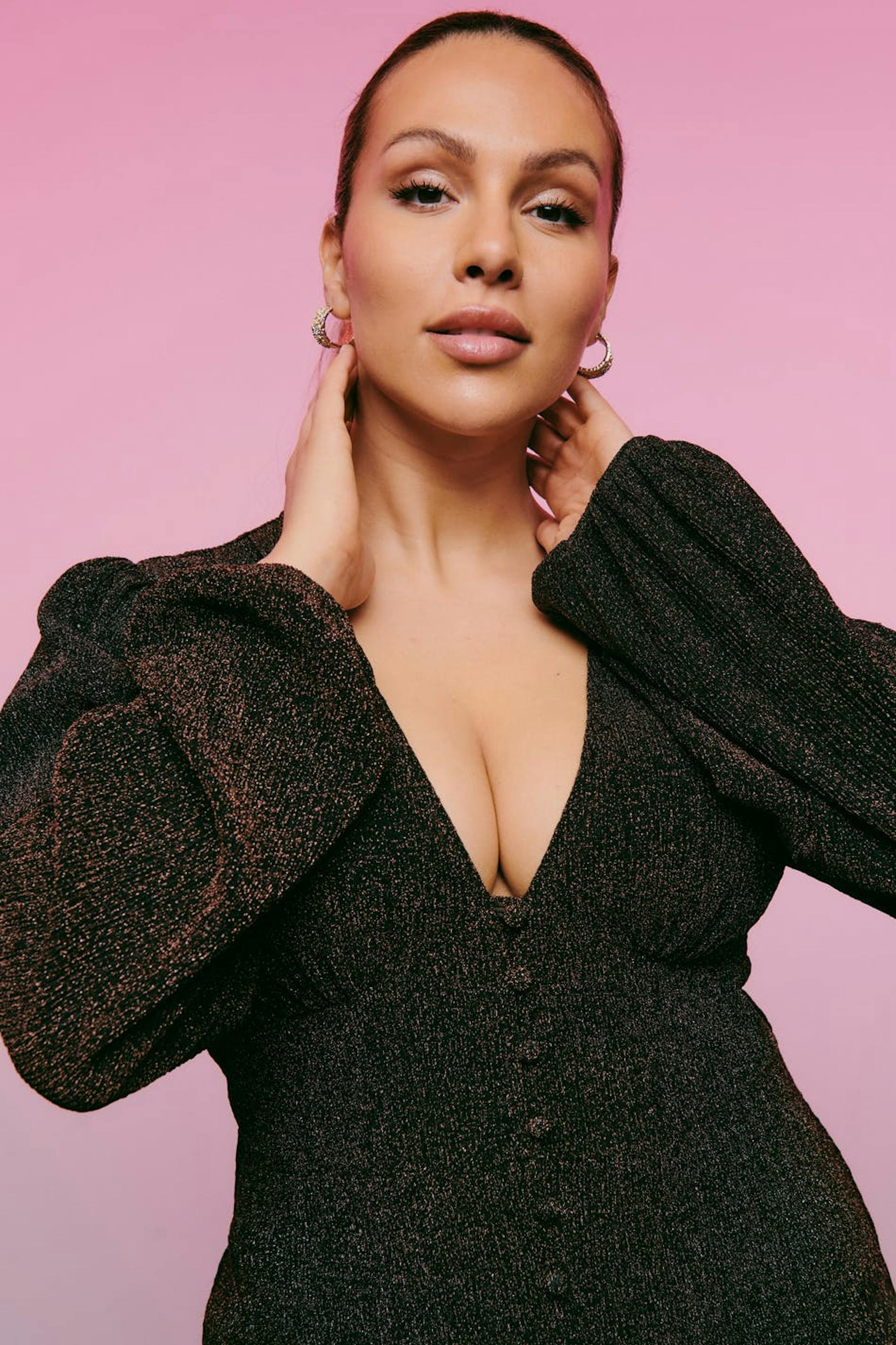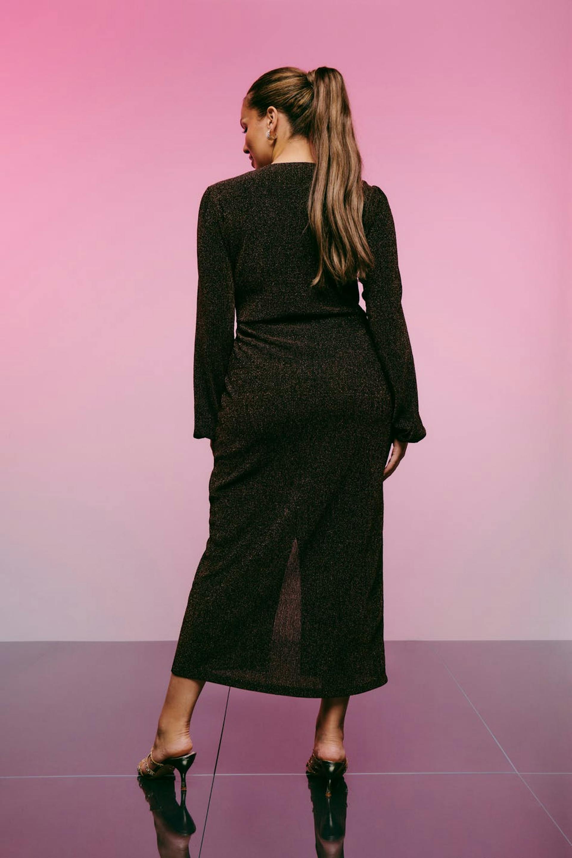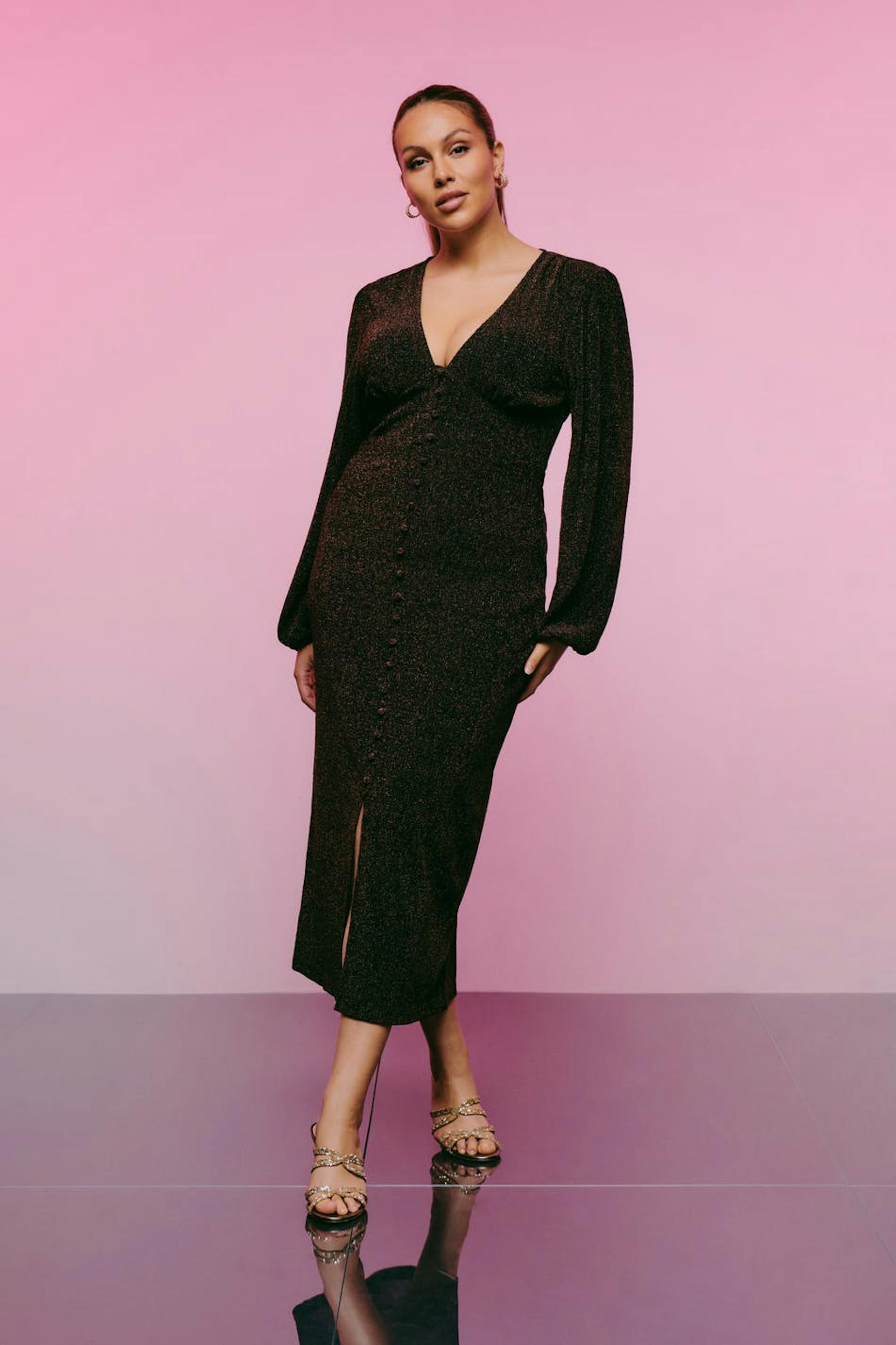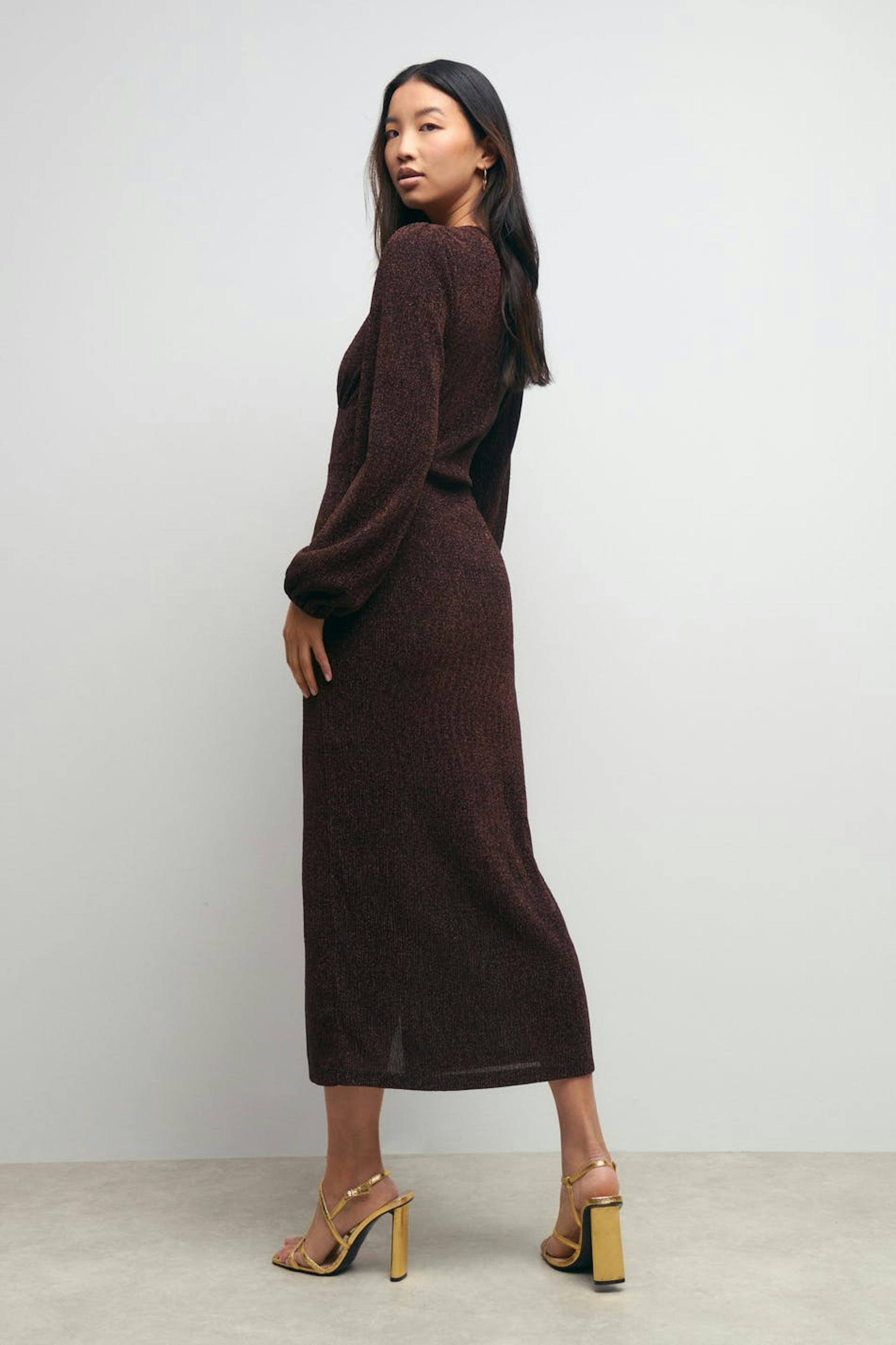 Long-sleeved glitter dress with buttons along the front. The dress is brown and has a stretchy quality. It has v-neck, elasticized cuffs and midi length.