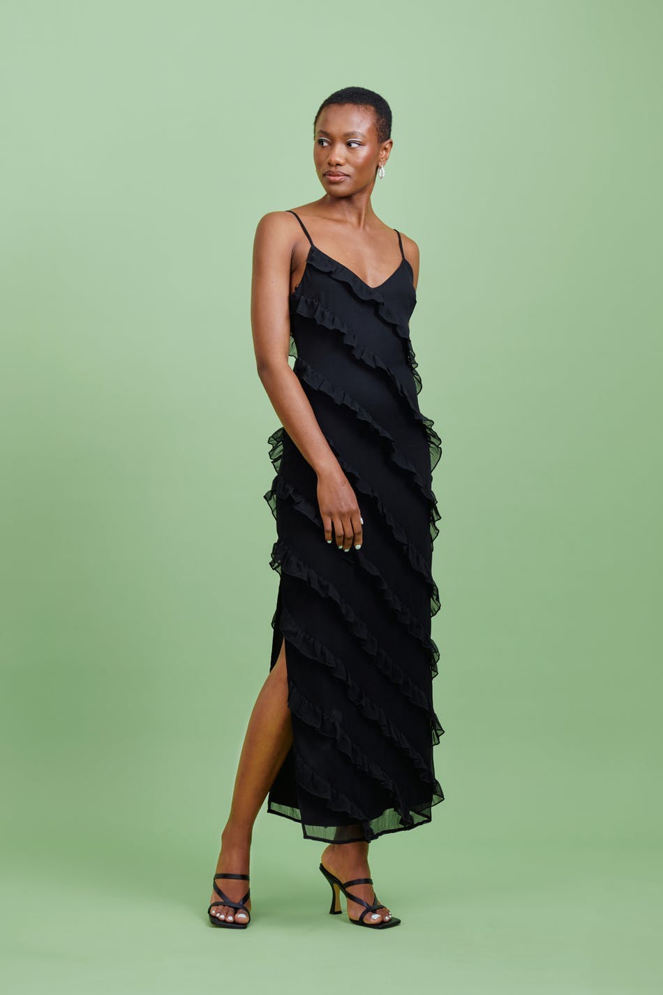 Sleeveless maxi dress in chiffon with frills. The dress is black and has slit at the side. It has open back, thin, adjustable shoulder straps, v-neck and zip in the side seam.