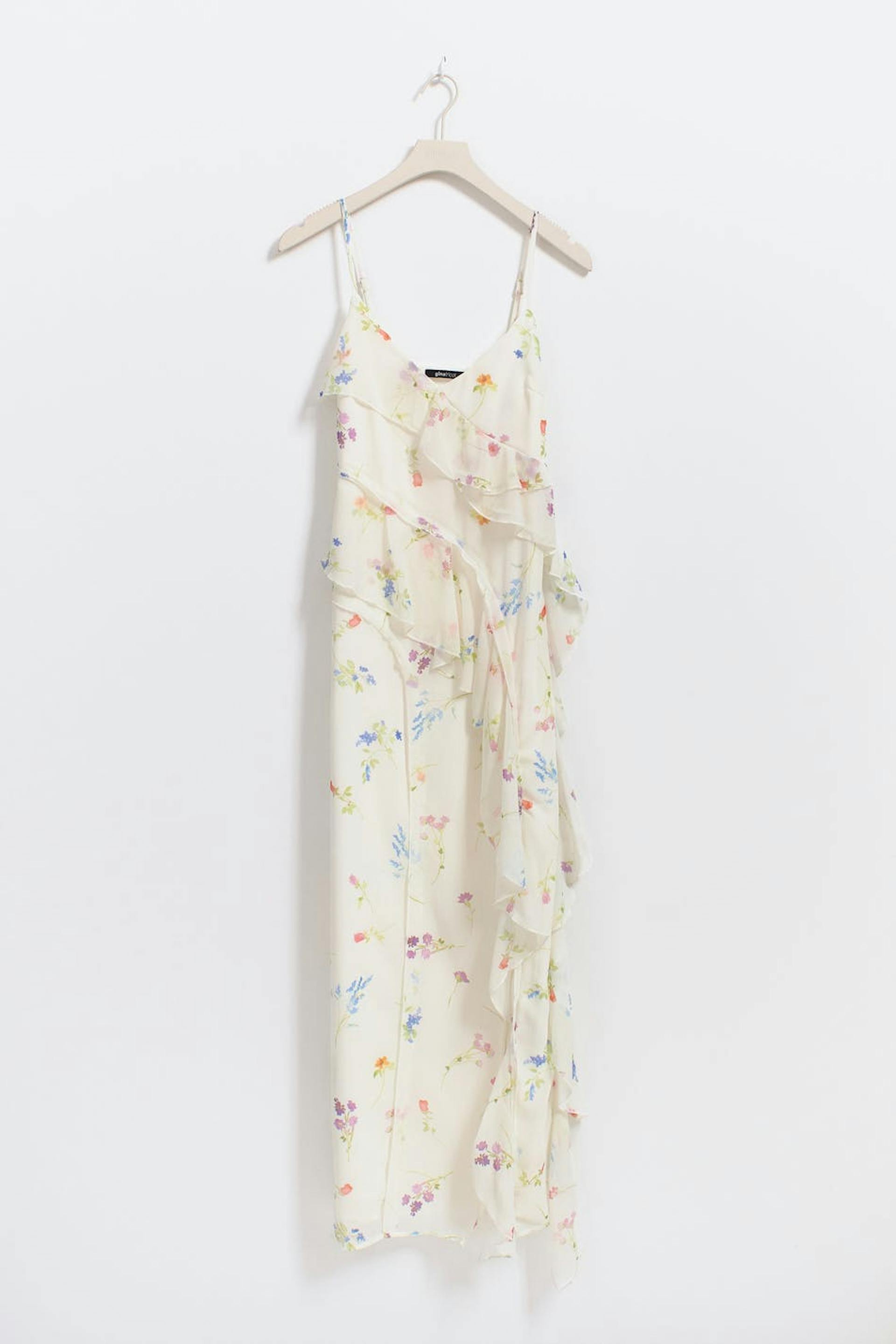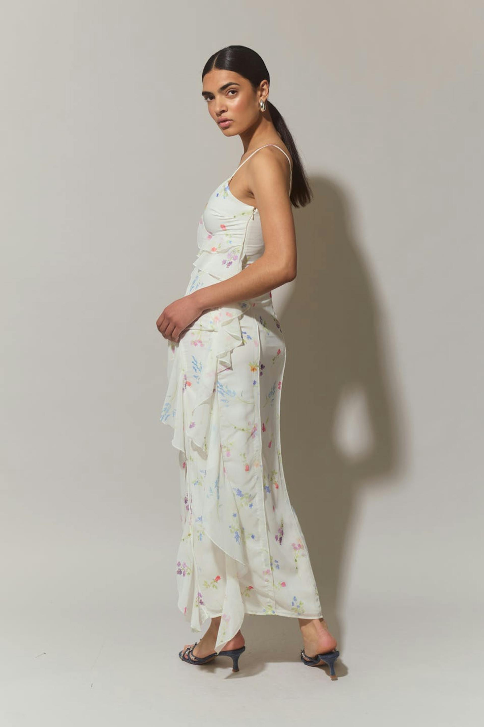 Floral dress in chiffon with frill details at the front and at the side. The dress is beige, blue and sleeveless. It has slit at the side, v-neck, slim, adjustable shoulder straps and zip in the side seam.