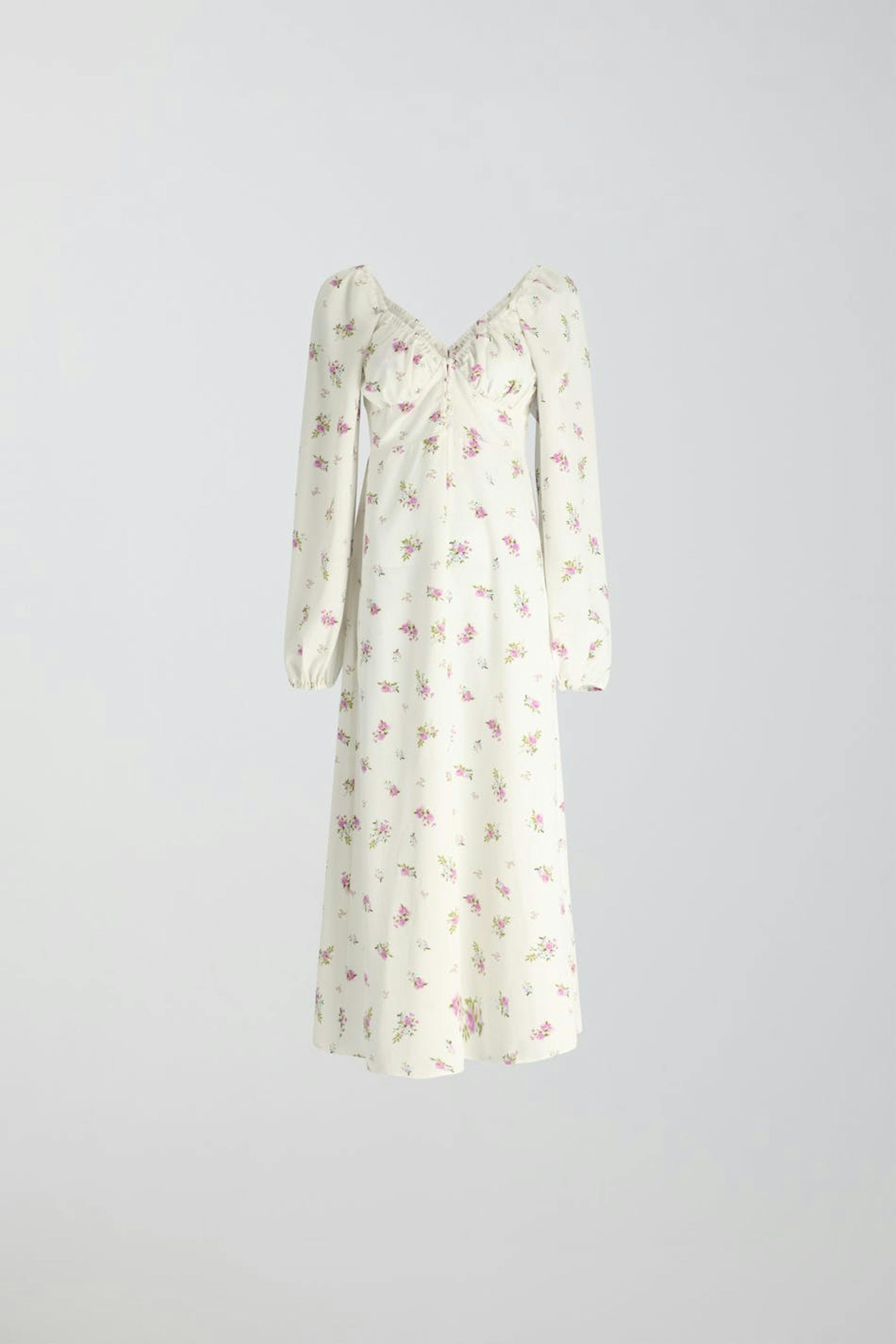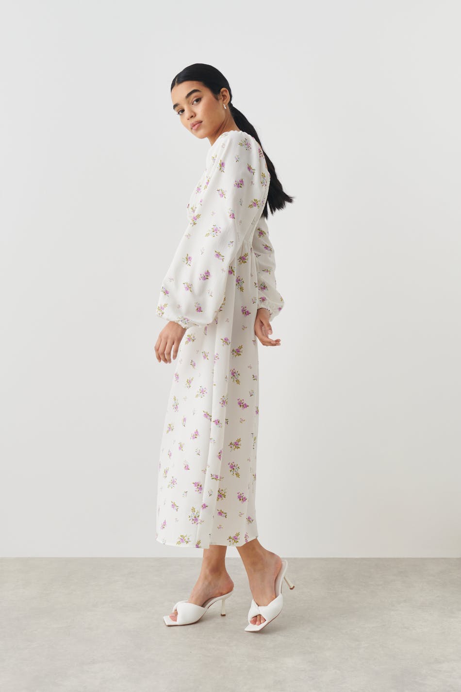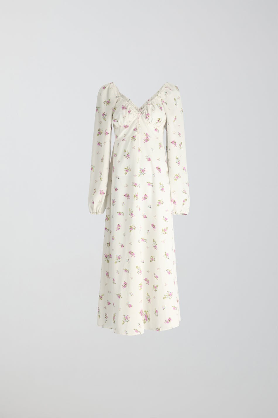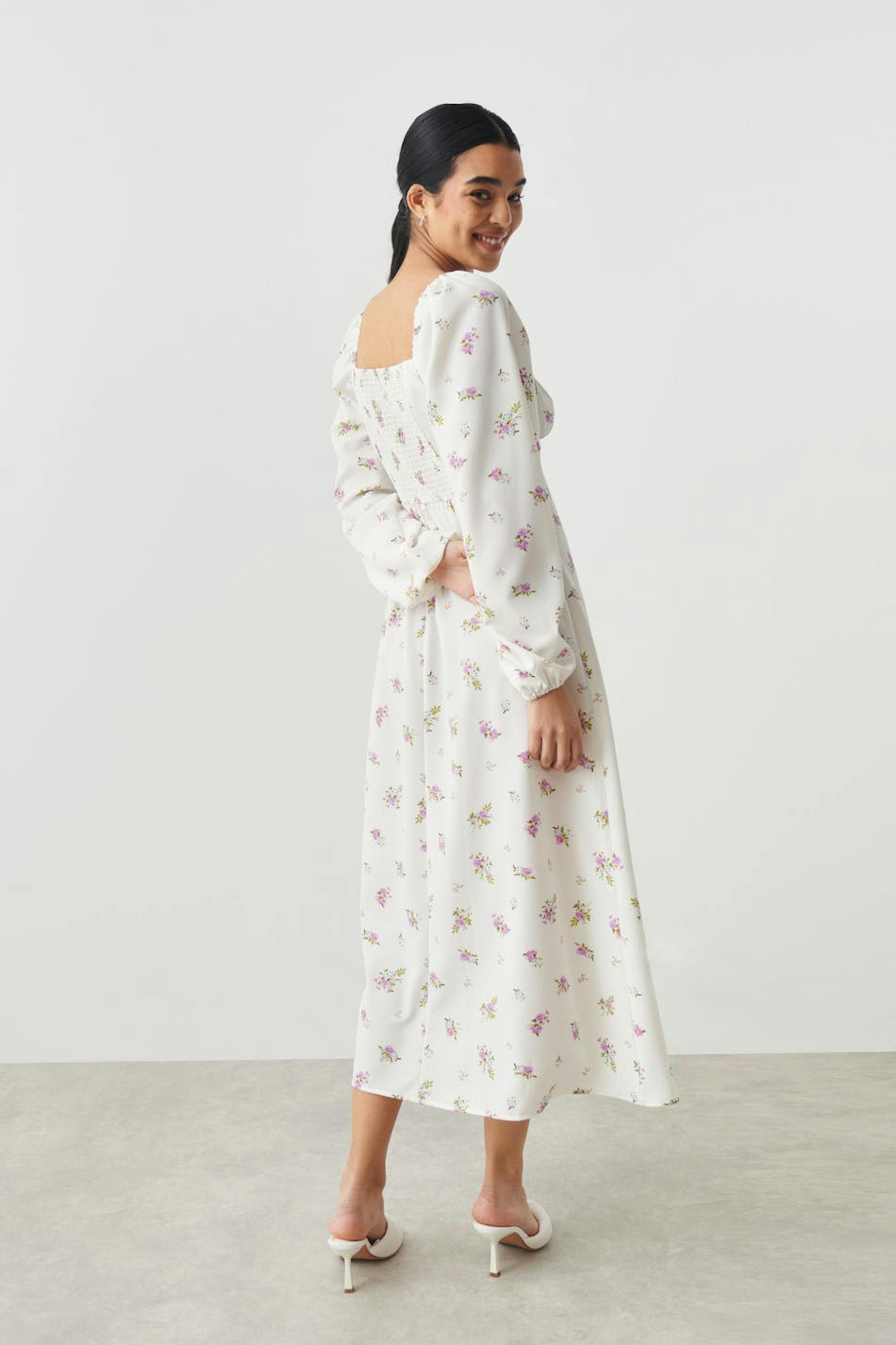 Floral maxi dress with ruched bust. The dress is white, pink and long-sleeved. It has slit at the front, fitted waist, puff sleeves, buttons at the front, smocking in the back, seam detail below the bust and gathering on the sleeve ends and around the shoulders.