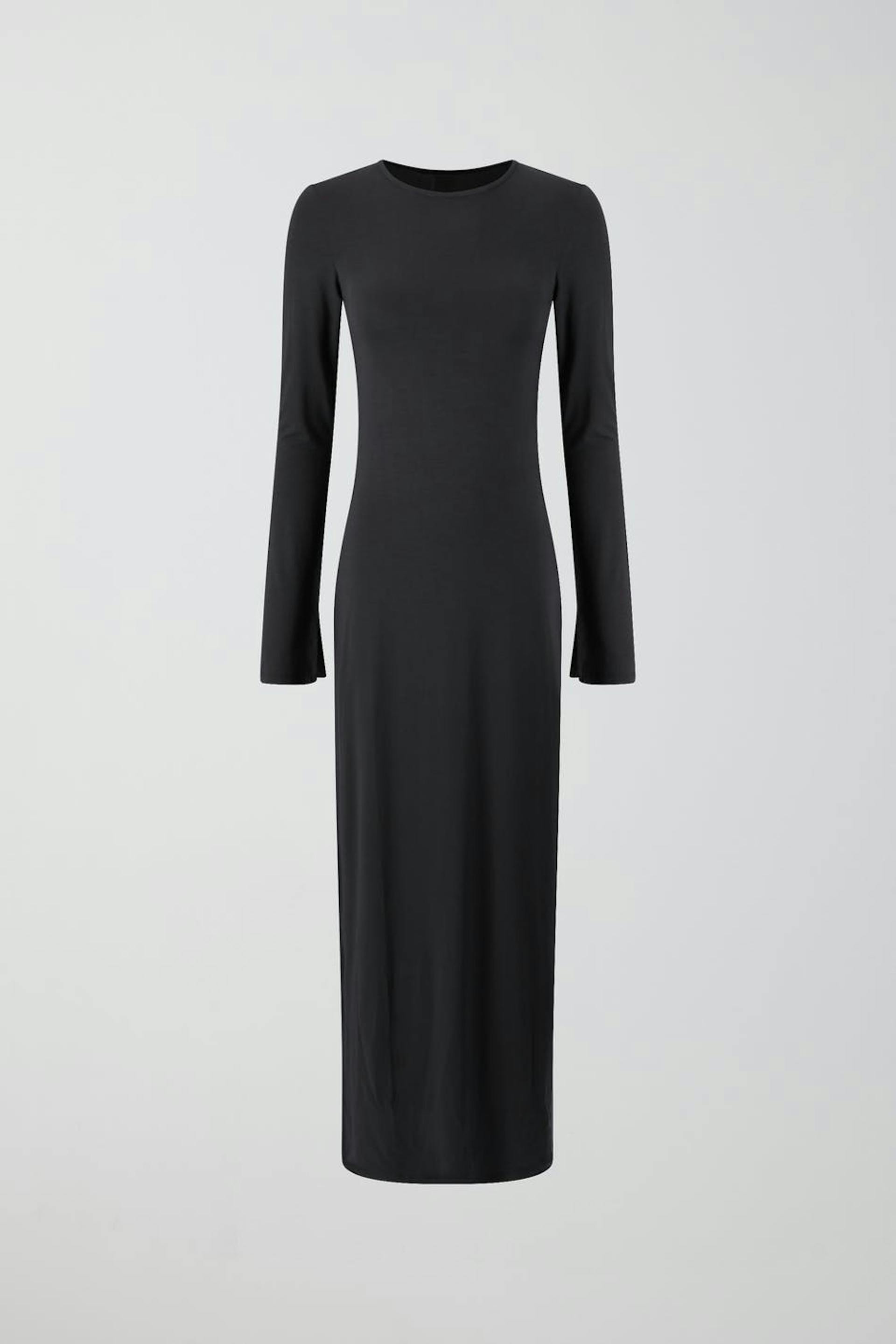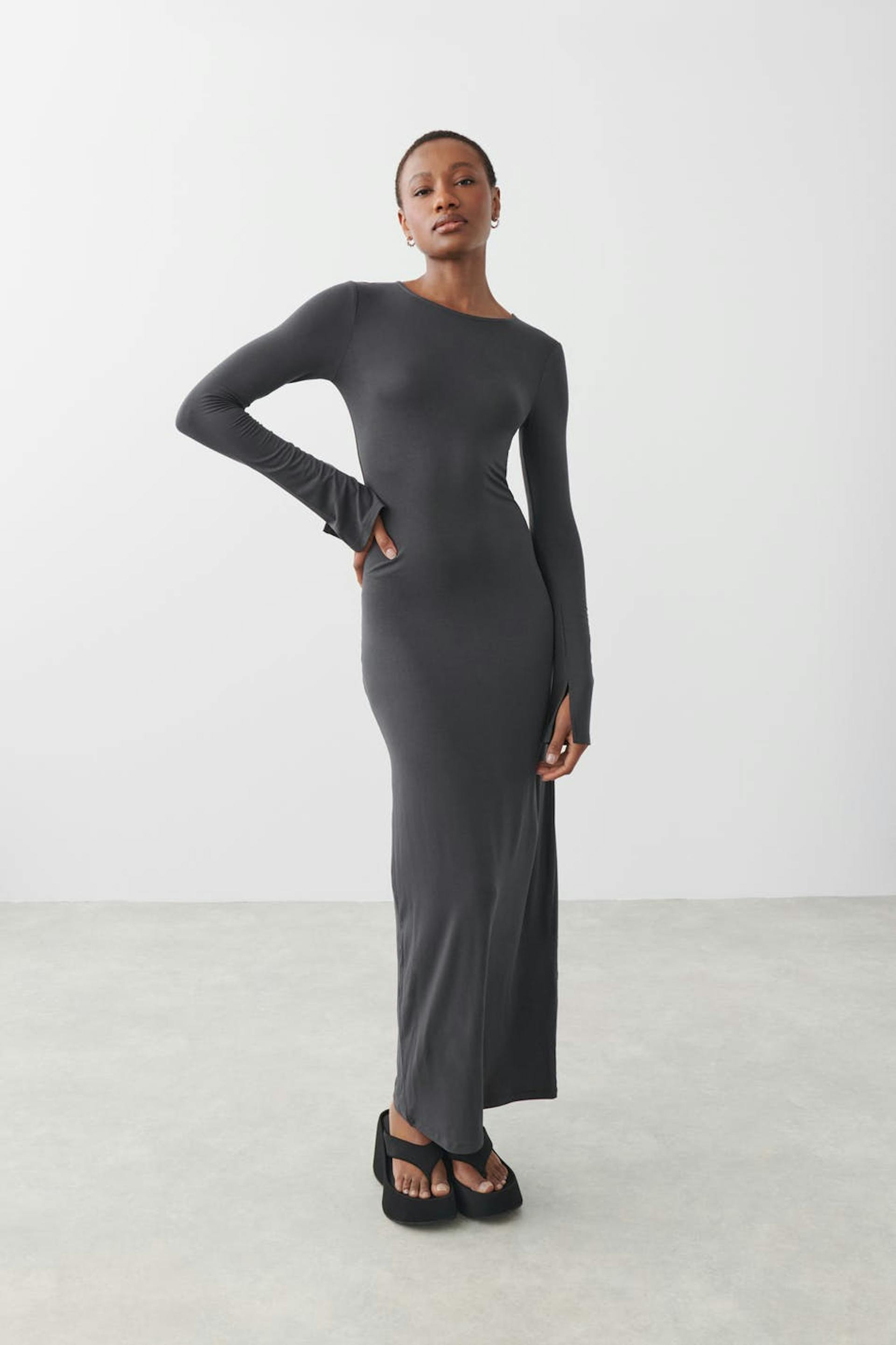 Soft touch – second skin comfort. Long-sleeved maxi dress in soft viscose with crew neckline. The dress is grey and has slit on the sleeve ends.