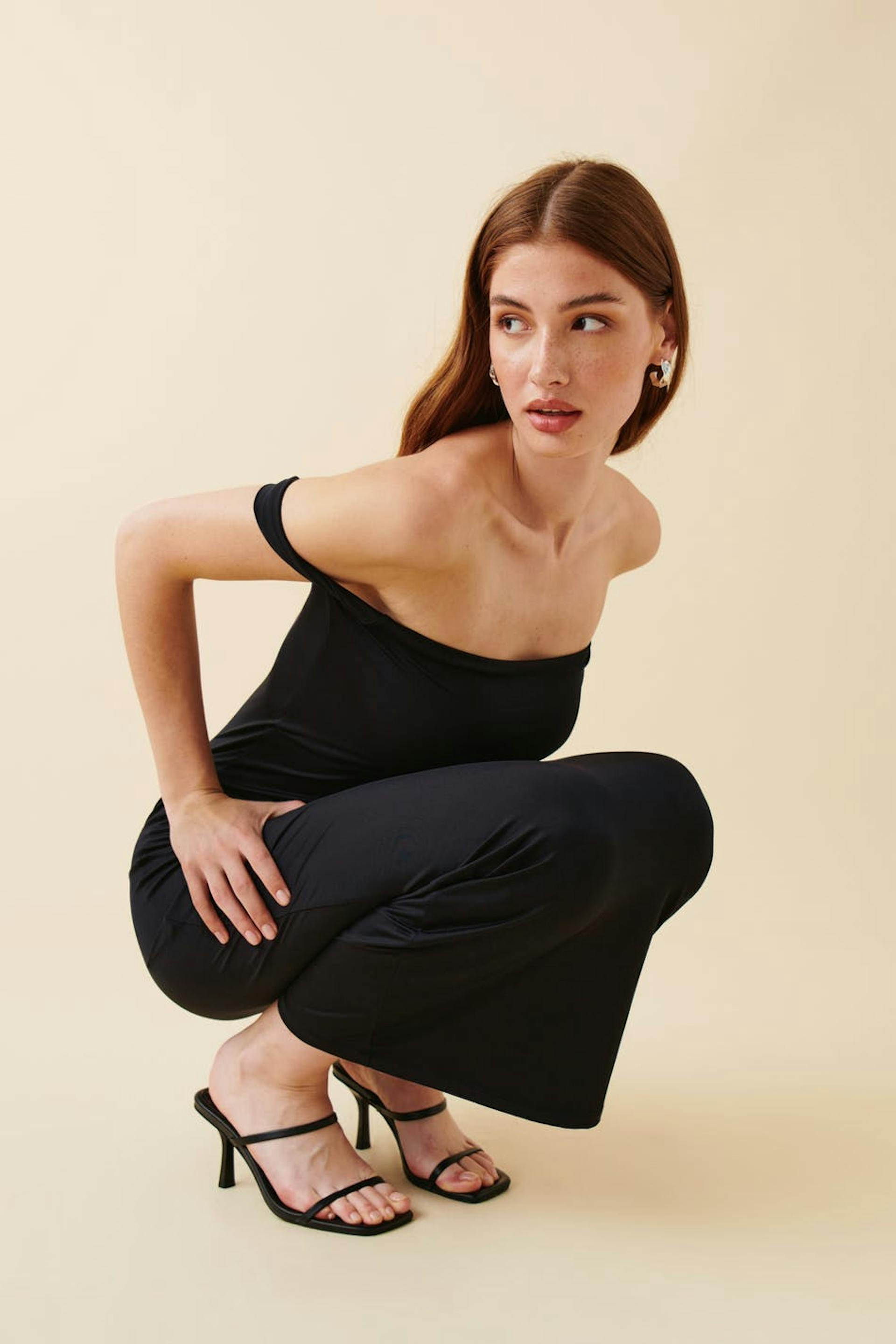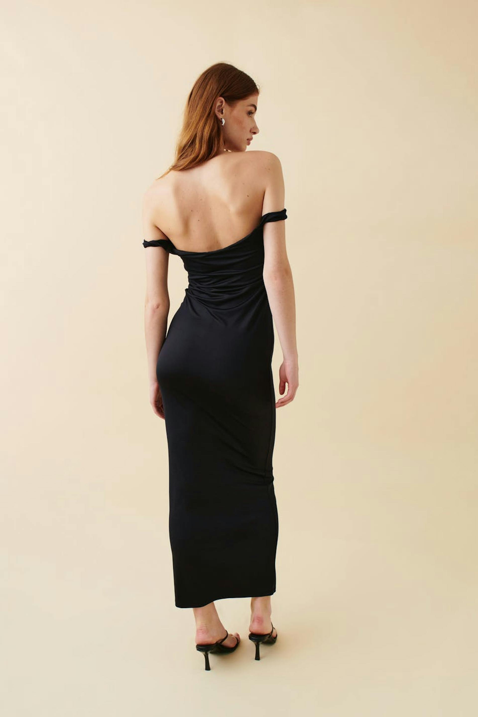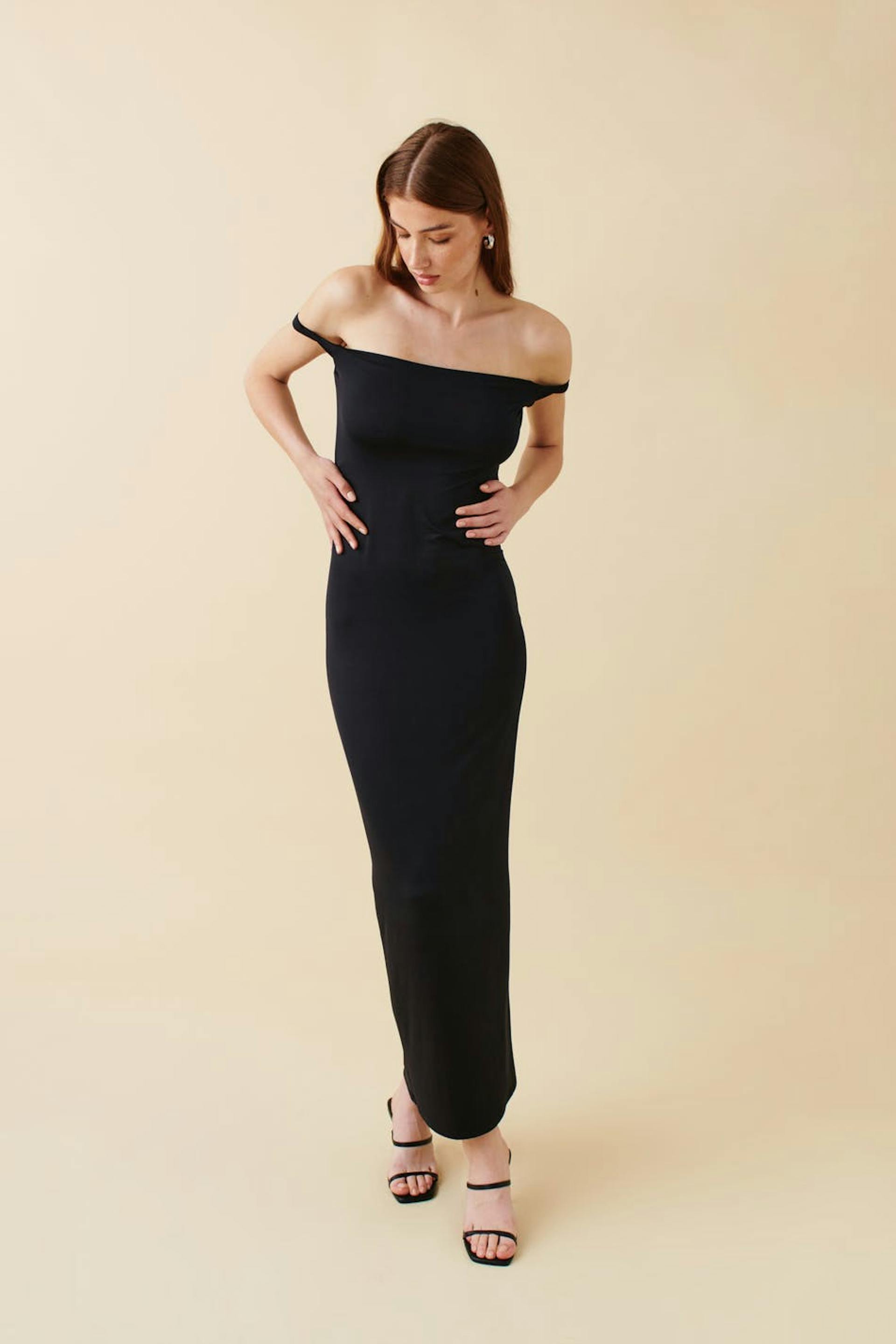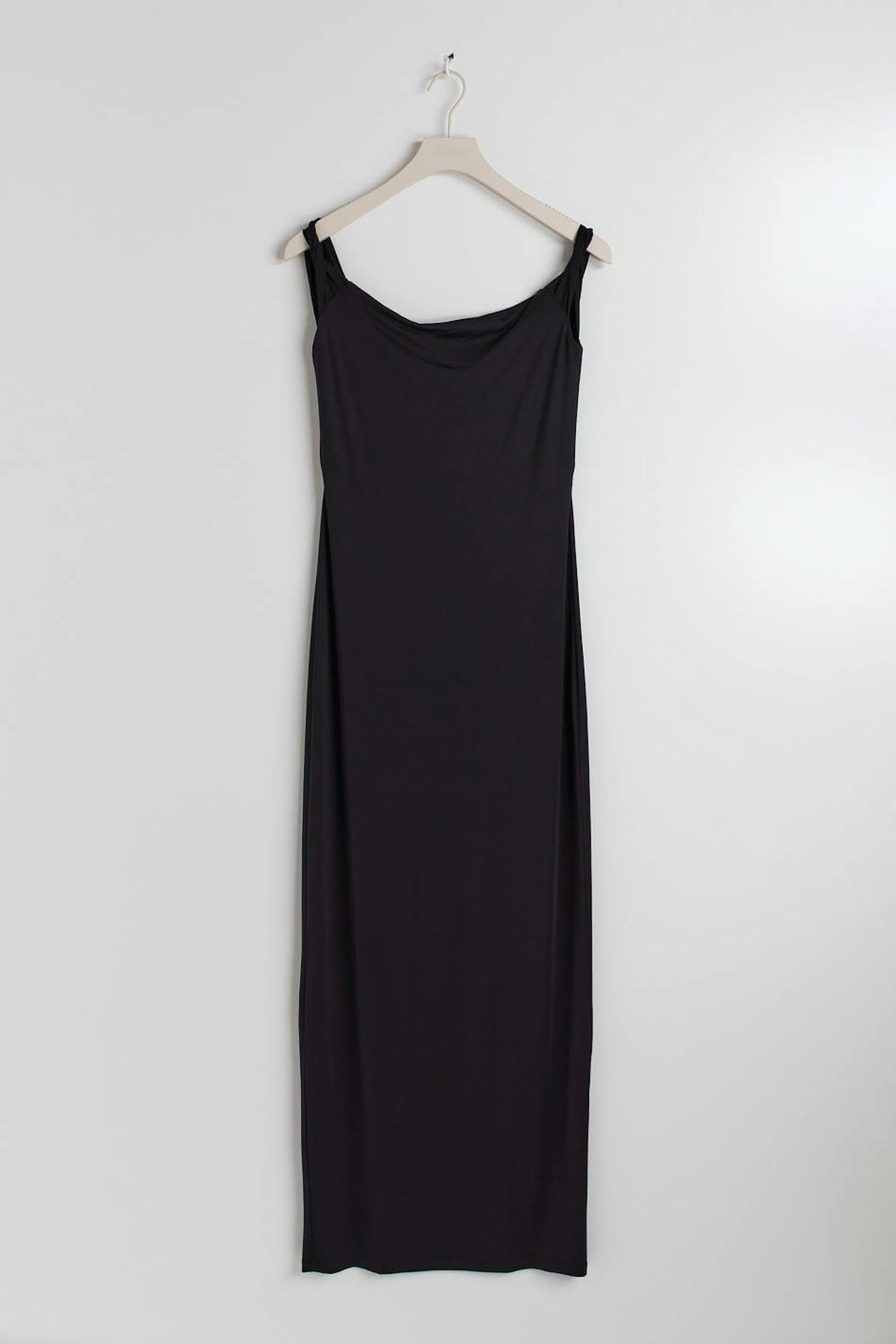 Long off the shoulder dress with twisted shoulder straps. The dress is black and has stretchy quality.