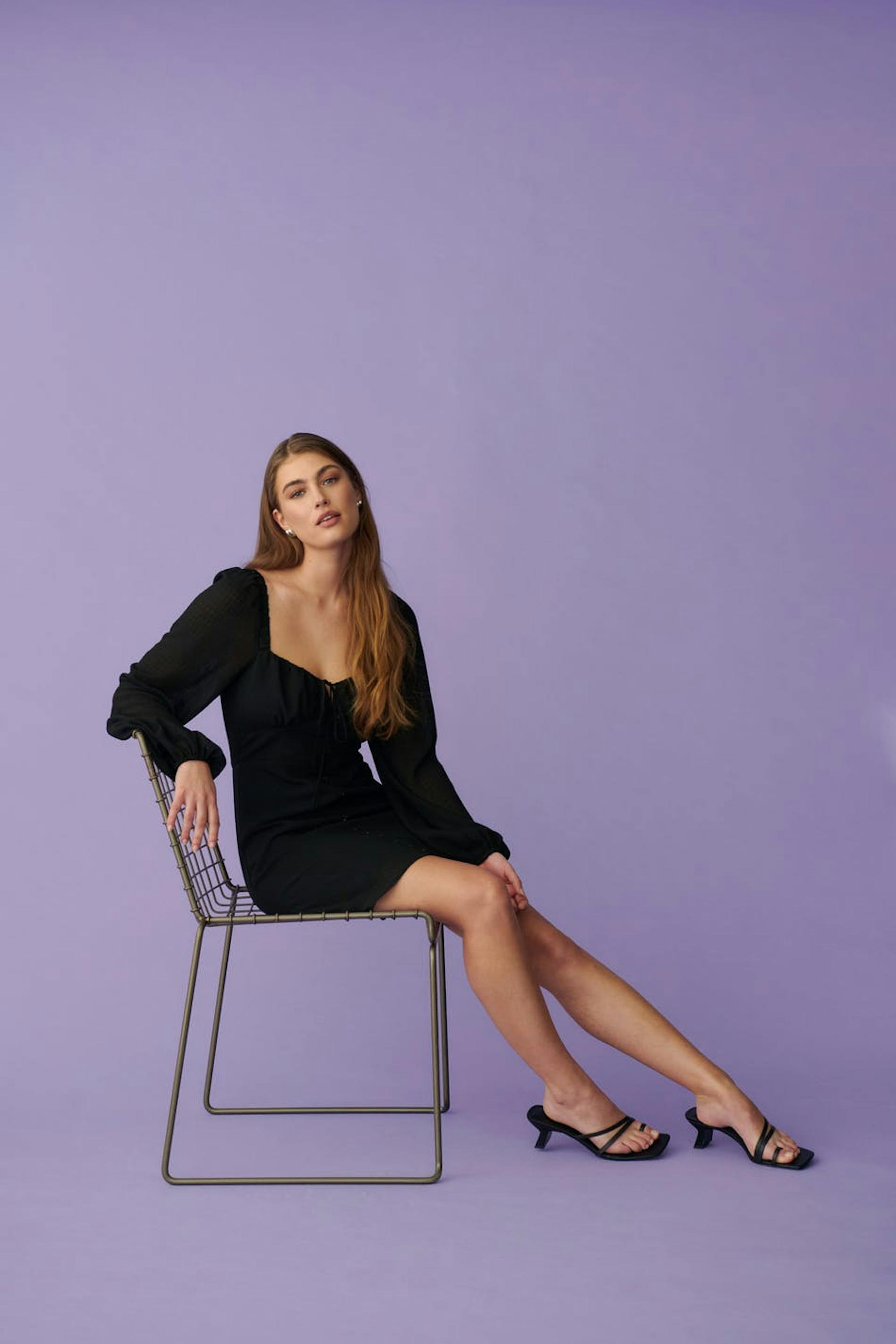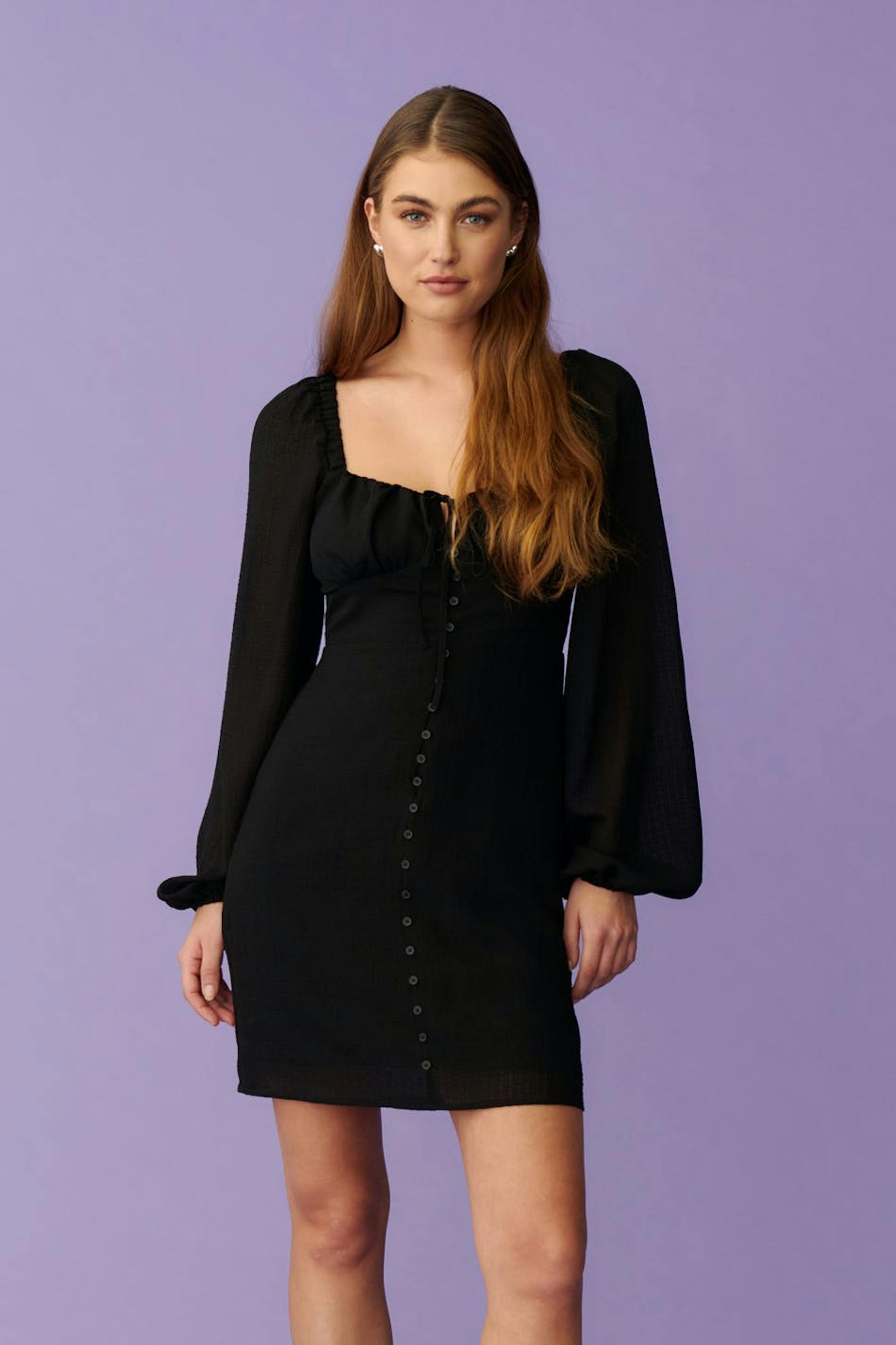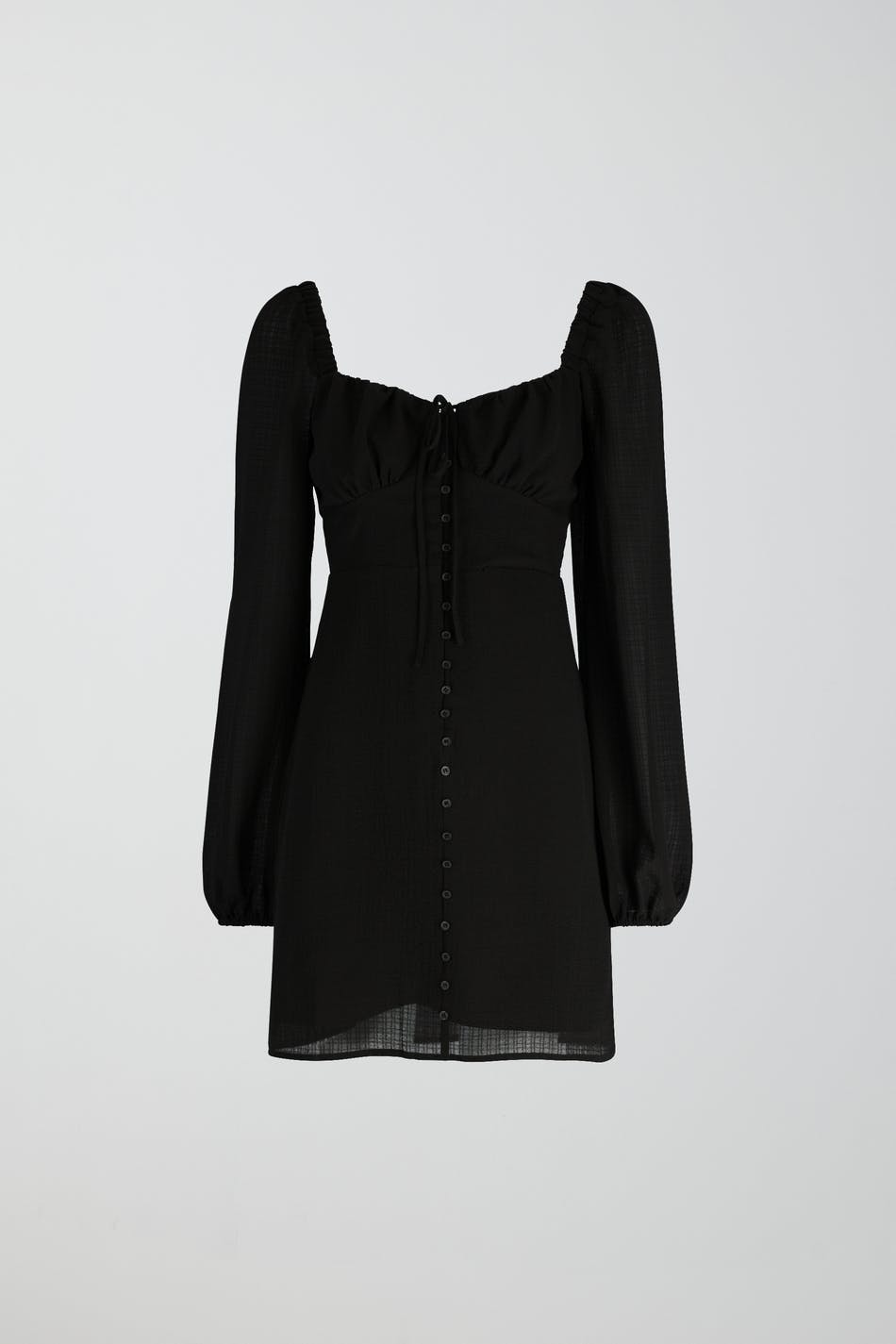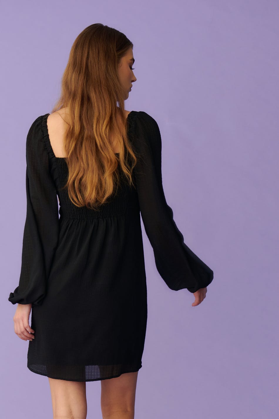 Long-sleeved dress in seersucker with buttons along the front. The dress is perfect for the party, black and short. It has a structured material, ruched bust, knot detail at the front, puff sleeves and smocking in the back.