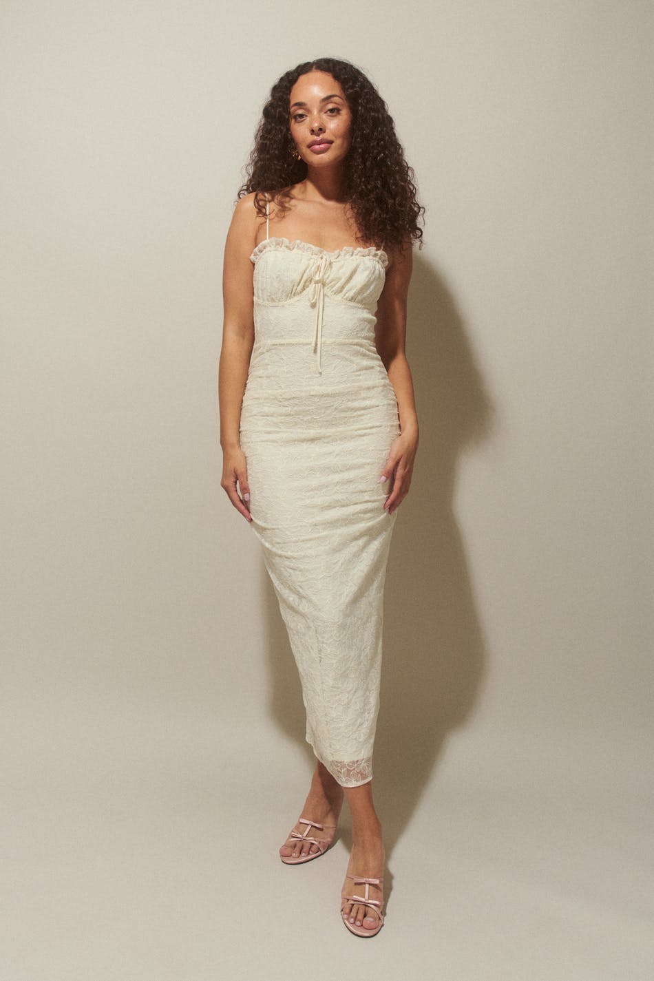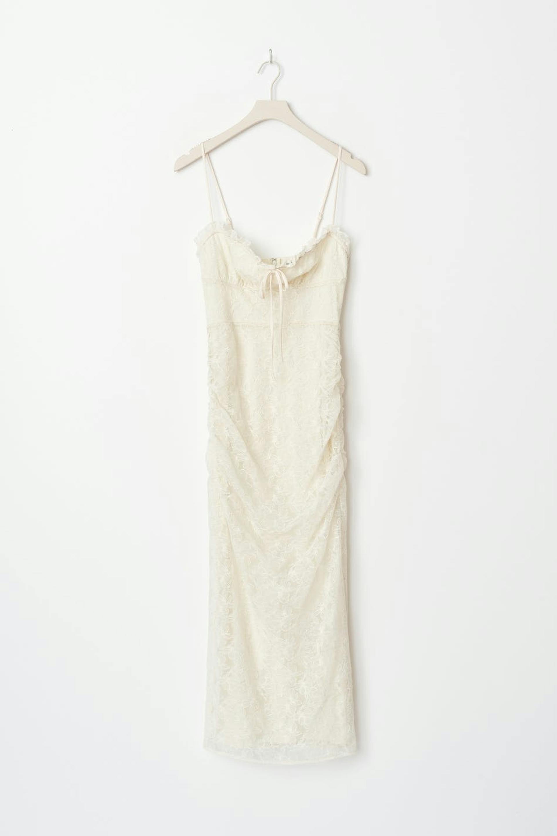 Embroidered dress with ruched bust. The dress is white, sleeveless and lined. It has stretchy quality, adjustable shoulder straps, tie detail at the front, decorative seam below the bust and slit at the back.