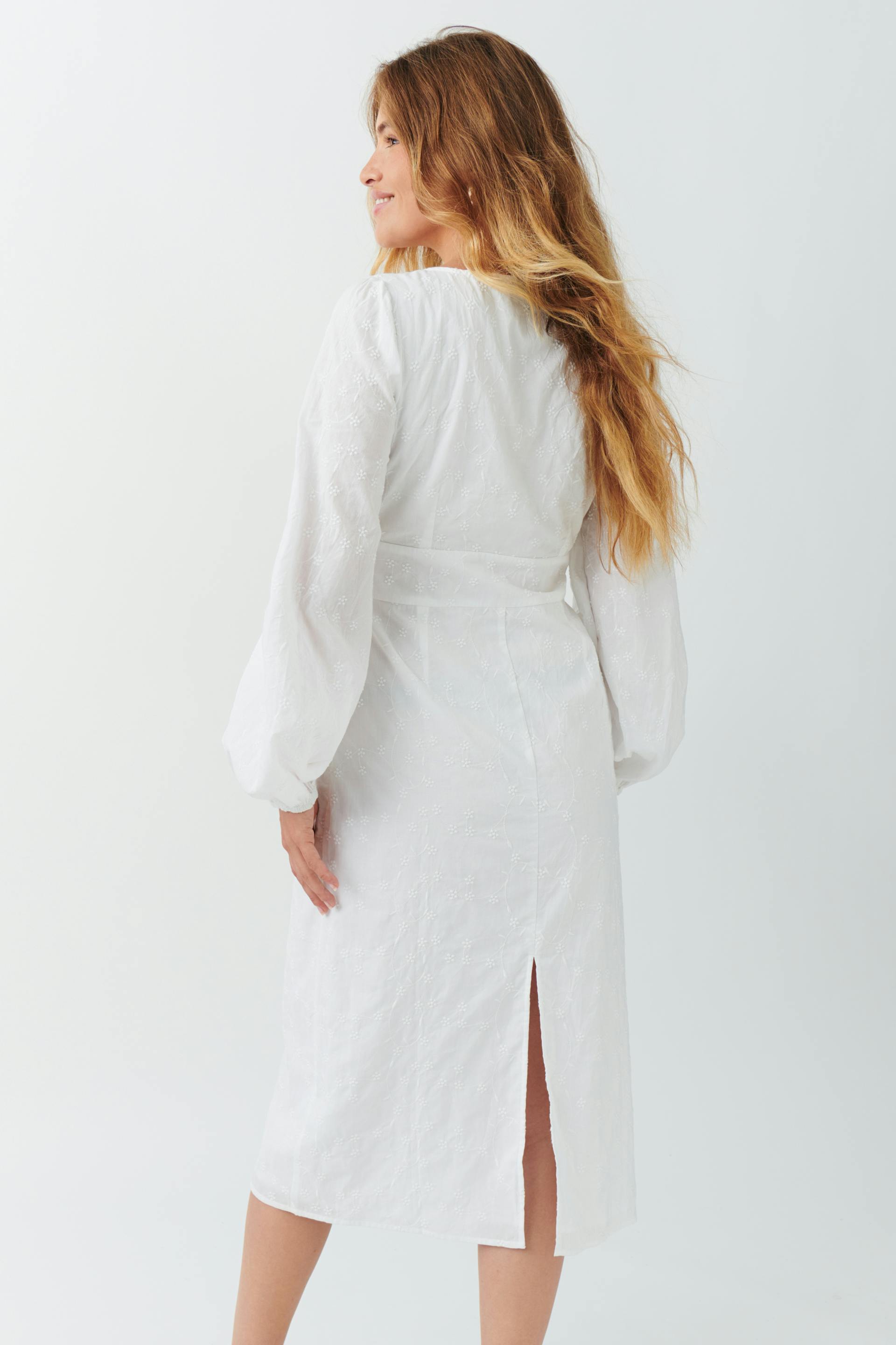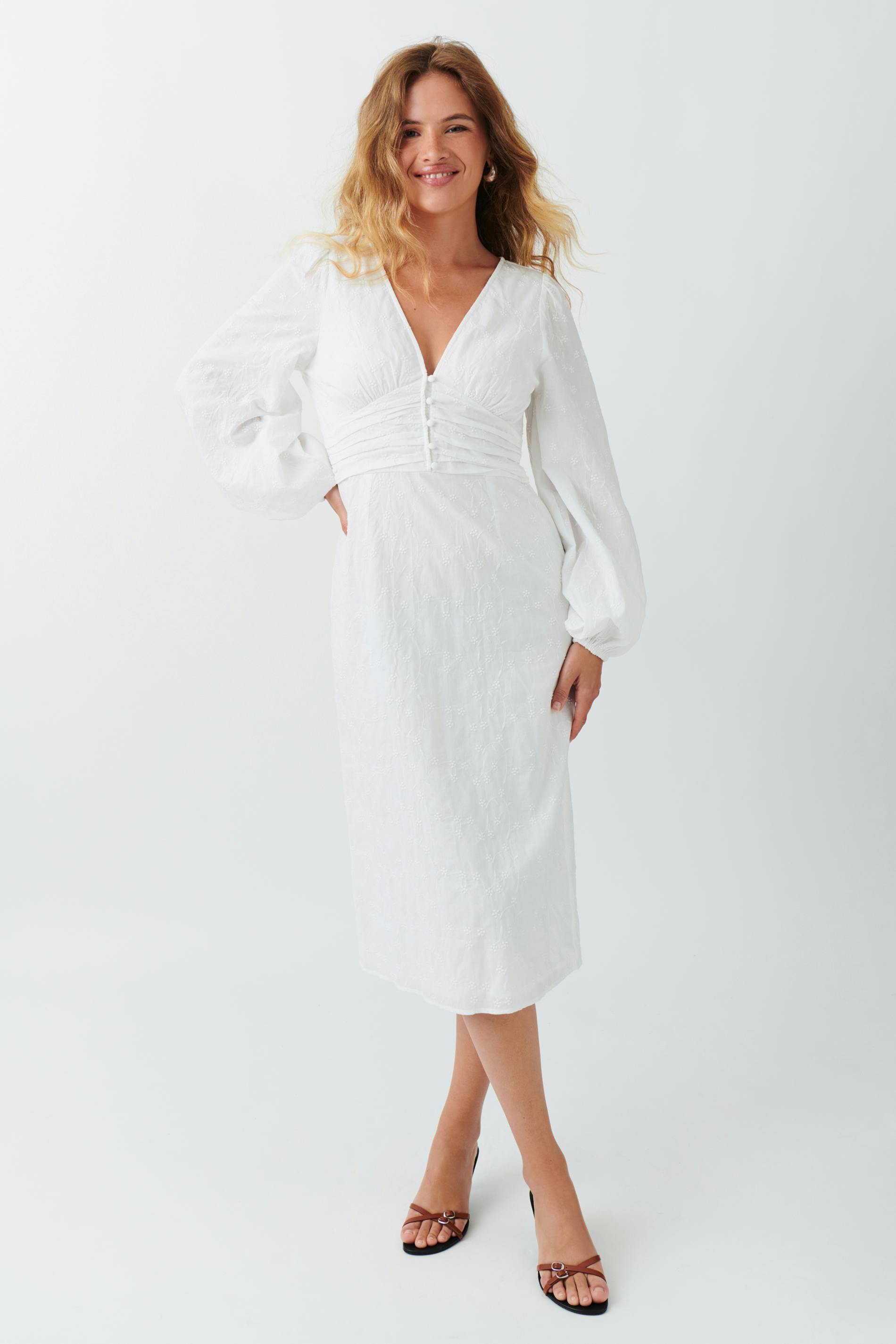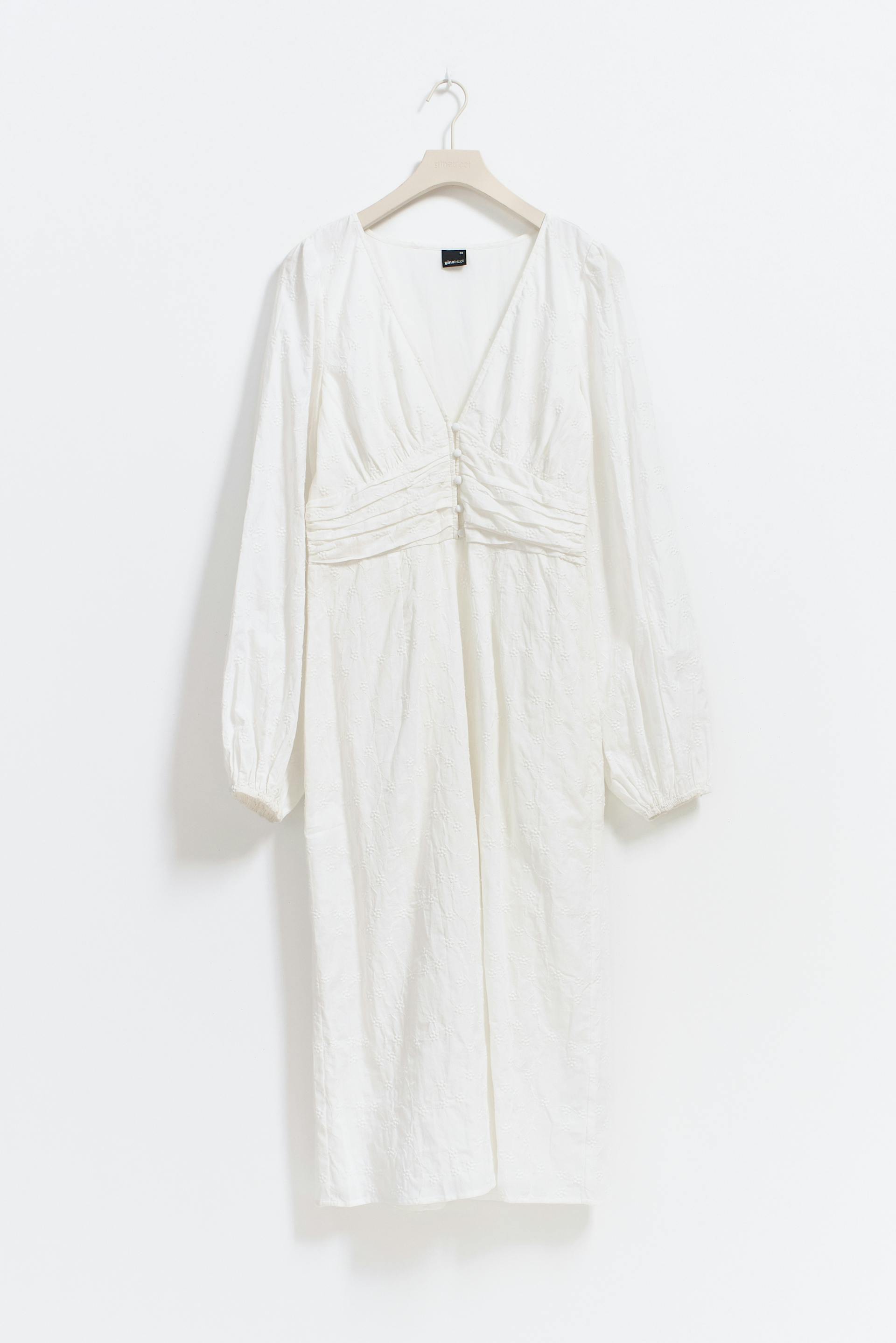 Long-sleeved dress with buttons at the front. The dress is white and has long bubble sleeve. It has structured material, v-neck, pleated detail at the waist, gathered seams below the bust, elasticized cuffs and midi length.
