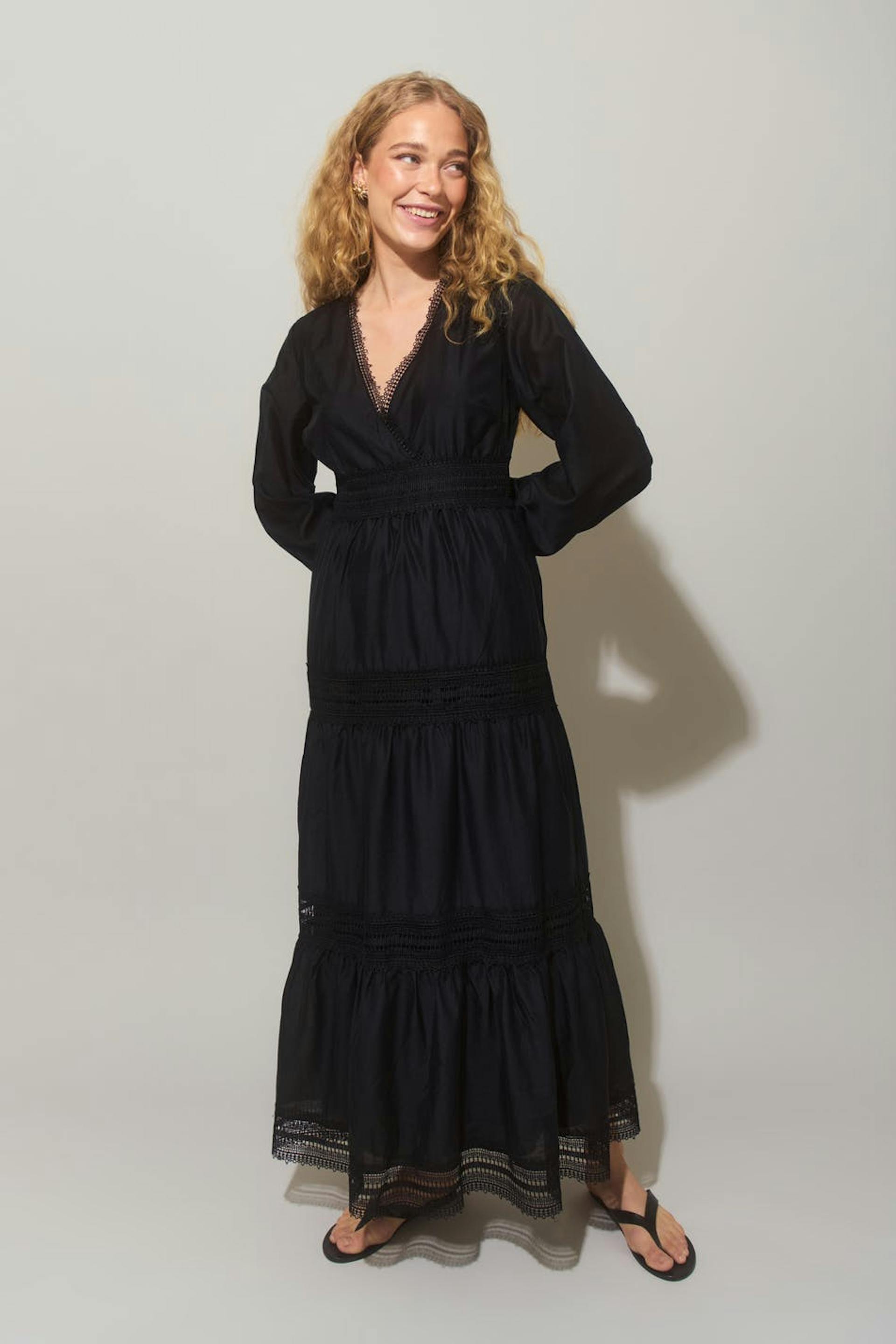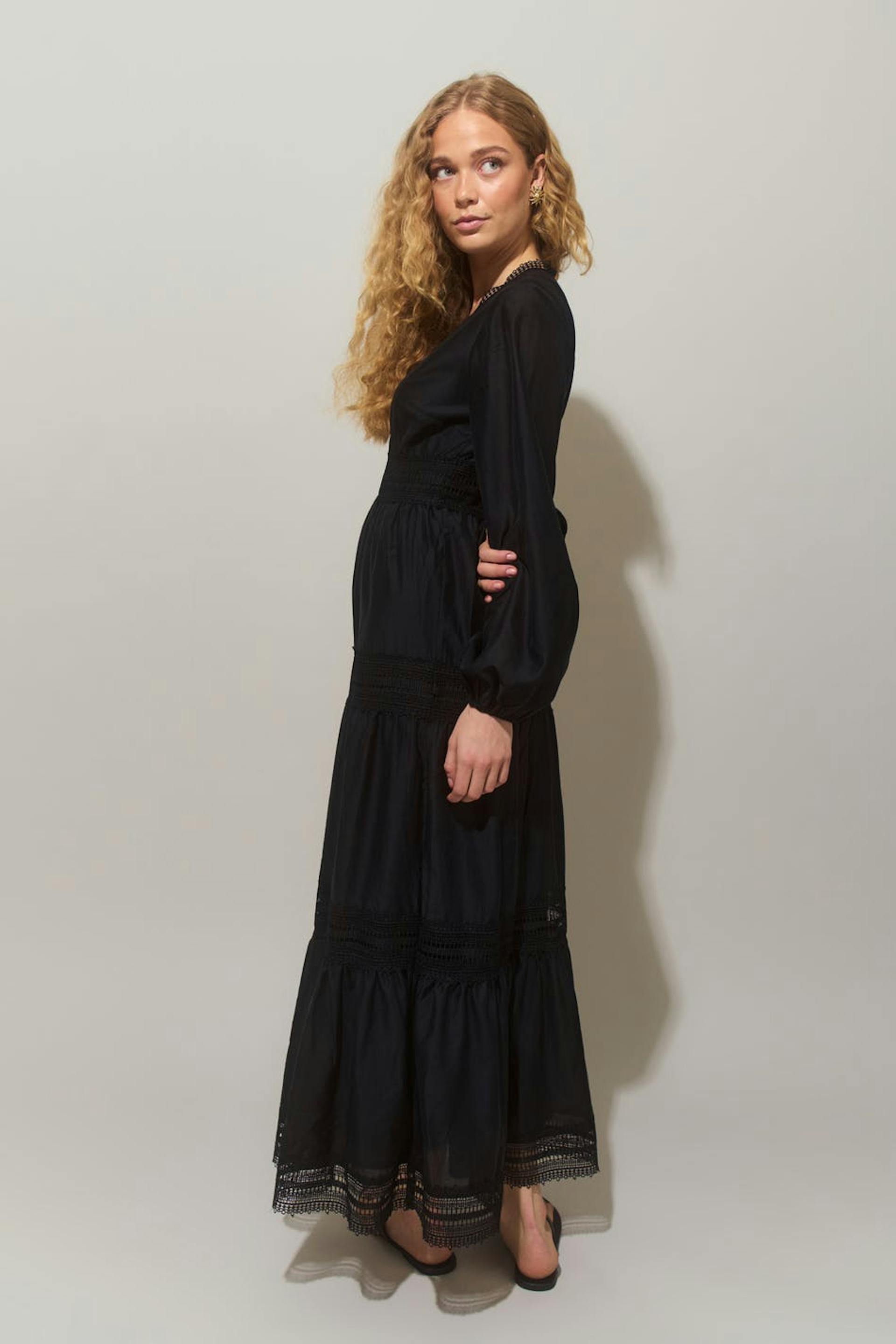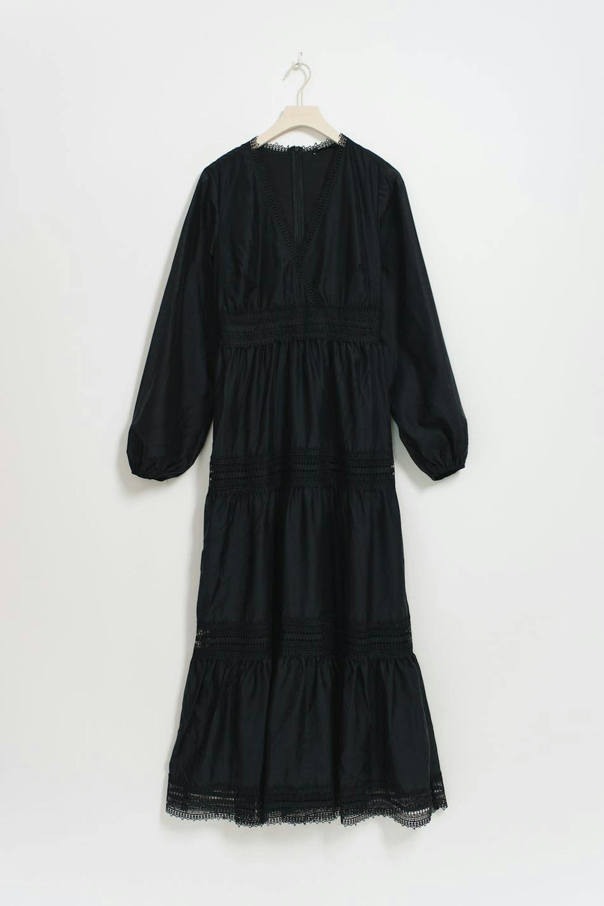 Dress with lace at the bottom. The dress is black and has a v-neck cut in lace. It has a zip at the back and elastic elastic.