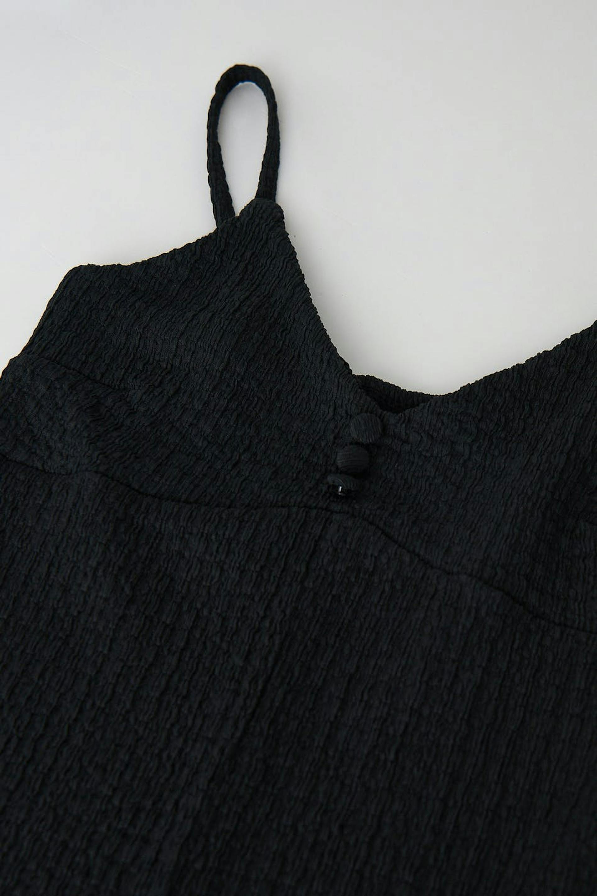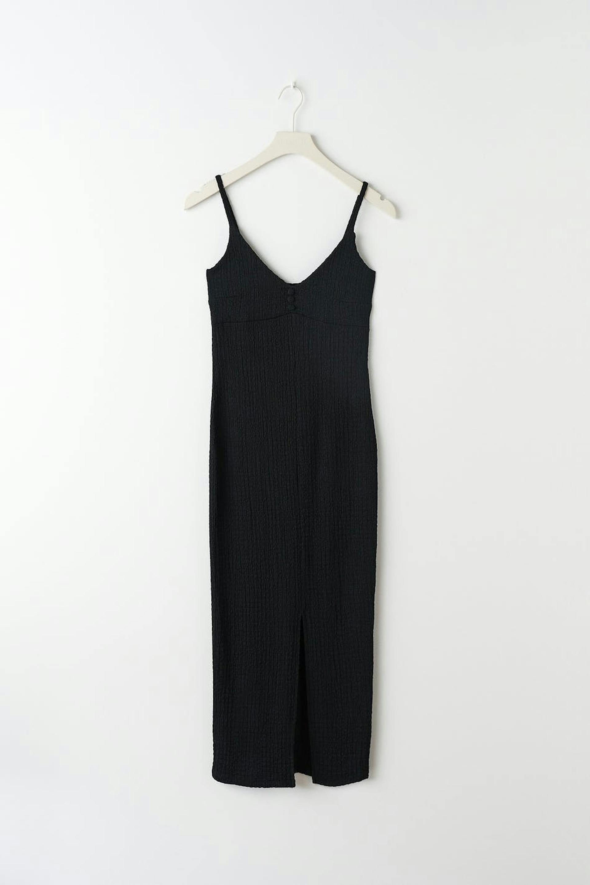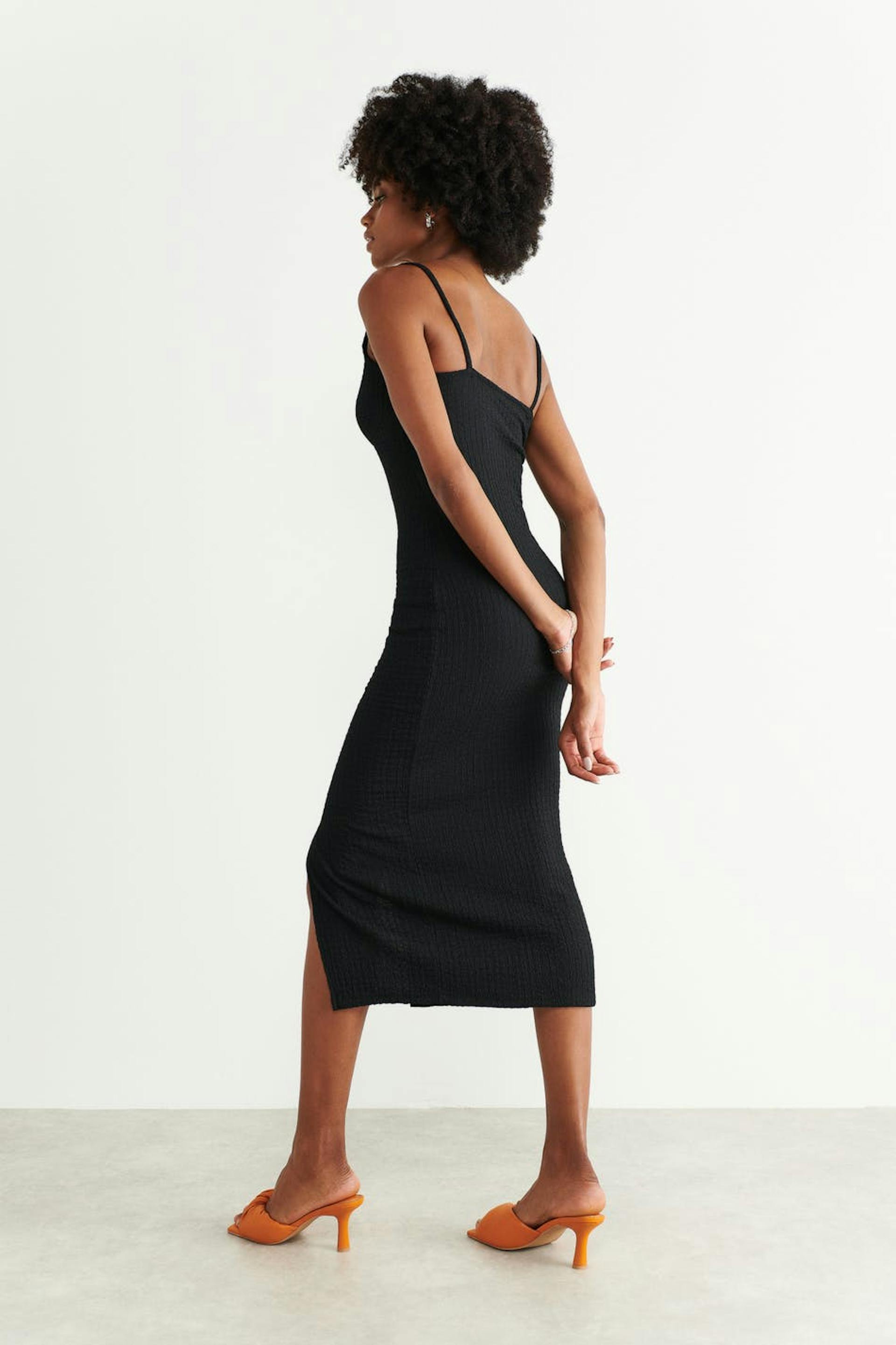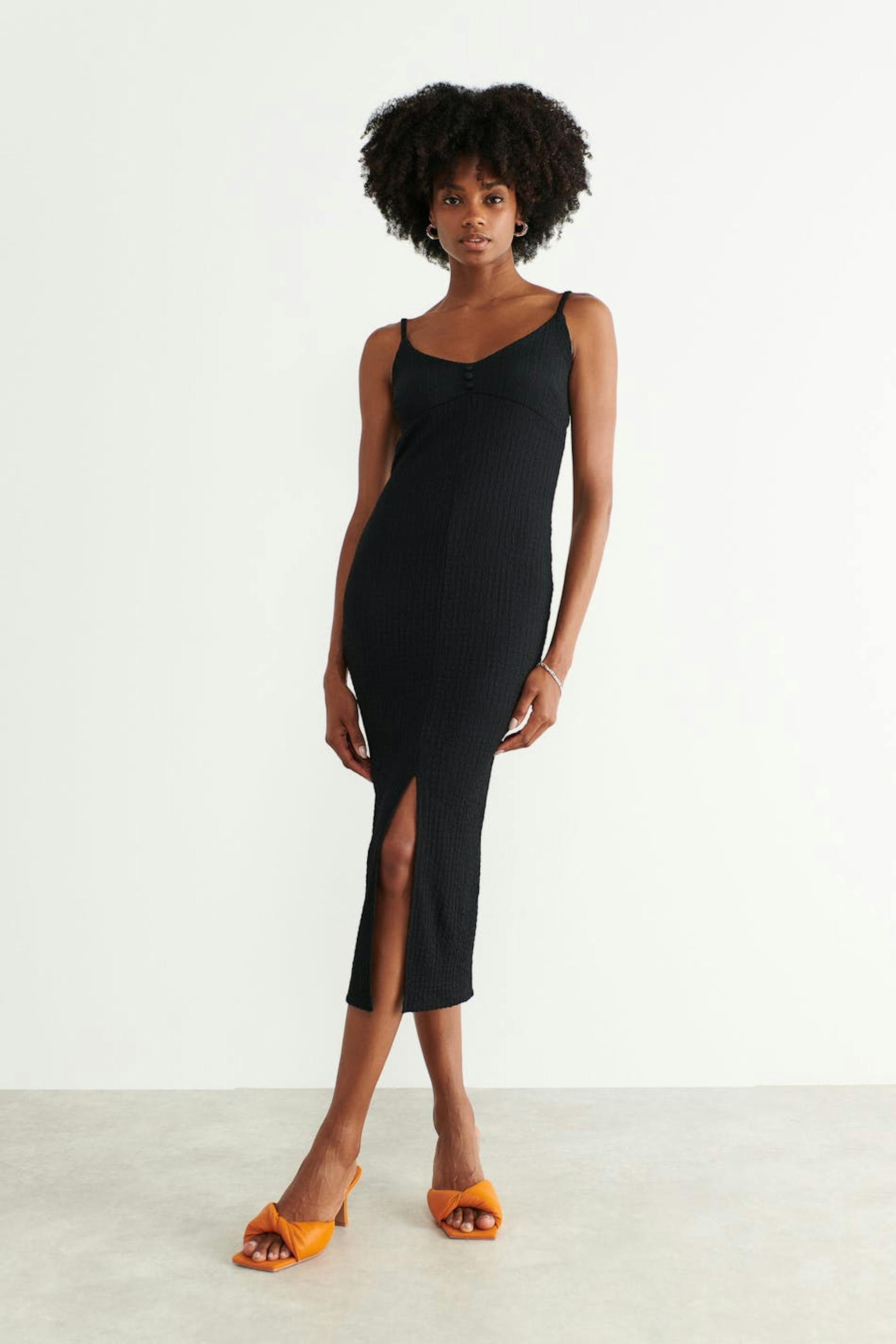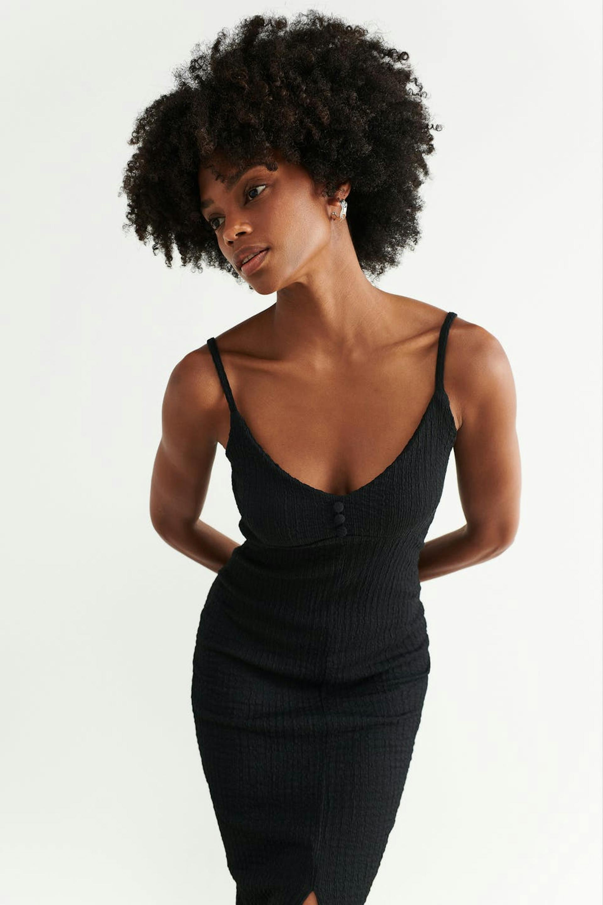 Sleeveless midi dress with slit in front. The dress is black and has v-neck cut with decorative buttons. It has a structured material, fitted fit, thin shoulder straps, seam detail below the bust and a pleat detail at the front.