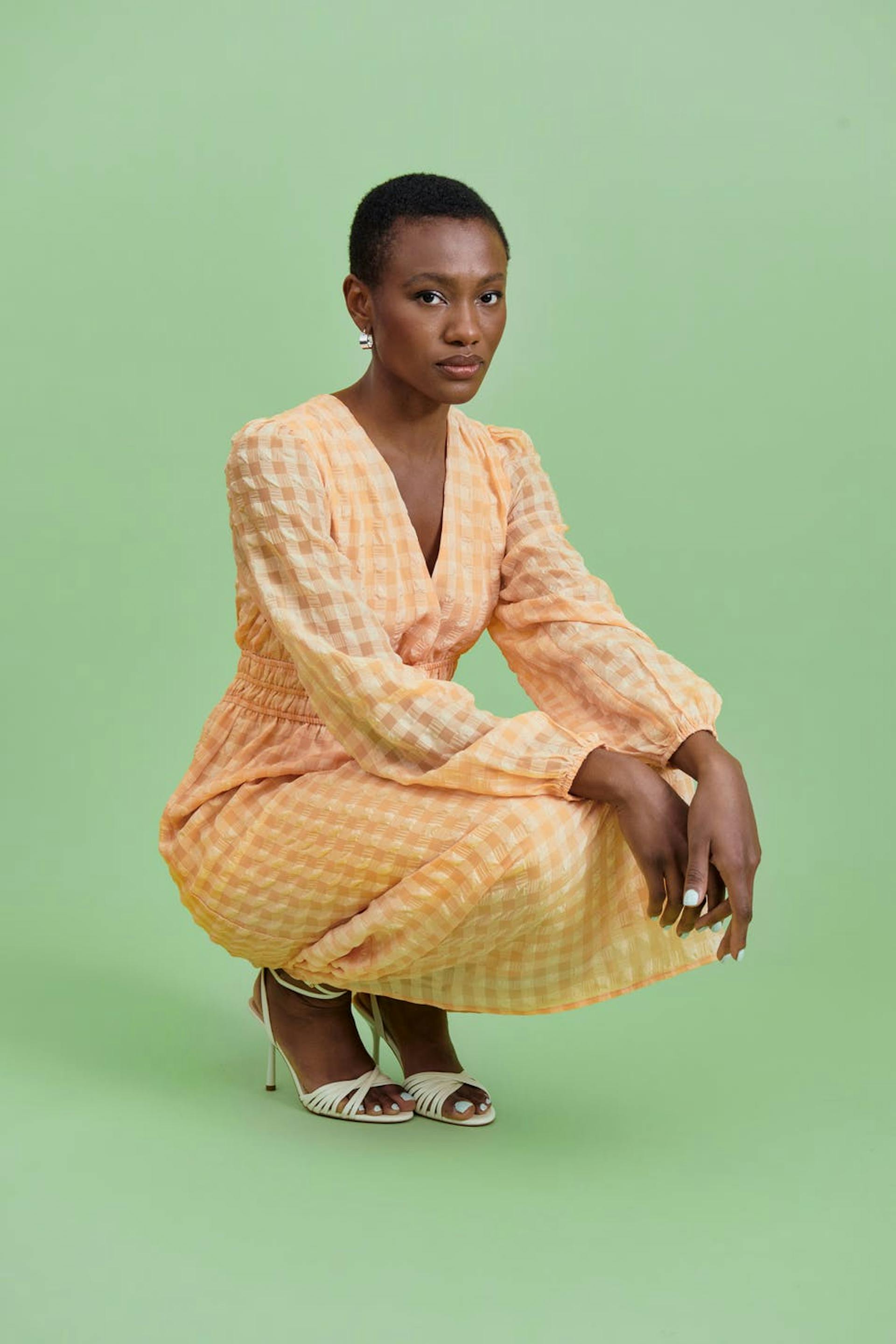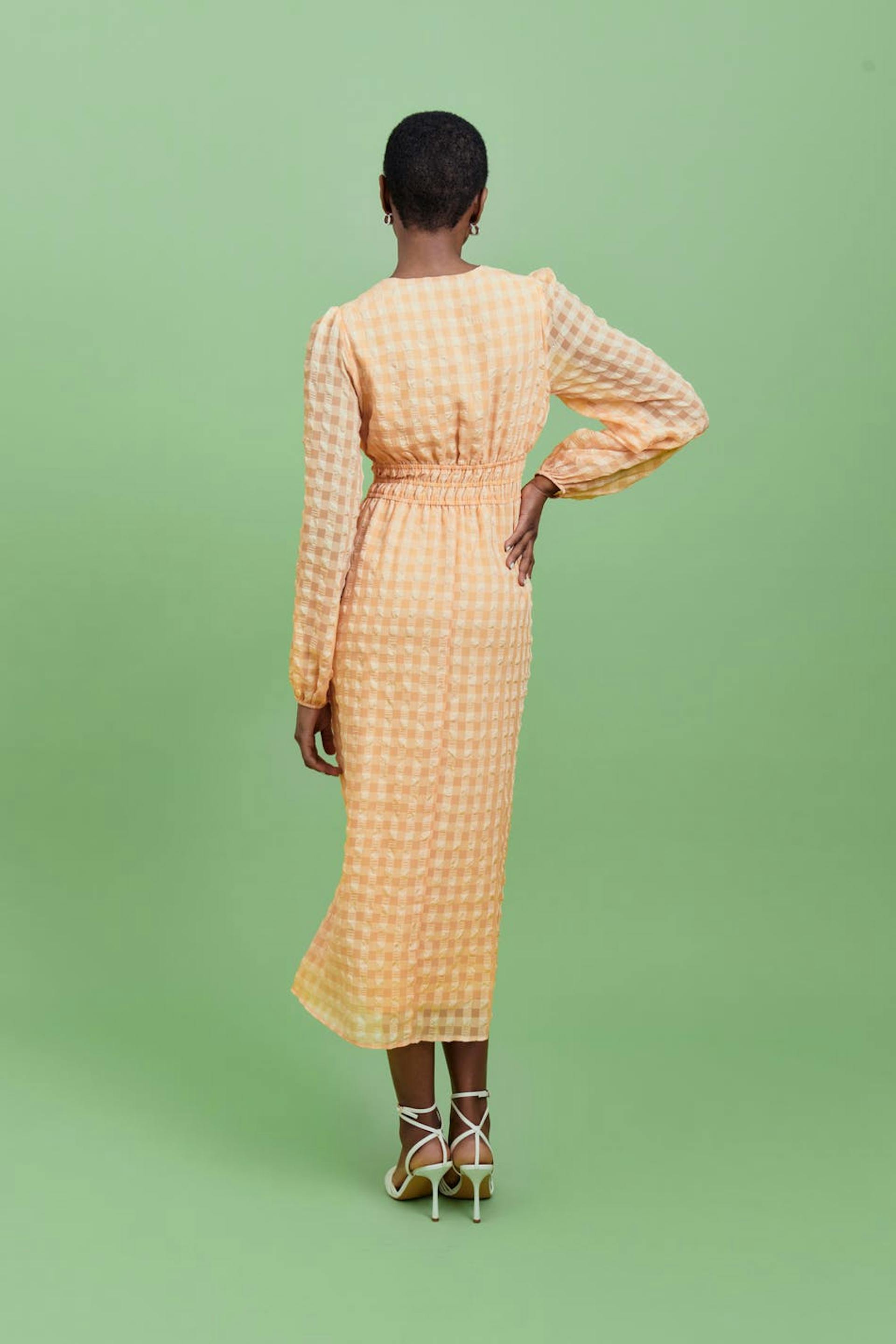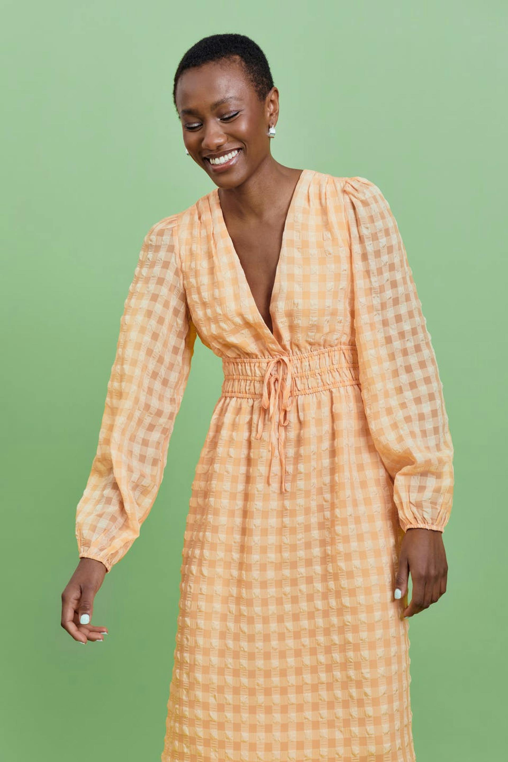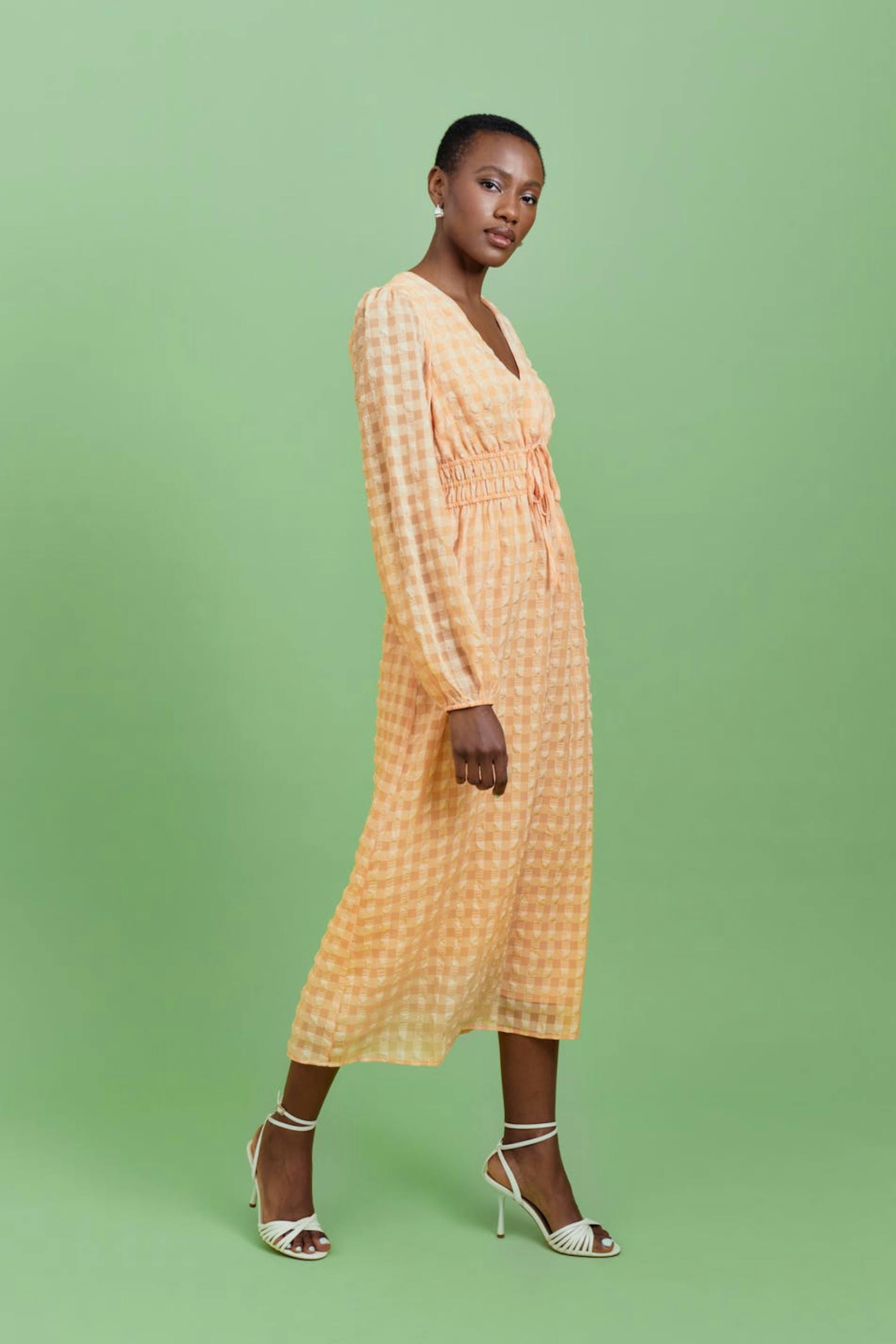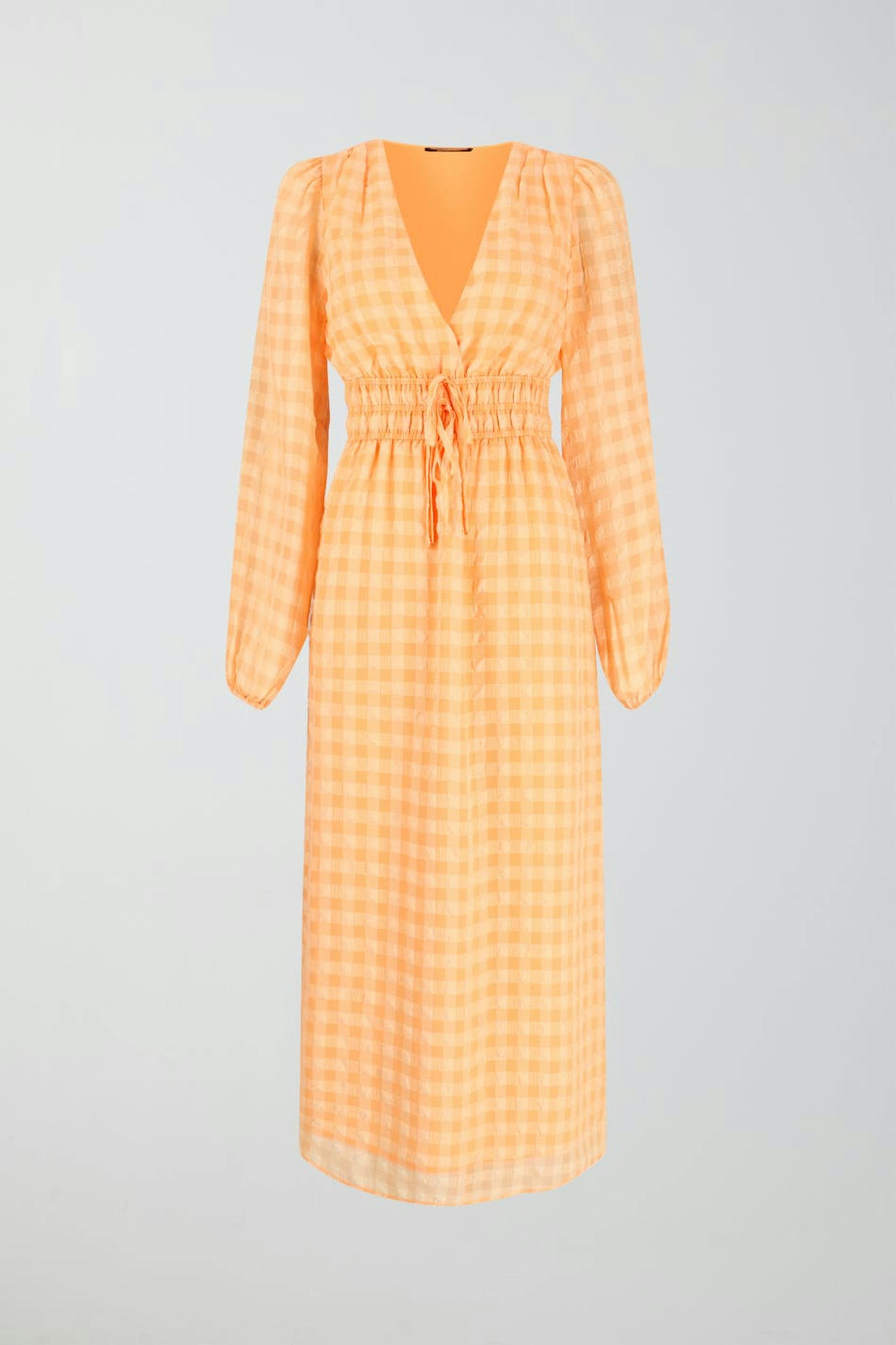 Long-sleeved midi dress with decorative knot details at the front. The dress is orange and has a structured material. It has v-neck and elastic at the waist and on the sleeve ends.