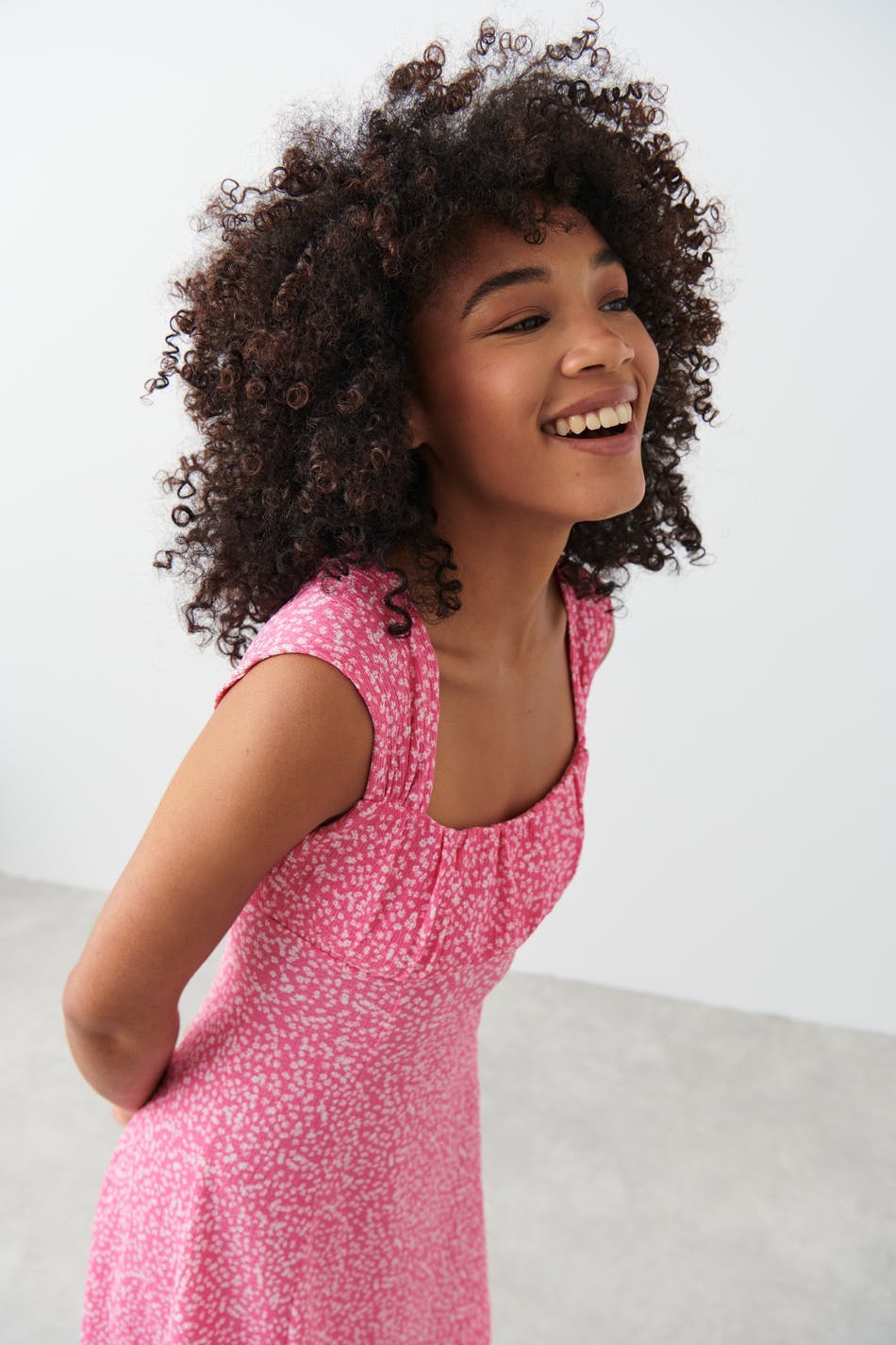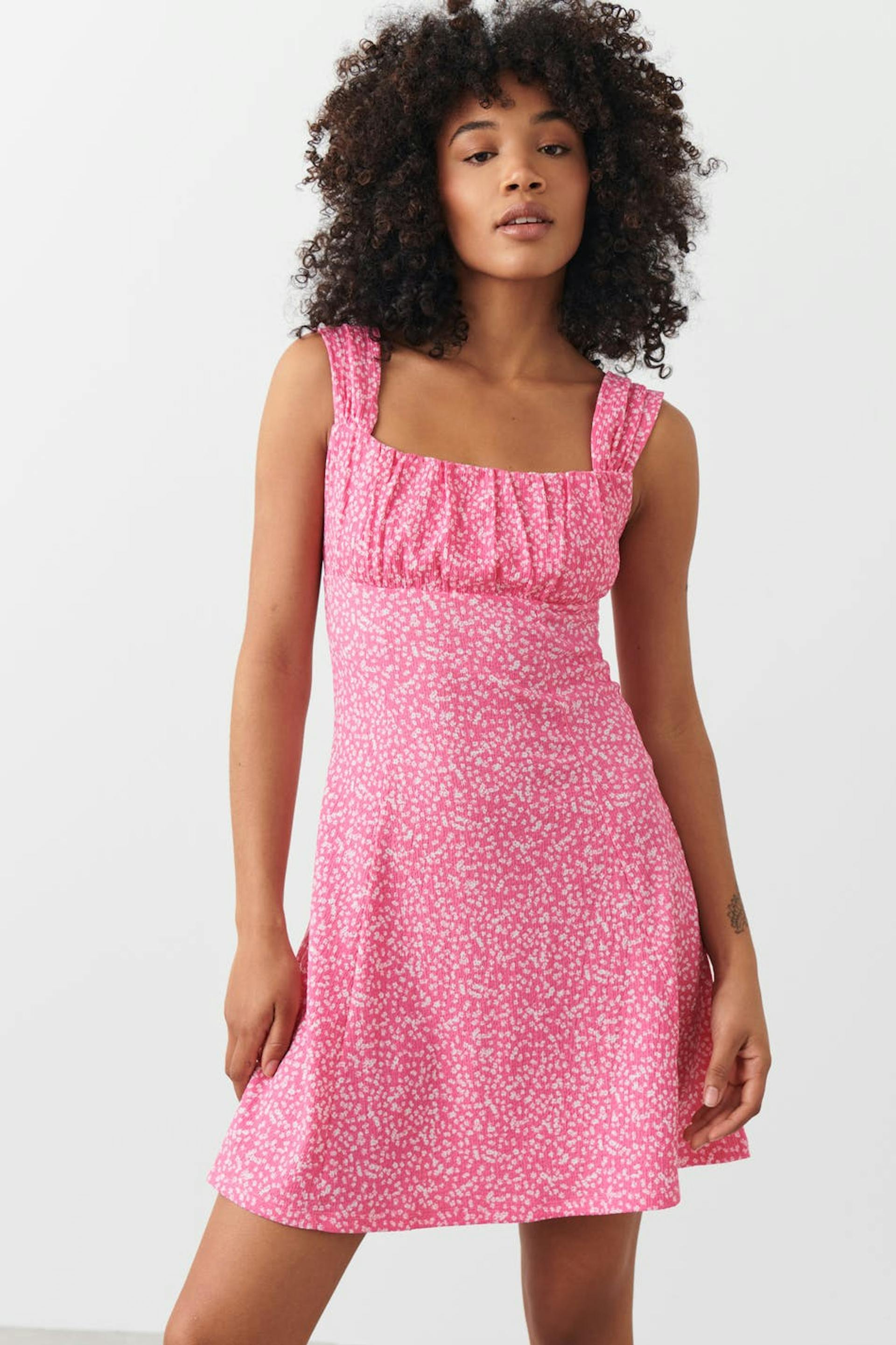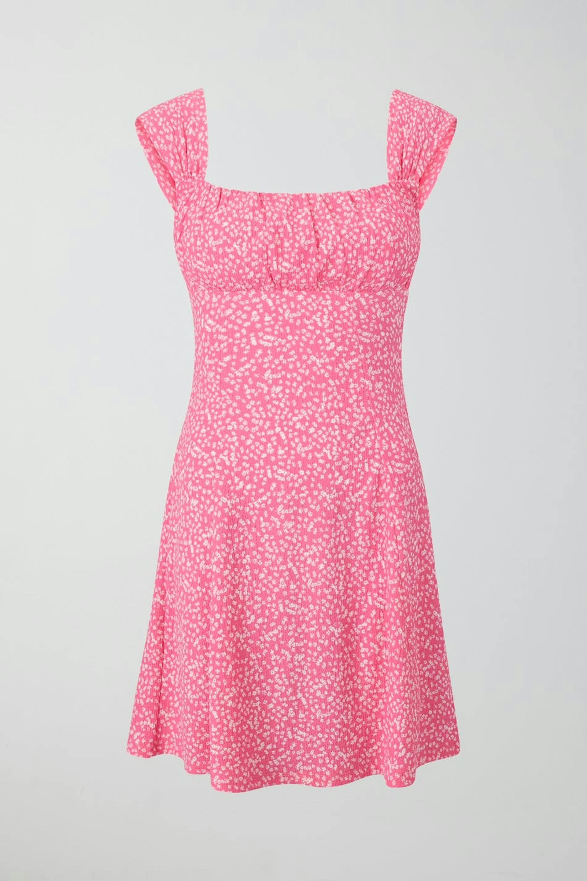 Floral dress in jersey with normal fit. The dress is pink, sleeveless and short. It has square neckline, wide shoulder straps and lined bust with ruching.
