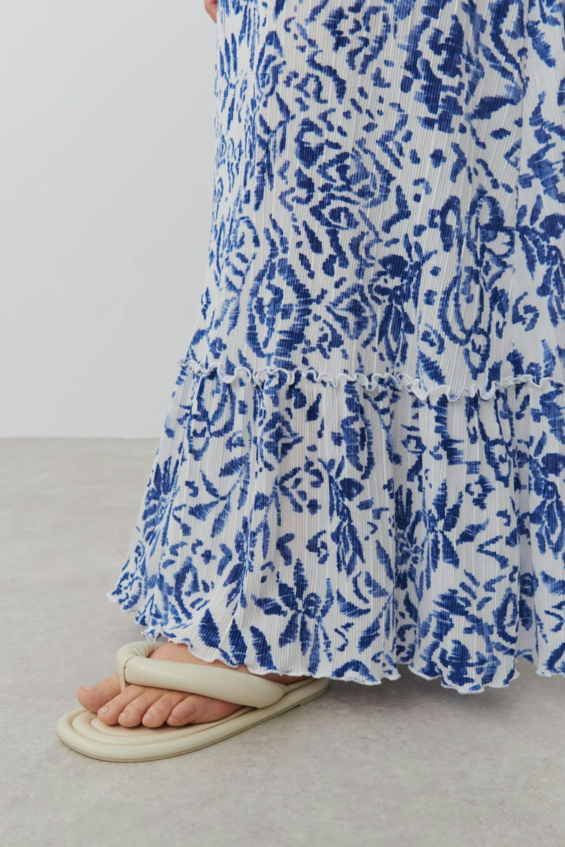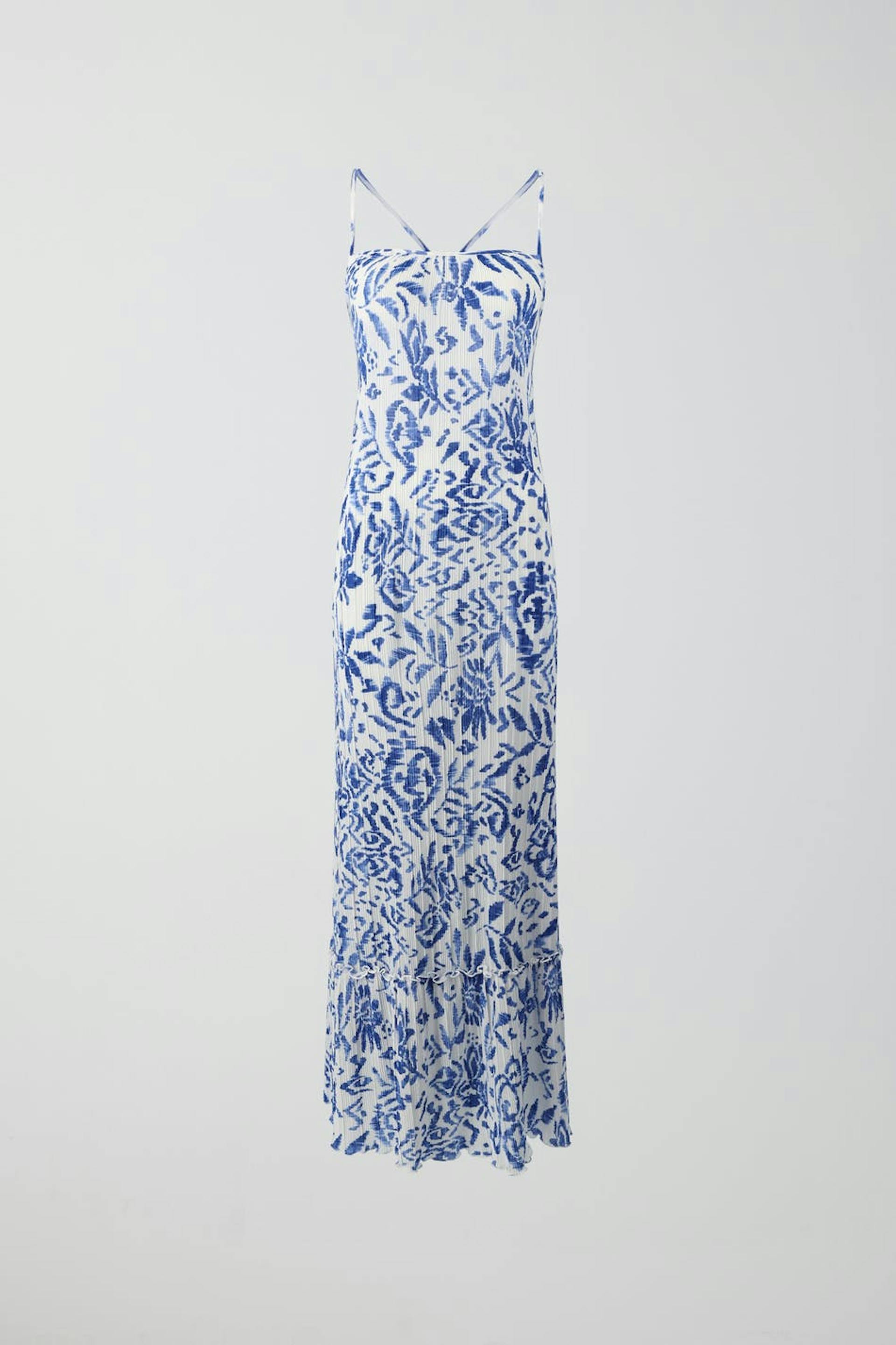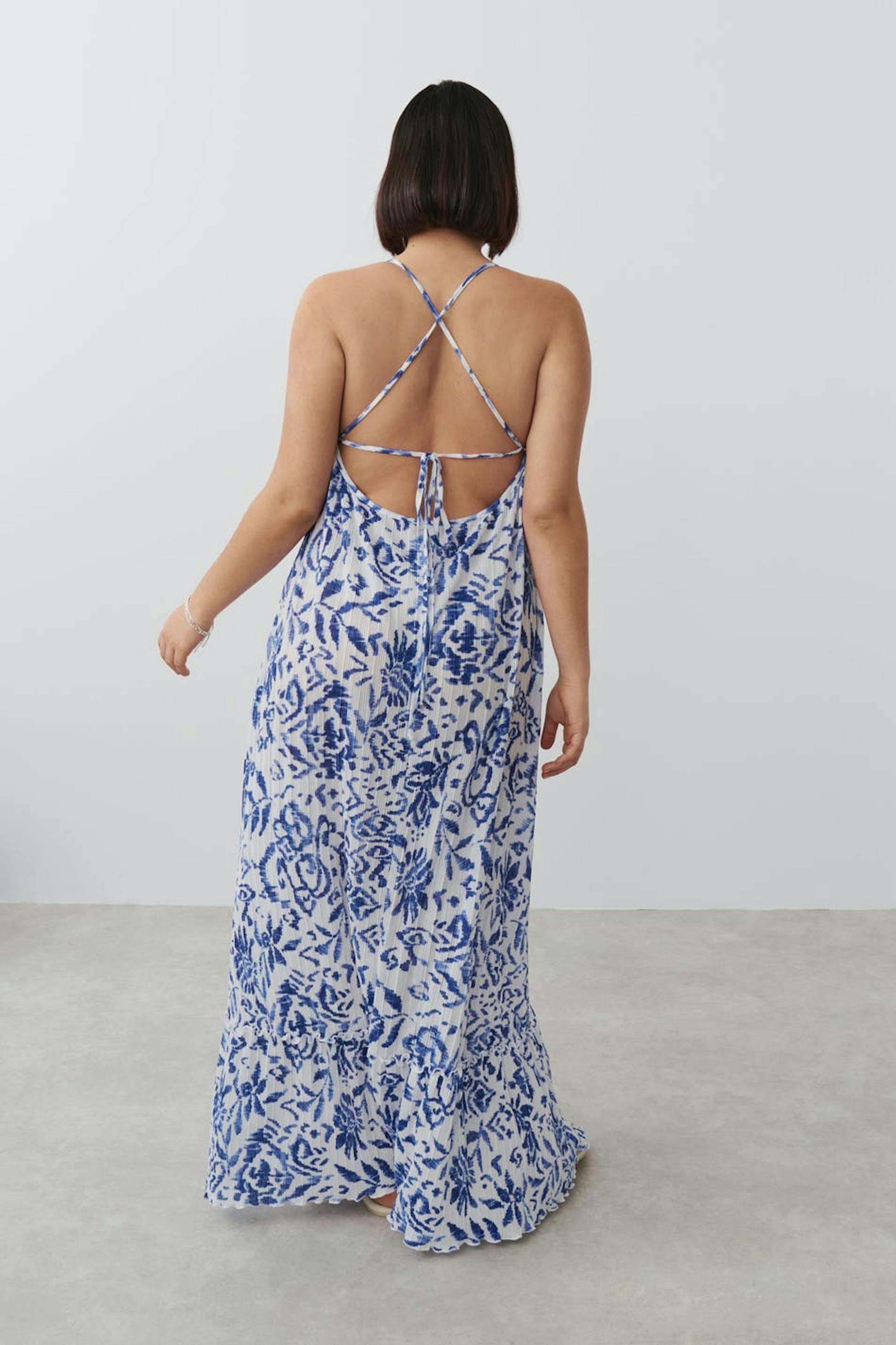 Patterned maxi dress with oversize fit. The dress is blue, white and sleeveless. It has thin shoulder straps to tie on the back, low back and flounces at the bottom.