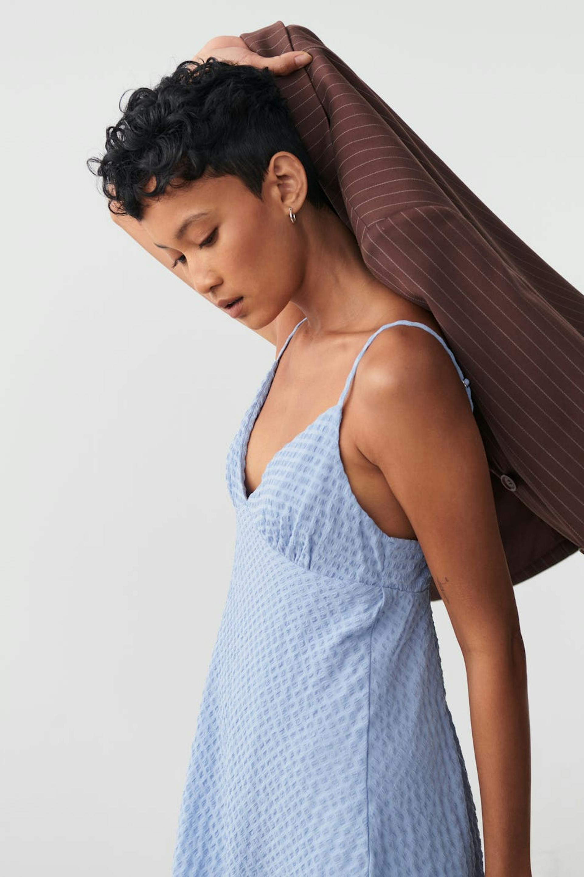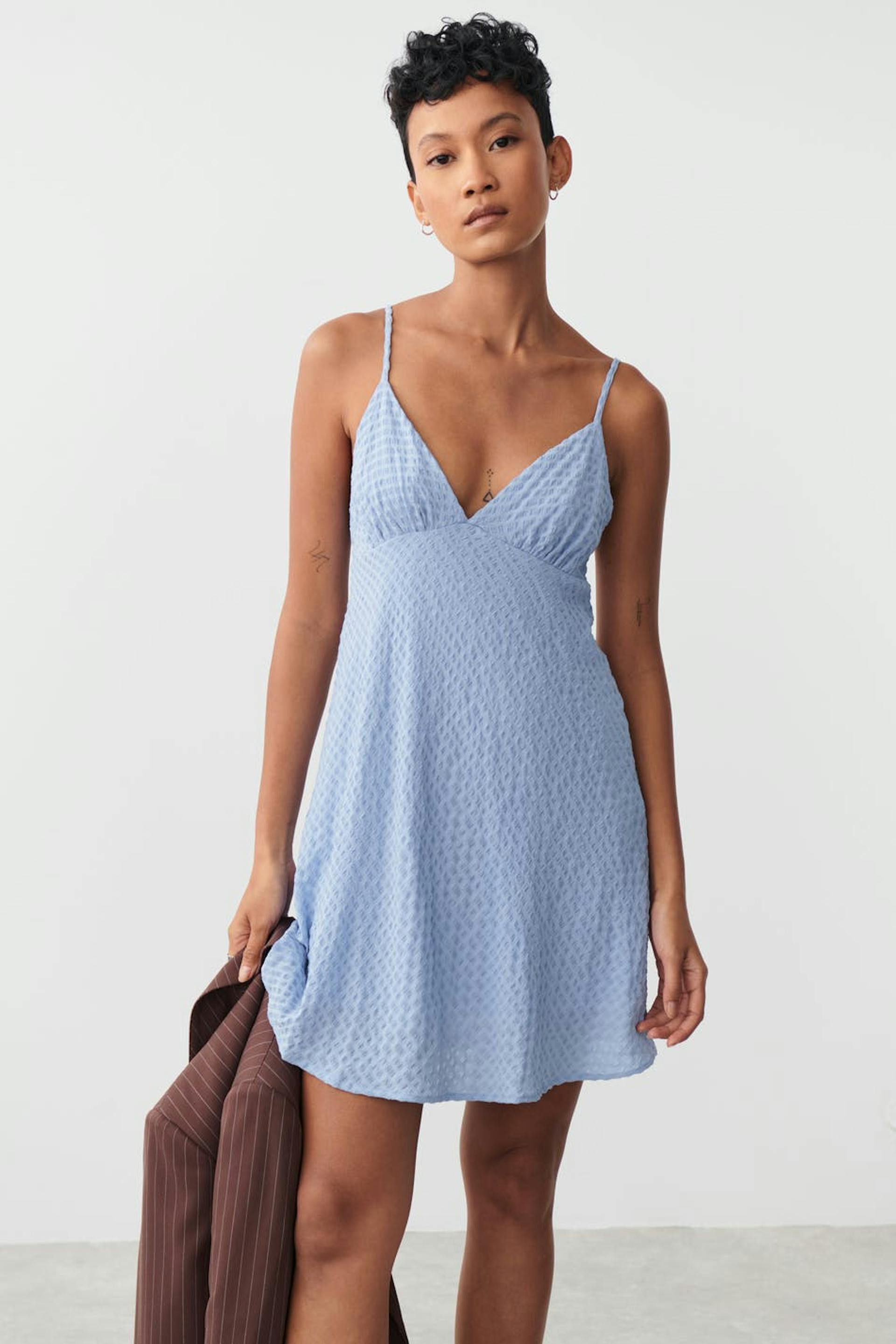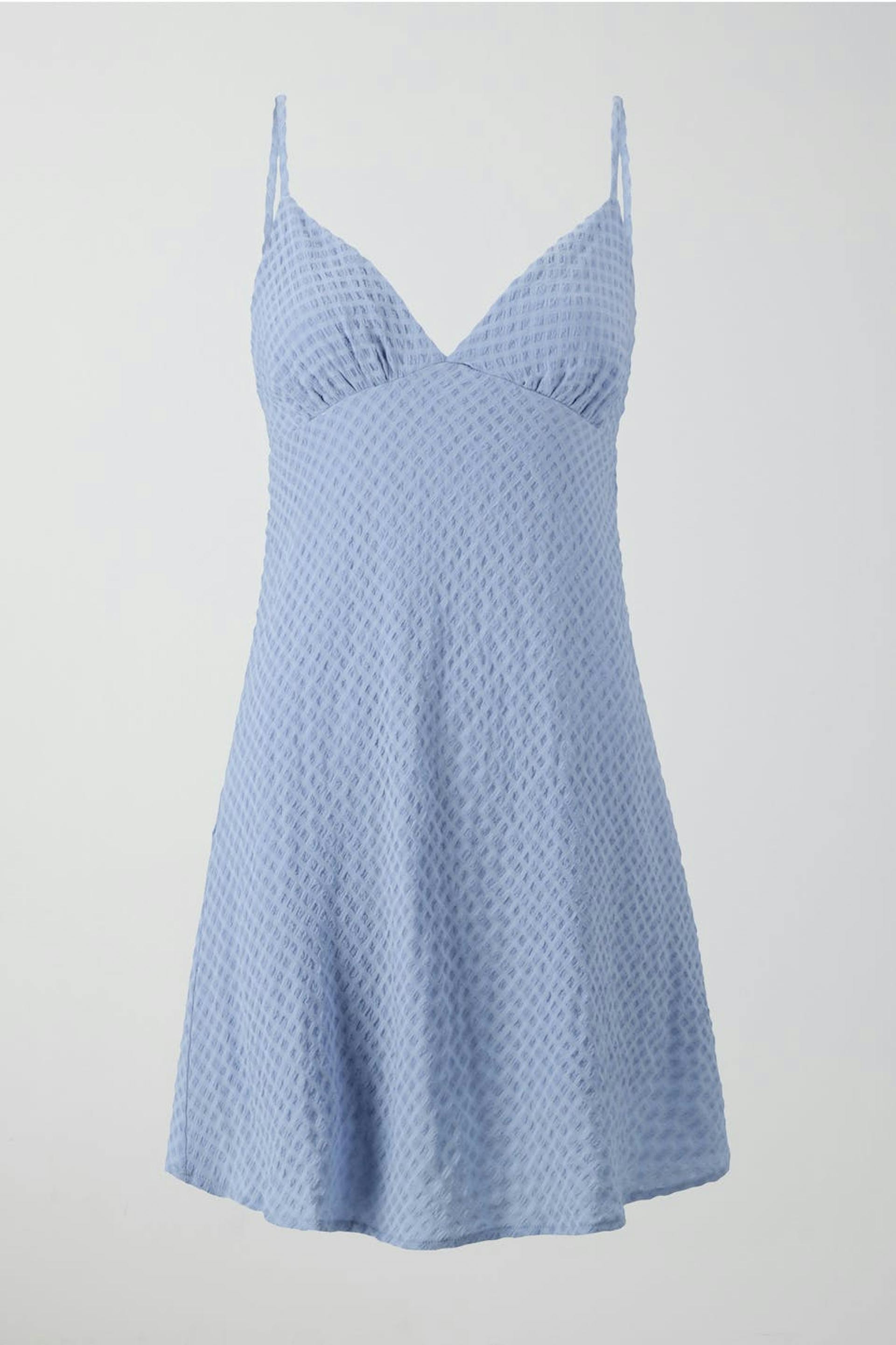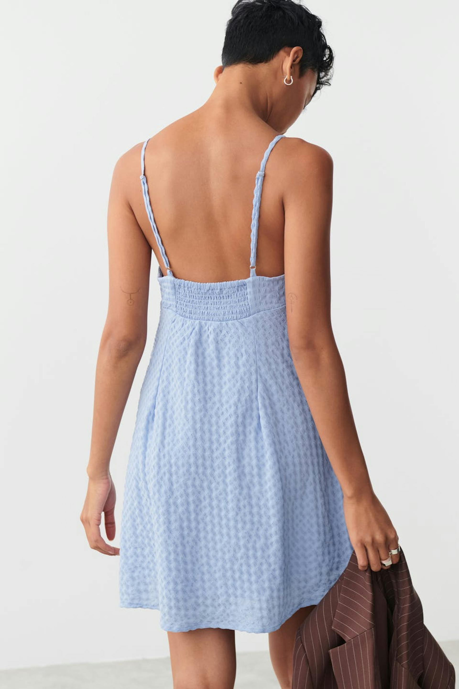 Sleeveless mini dress with thin, adjustable shoulder straps. The dress is blue and has v-neck. It has structured quality, smocking in the back and seam detail below the bust with gathering.