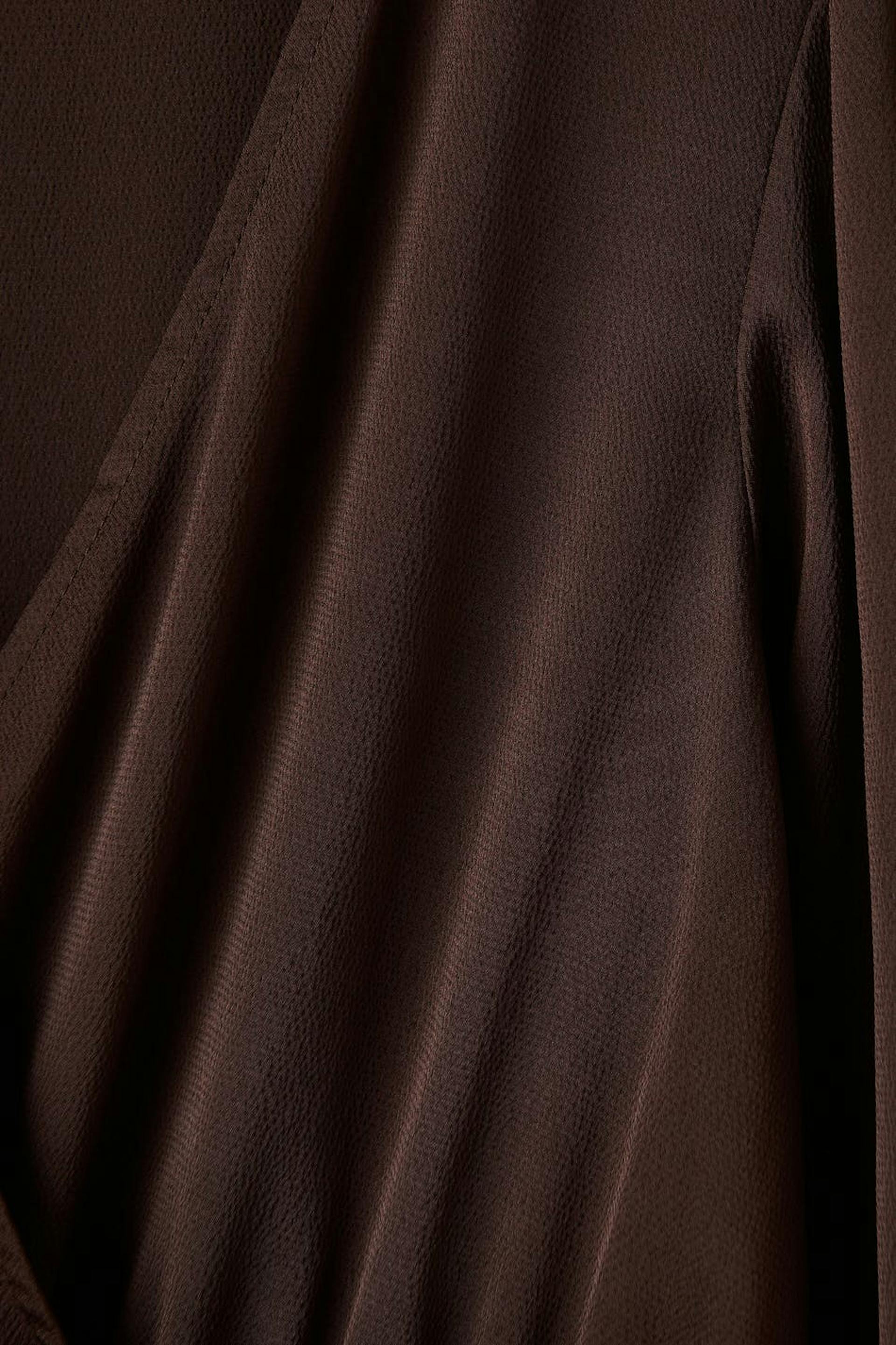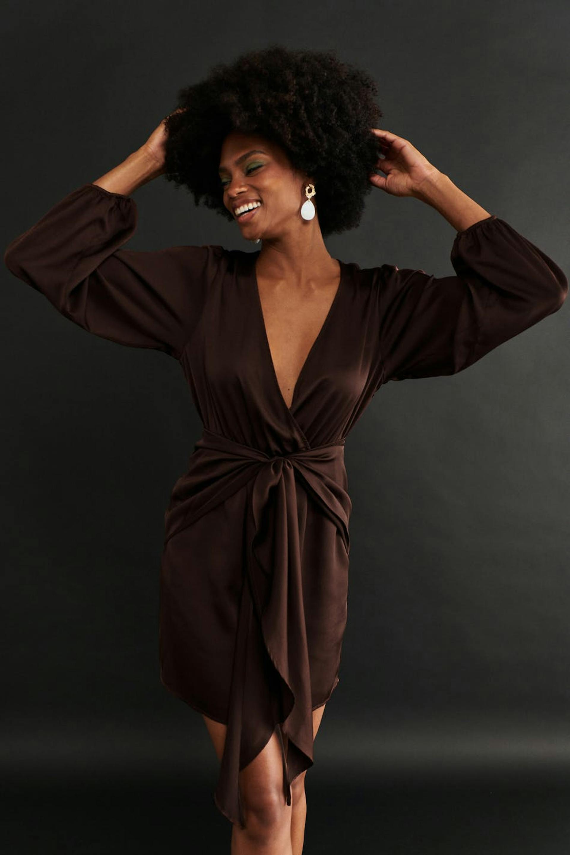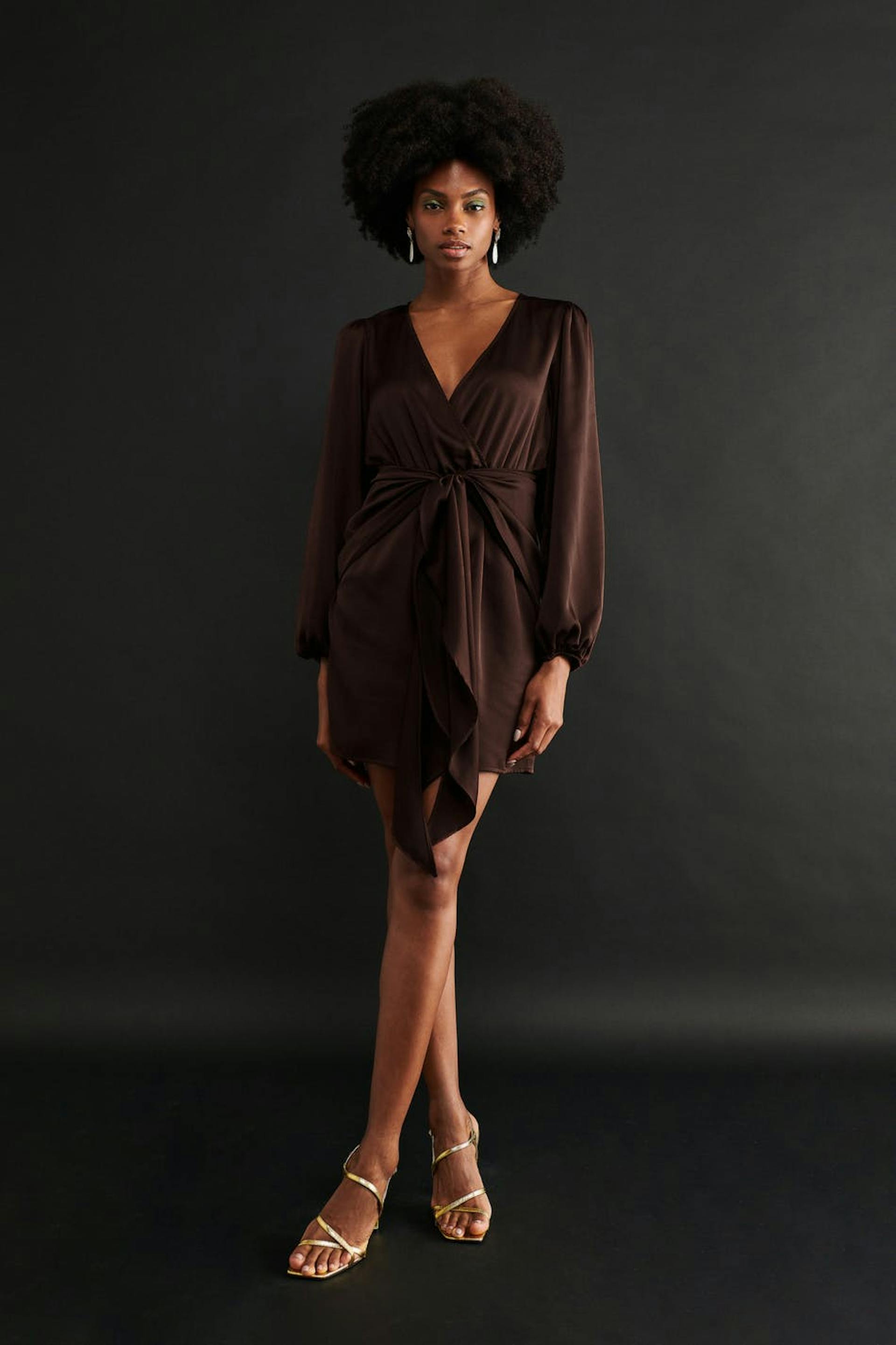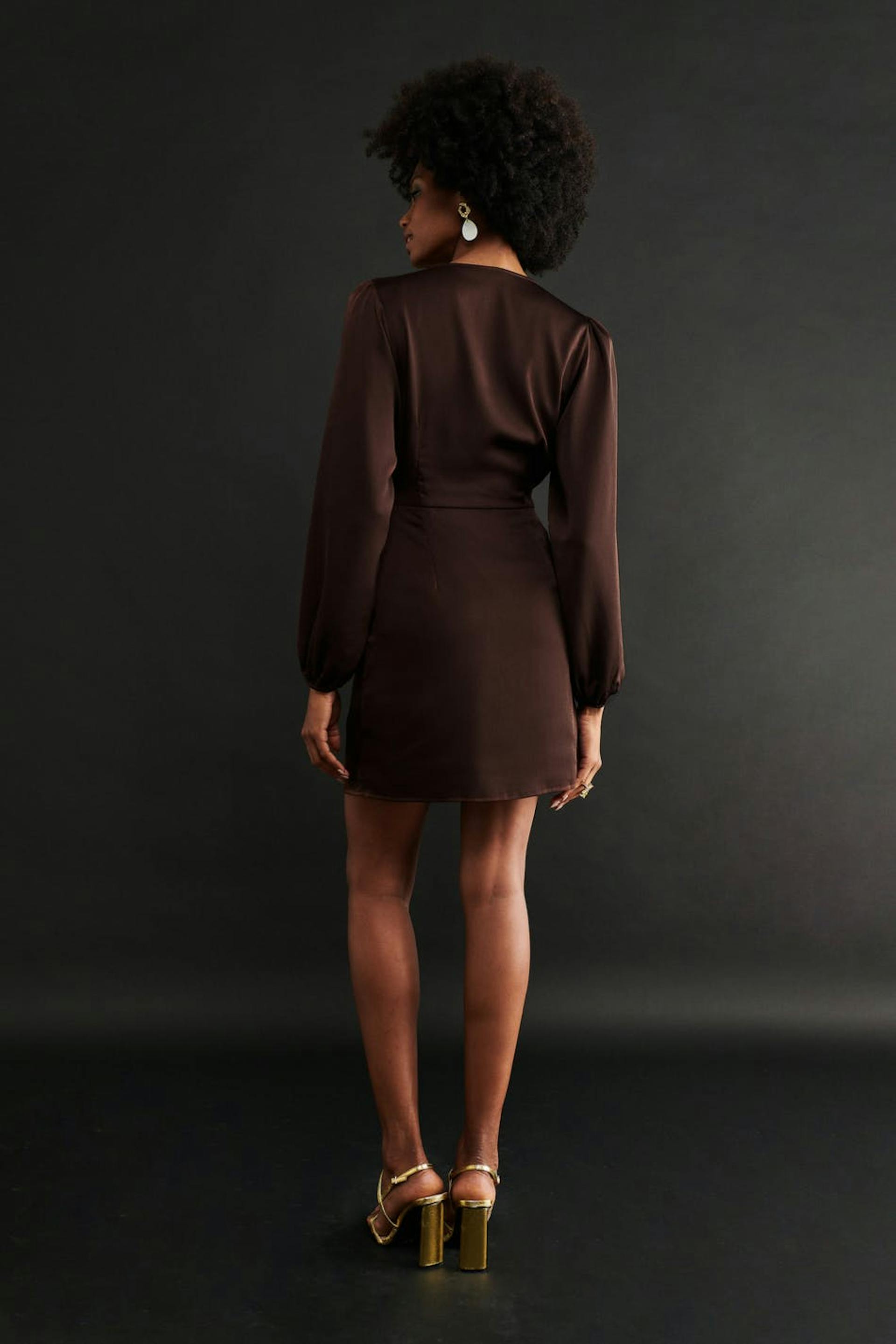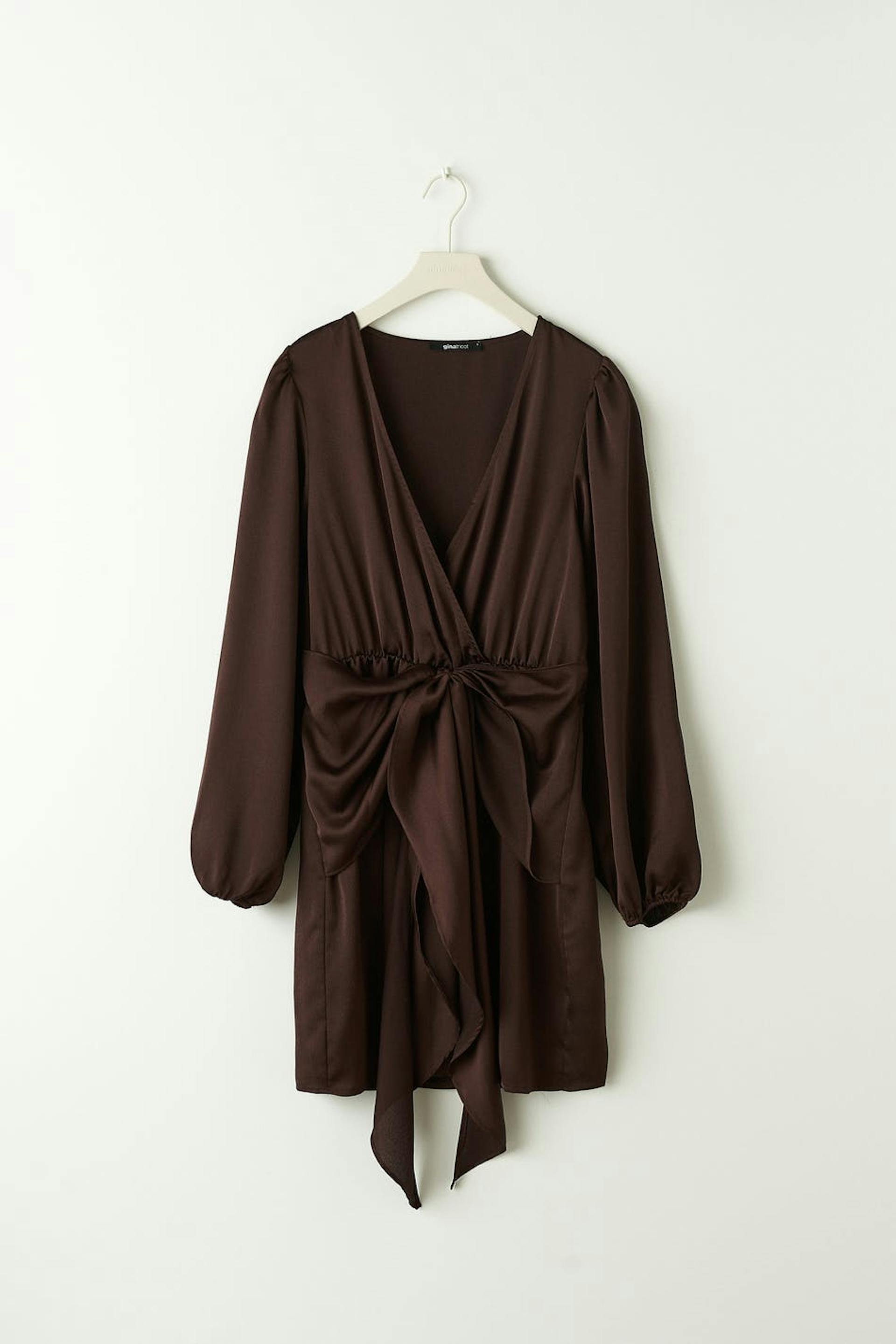 Short dress in satin with tie strings at the waist. The dress is brown and has v-neck cut. It has elastic at the waist and long sleeves with elasticized cuffs.