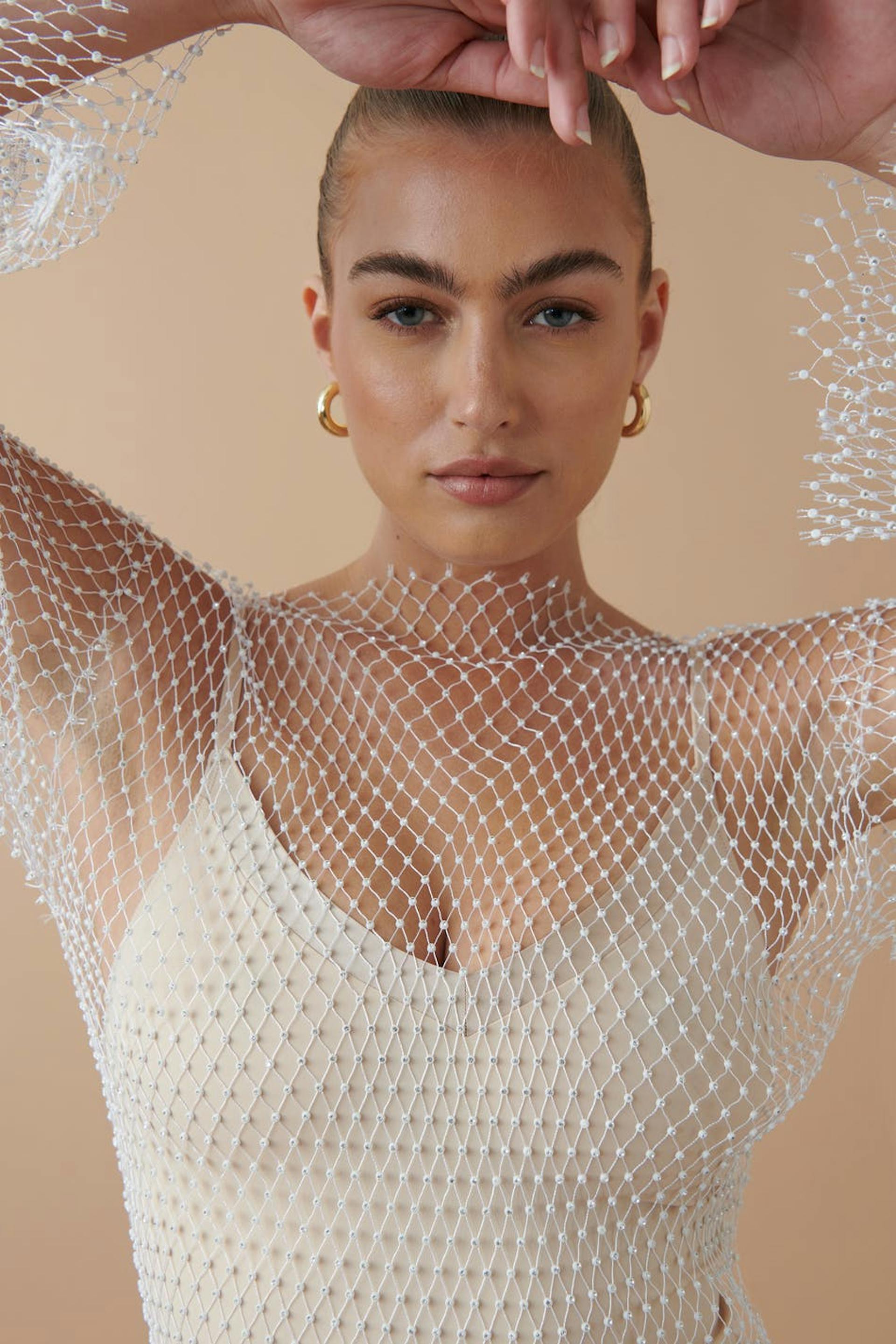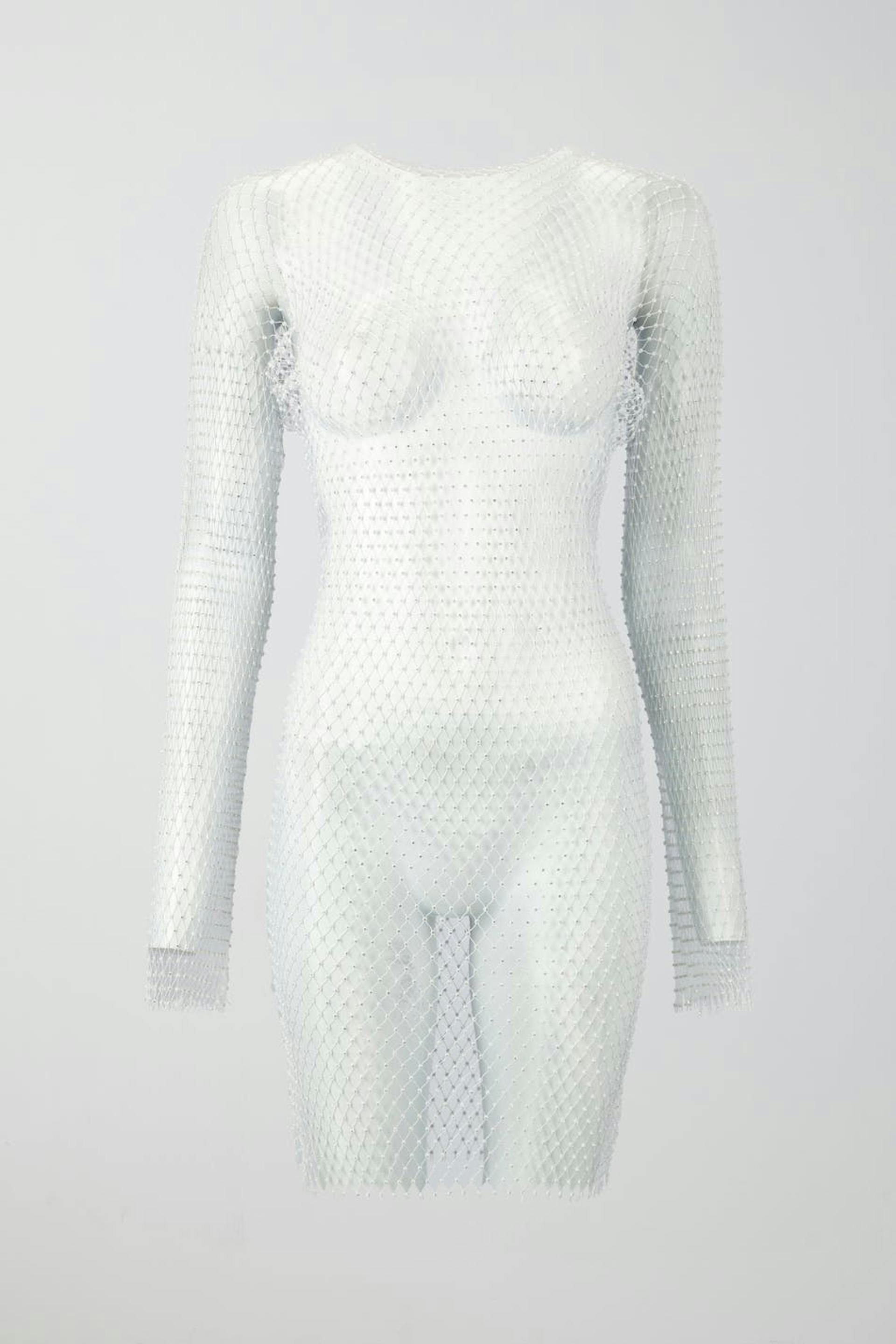 Rhinestone-embellished net dress with high neckline. The dress is white, long-sleeved and short. It has stretchy quality and raw edge at the bottom. Petticoat not included.