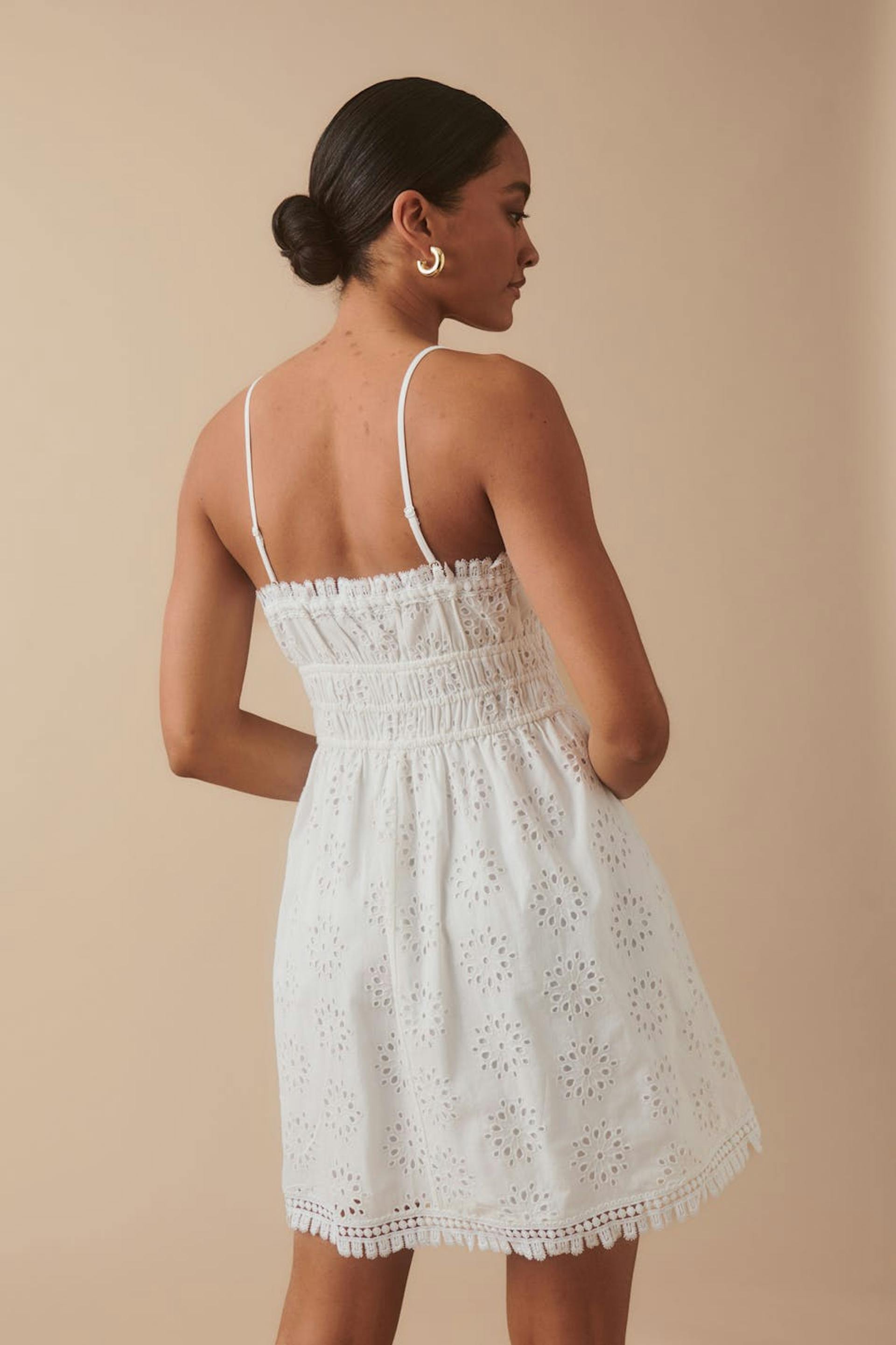 Short dress with hole embroidery. The dress is white and has V-neck. It has elastic at the waist and adjustable shoulder straps.