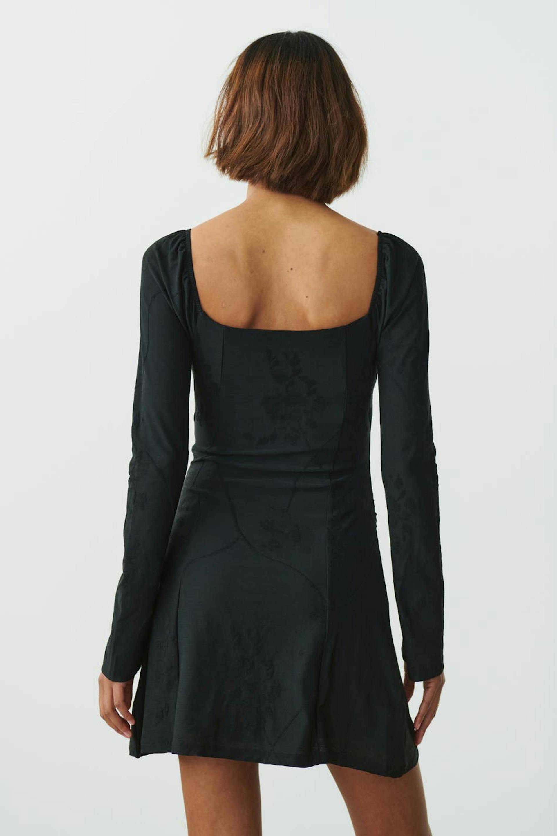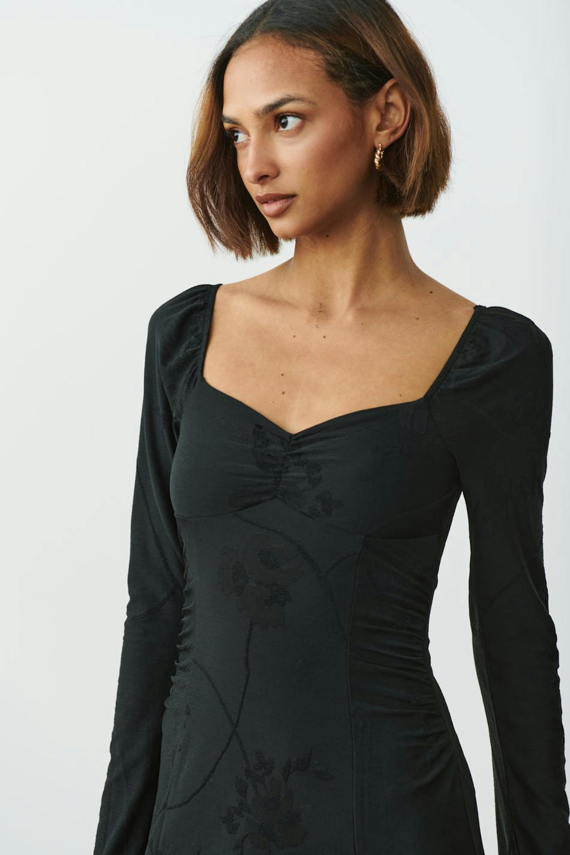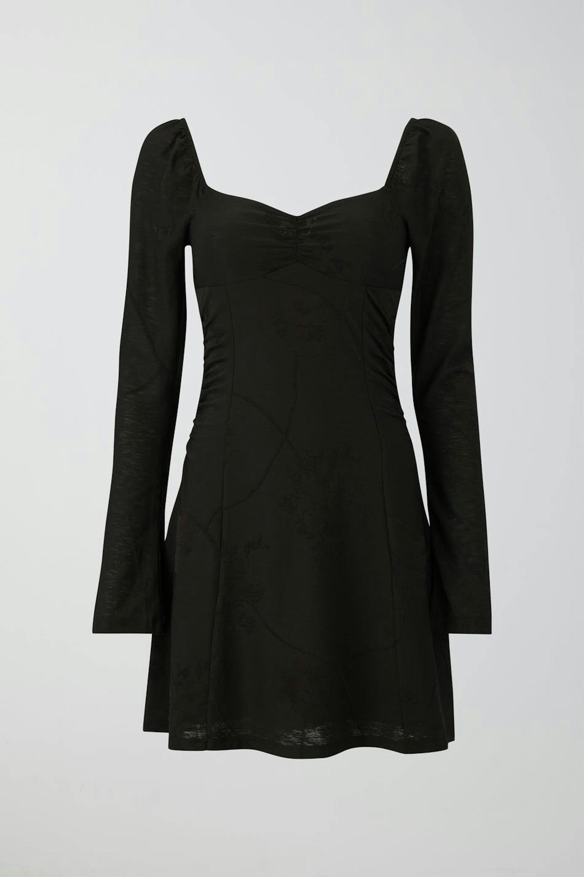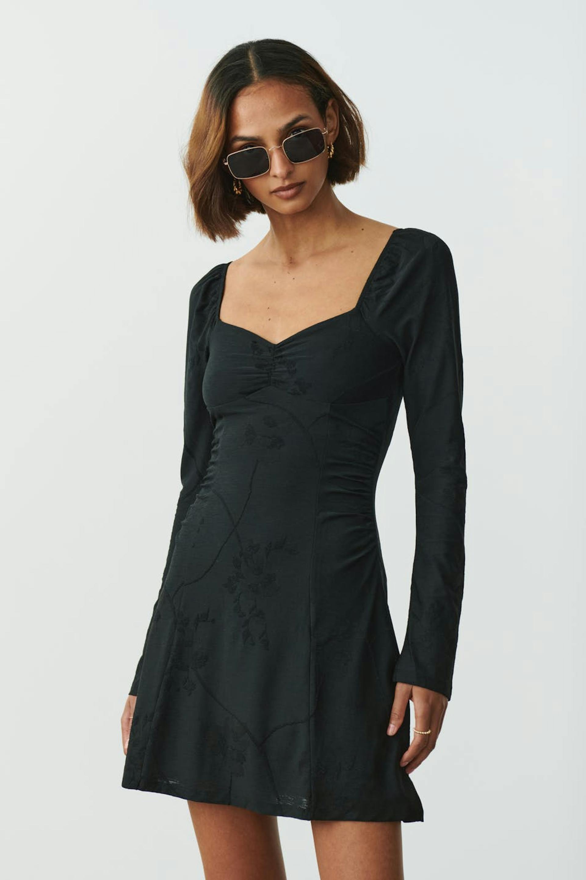 Mini dress in jersey fabric with a regular fit. The dress is black and has long puff sleeve. It has a heart-shaped neckline with ruching on the center and ruching in the sides.