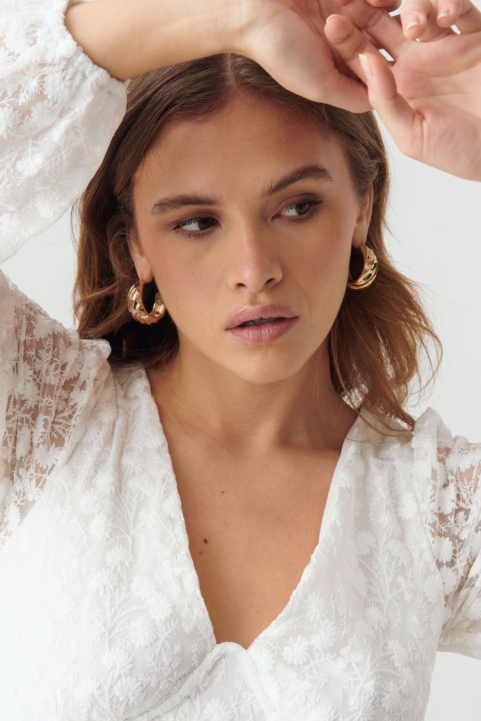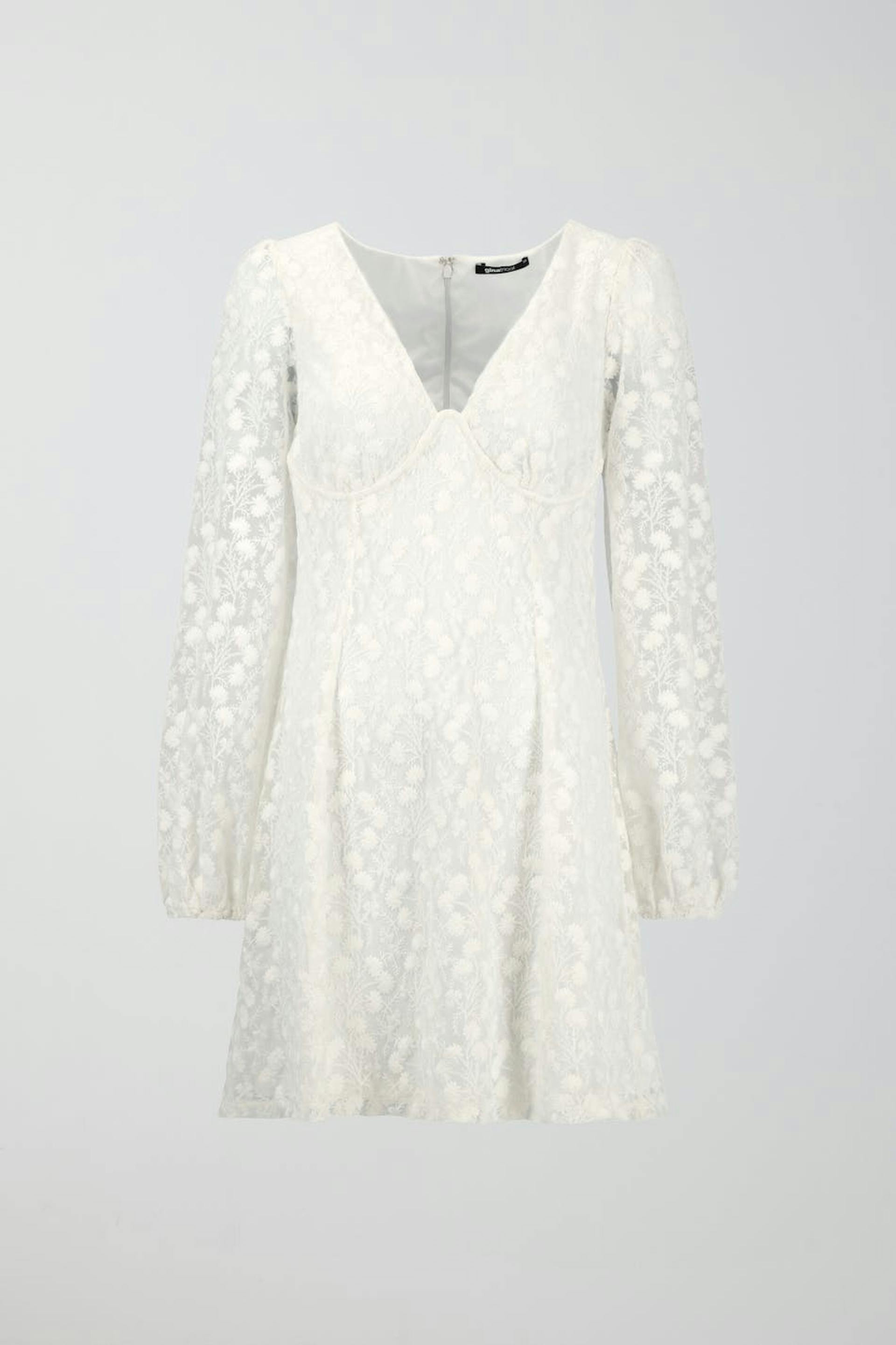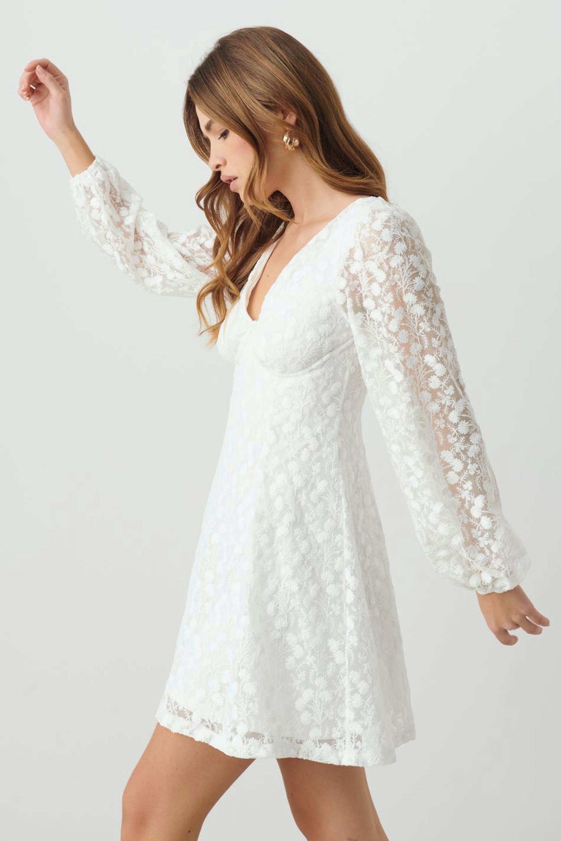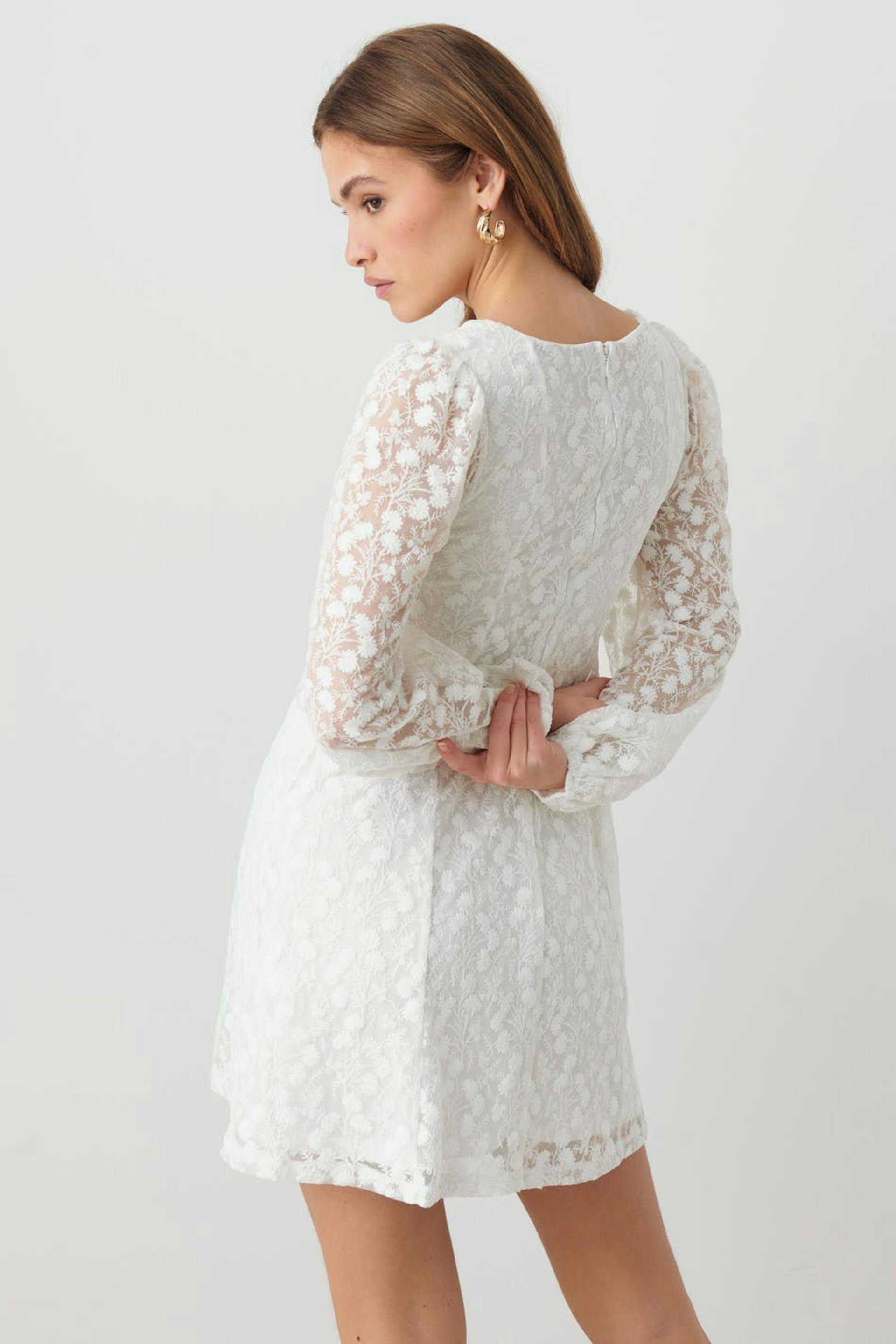 Long-sleeved lace dress with plunge neckline. The dress is perfect for the party, white and short. It has underwiring below the bust, zip in the back, gathering around the shoulders and elasticized cuffs.