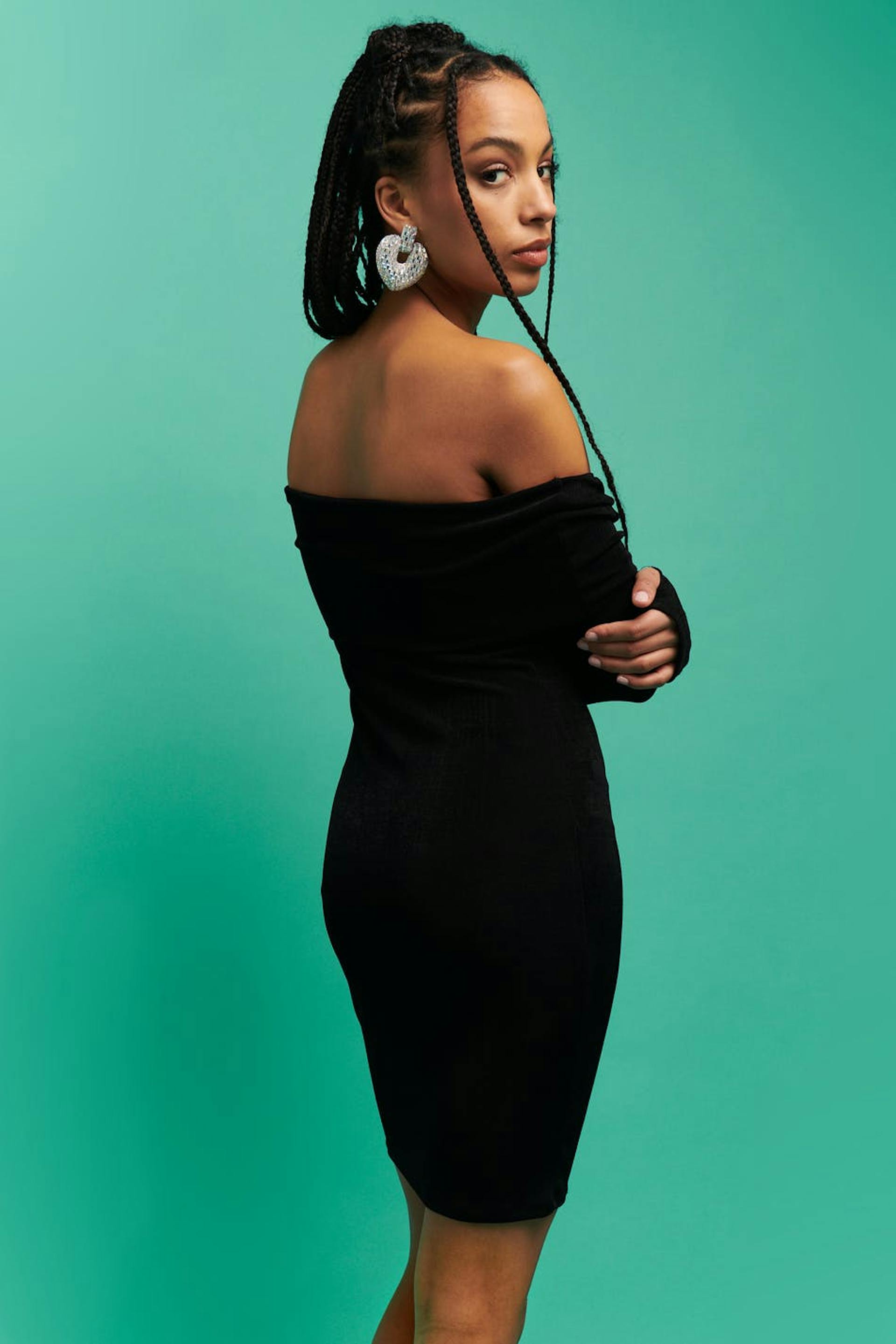 Long-sleeved off the shoulder dress in jersey with stretchy quality. The dress is perfect for the party, black and short. It has thumbholes on the sleeve ends.