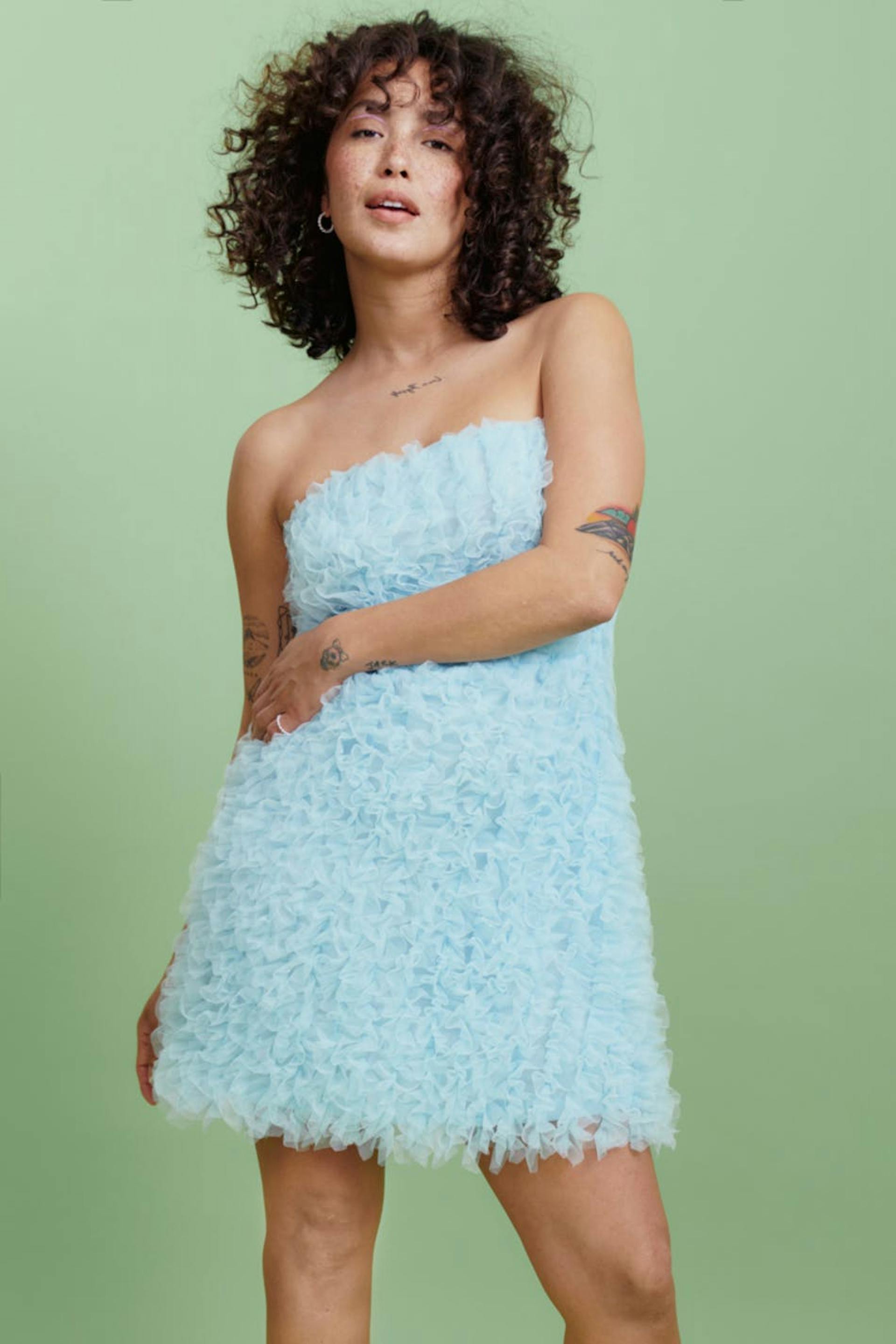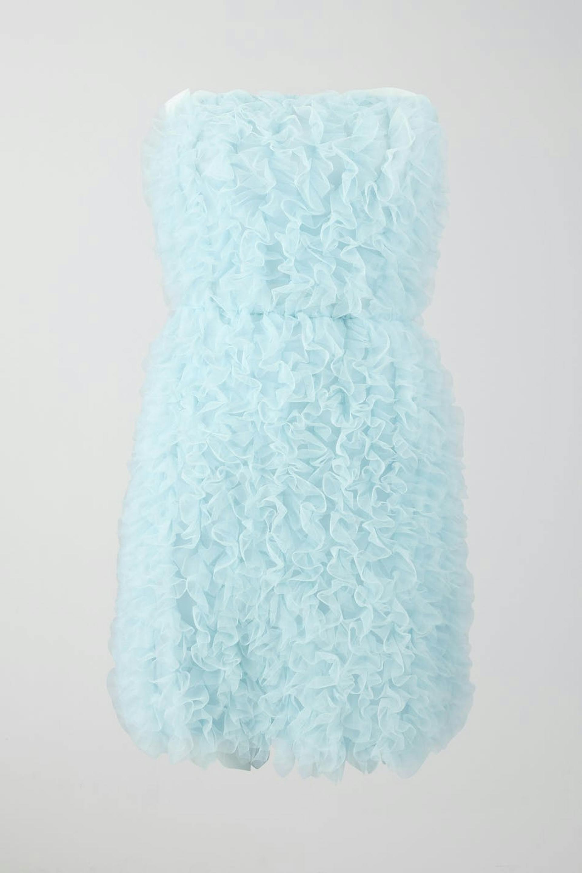 Short tulle dress with elastic at the waist. The tulle dress is light-blue and has a stretchy quality.