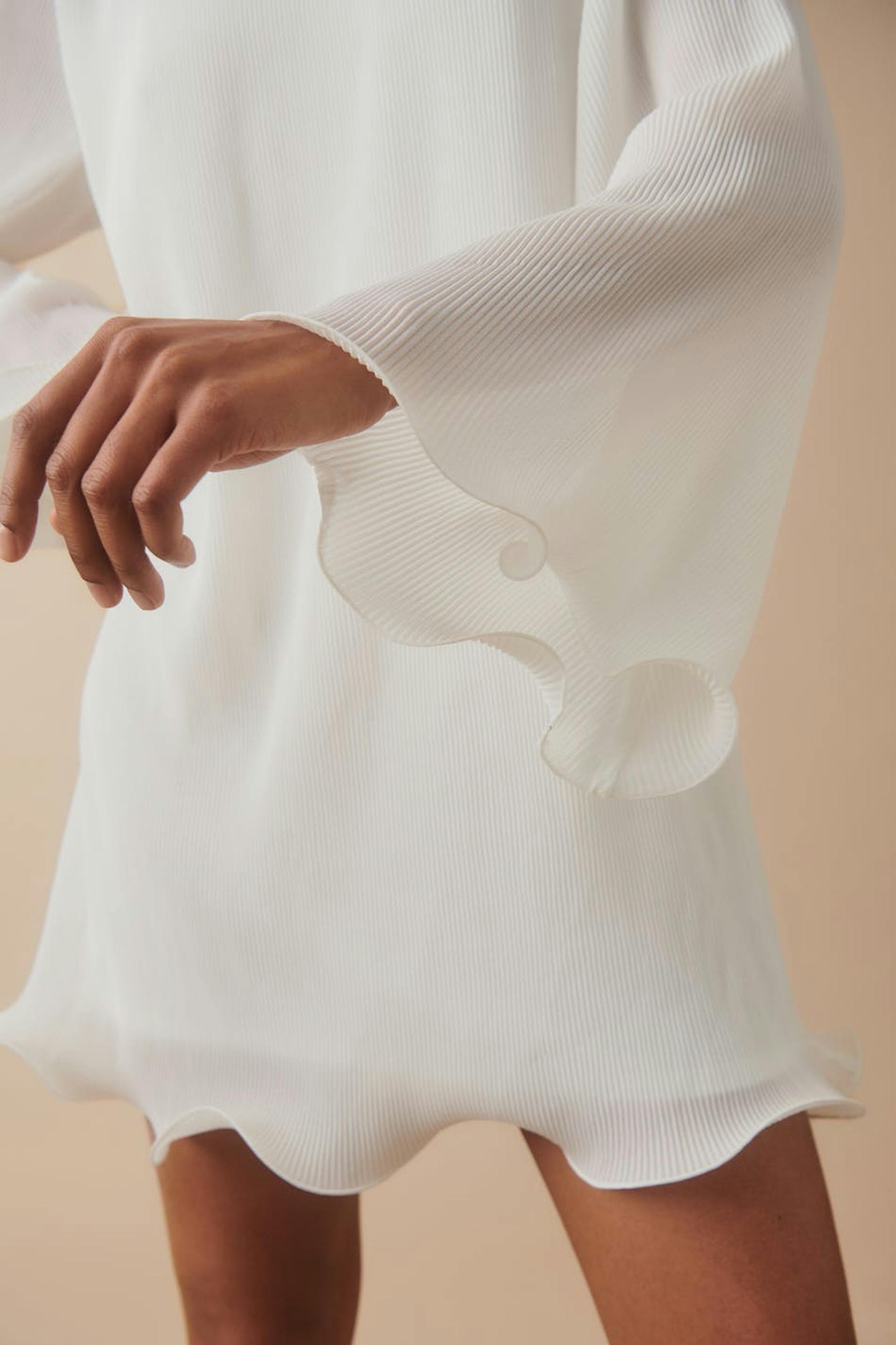 Long-sleeved dress with loose-fitting style. The dress is white, short and pleated. It has buttoning at the back, round neckline, voluminous sleeve and wavy edges.