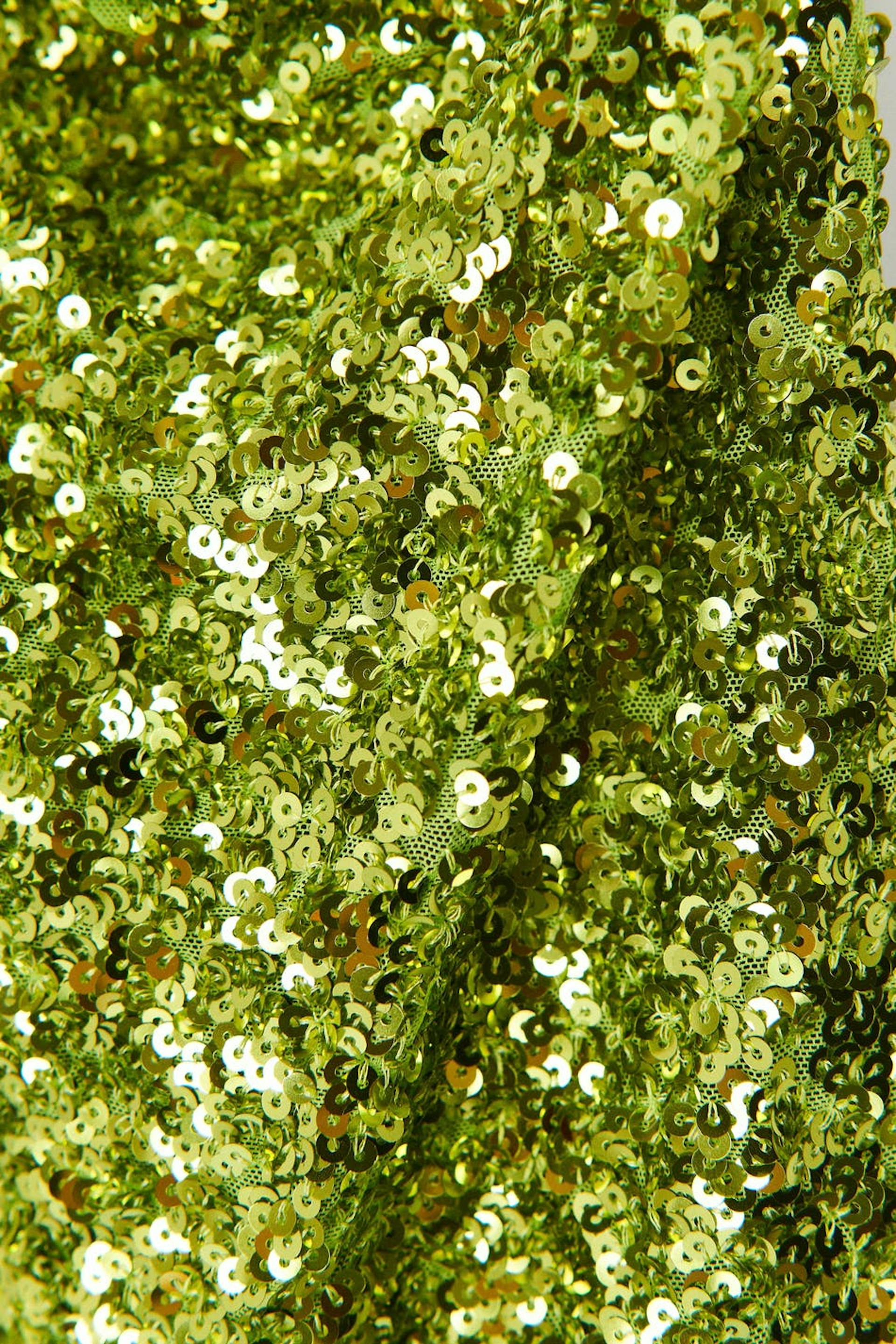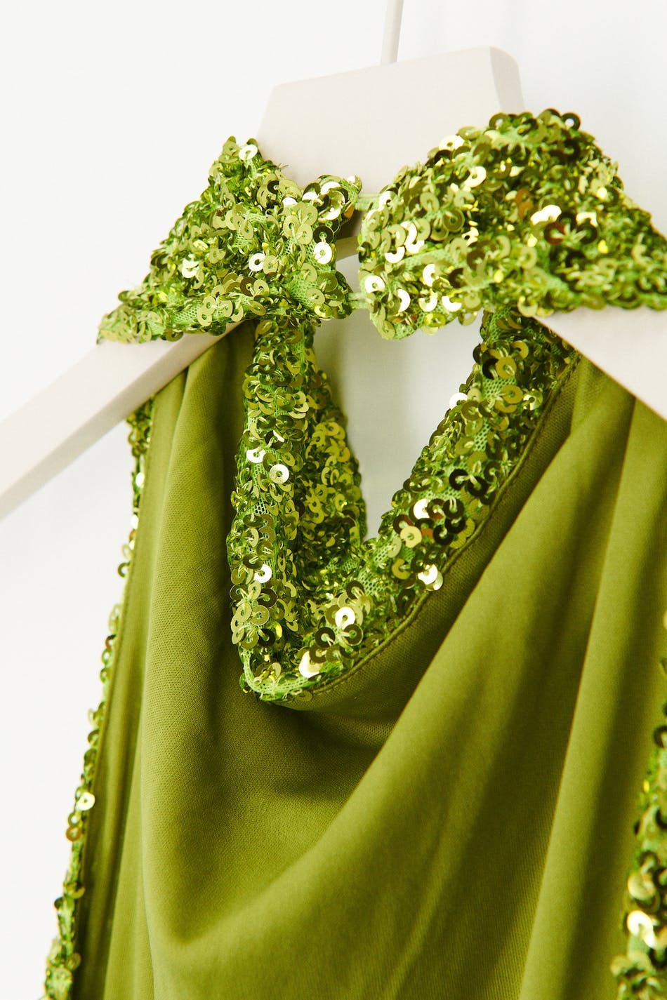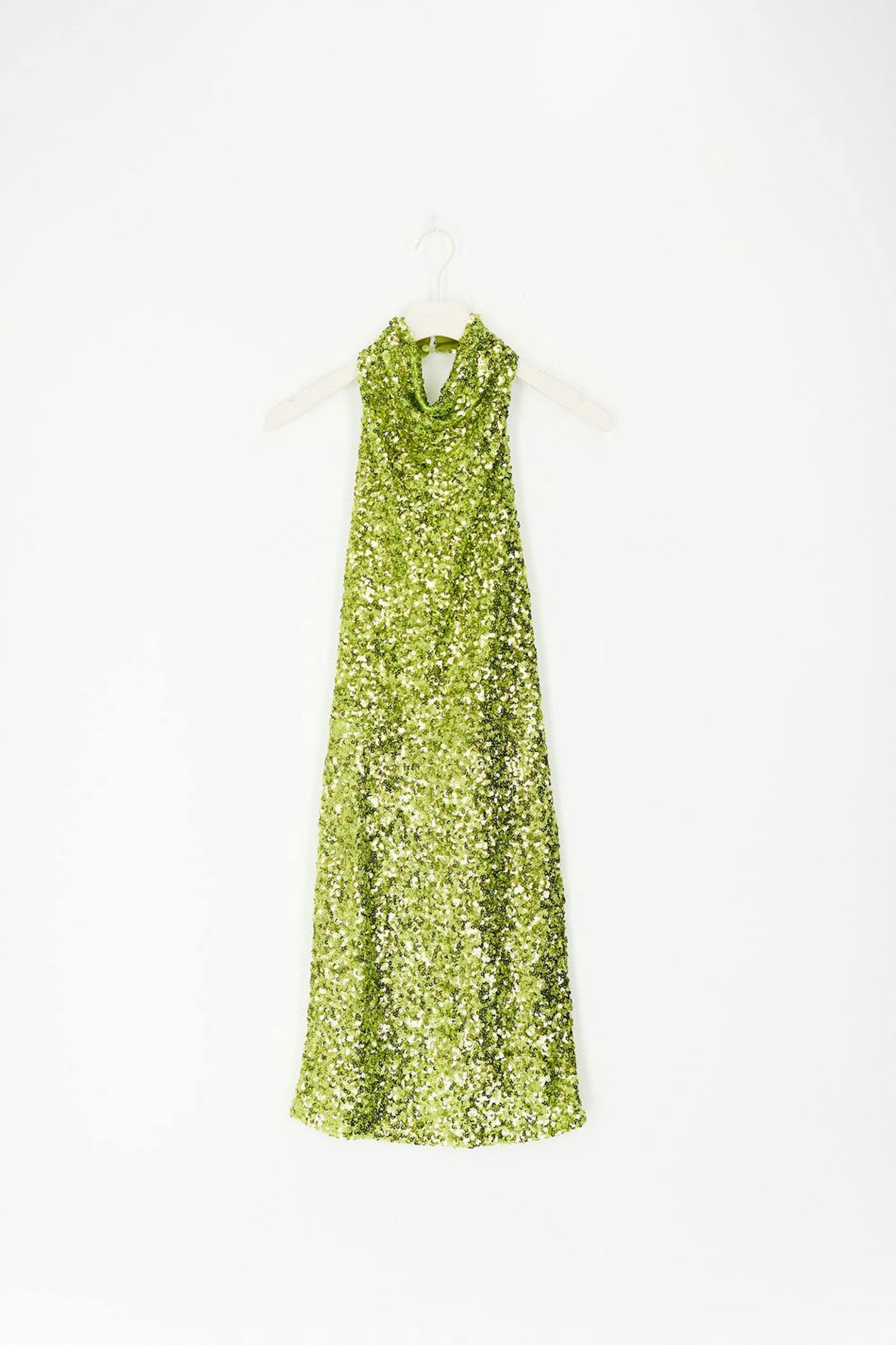 Short sequin dress with open back. The dress is green and has halterneck design. It has fitted skirt and high neckline.