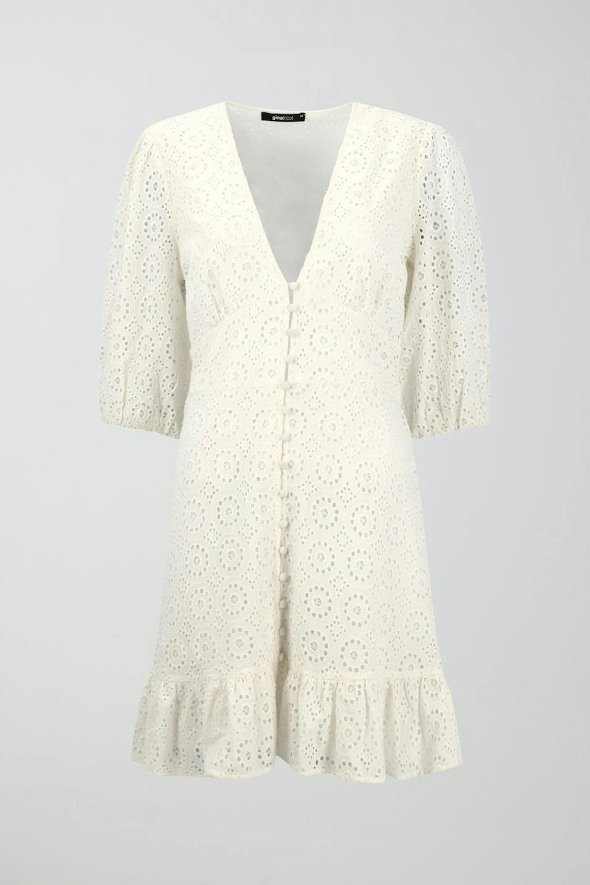 Short dress in cotton with hole embroidery. The dress is white and has short puff sleeves. It has v-neck, buttons along the front, seam detail below the bust, fitted waist and frills at the bottom.