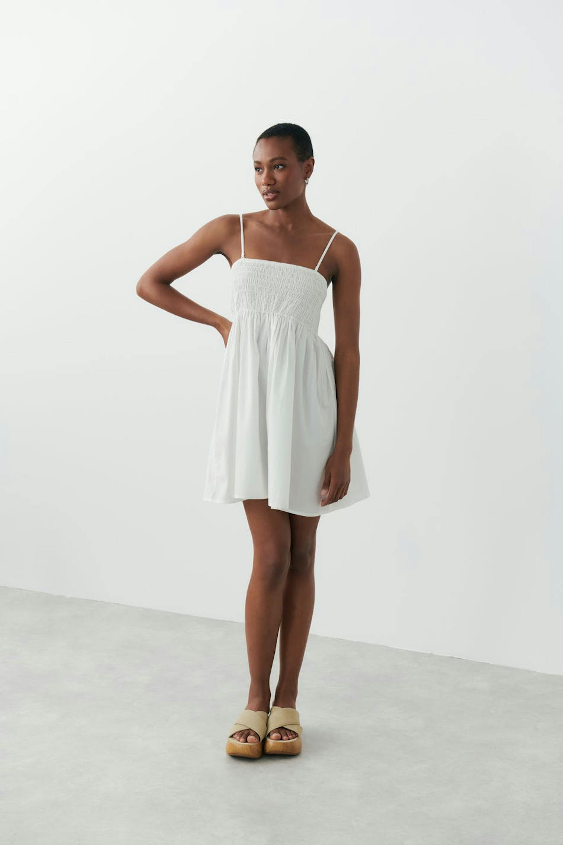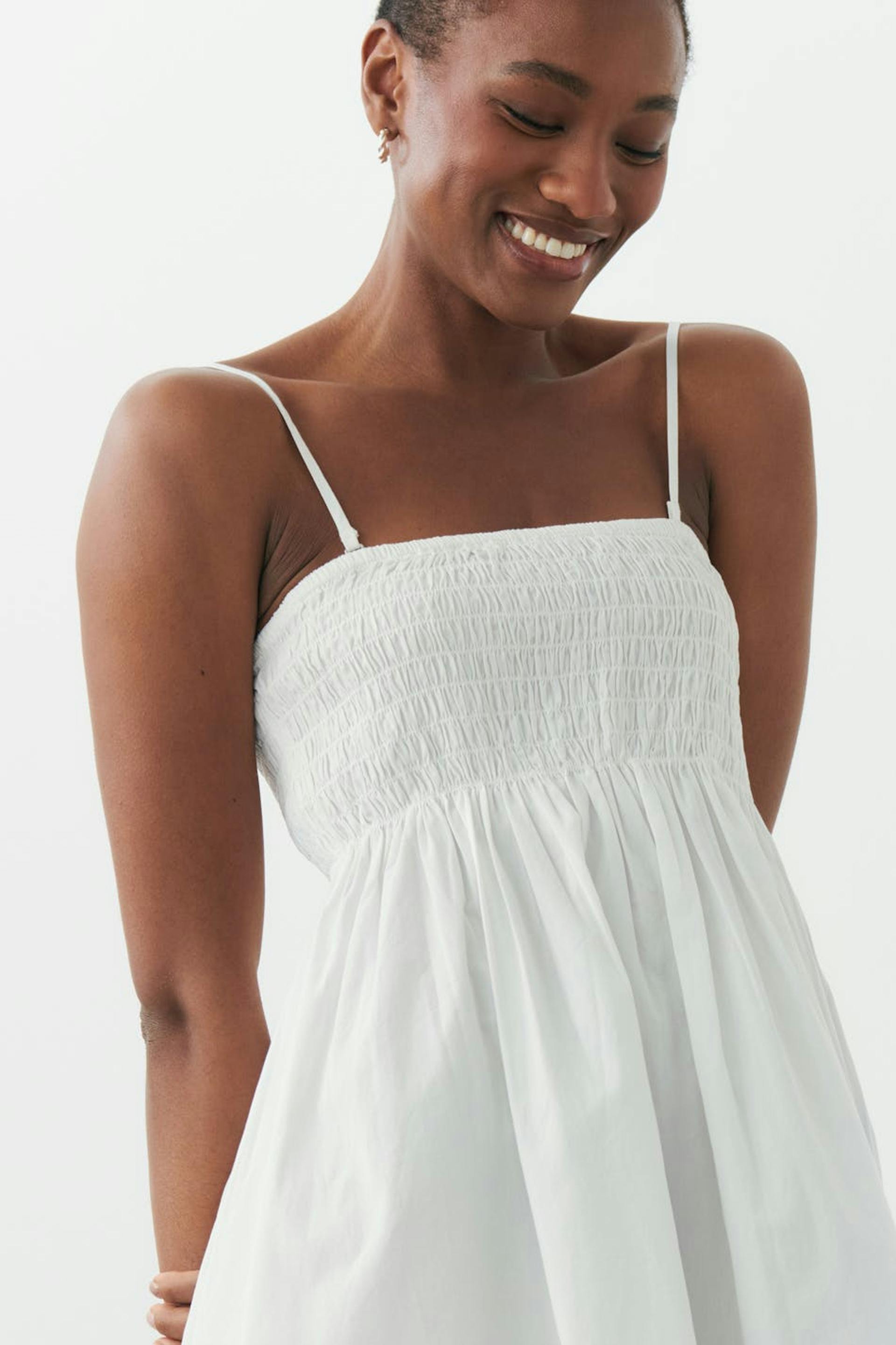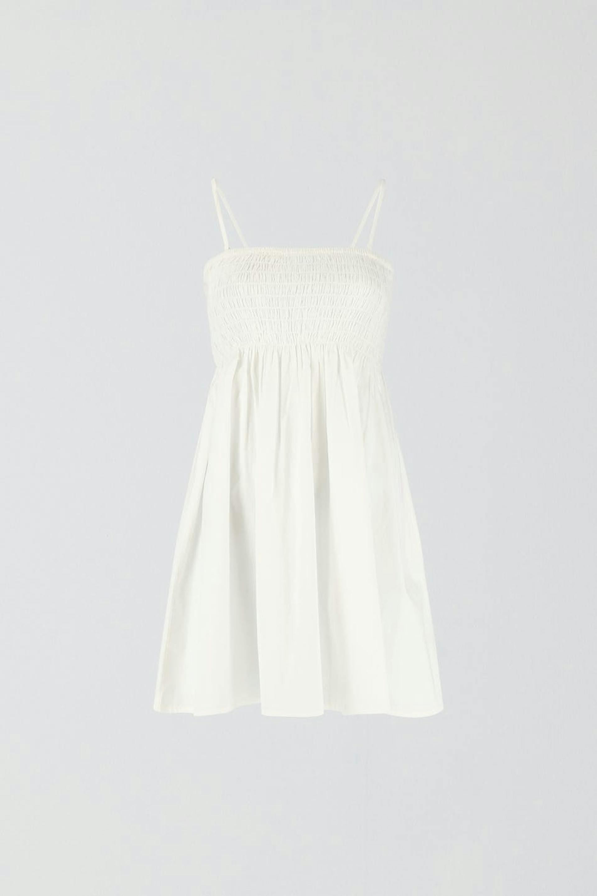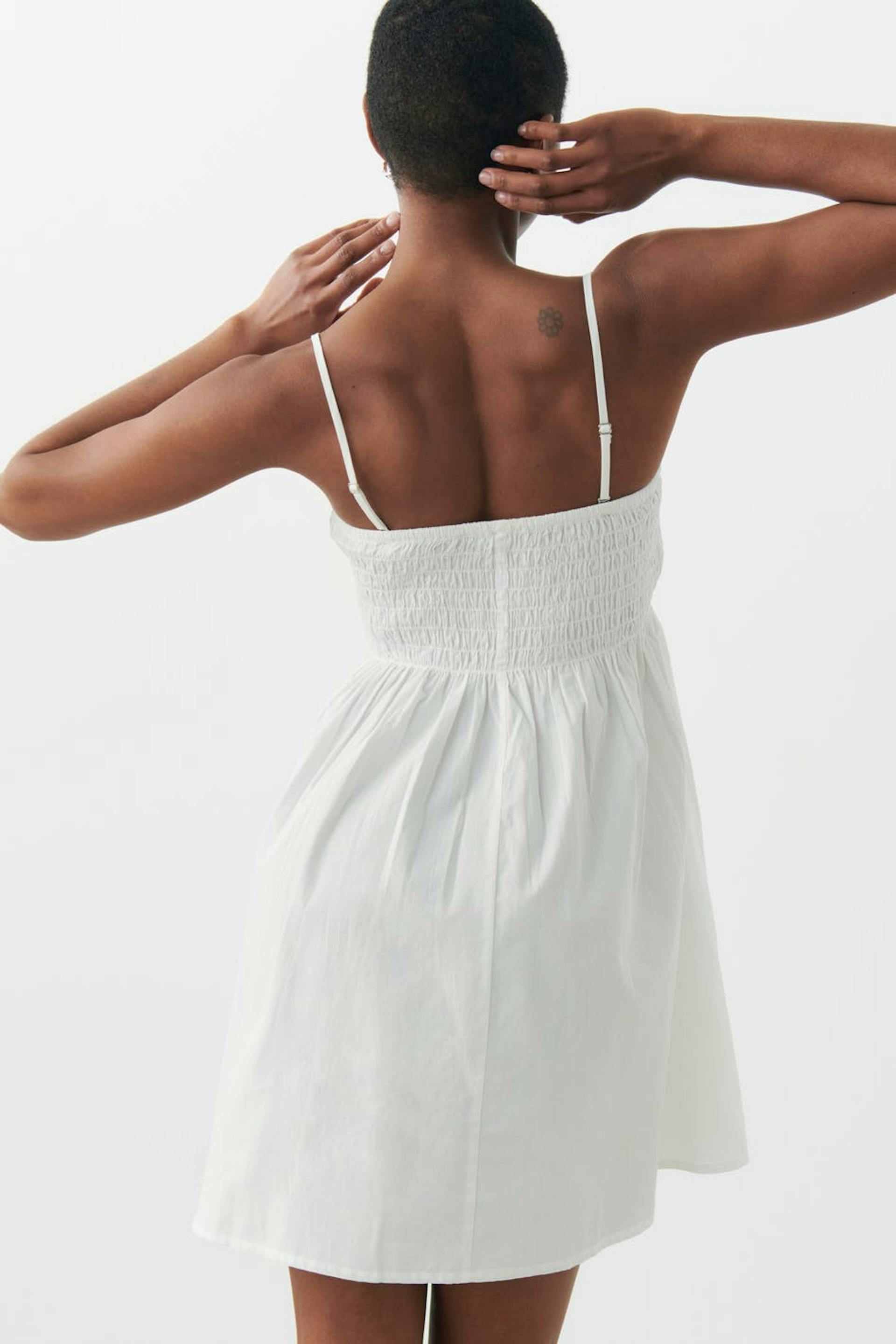 Short smock dress with narrow, adjustable shoulder straps. The dress is white and has a frill at the bottom. It has woven quality.