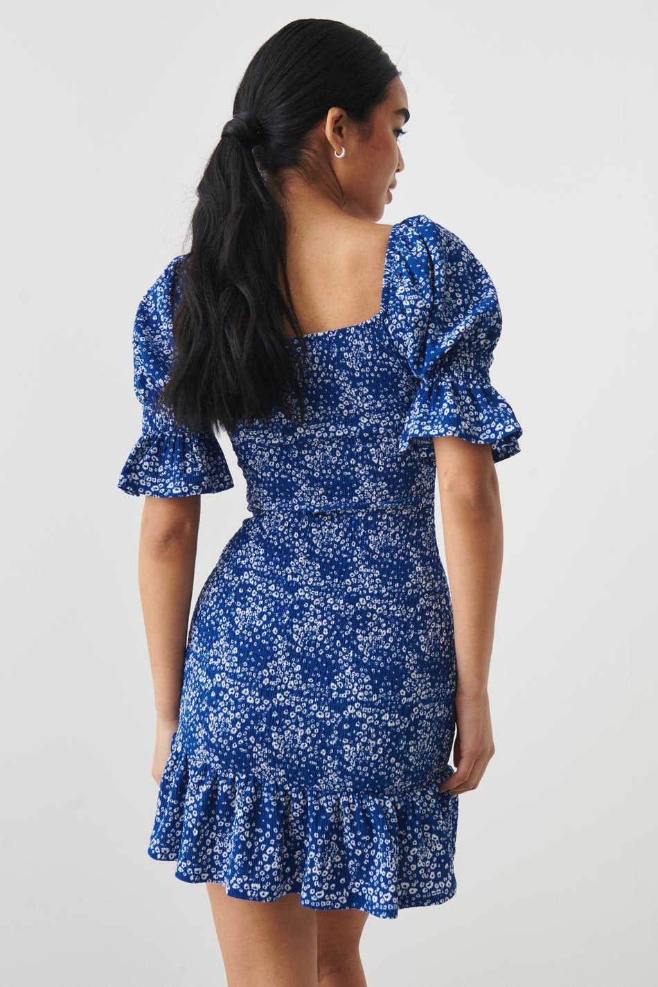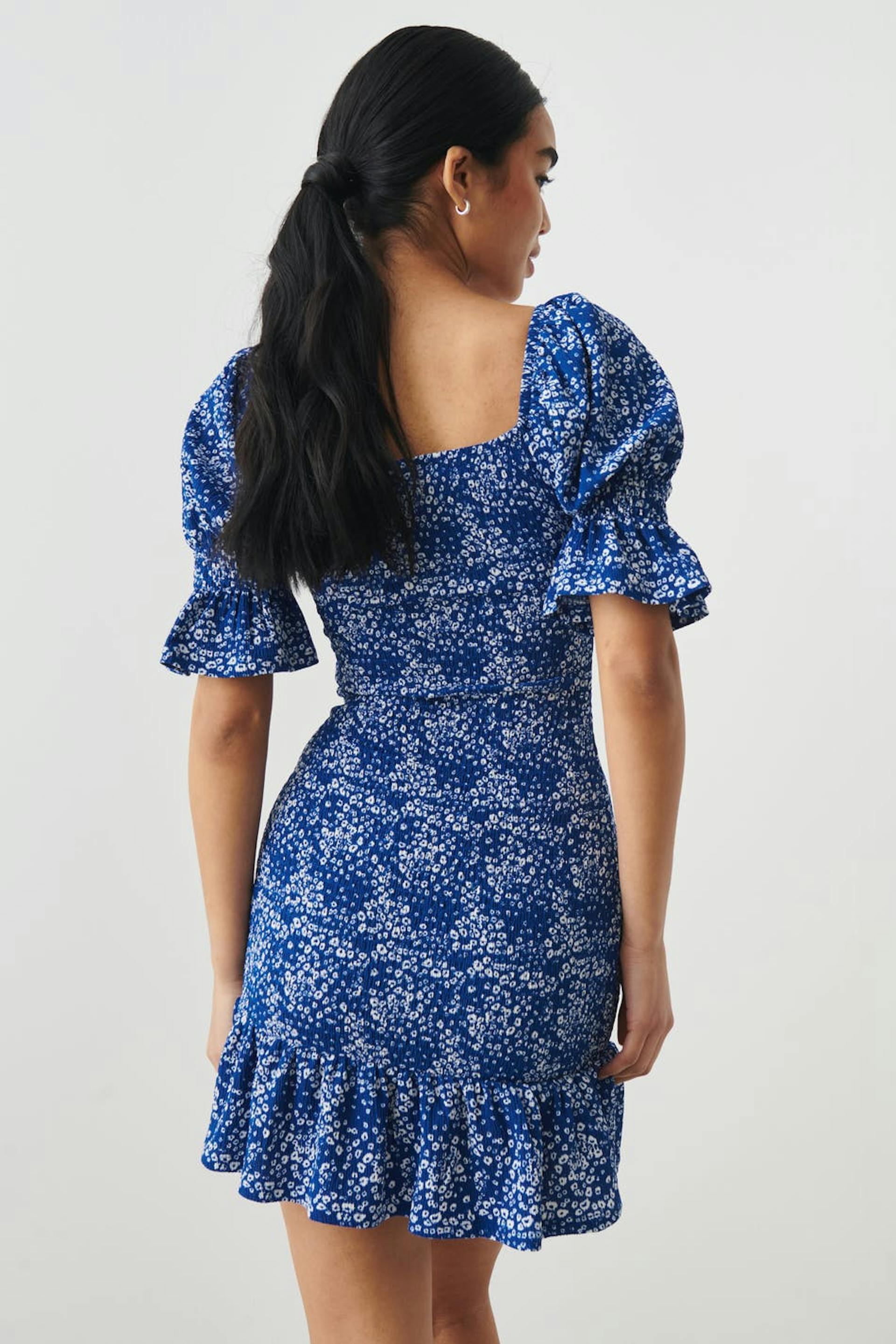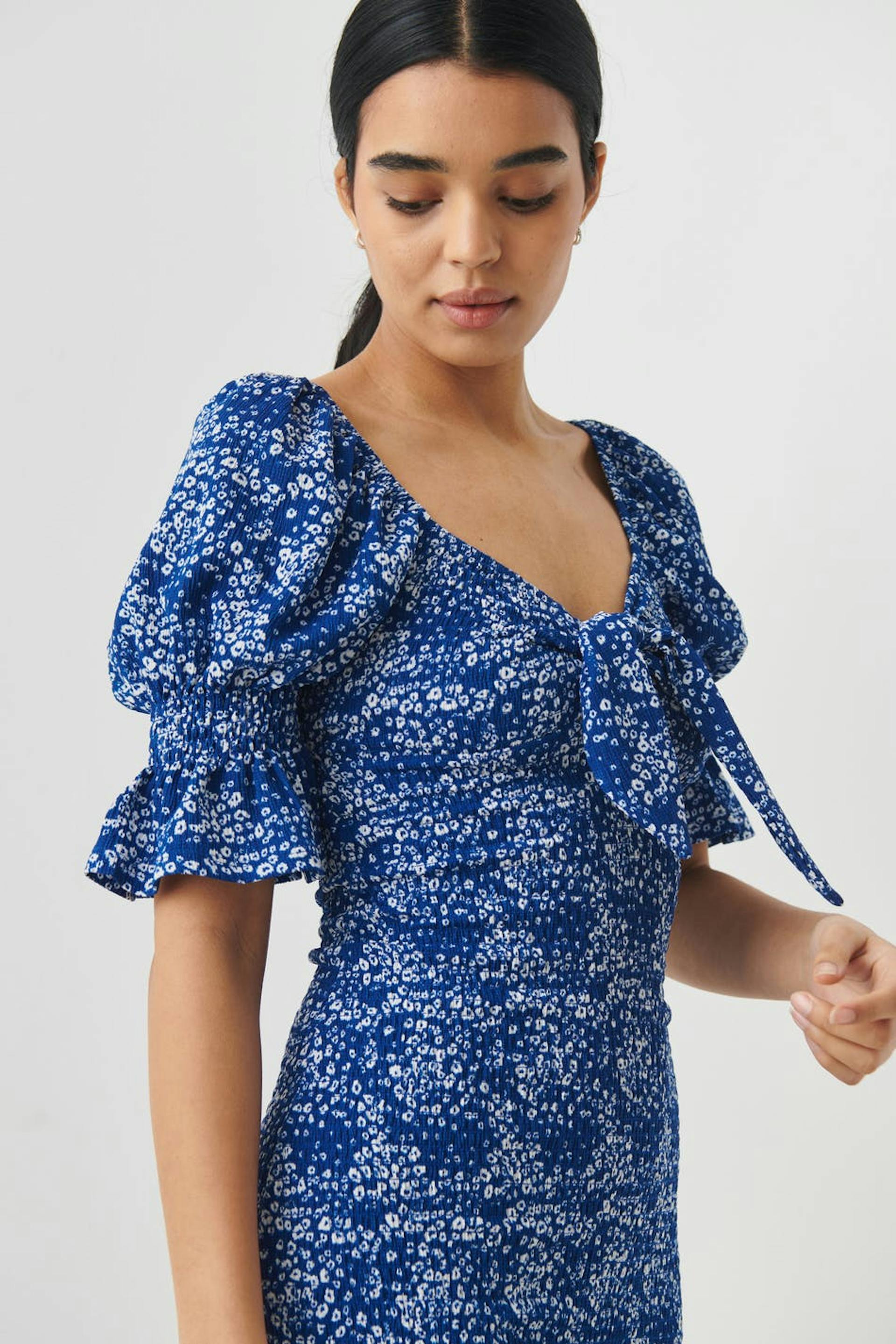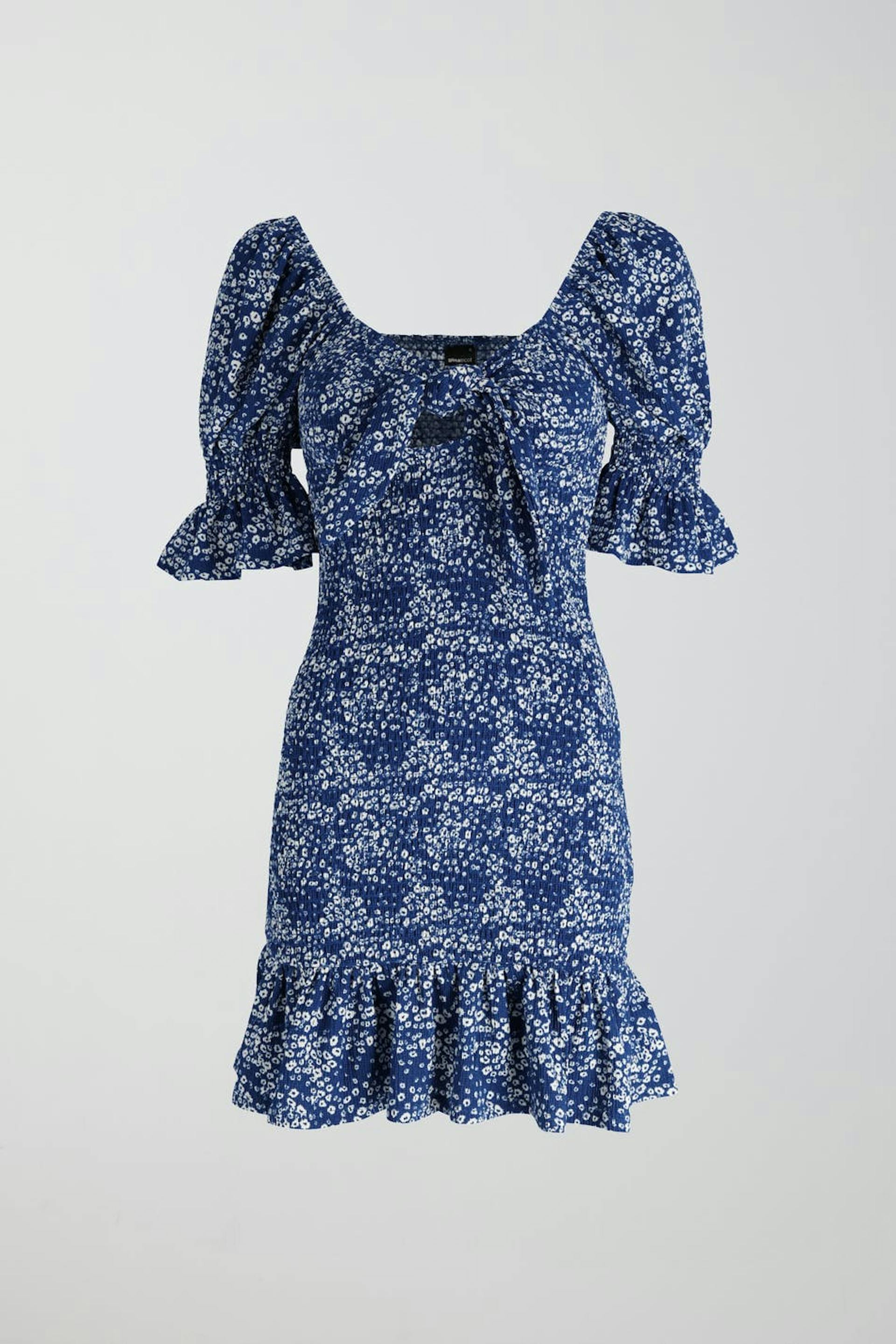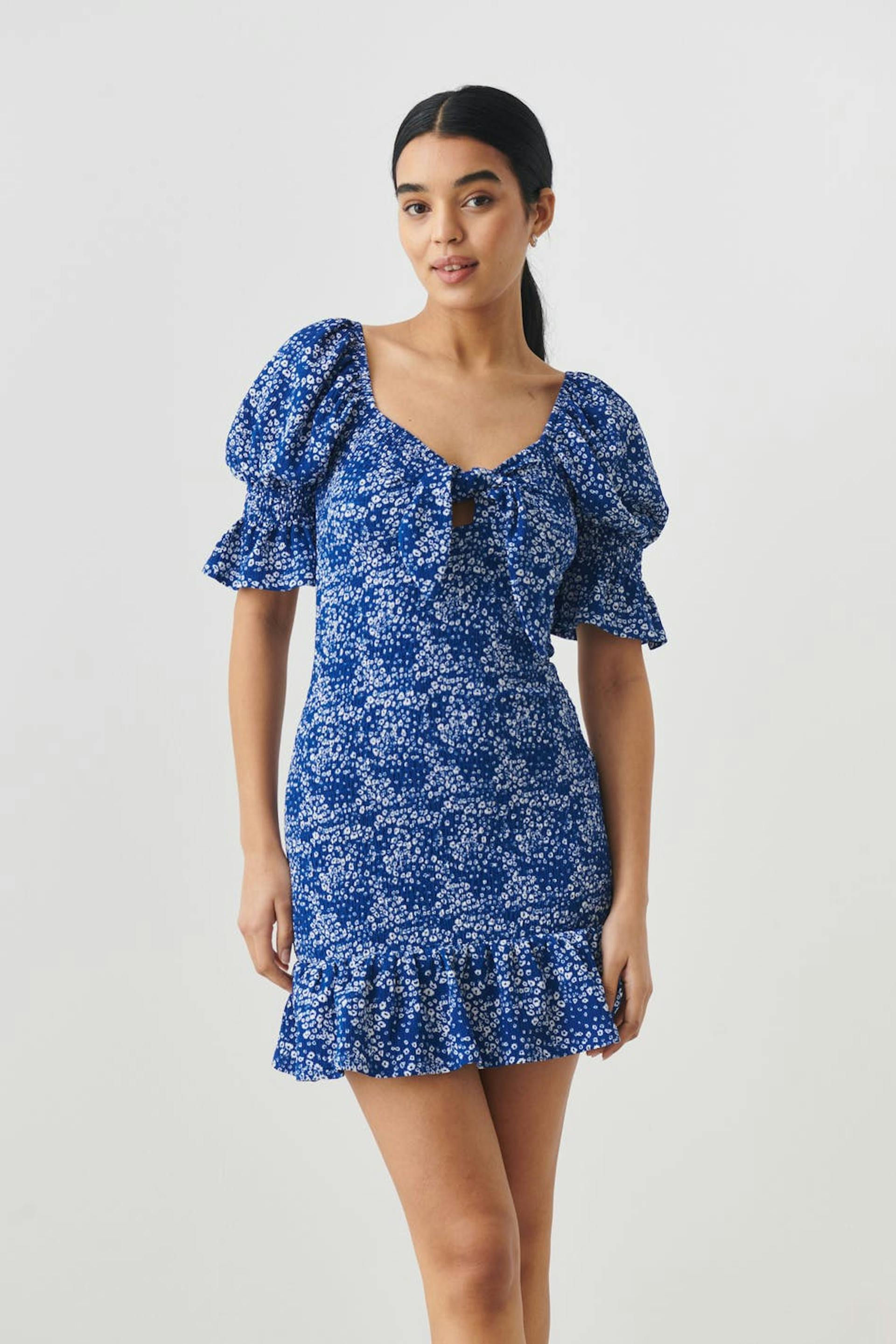 Patterned dress with smocking. The dress is blue, white and short. It has short puff sleeves, knot detail at the front, square neckline and flounce at the bottom.