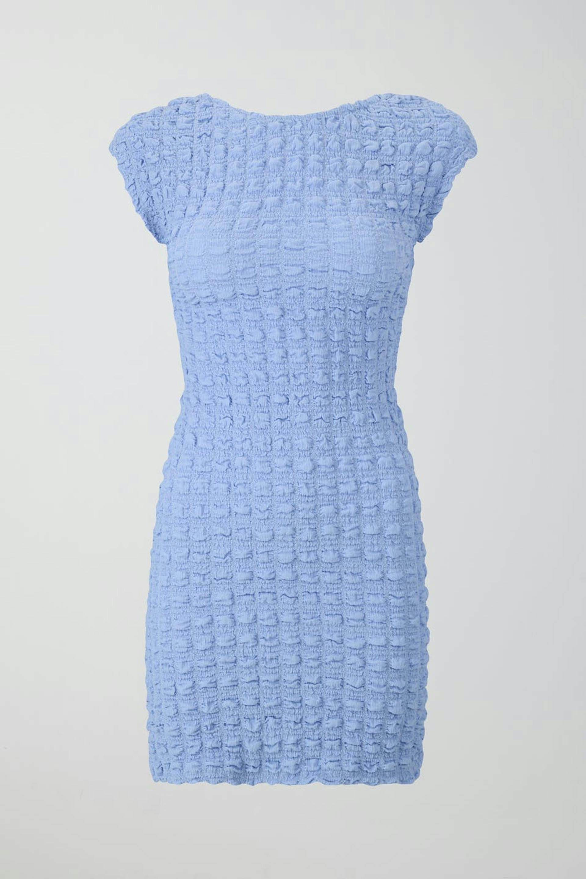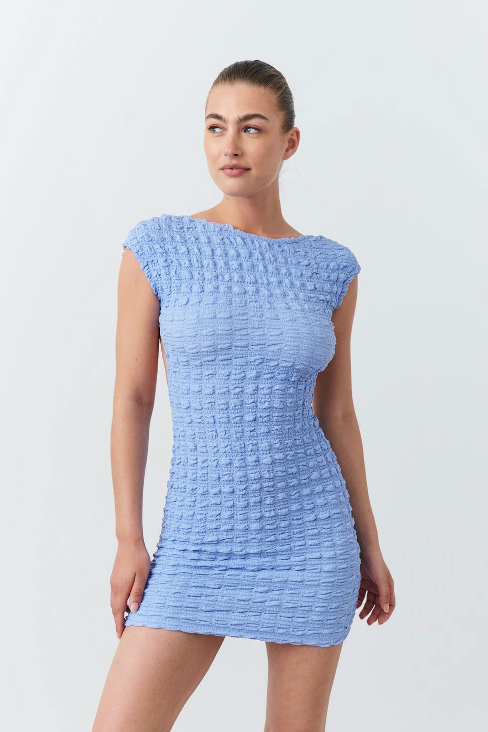 Textured mini dress with open back. The dress is blue and has figure-hugging fit. It has short sleeve and high neckline.