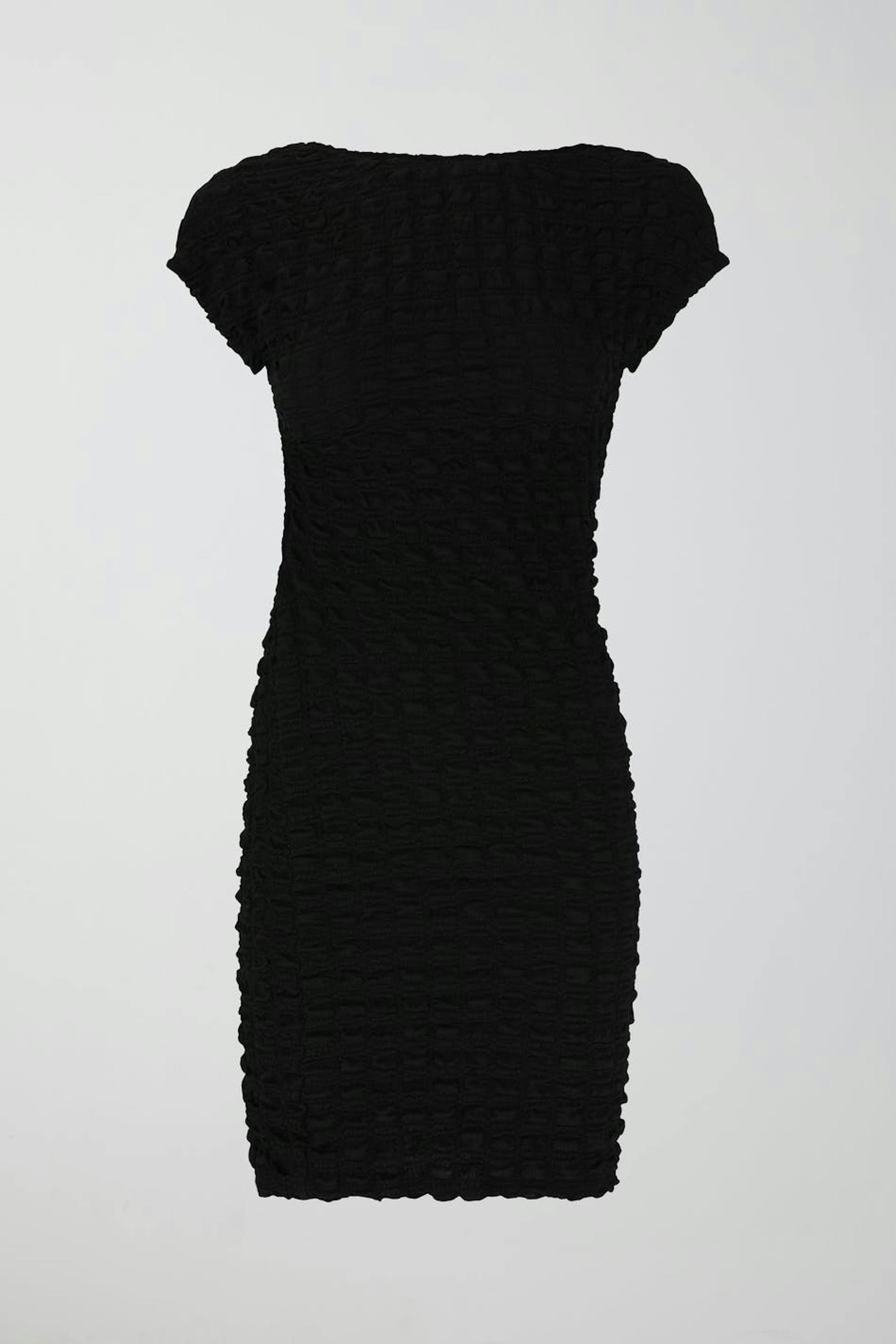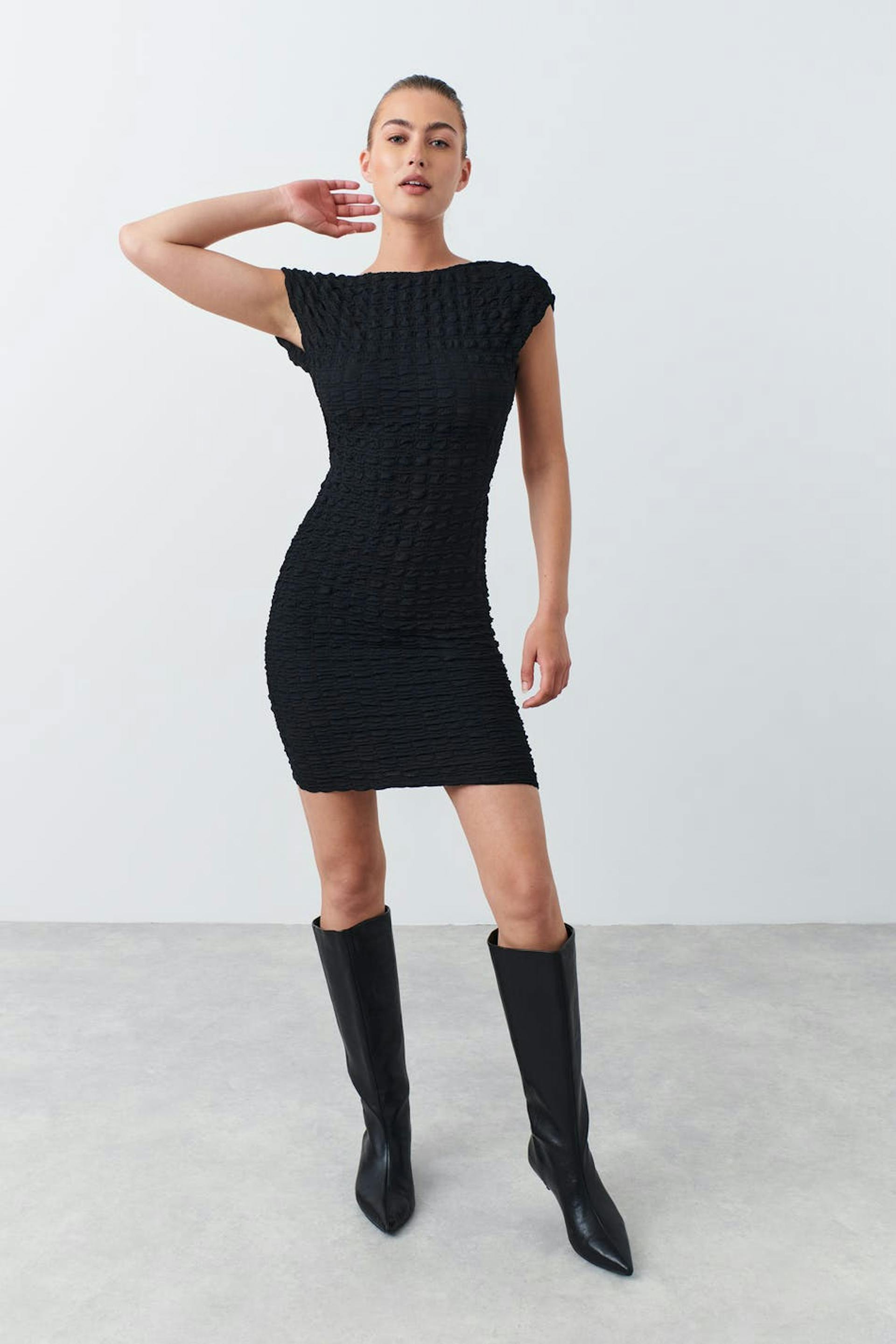 Textured mini dress with open back. The dress is black and has figure-hugging fit. It has short sleeve and high neckline.