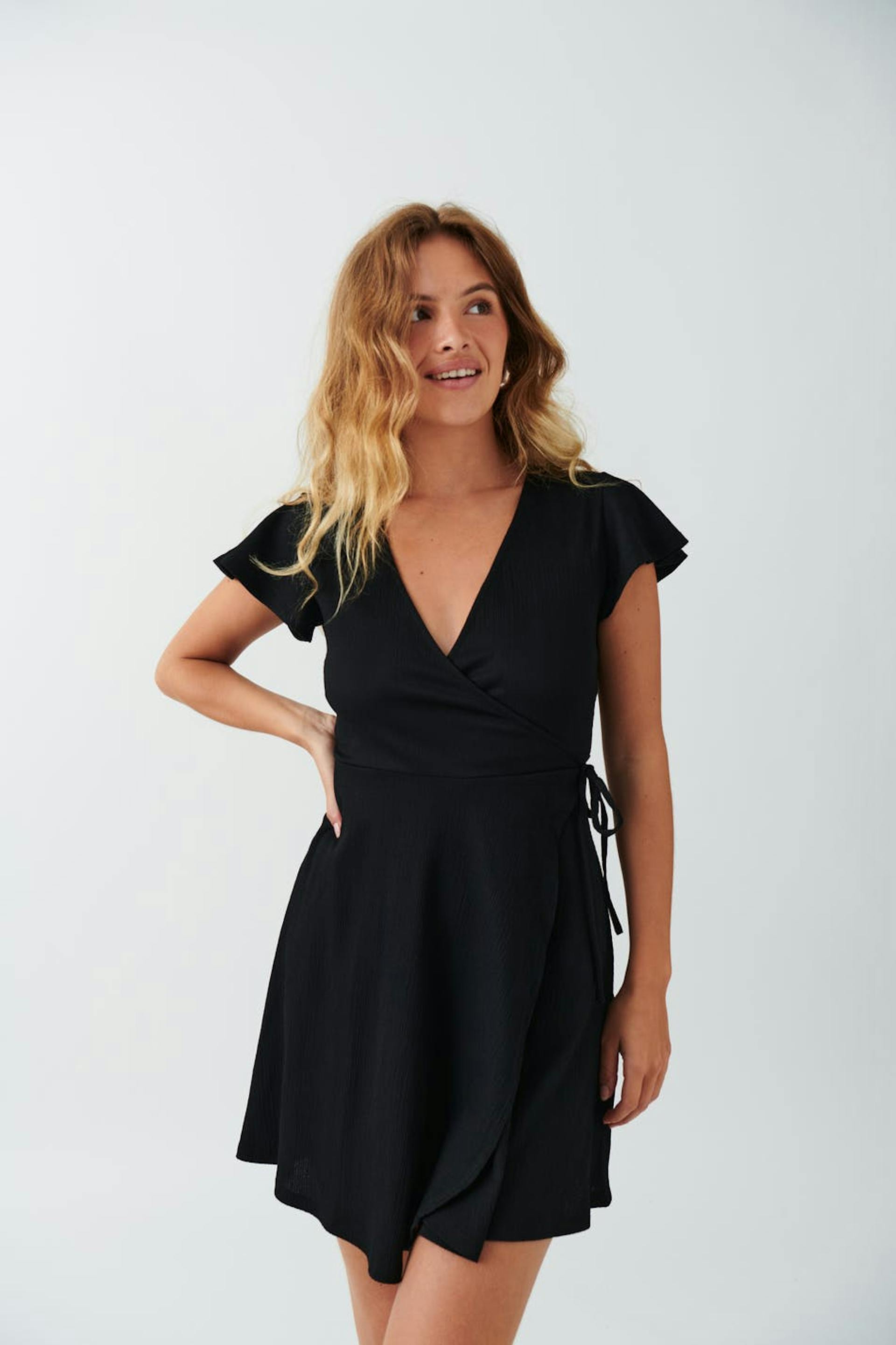 Short wrap dress with self-tie at the waist. The dress is black and short-sleeved and has regular fit. It has structured material and deep V-neck.