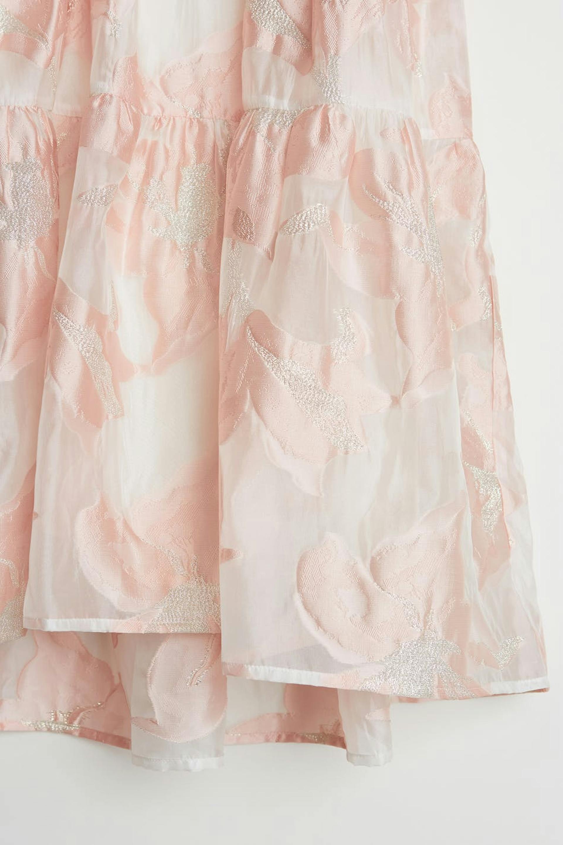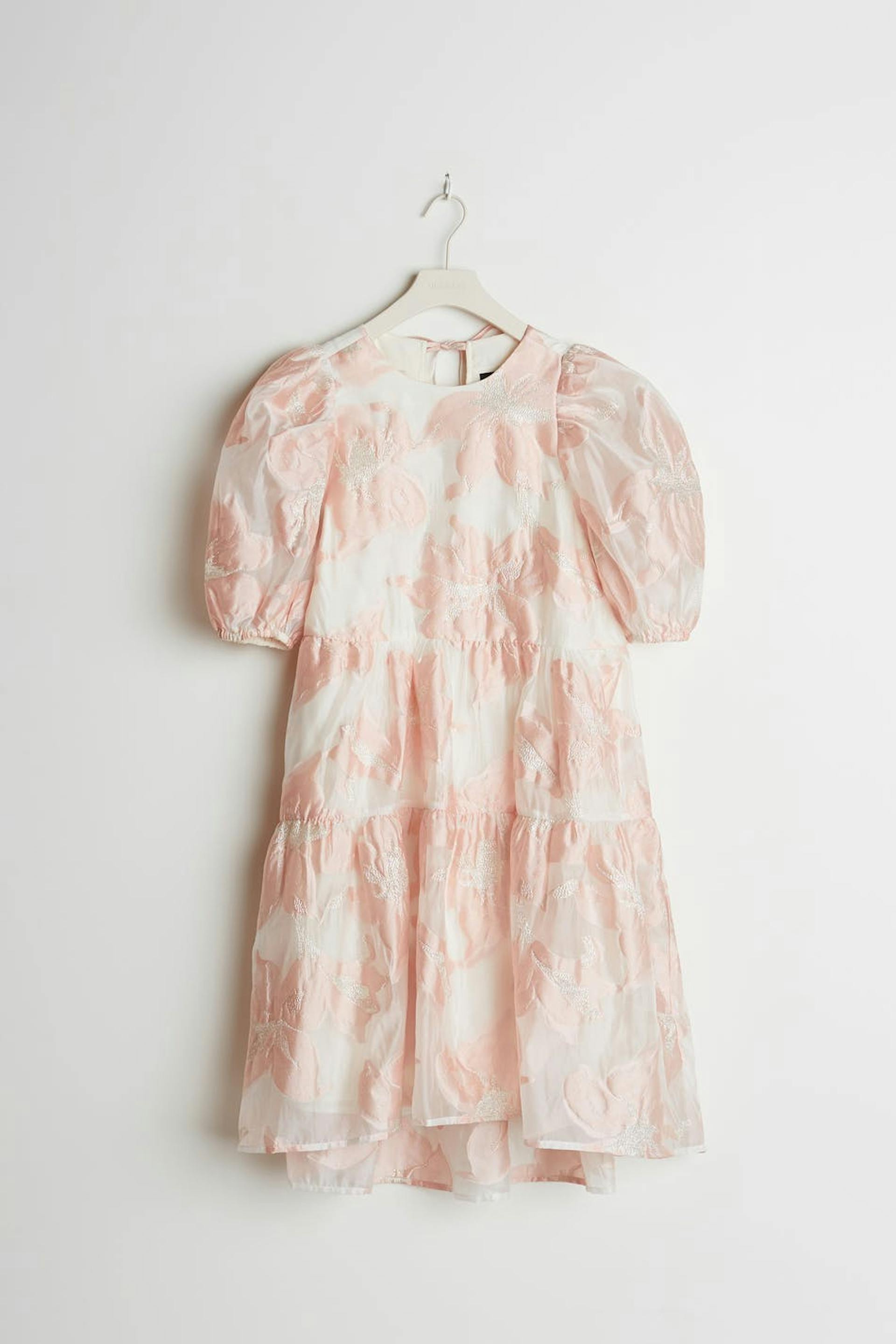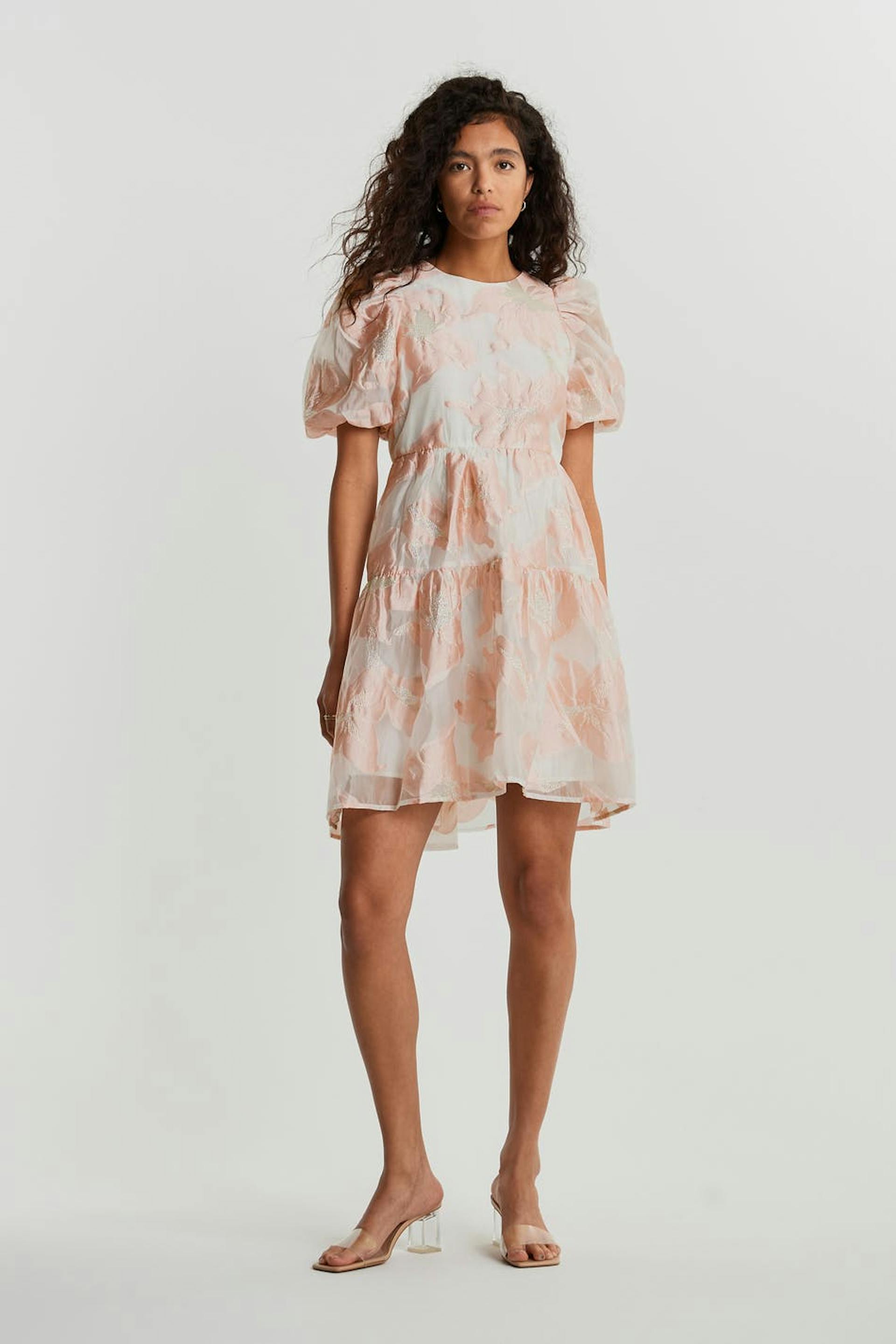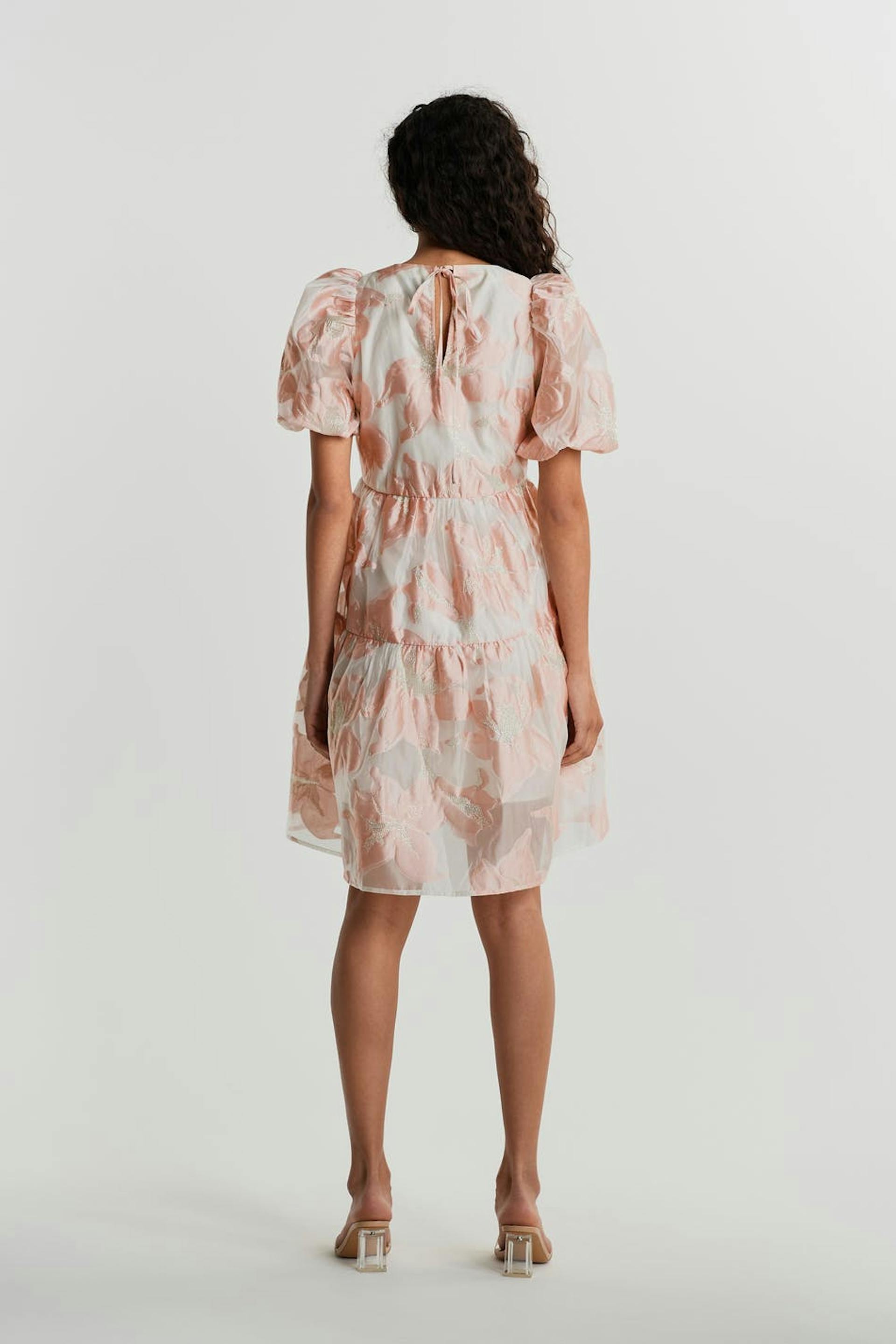 Organza dress with a casual fit. The dress is light pink and has short sleeves. It has a shorter front piece and a longer backside.