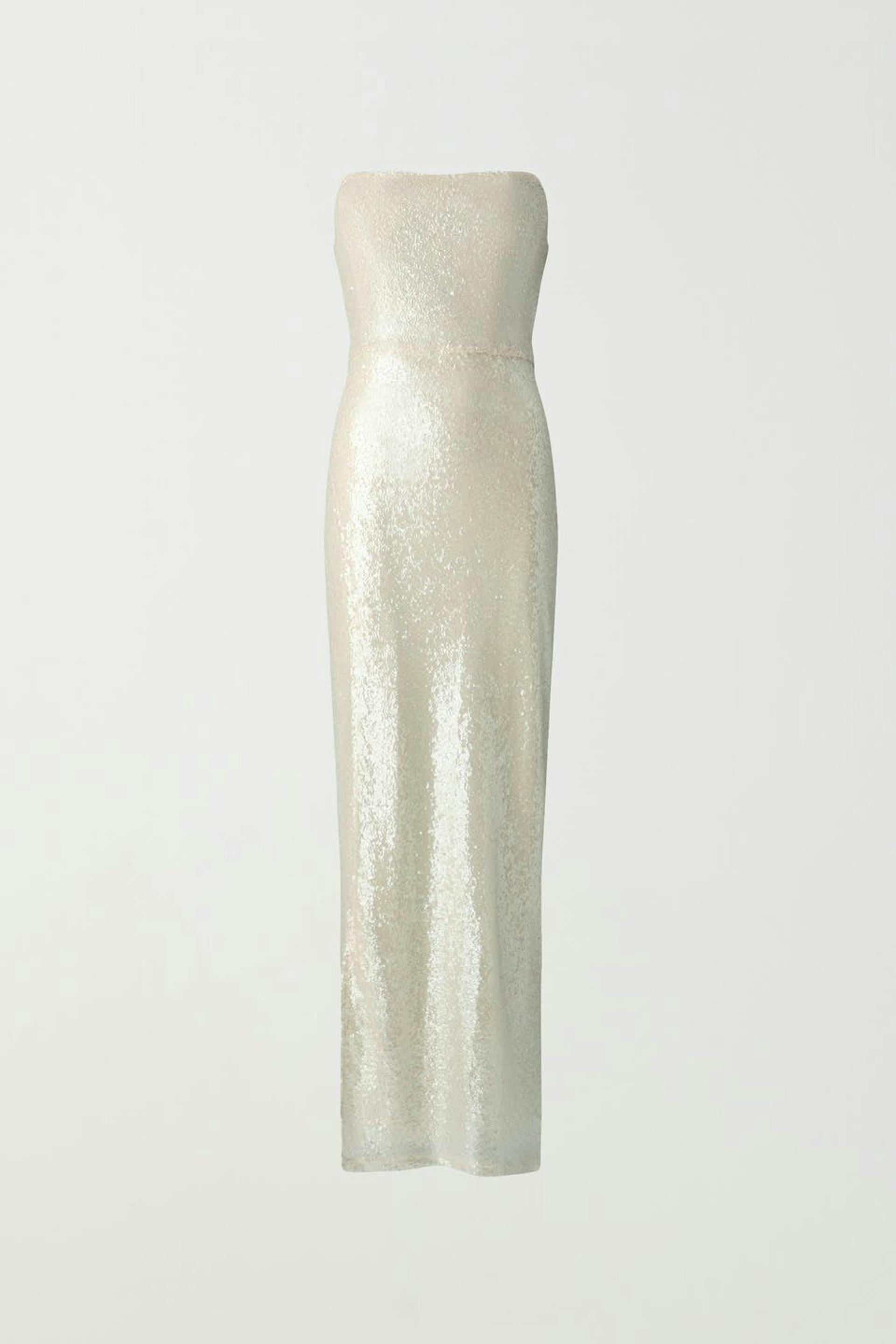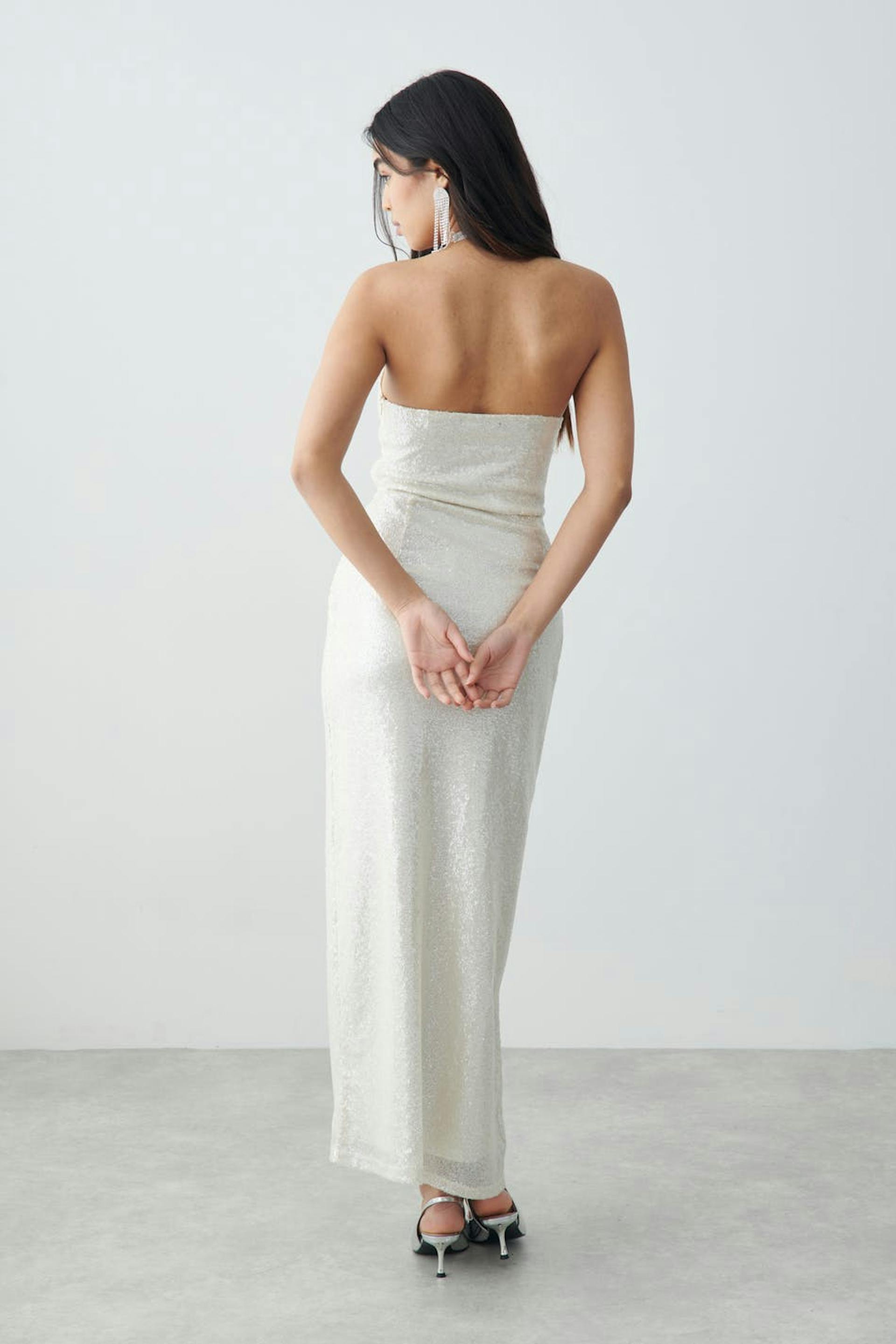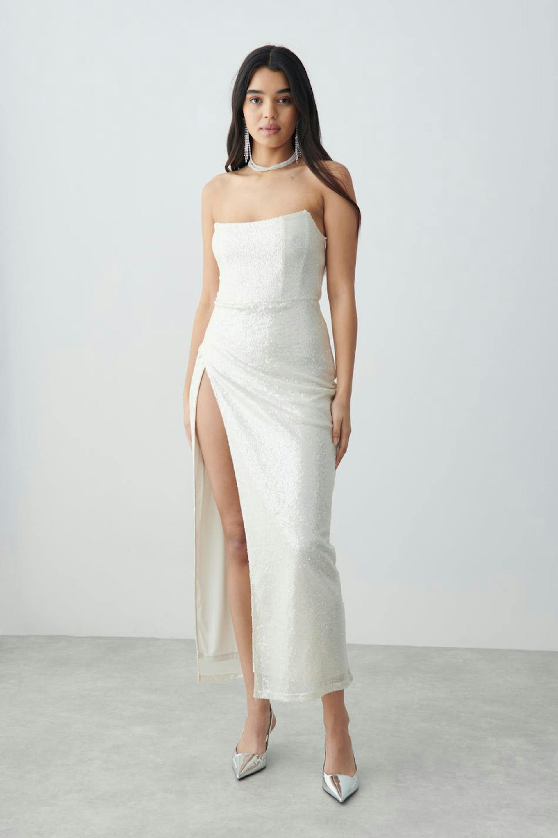 Lined corset dress with high slit at the side. The dress is white and has small sequins. It has boning at the front, zip in the side seam and a maxi length.
