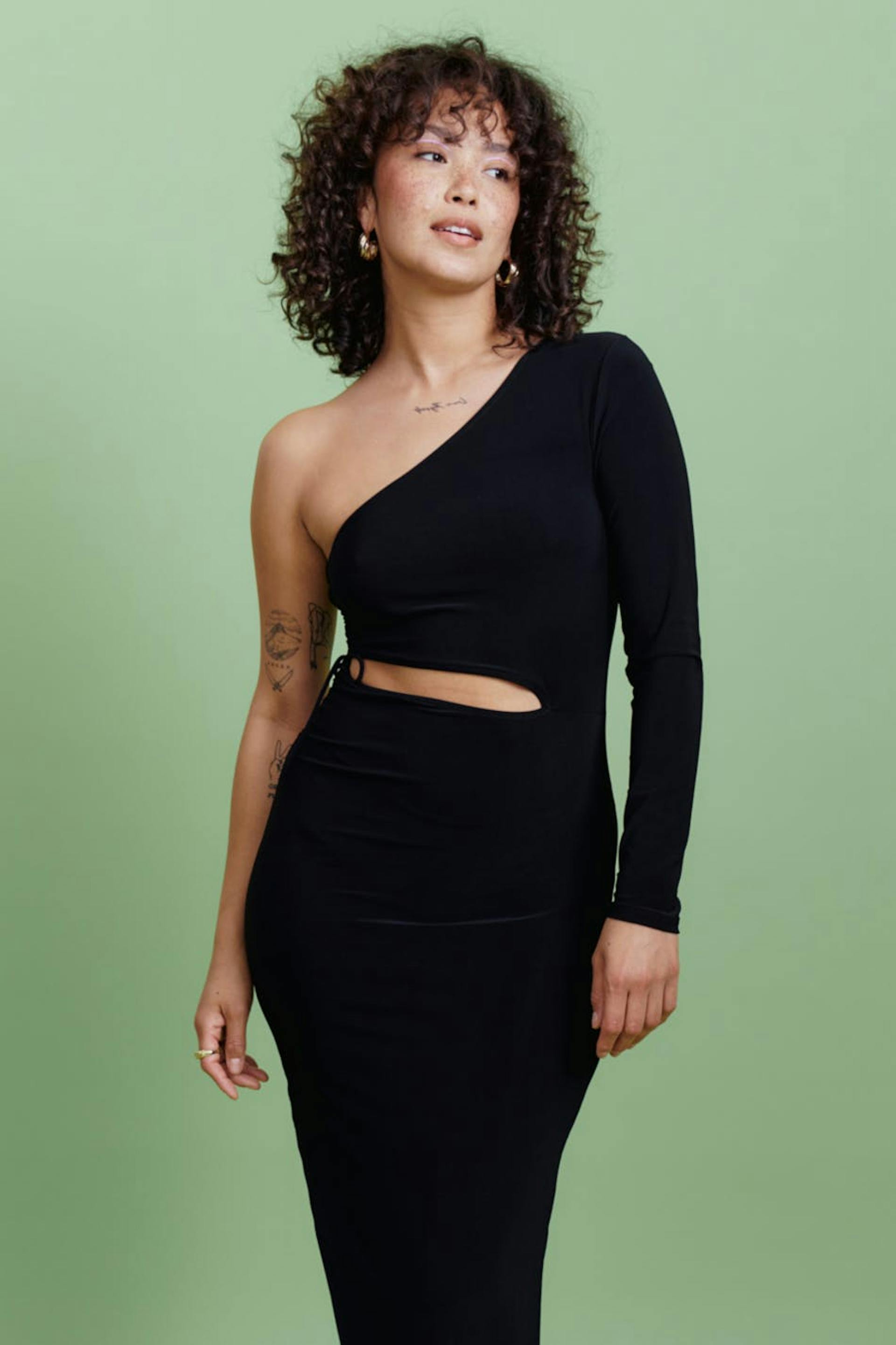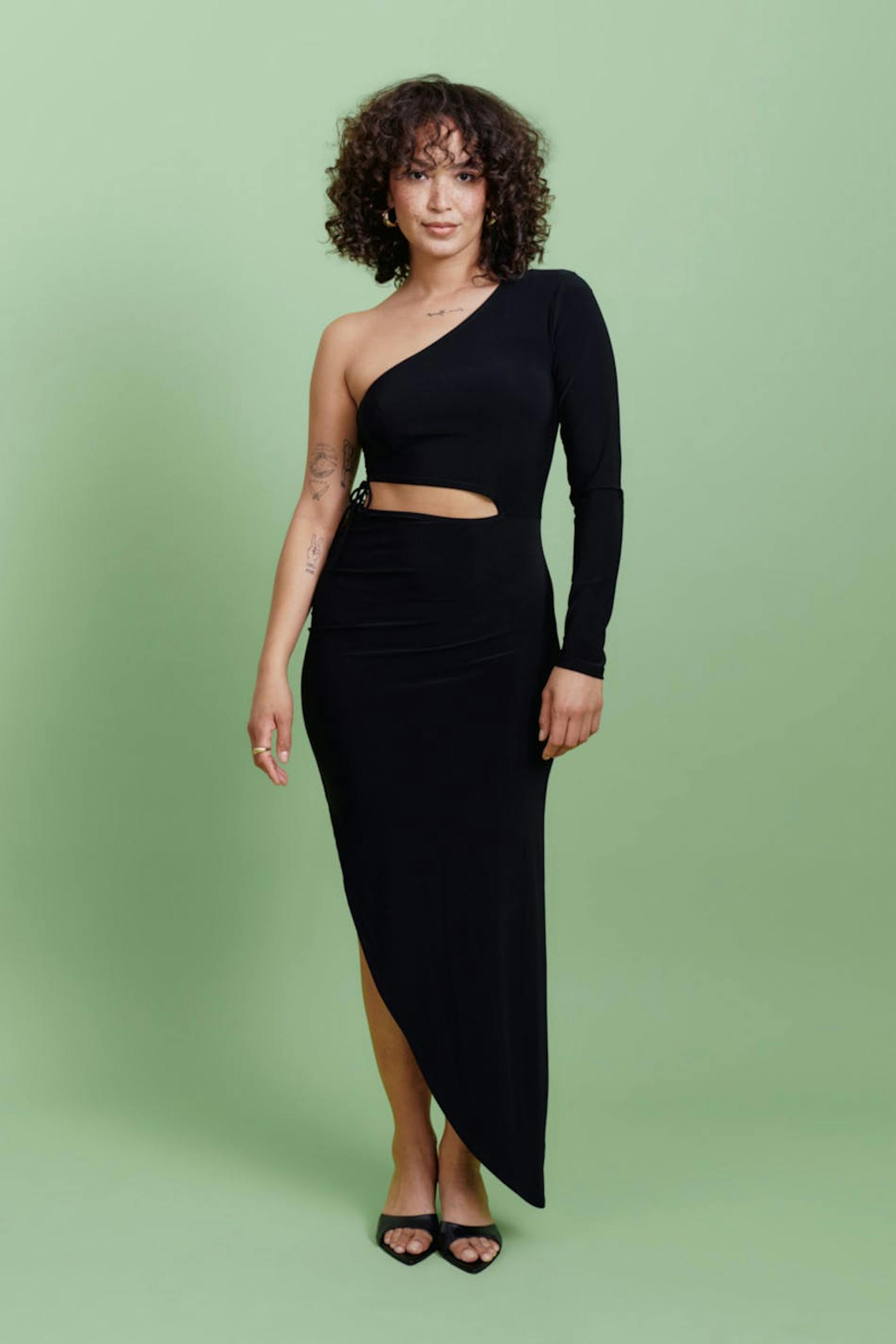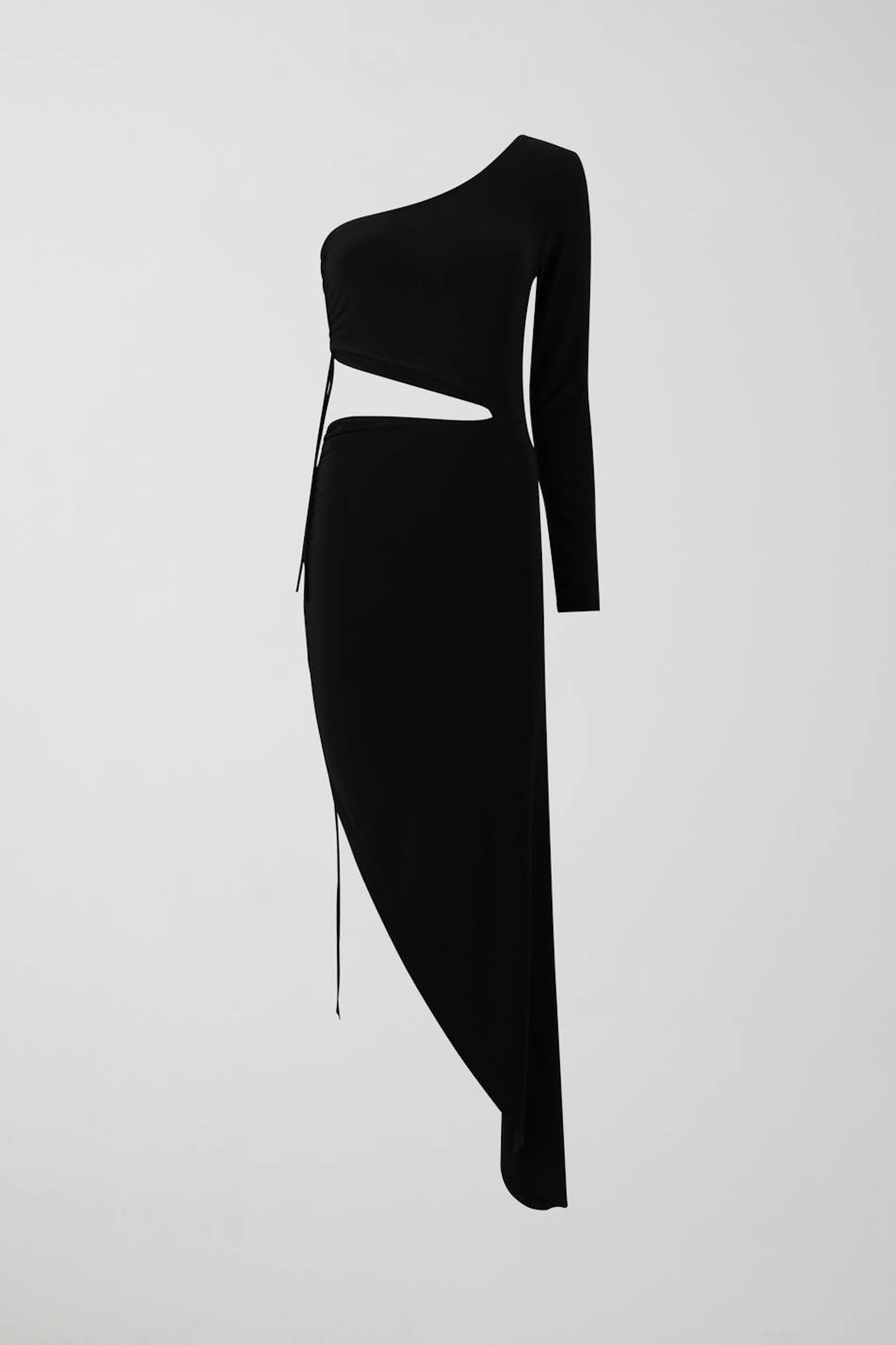 One shoulder dress with cut-out detail at the side. The dress is black and has long sleeve. It has figure-hugging fit and gathering in the side seam.