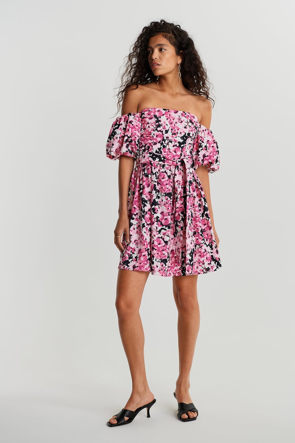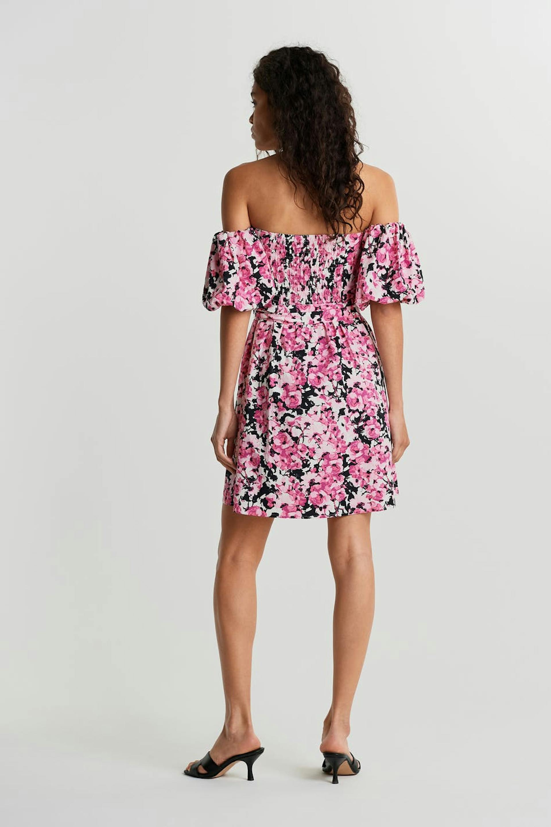 Woven off shoulder dress. Long balloon sleeves. Supplier: Production unit: