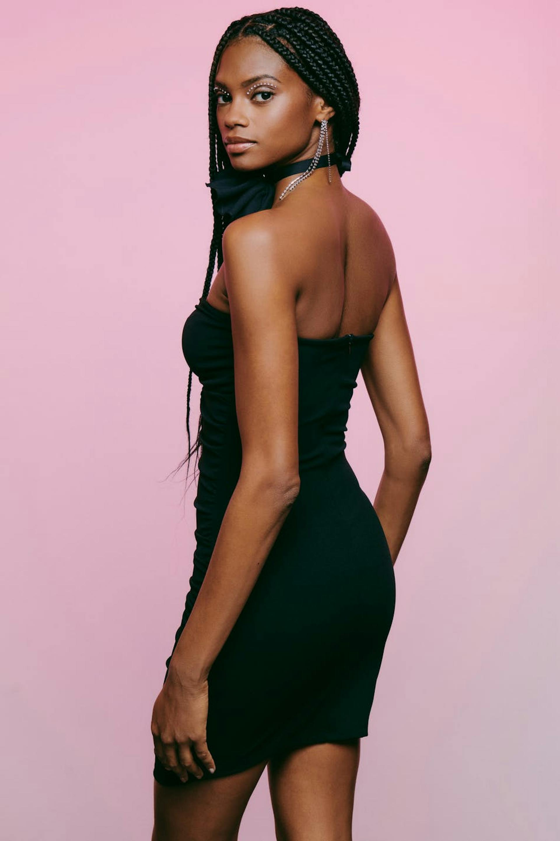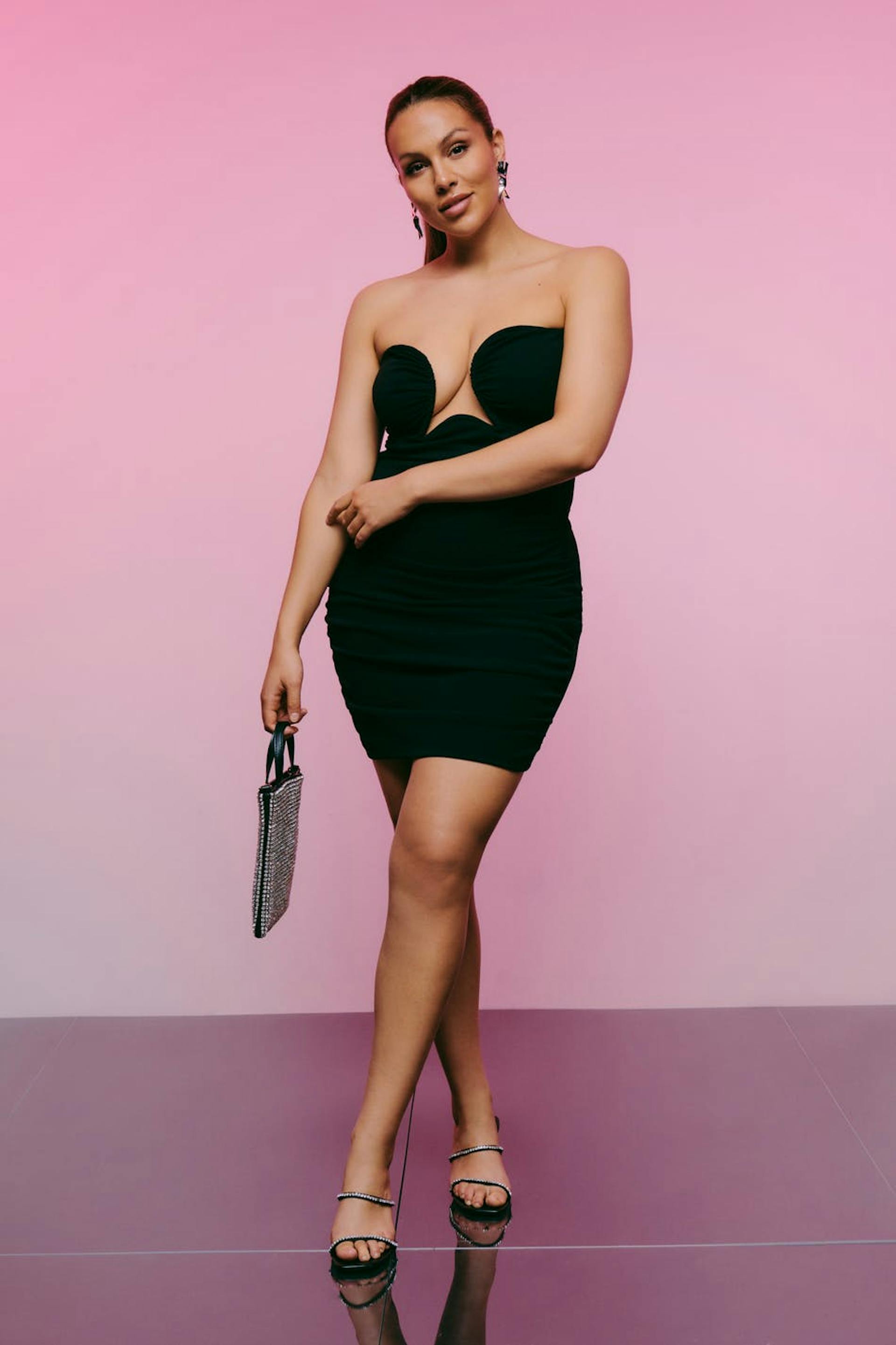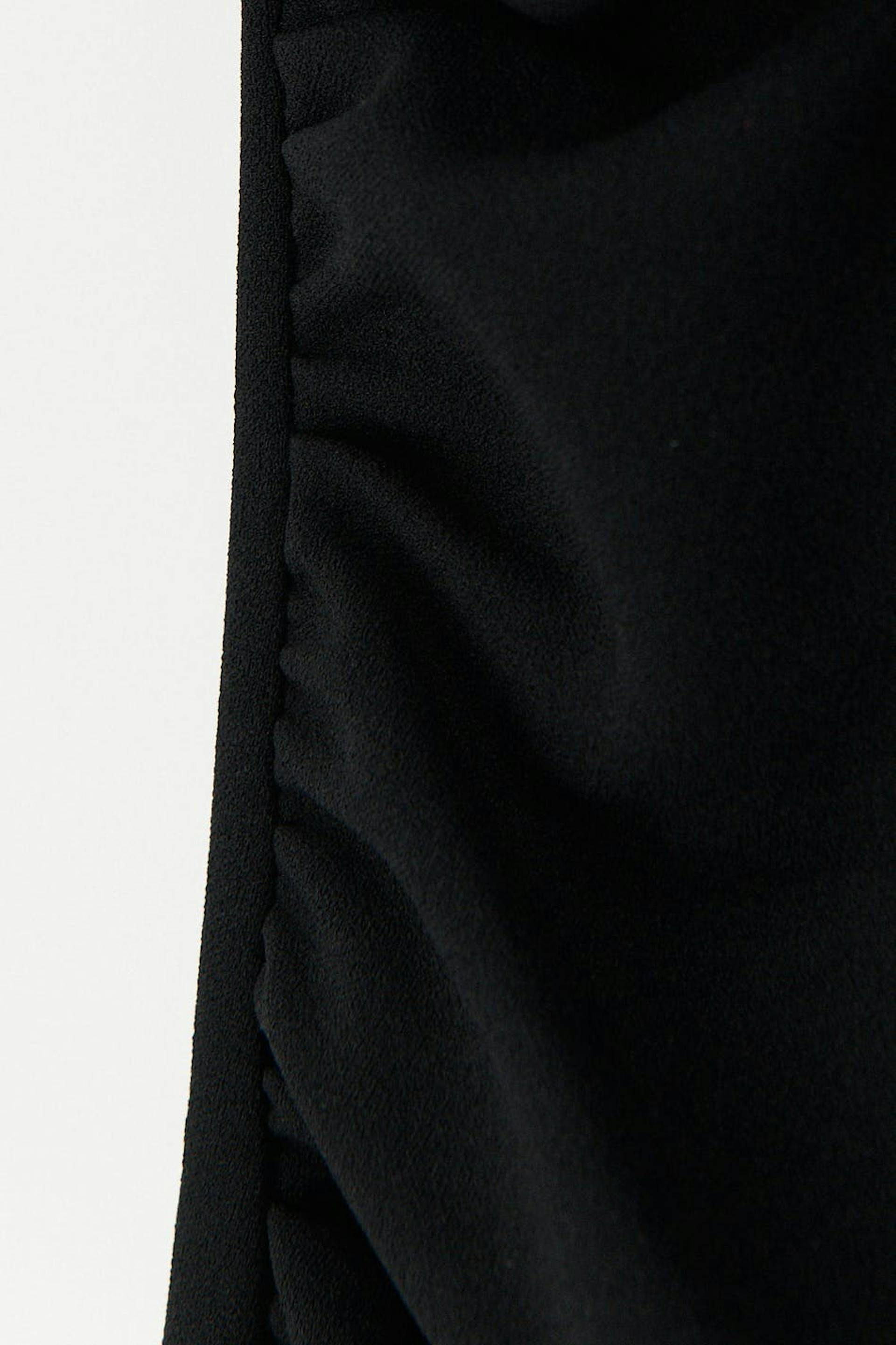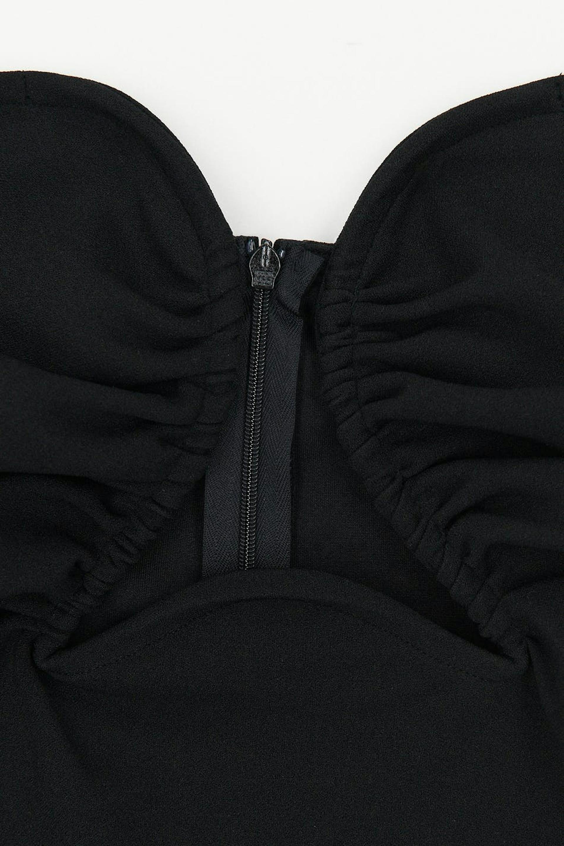 Sleeveless mini dress with deep neckline. The dress is black and has fitted fit. It has gathering in the sides, zip at the back and underwire at the neckline for added support.